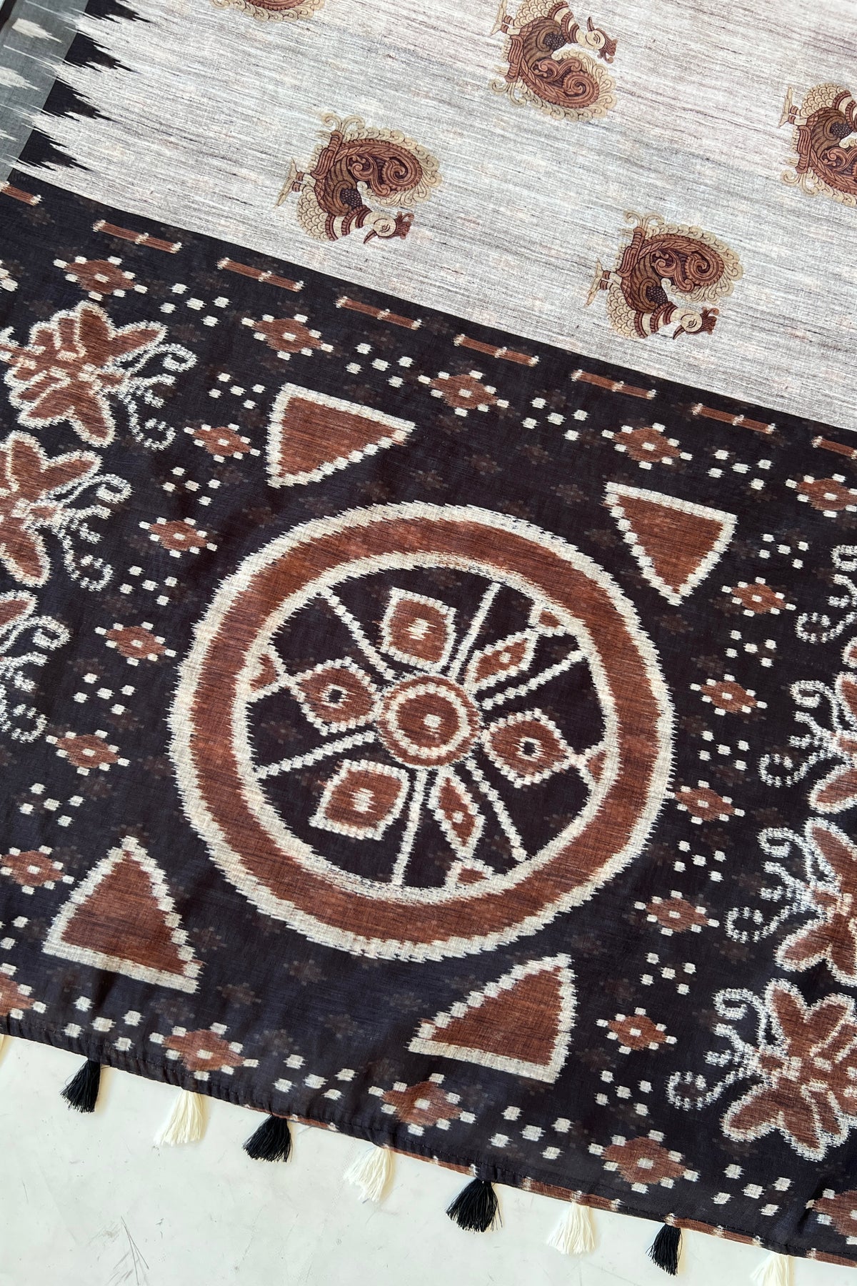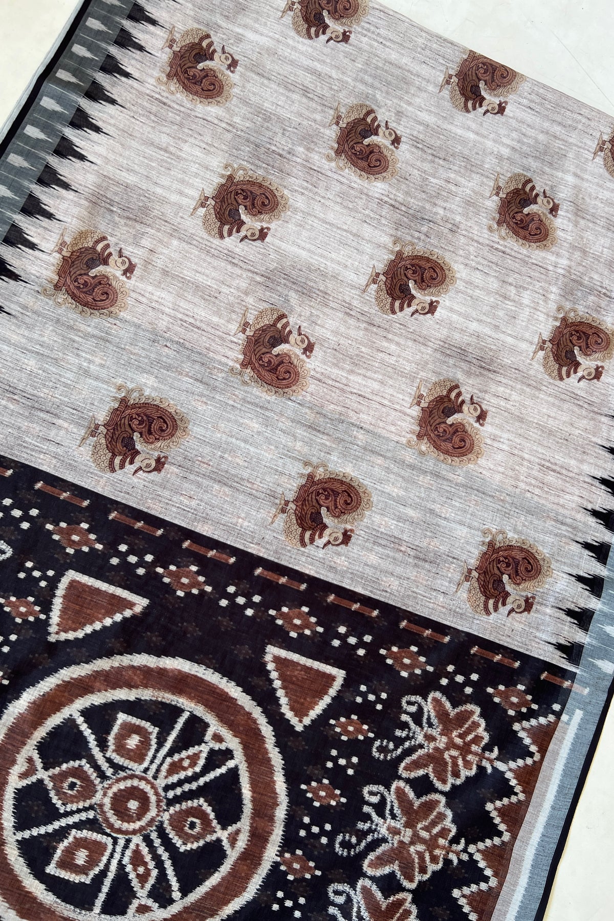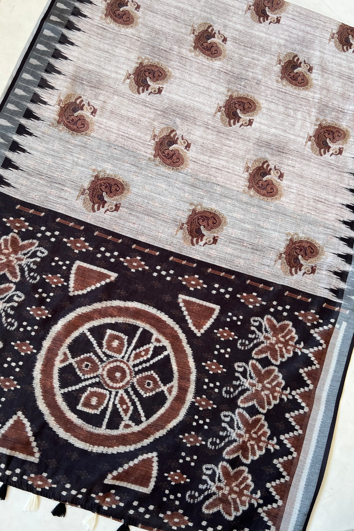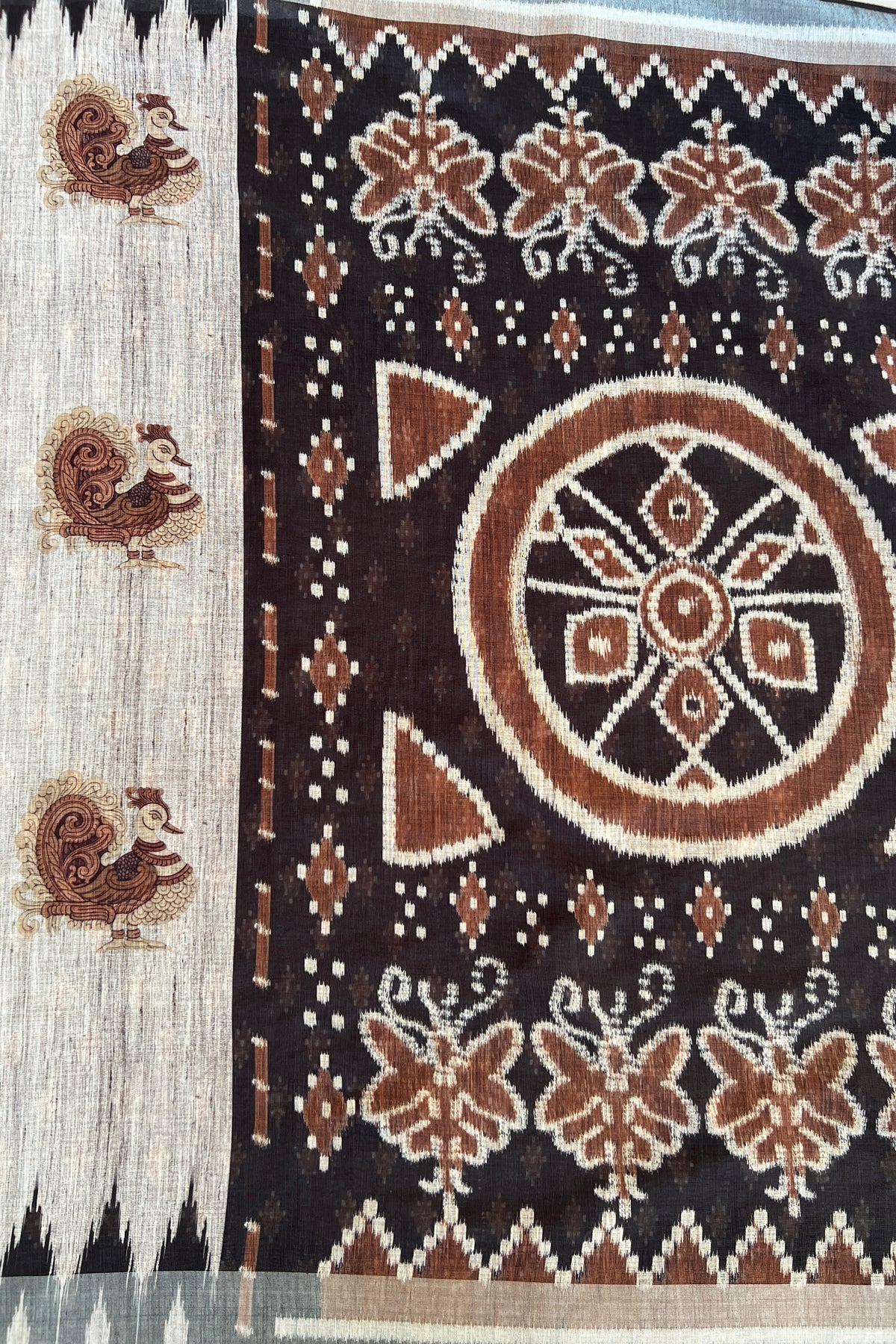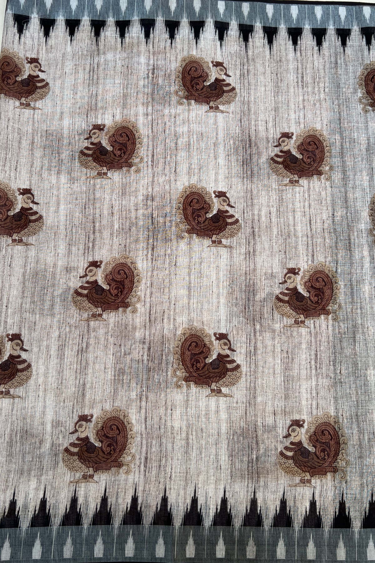 Let heritage speak with this graceful saree, adorned with traditional peacock prints and a pallu that showcases floral vines and chakra-style elements in rich brown hues. This saree is perfect for festive gatherings and day functions alike. This saree blends cultural motifs with contemporary print techniques.