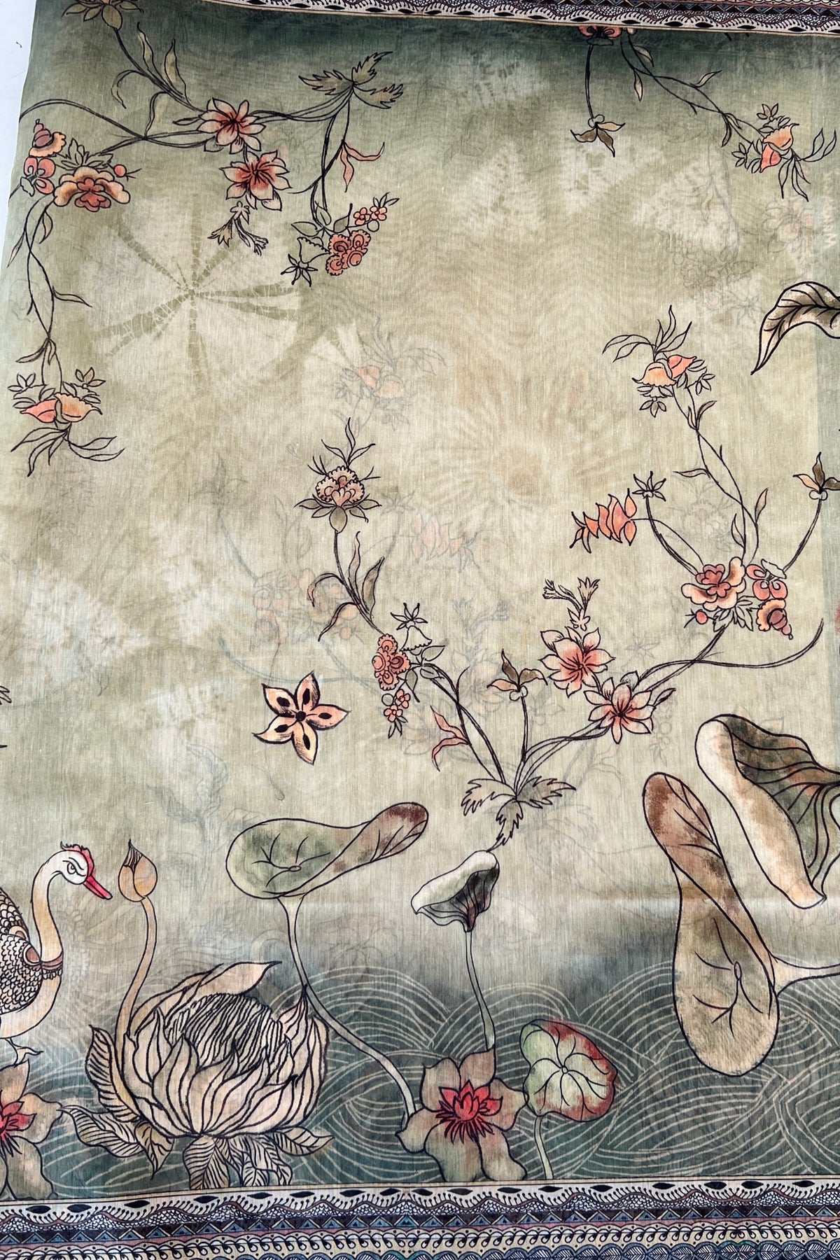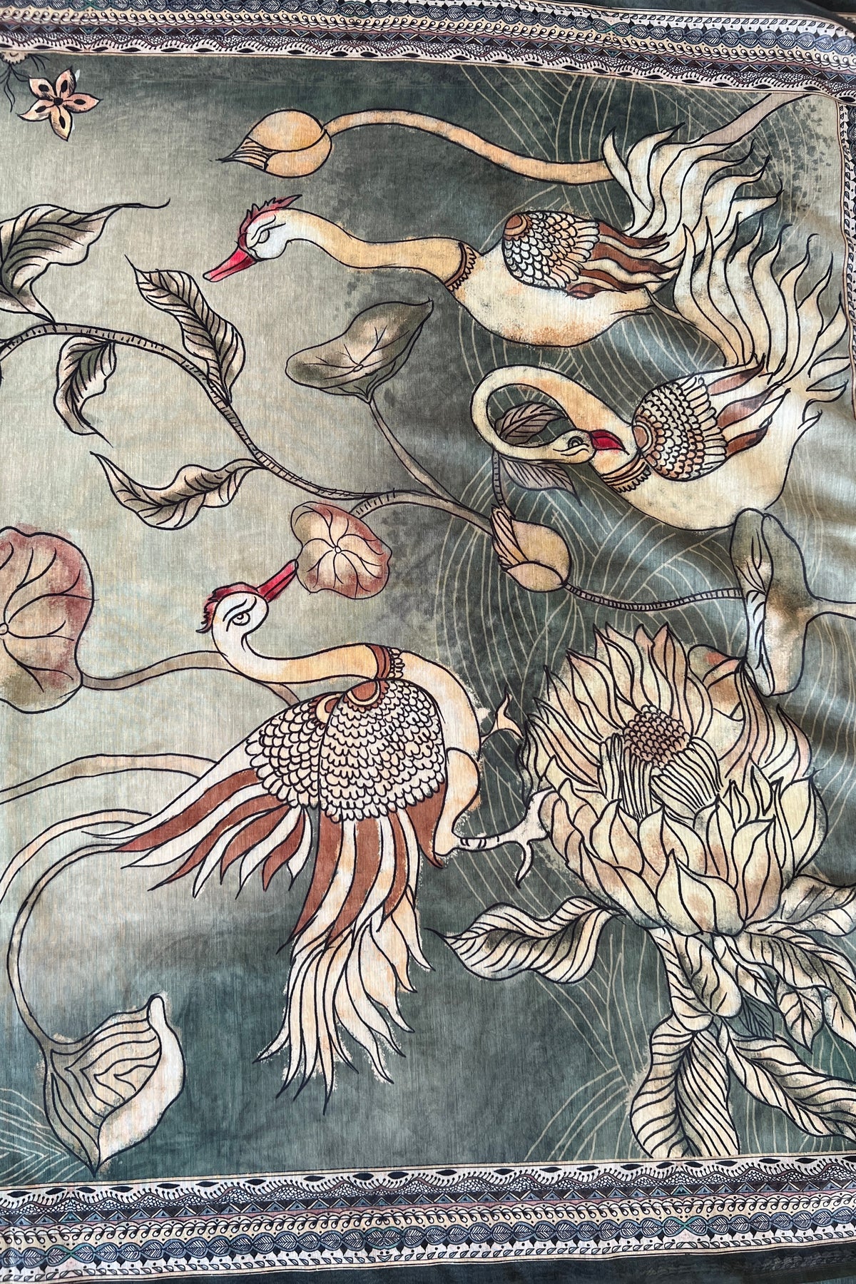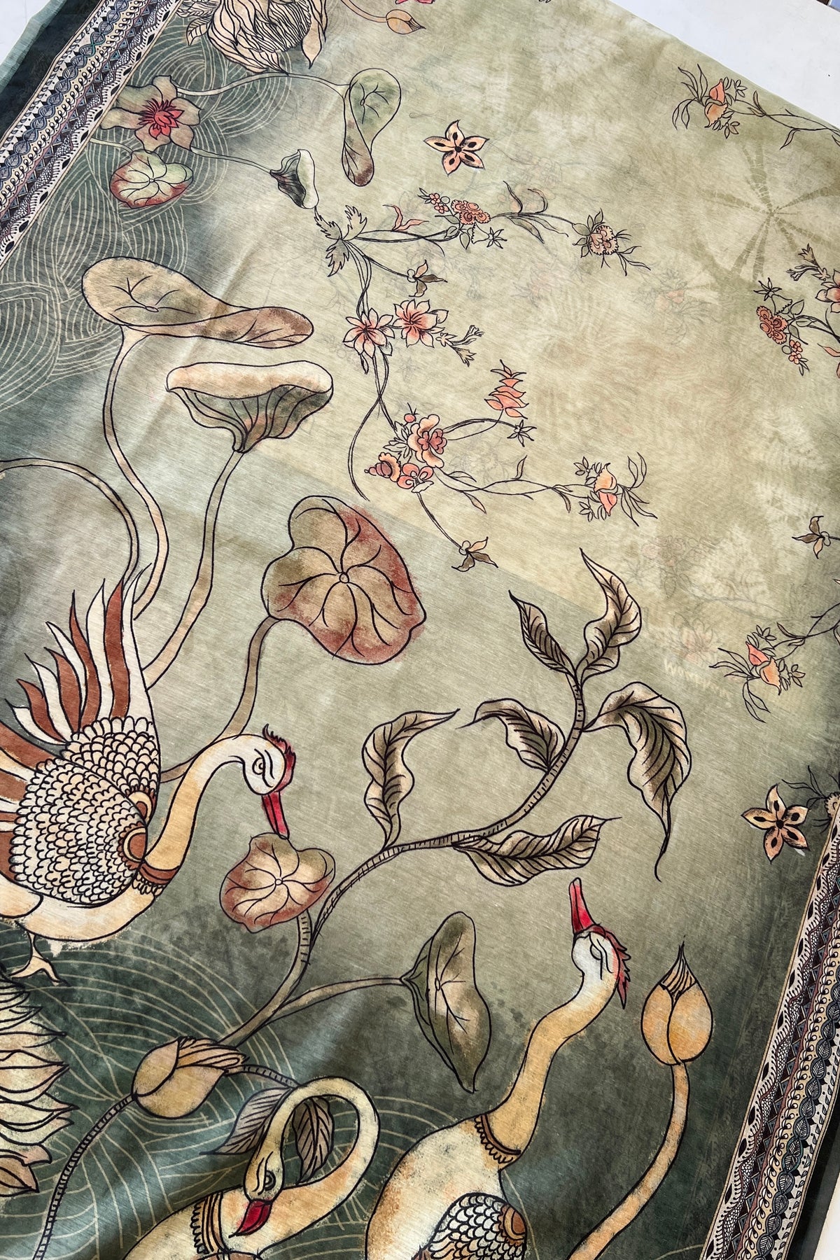 Step into a serene tale with the Hamsini Lotus Pond saree, a graceful drape crafted from soft and breathable Chanderi cotton. The saree features a tranquil design of majestic swans gliding through a lotus-filled pond, enhanced by delicate floral vines and lush aquatic elements in earthy tones.