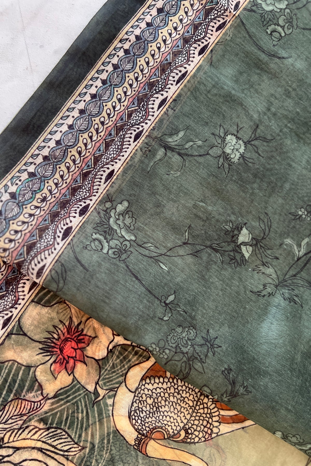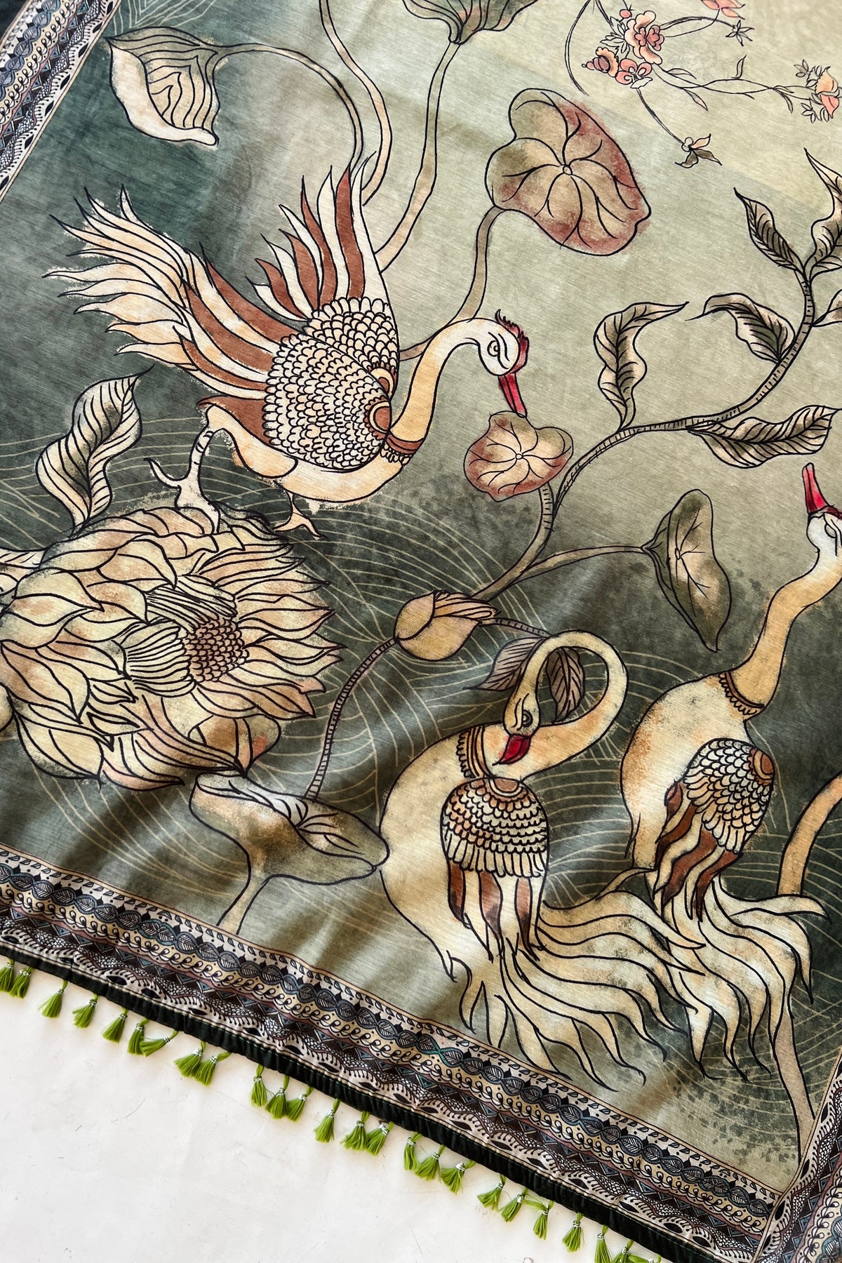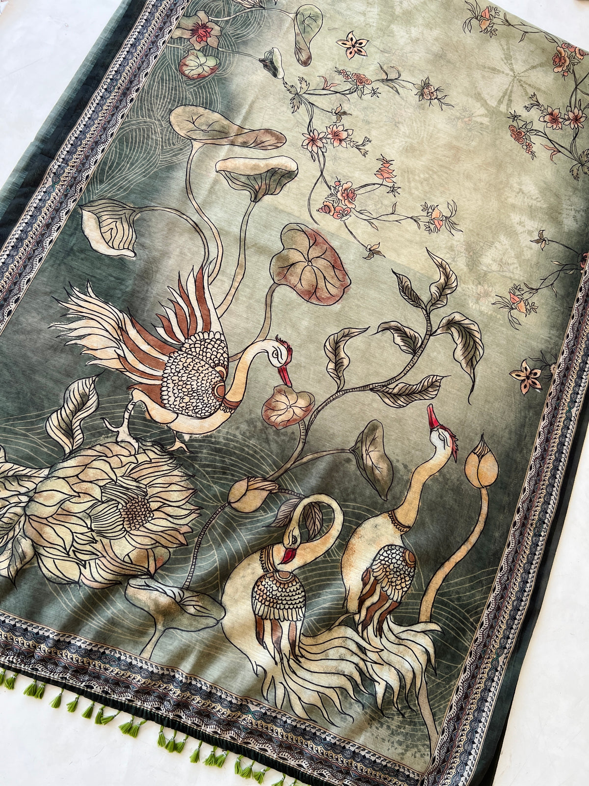 Step into a serene tale with the Hamsini Lotus Pond saree, a graceful drape crafted from soft and breathable Chanderi cotton. The saree features a tranquil design of majestic swans gliding through a lotus-filled pond, enhanced by delicate floral vines and lush aquatic elements in earthy tones.