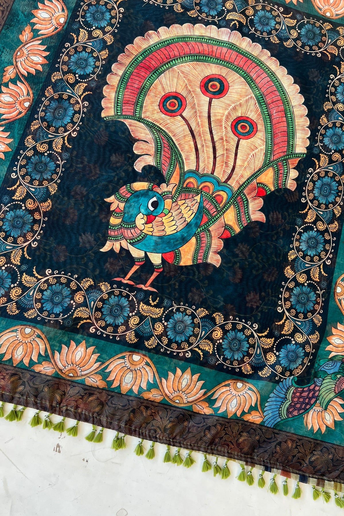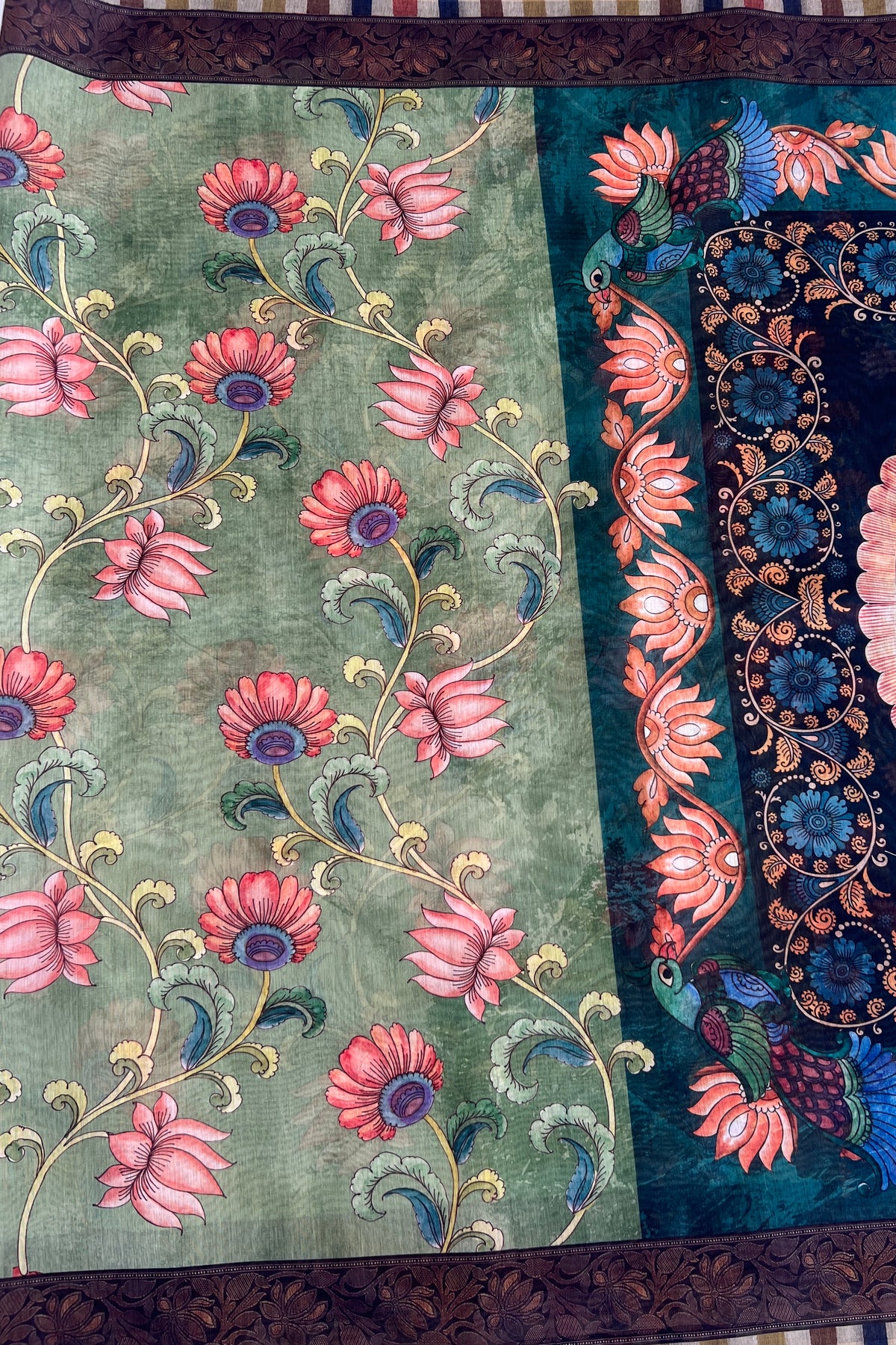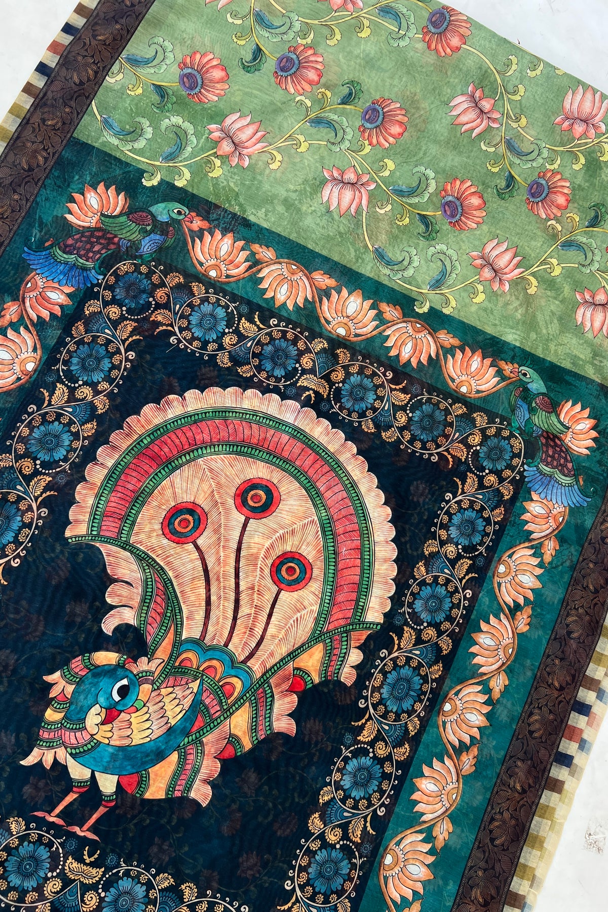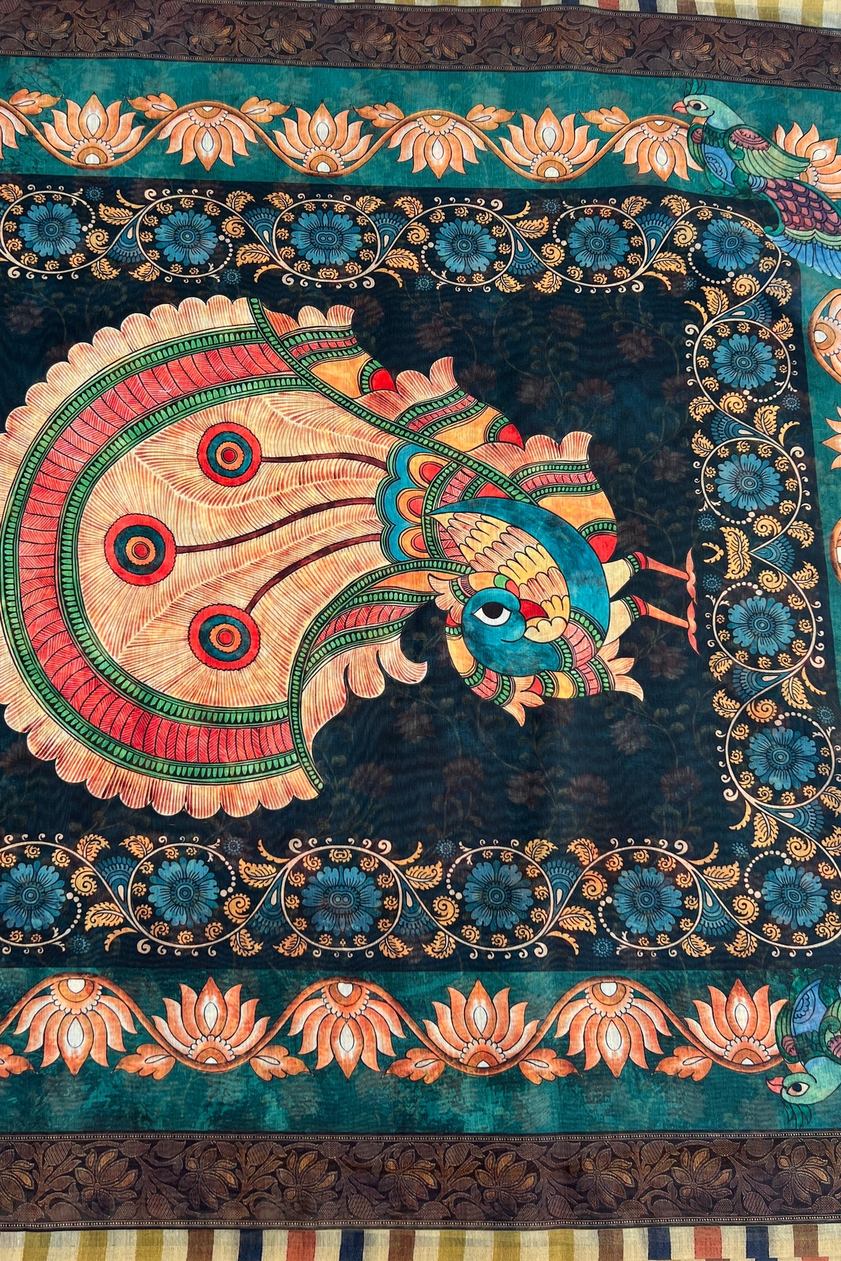 This saree features a bold and colorful peacock at its center, surrounded by intricate floral vines and traditional lotus motifs. The detailed border with blue and orange flower patterns adds to its charm. The pallu has blooming lotuses and dancing birds, bringing a royal garden to life. A perfect pick for lovers of art and culture.