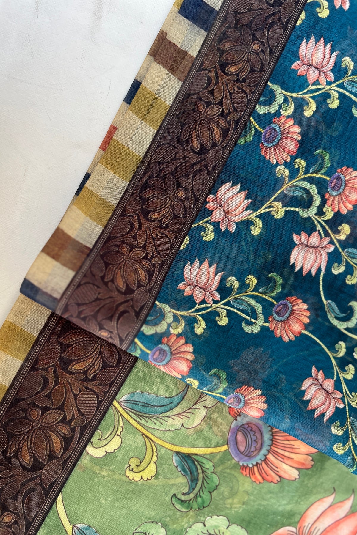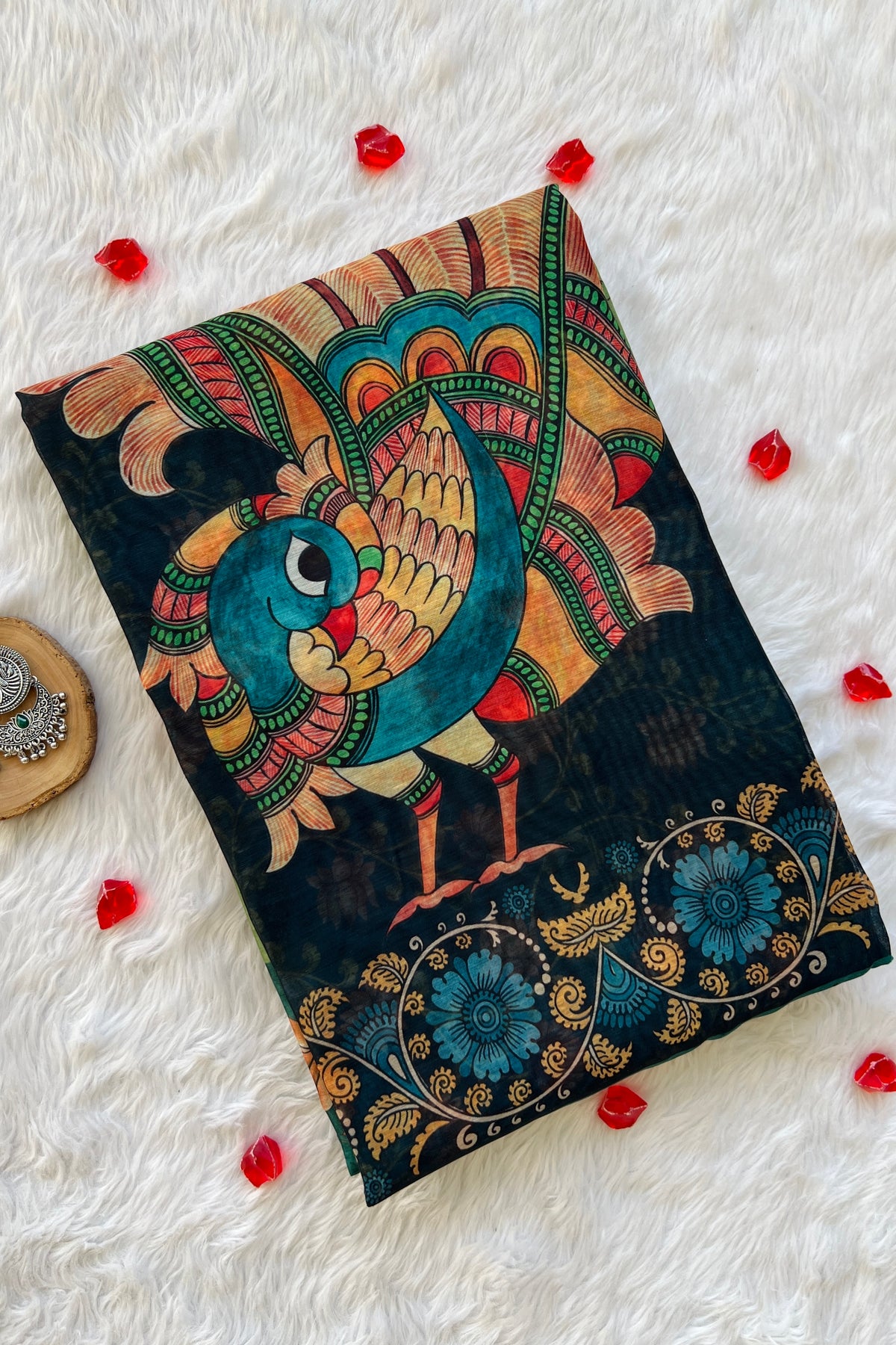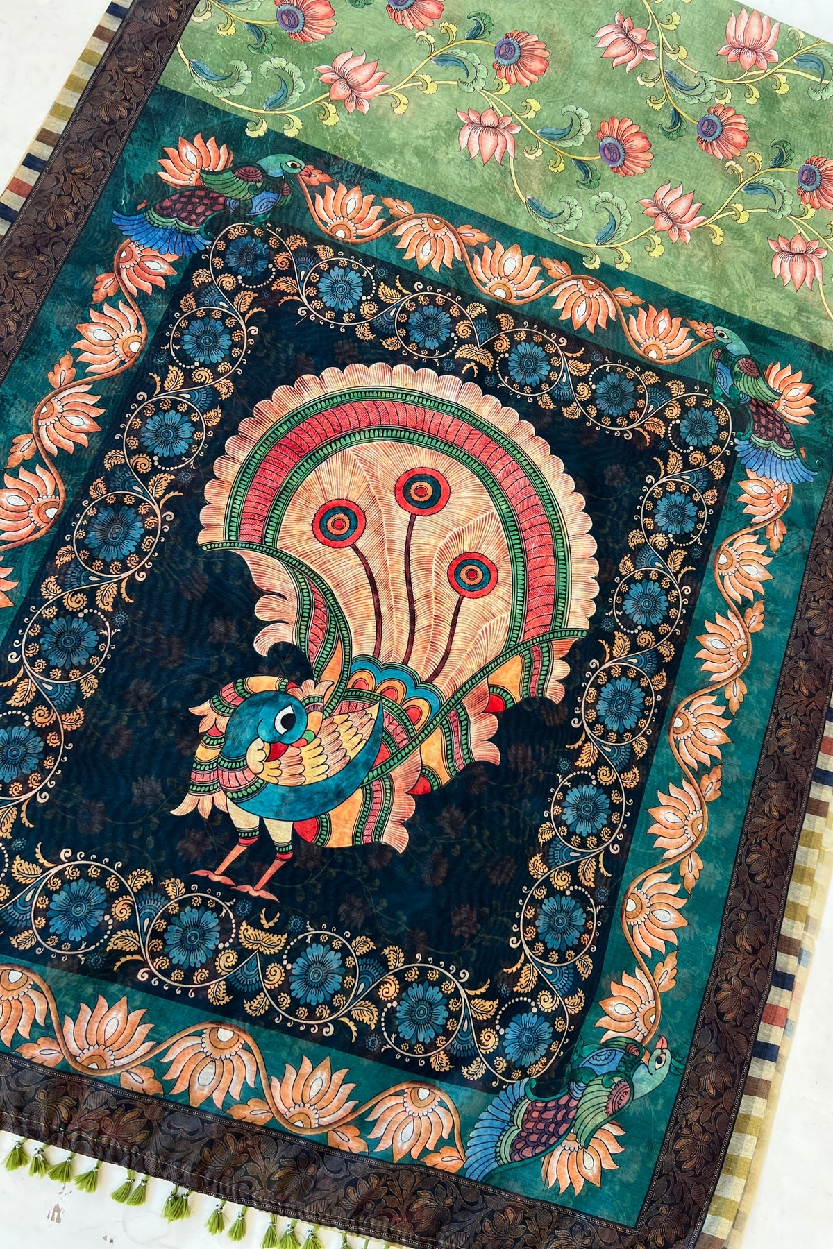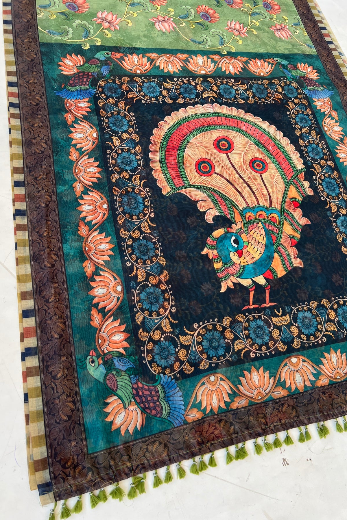 This saree features a bold and colorful peacock at its center, surrounded by intricate floral vines and traditional lotus motifs. The detailed border with blue and orange flower patterns adds to its charm. The pallu has blooming lotuses and dancing birds, bringing a royal garden to life. A perfect pick for lovers of art and culture.