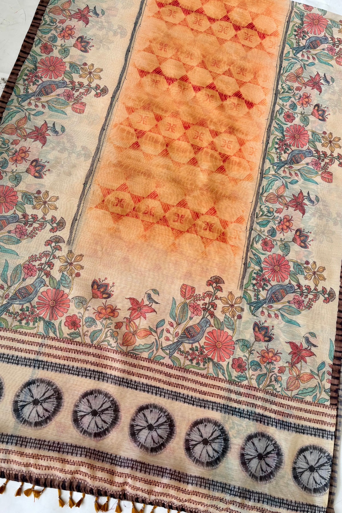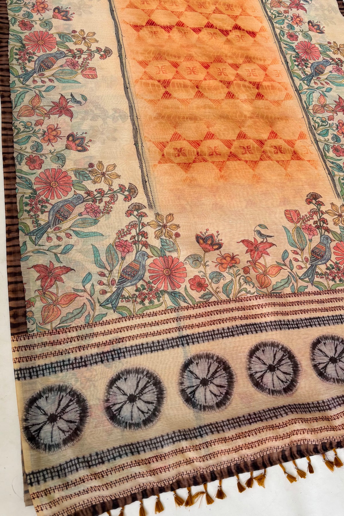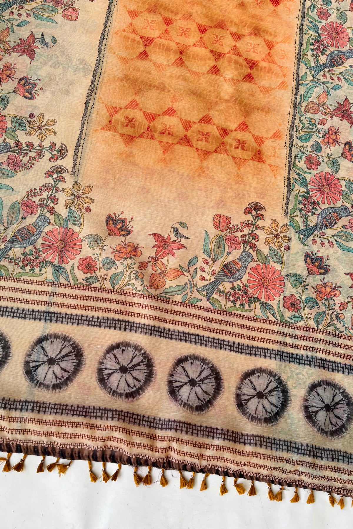 A vibrant saree that beautifully combines nature-inspired artistry with geometric charm. The body features warm orange and red diamond patterns, while the borders come alive with detailed floral designs and graceful birds nestled among blooming flowers. The lower edge is highlighted with bold circular motifs and tassels, adding a playful touch to the drape. A perfect pick for those who adore a blend of tradition, artistry, and quirky detailing.