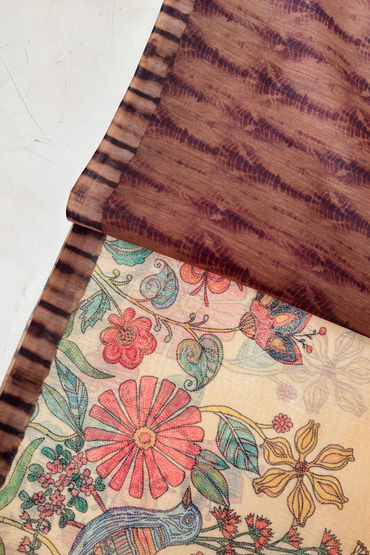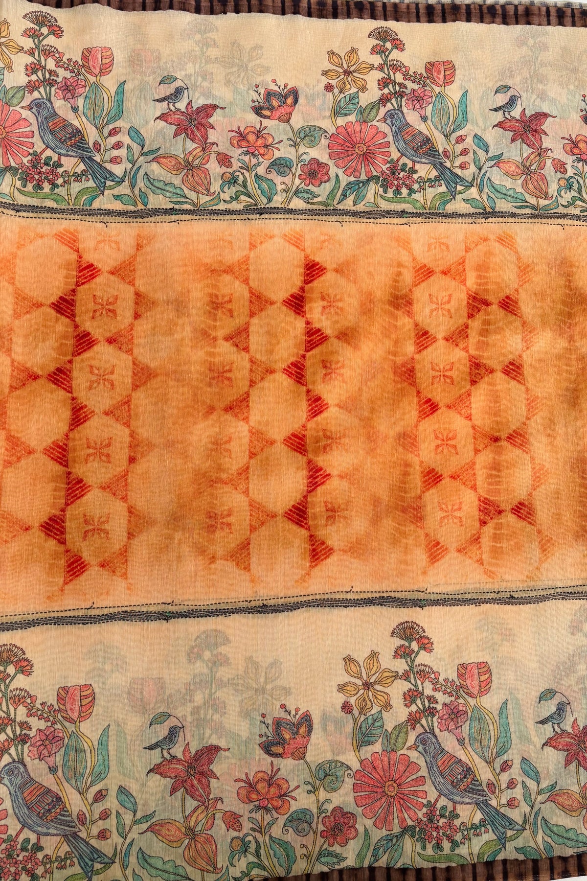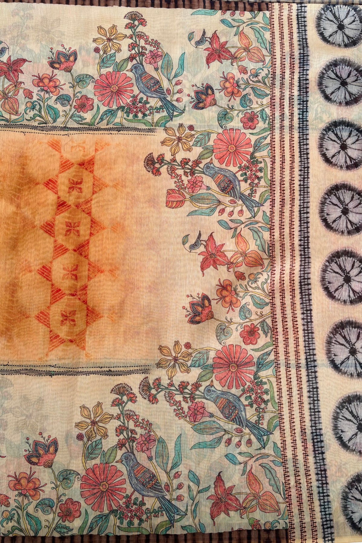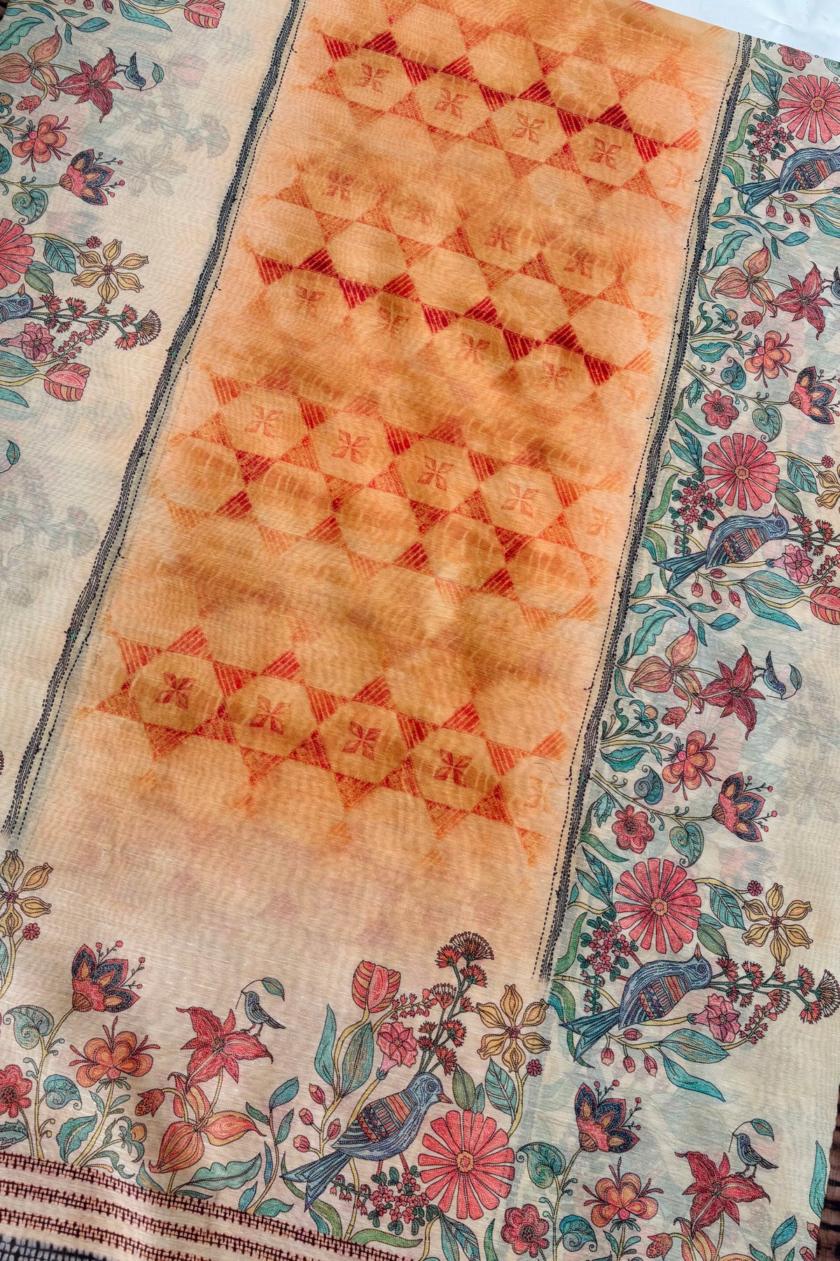 A vibrant saree that beautifully combines nature-inspired artistry with geometric charm. The body features warm orange and red diamond patterns, while the borders come alive with detailed floral designs and graceful birds nestled among blooming flowers. The lower edge is highlighted with bold circular motifs and tassels, adding a playful touch to the drape. A perfect pick for those who adore a blend of tradition, artistry, and quirky detailing.