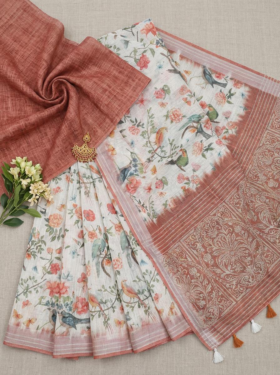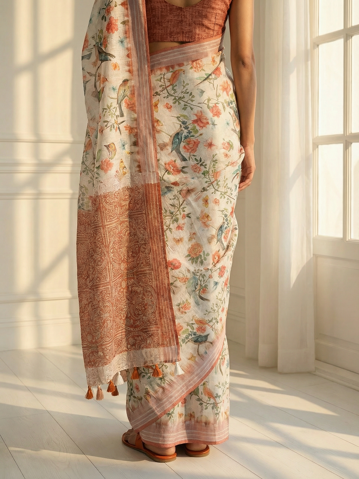 A graceful linen saree featuring delicate floral prints across a soft ivory base, enhanced with a warm peach border and pallu. Lightweight, breathable, and perfect for elegant everyday wear, office styling, or subtle festive occasions.
