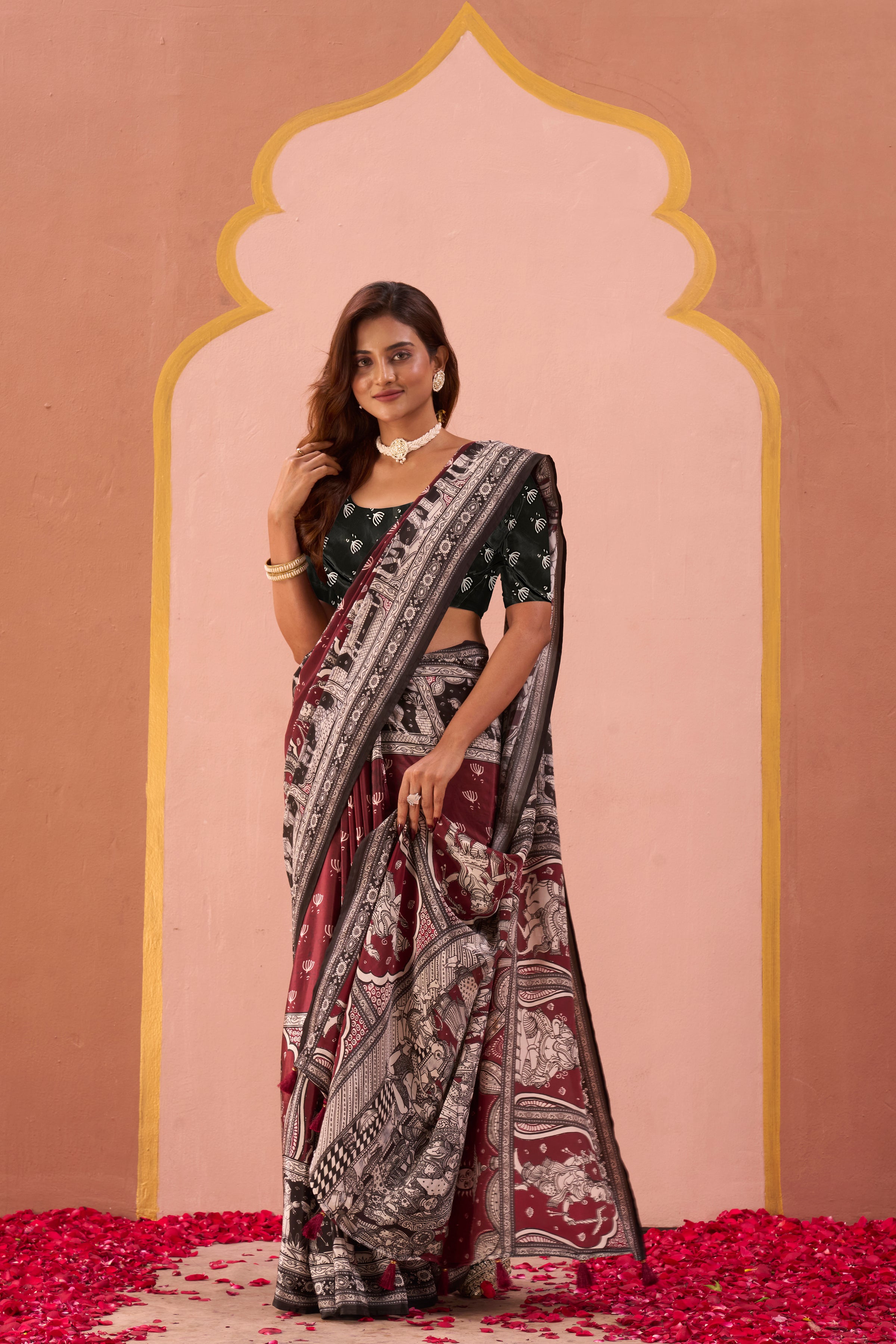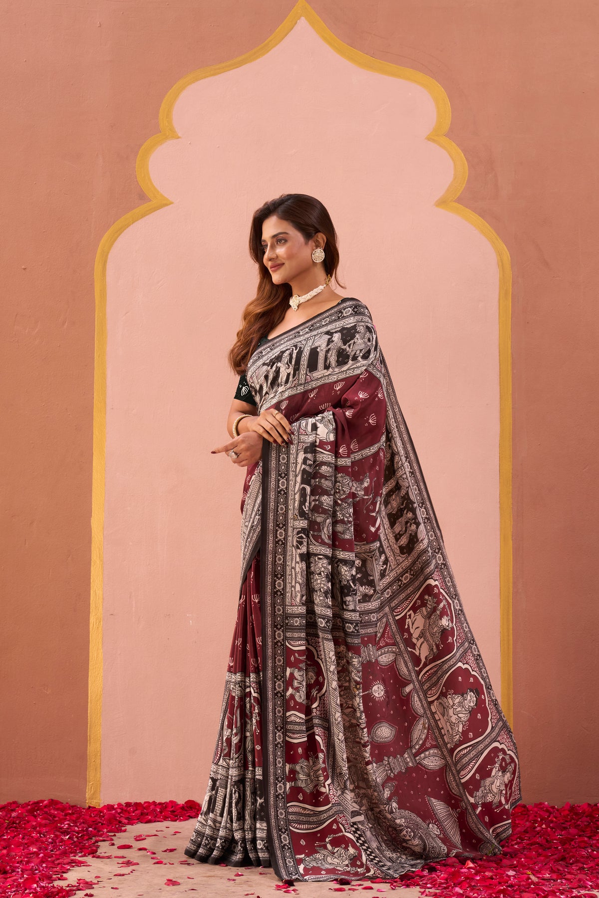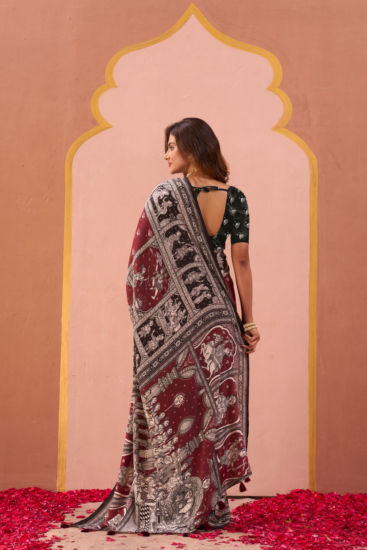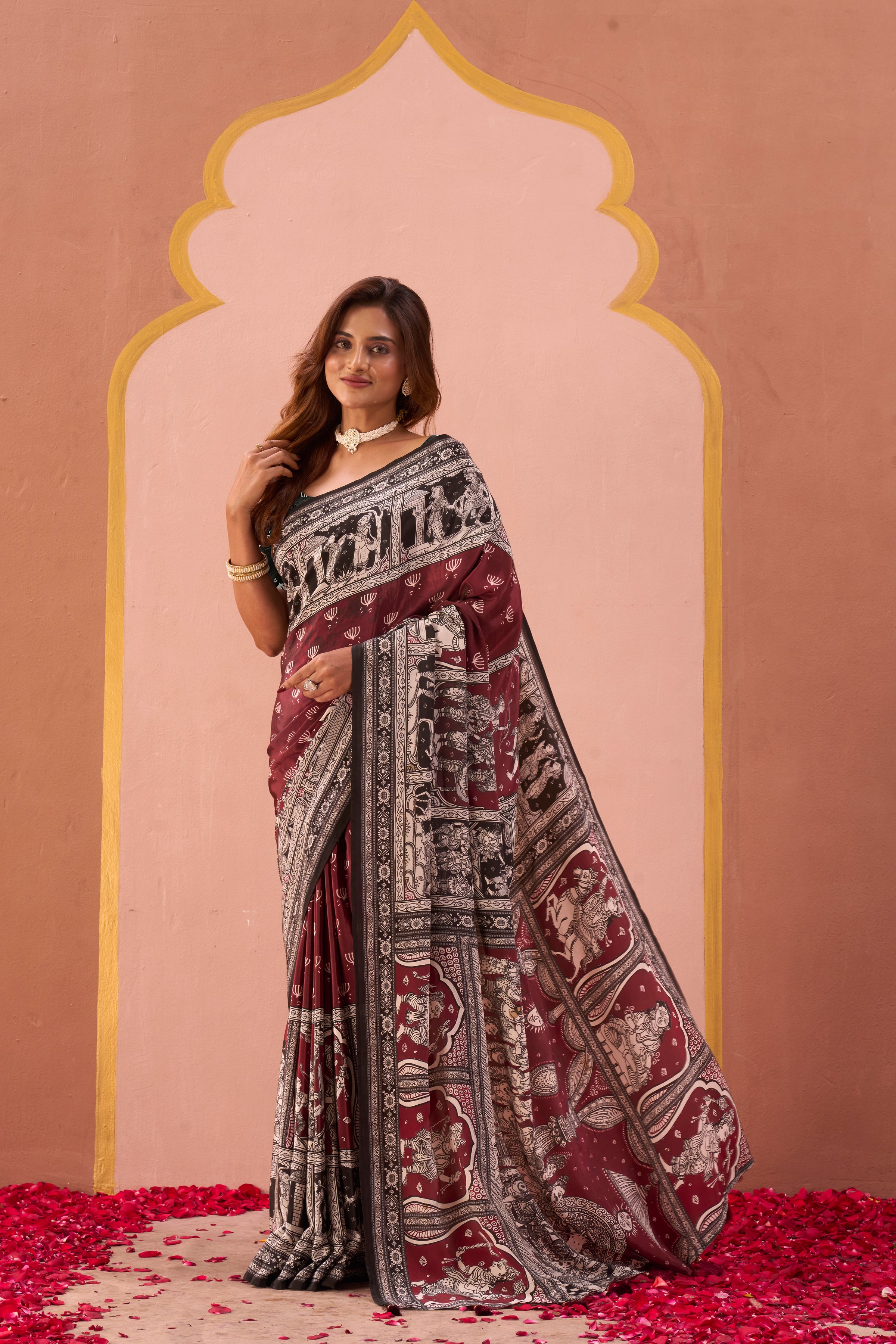 A maroon and black saree featuring intricate folk and mythological prints across the drape. Accented with a bold border and an artistic pallu, it pairs beautifully with a contrasting blouse adorned in hand-drawn leaf motifs. A timeless blend of culture and elegance.