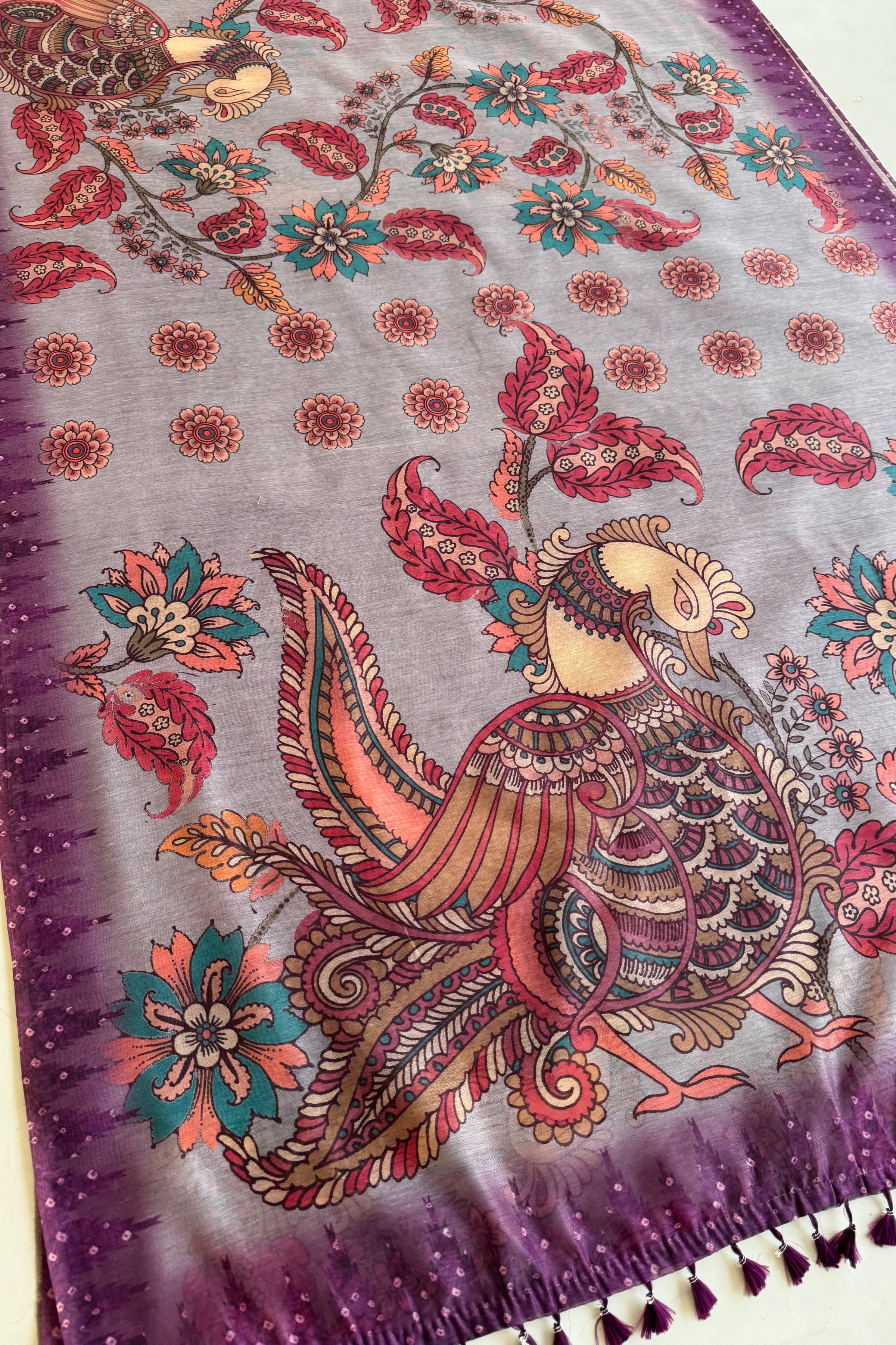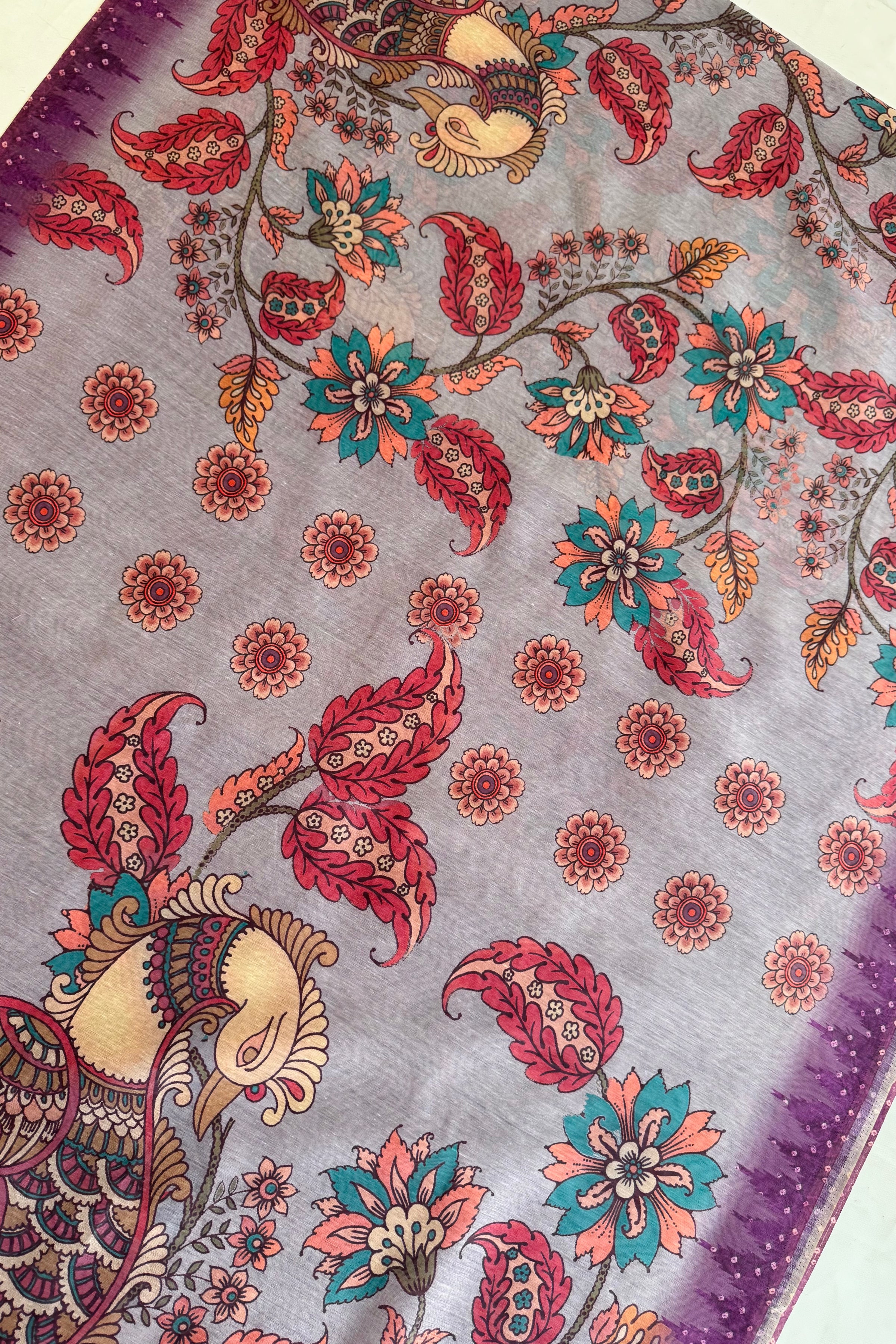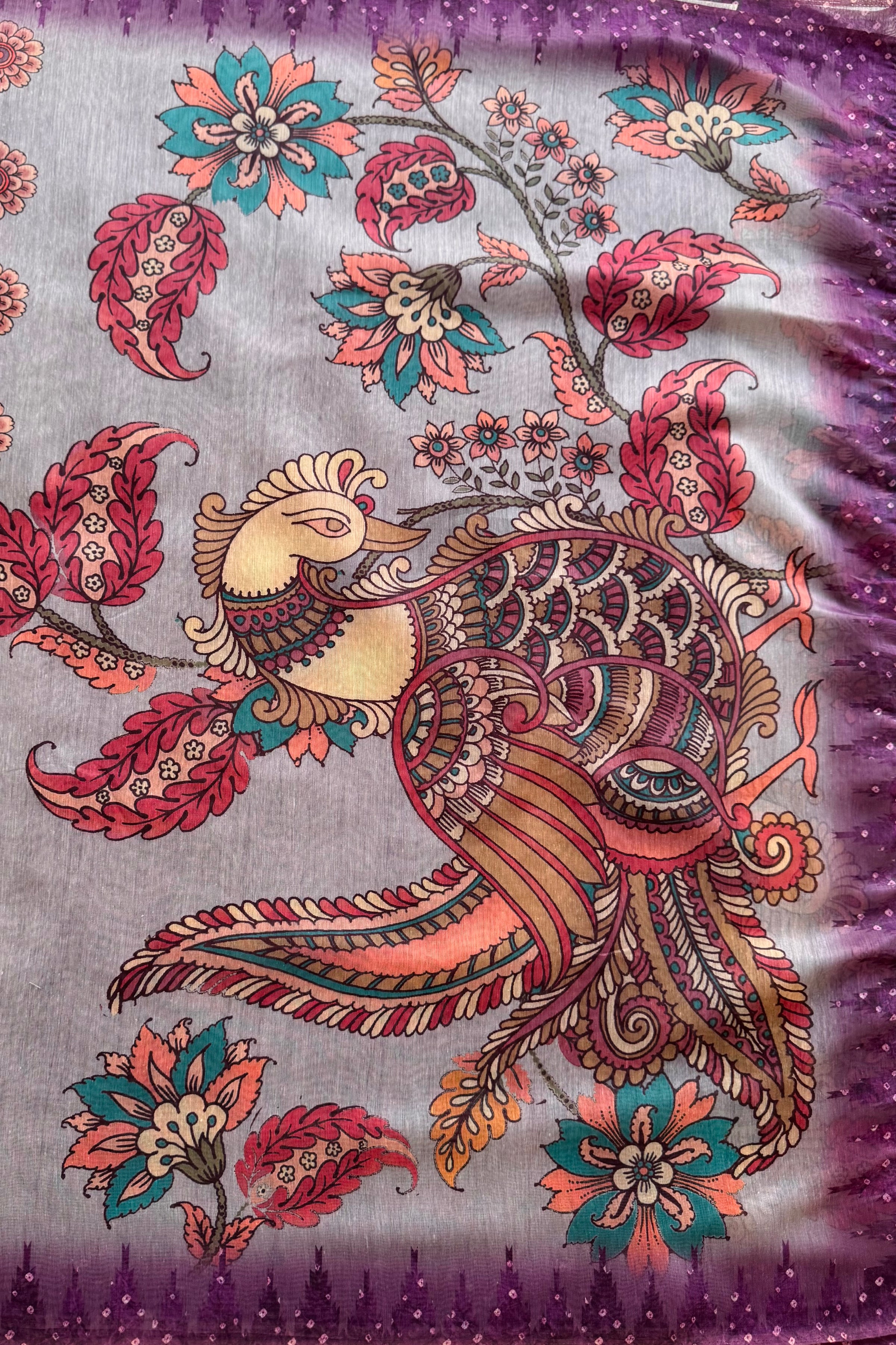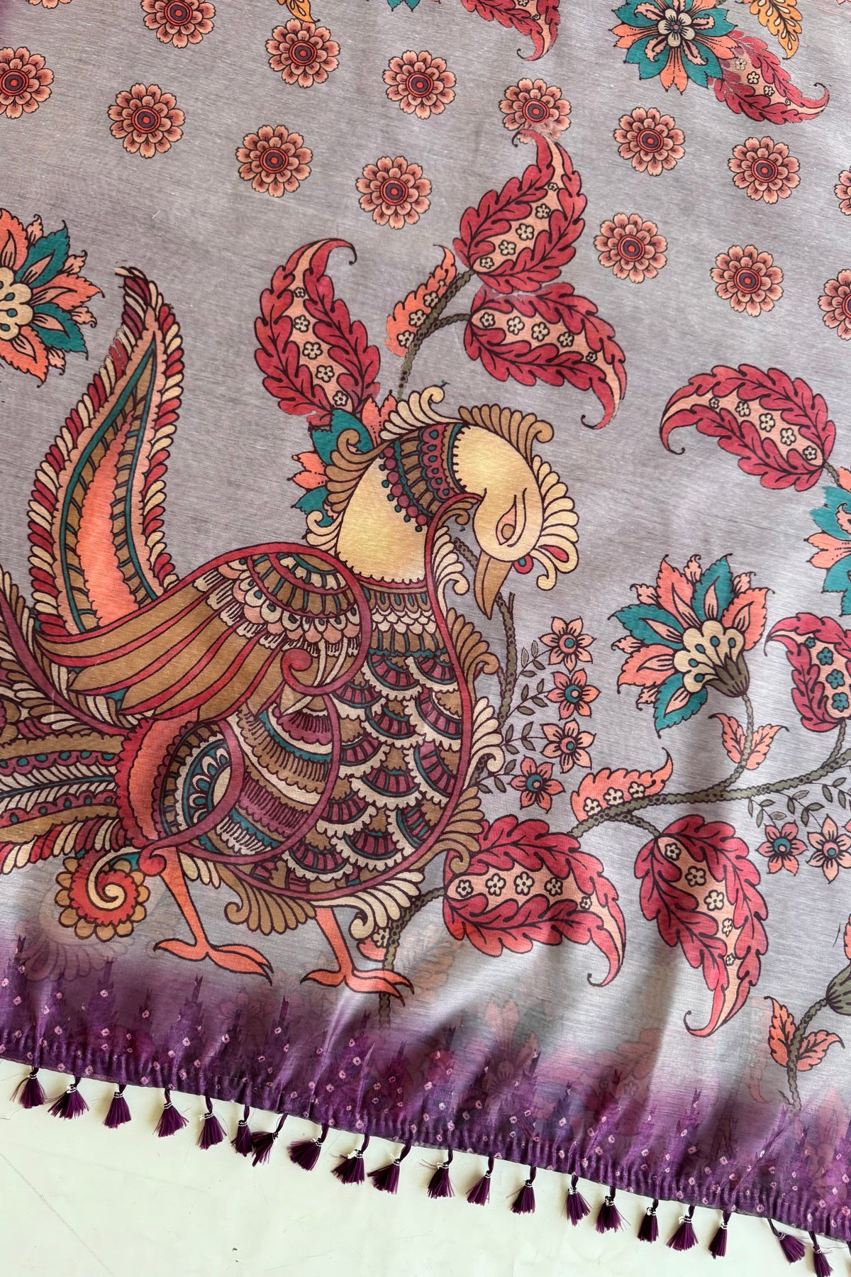 This saree features a soft grey base with a rich purple border, creating a beautiful contrast. The body is decorated with detailed bird, floral, and leafy prints in shades of coral, teal, peach, and maroon. Finished with tassels at the edge, it offers a graceful and festive look, perfect for cultural events and special occasions.