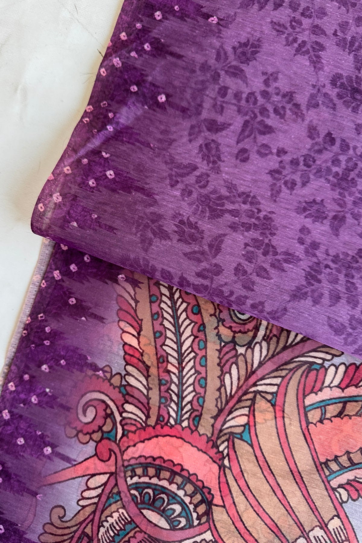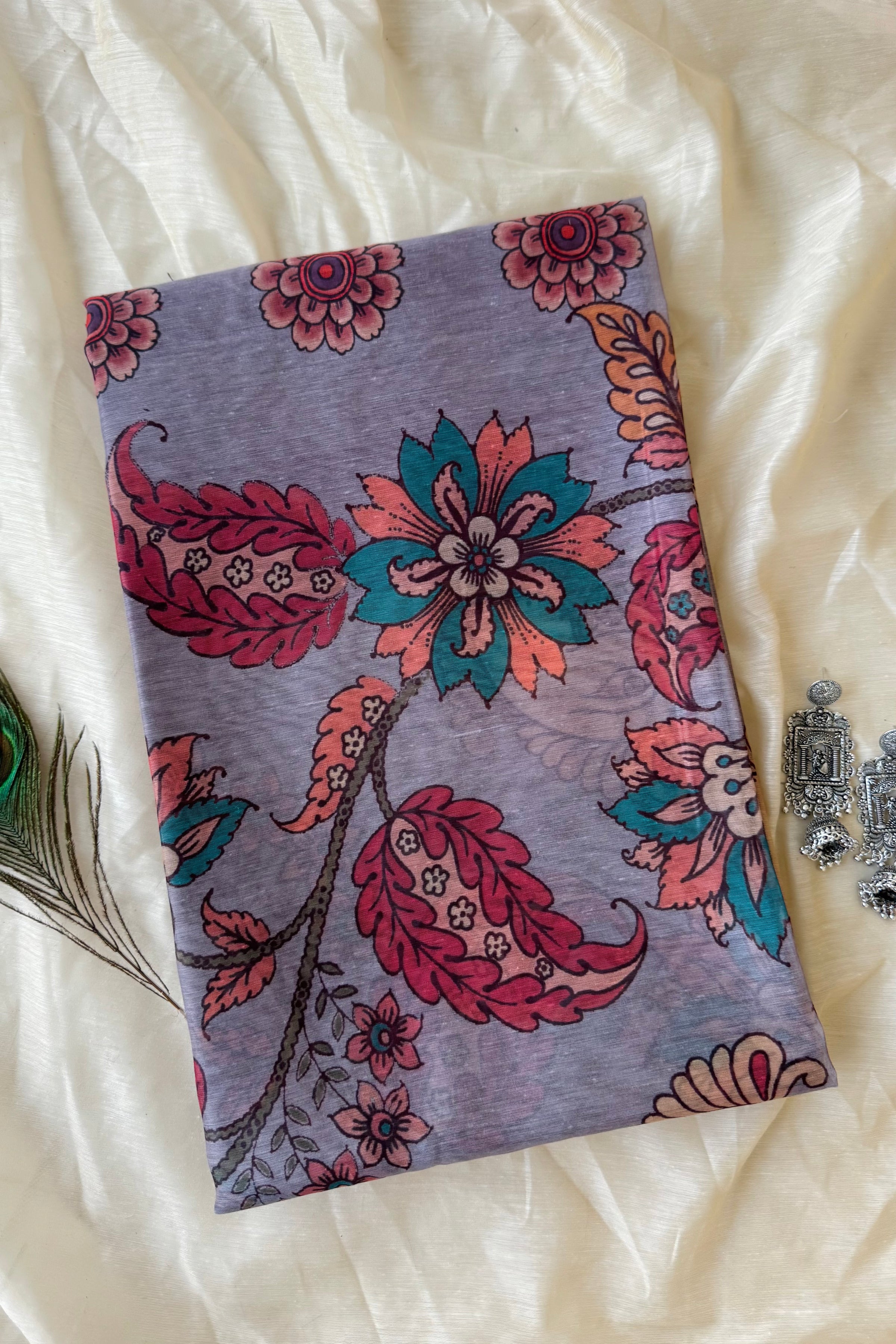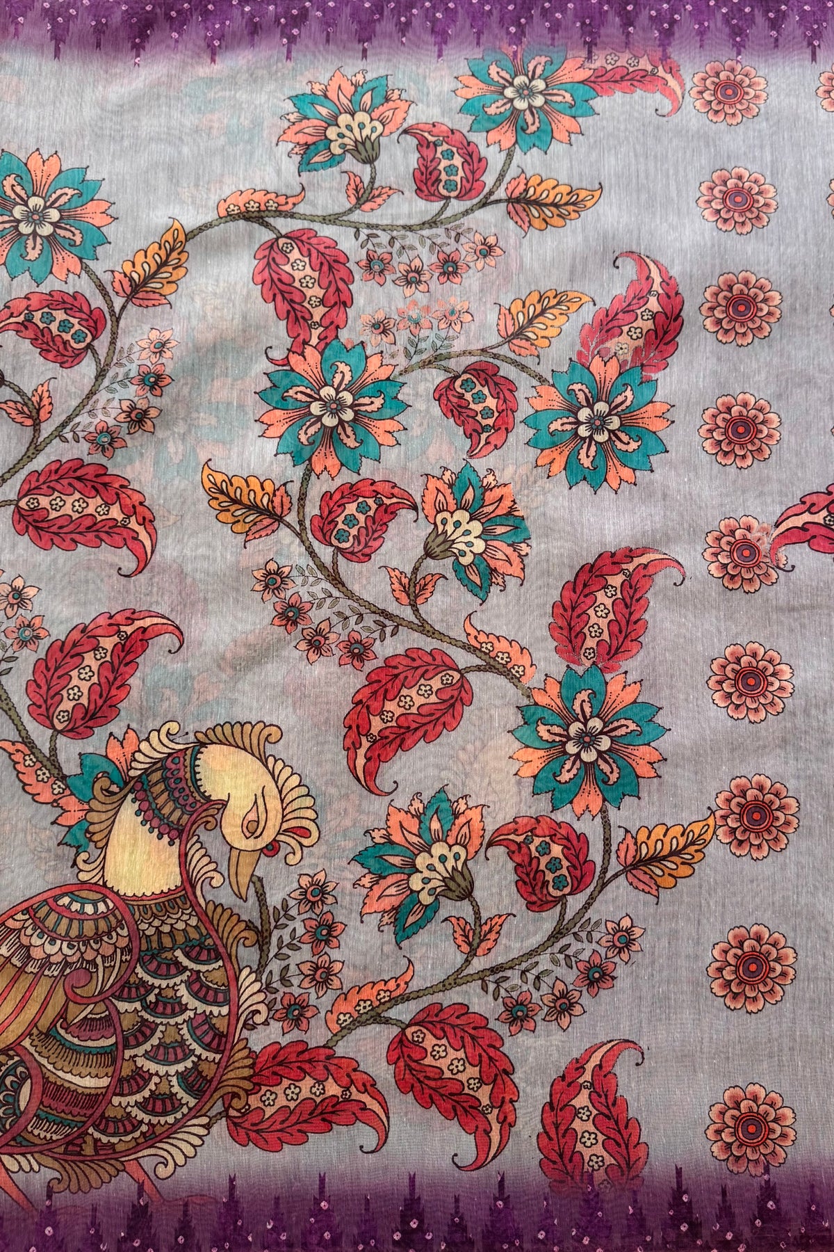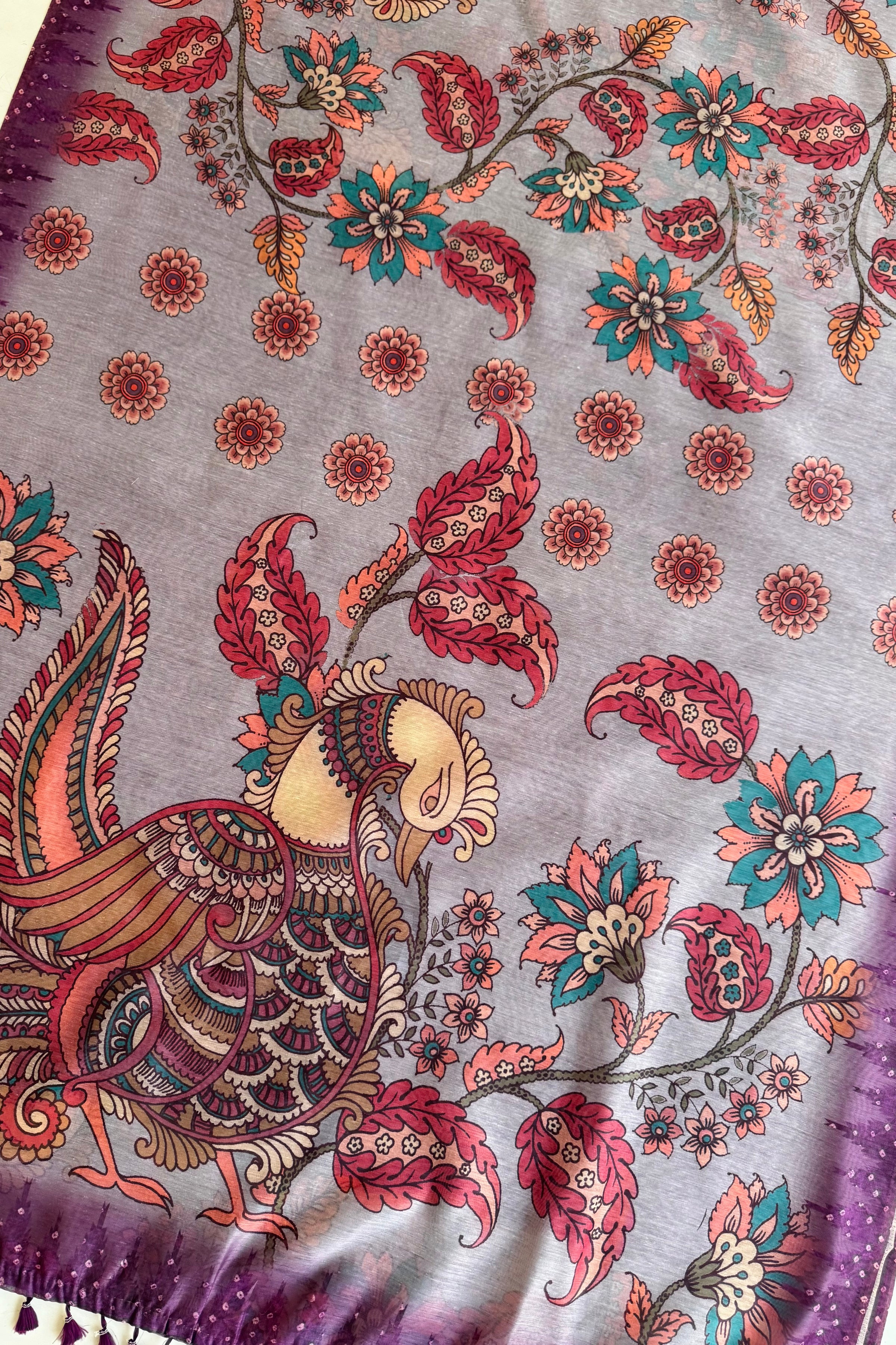This saree features a soft grey base with a rich purple border, creating a beautiful contrast. The body is decorated with detailed bird, floral, and leafy prints in shades of coral, teal, peach, and maroon. Finished with tassels at the edge, it offers a graceful and festive look, perfect for cultural events and special occasions.