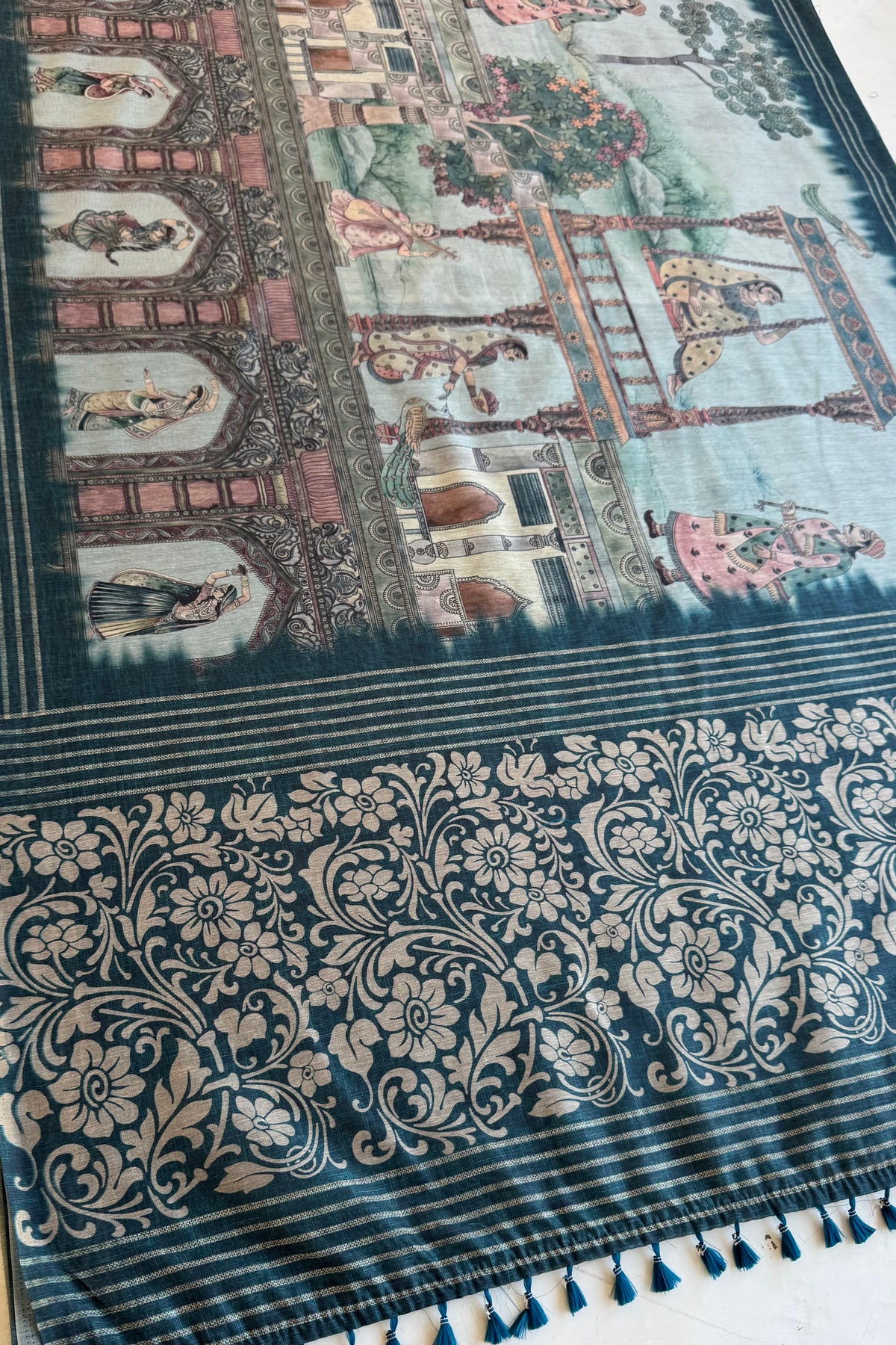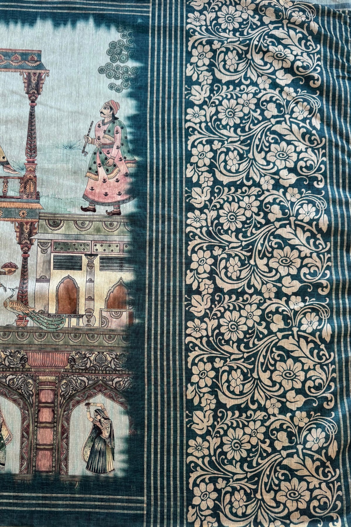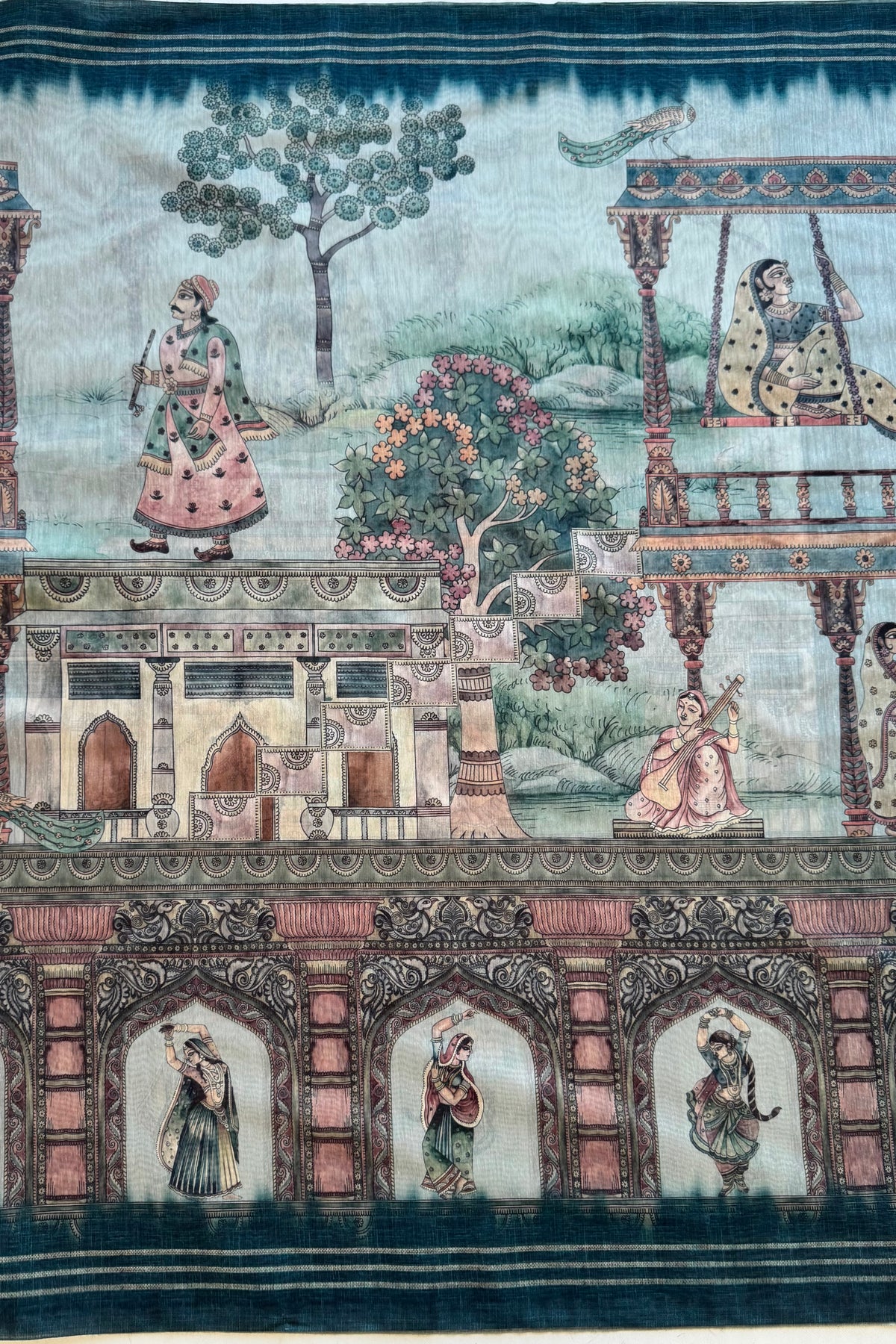 This saree features a soothing blue-green base adorned with detailed heritage-inspired scenic prints, showing palace architecture, graceful figures, trees, and nature elements that create a storytelling charm across the drape. The pallu stands out with elegant shell motifs, framed with floral borders and fine stripes, adding a coastal yet traditional touch. Finished with tassels, the saree carries a calm, artistic vibe—perfect for those who love prints with depth and character.