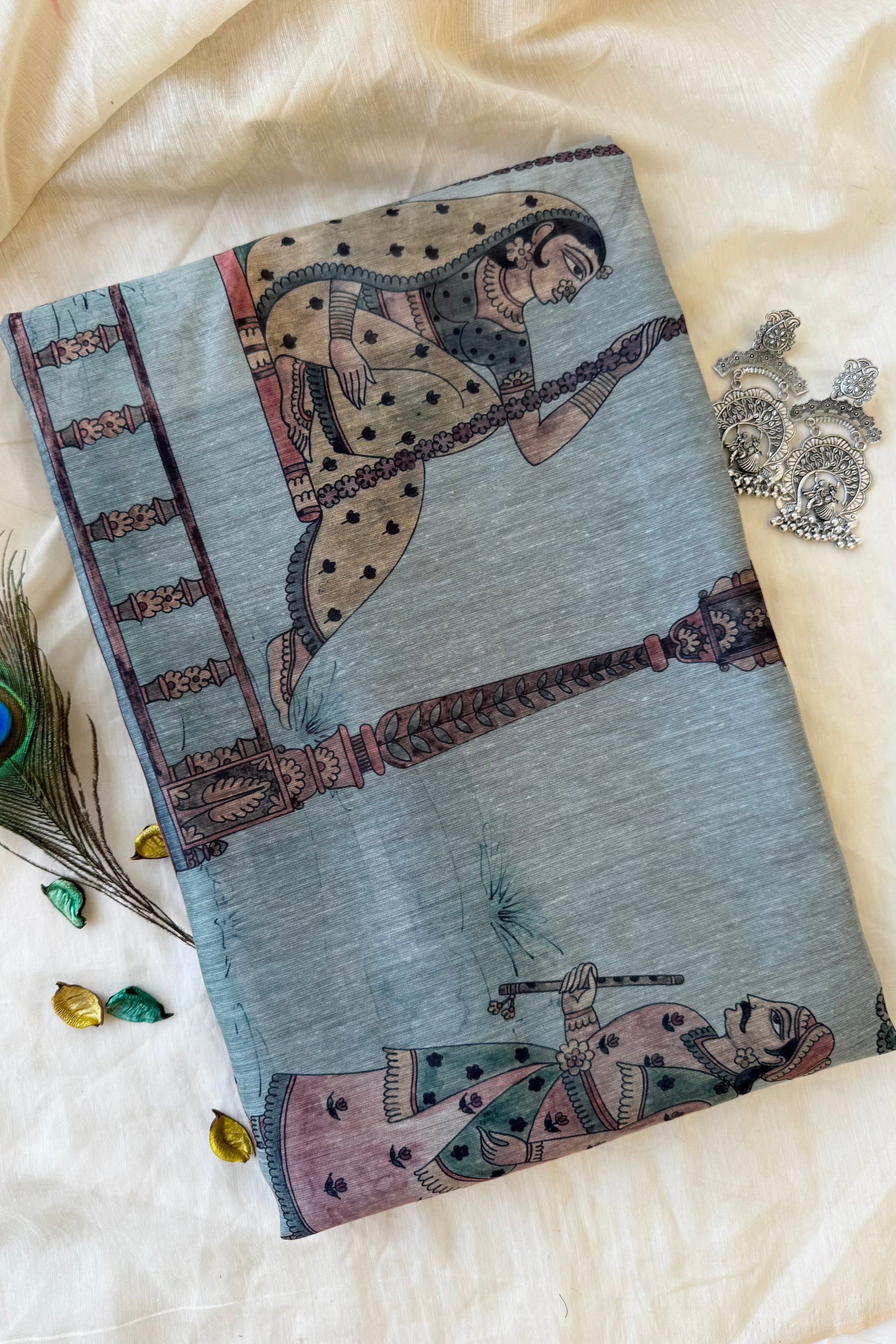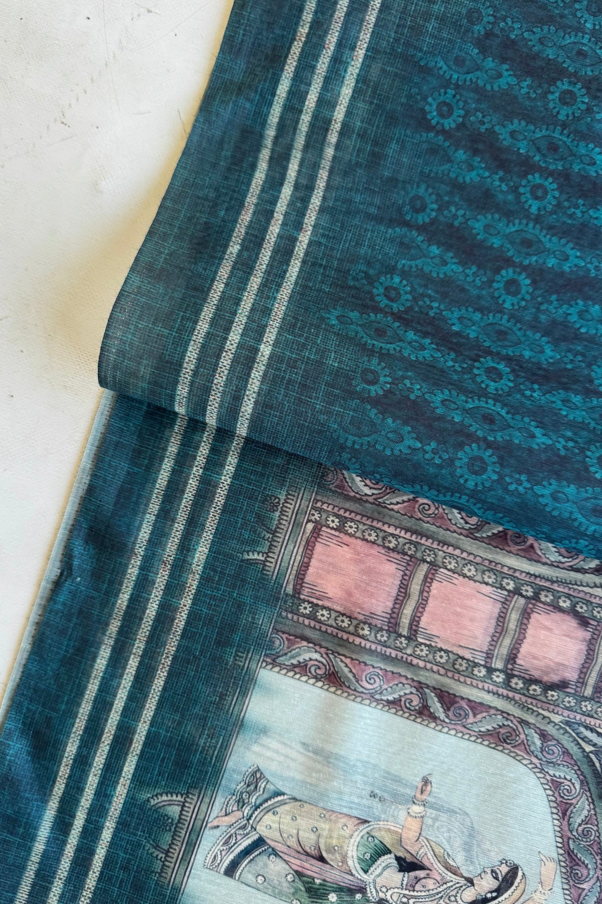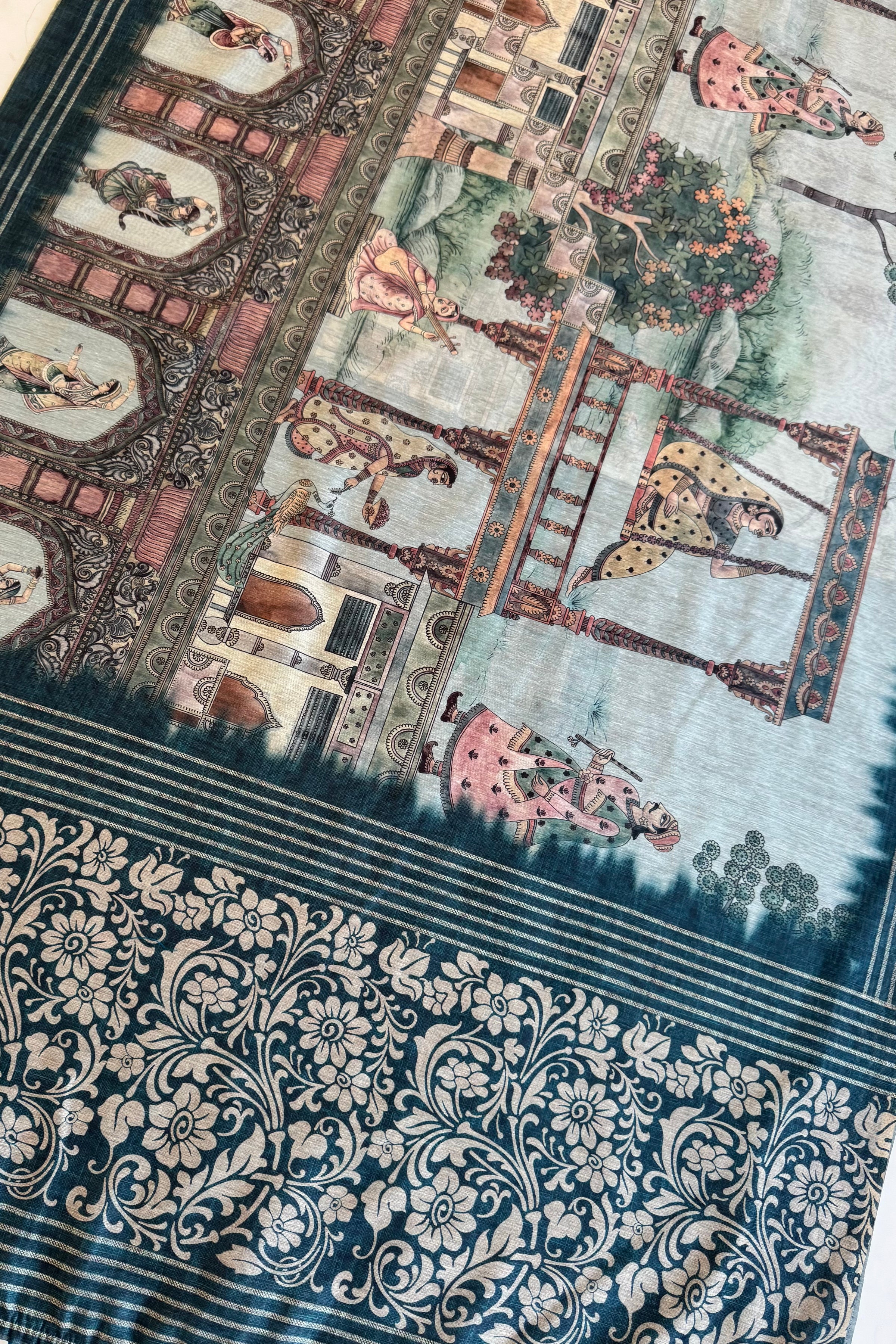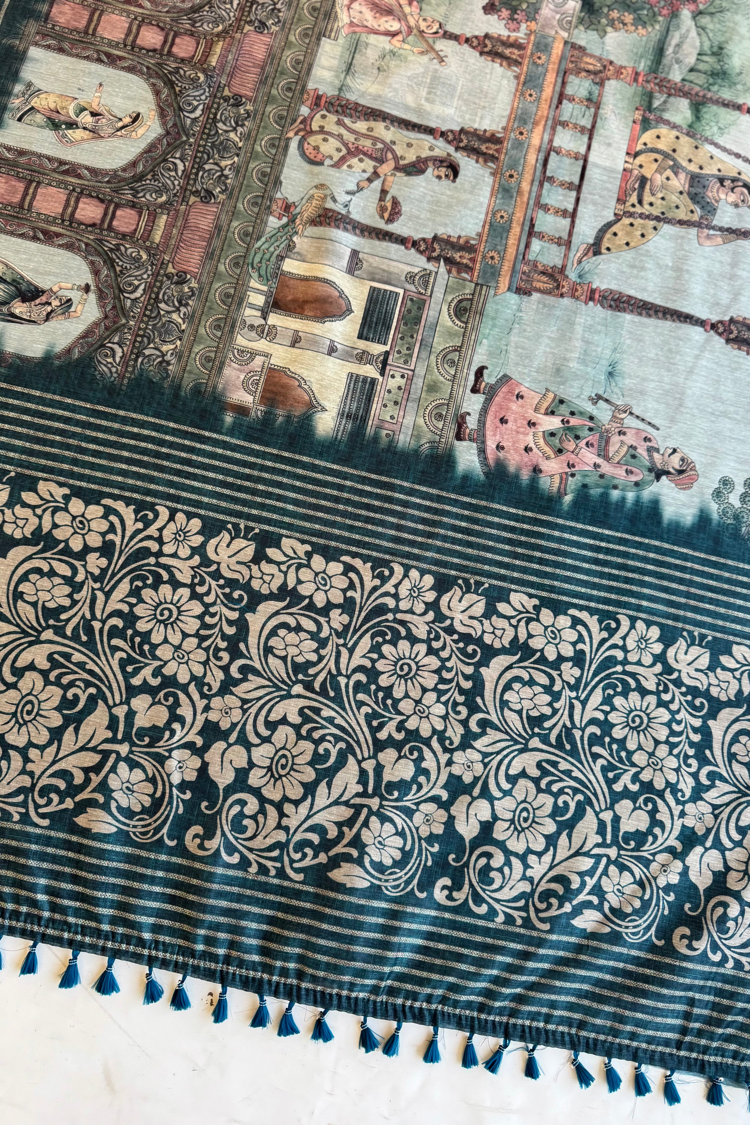 This saree features a soothing blue-green base adorned with detailed heritage-inspired scenic prints, showing palace architecture, graceful figures, trees, and nature elements that create a storytelling charm across the drape. The pallu stands out with elegant shell motifs, framed with floral borders and fine stripes, adding a coastal yet traditional touch. Finished with tassels, the saree carries a calm, artistic vibe—perfect for those who love prints with depth and character.