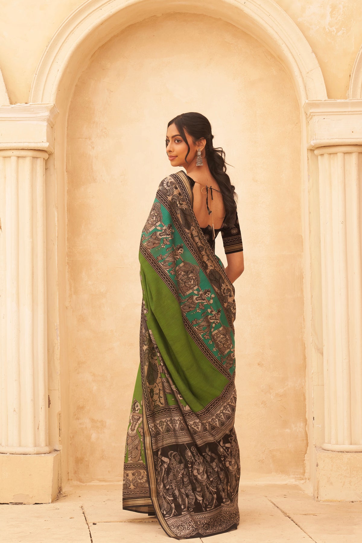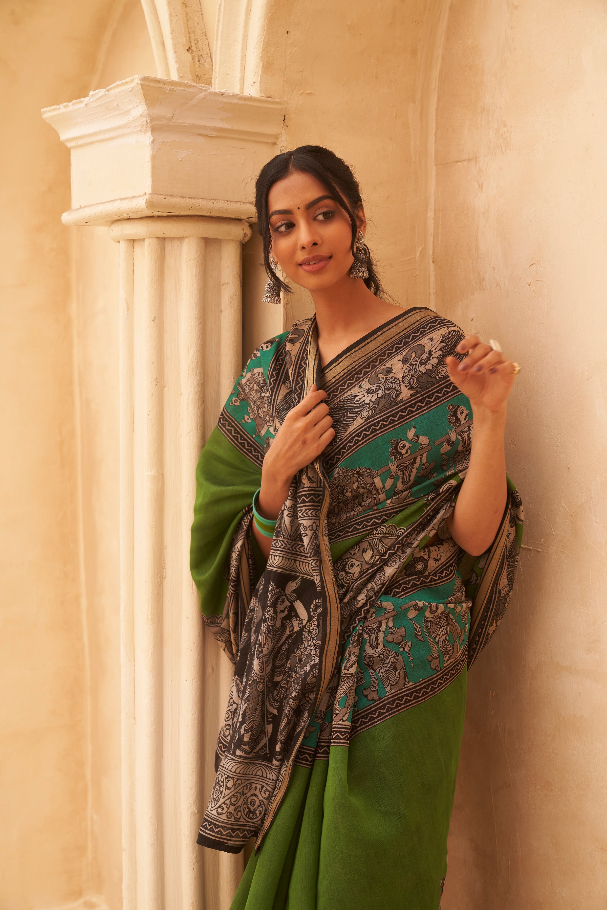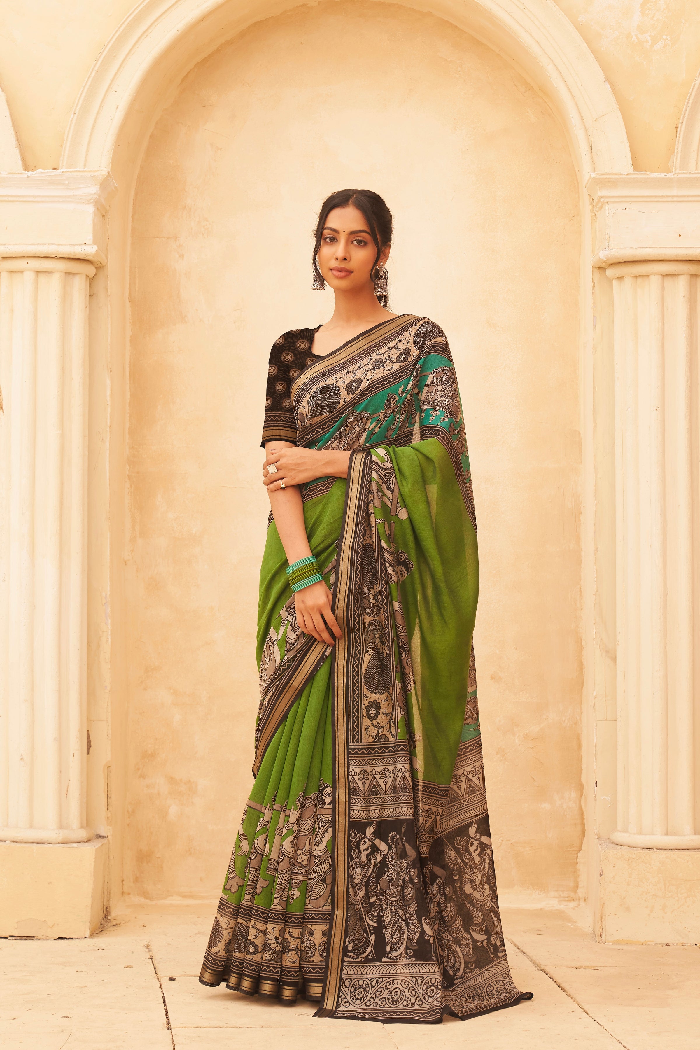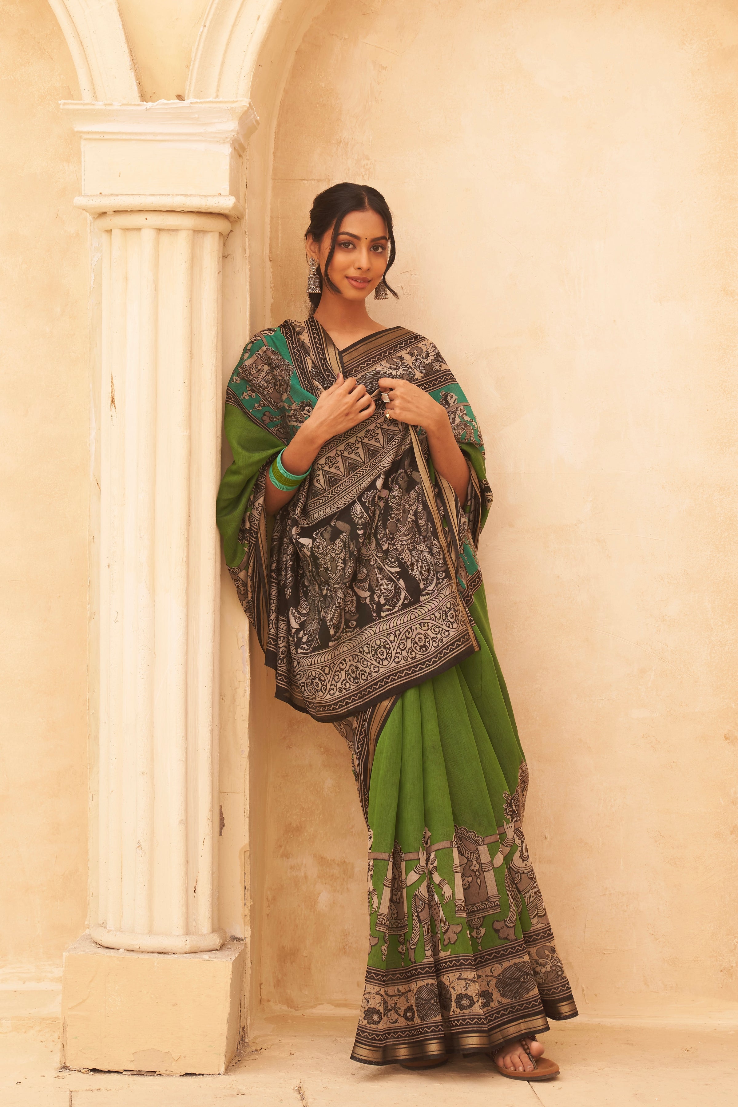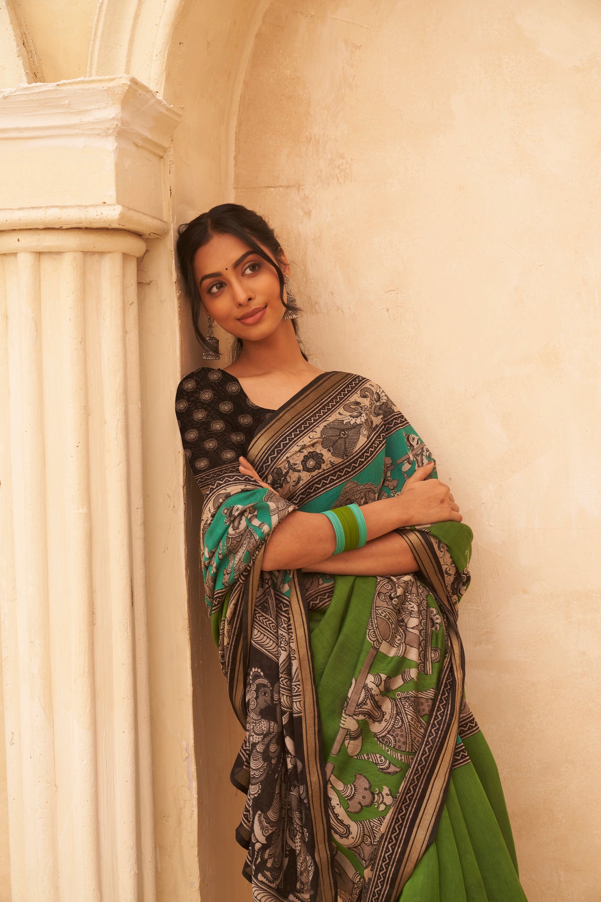 This saree features a fresh green body paired with a contrasting black printed pallu. The saree is detailed with traditional motifs and a printed border that adds depth and character to the overall look. Made in a soft, lightweight fabric, it drapes beautifully and feels comfortable all day. Perfect for festive gatherings, cultural events, and elegant daytime wear.