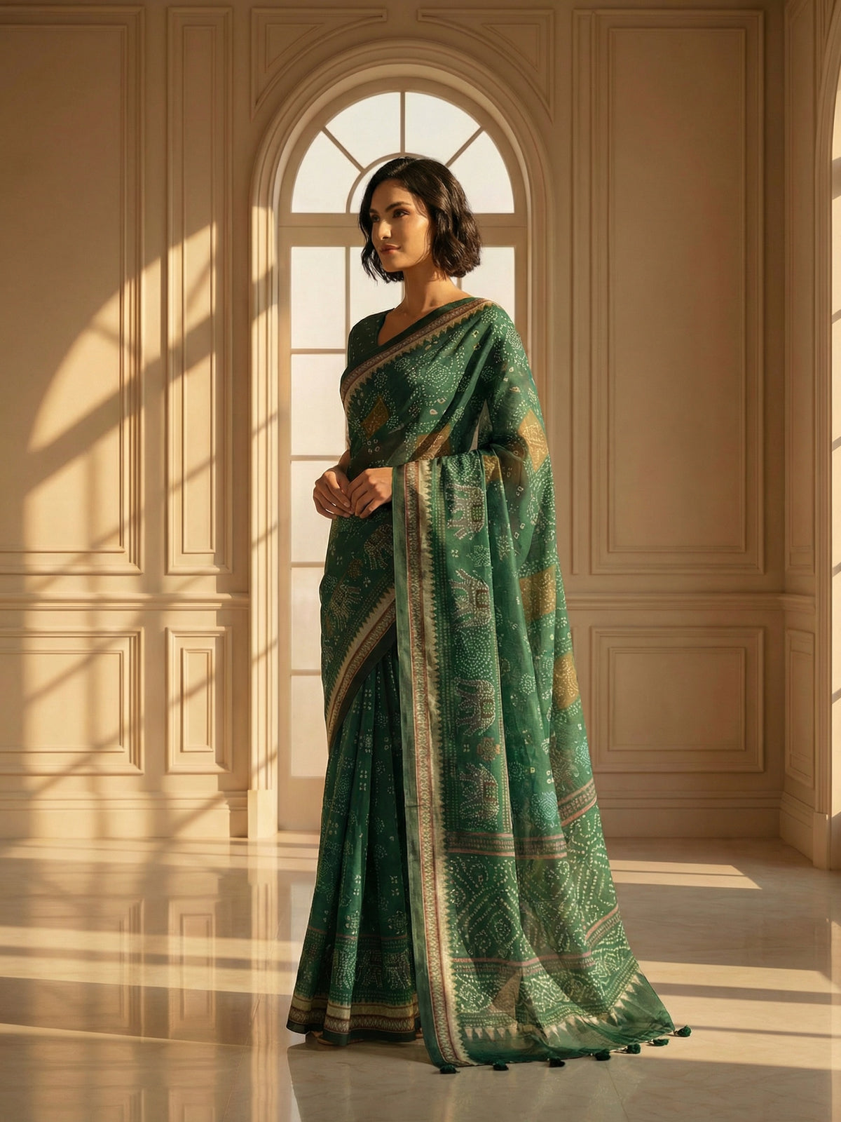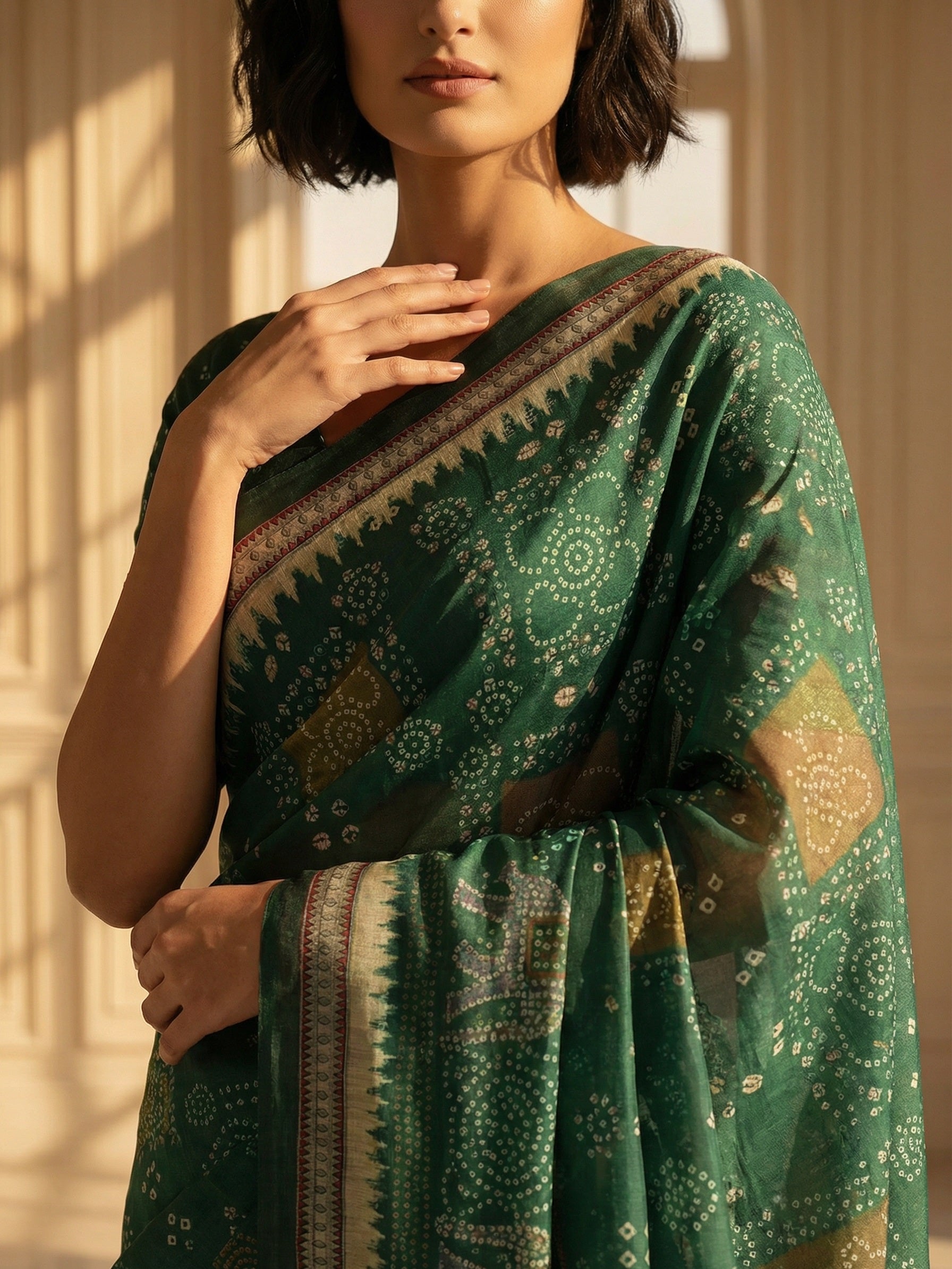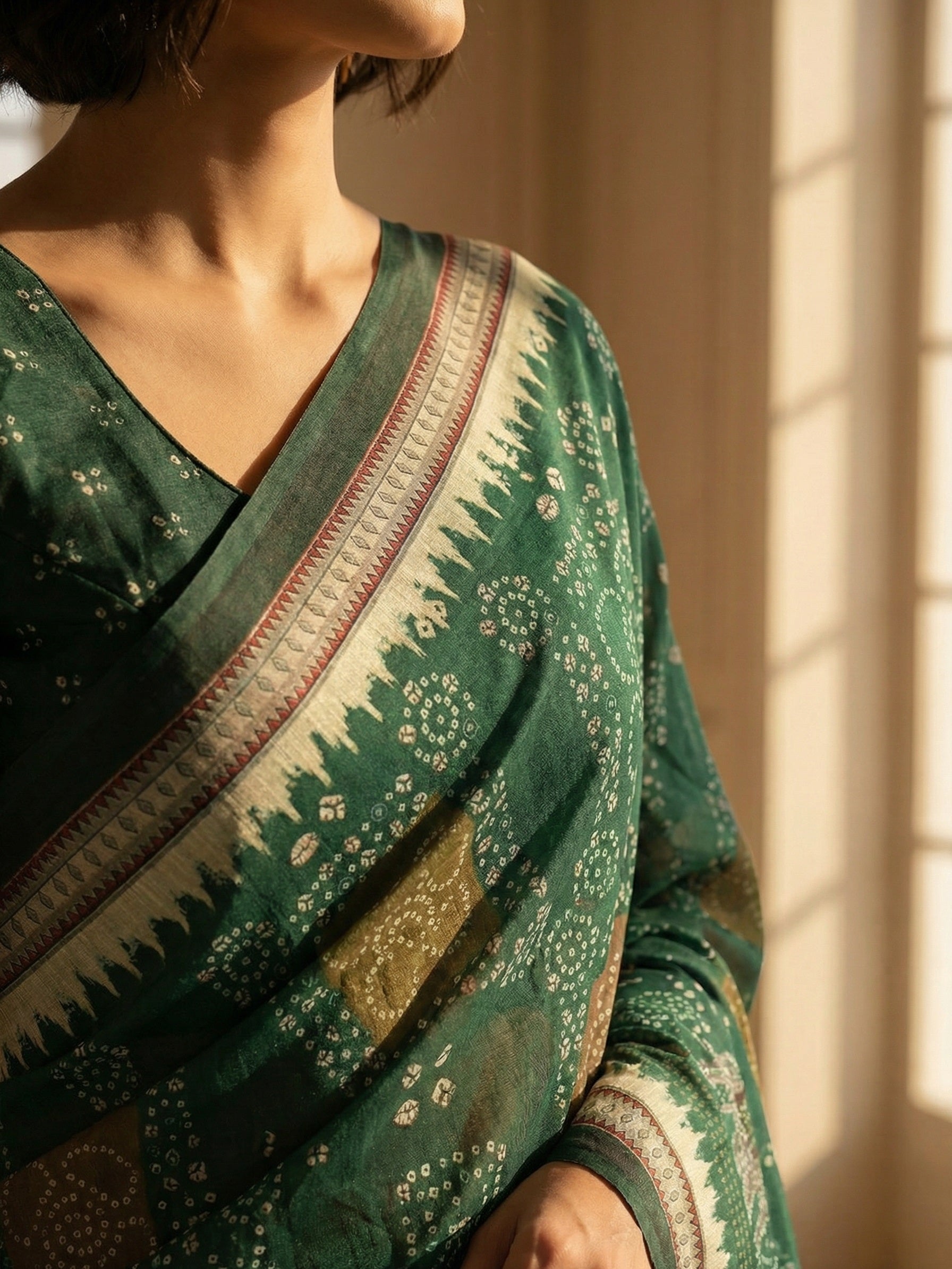 A graceful Chanderi silk saree featuring elegant bandhani-style traditional prints across the body, highlighted with a detailed border and pallu. Lightweight, breathable, and perfect for office wear, festive occasions, and timeless ethnic elegance.