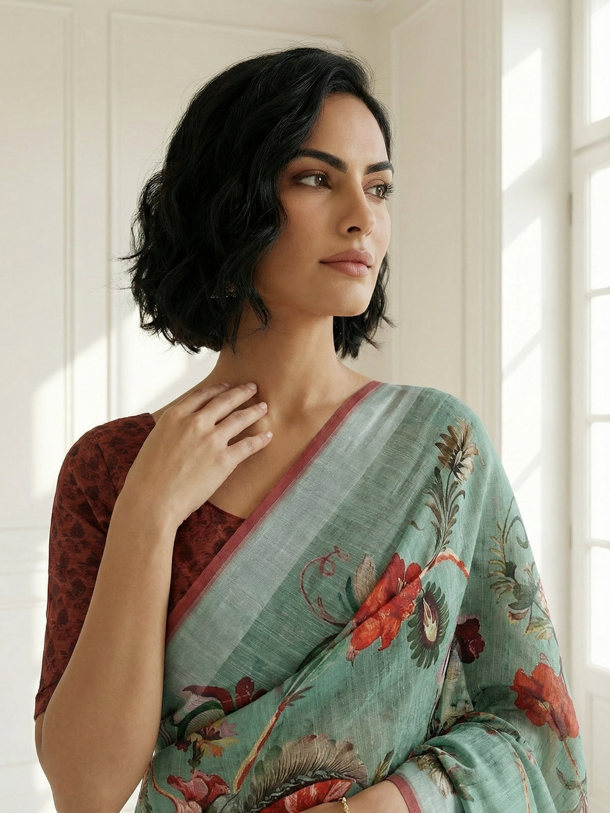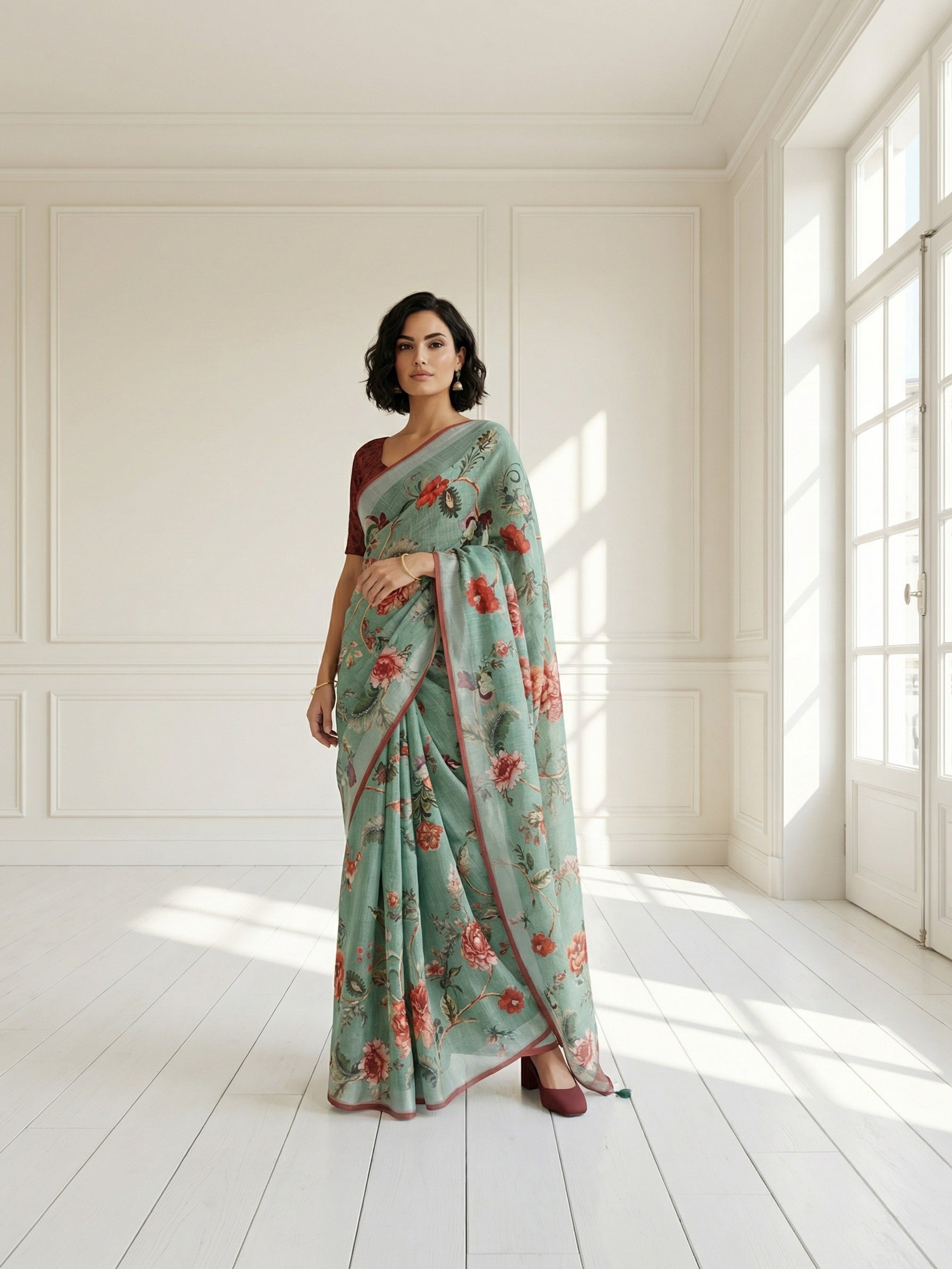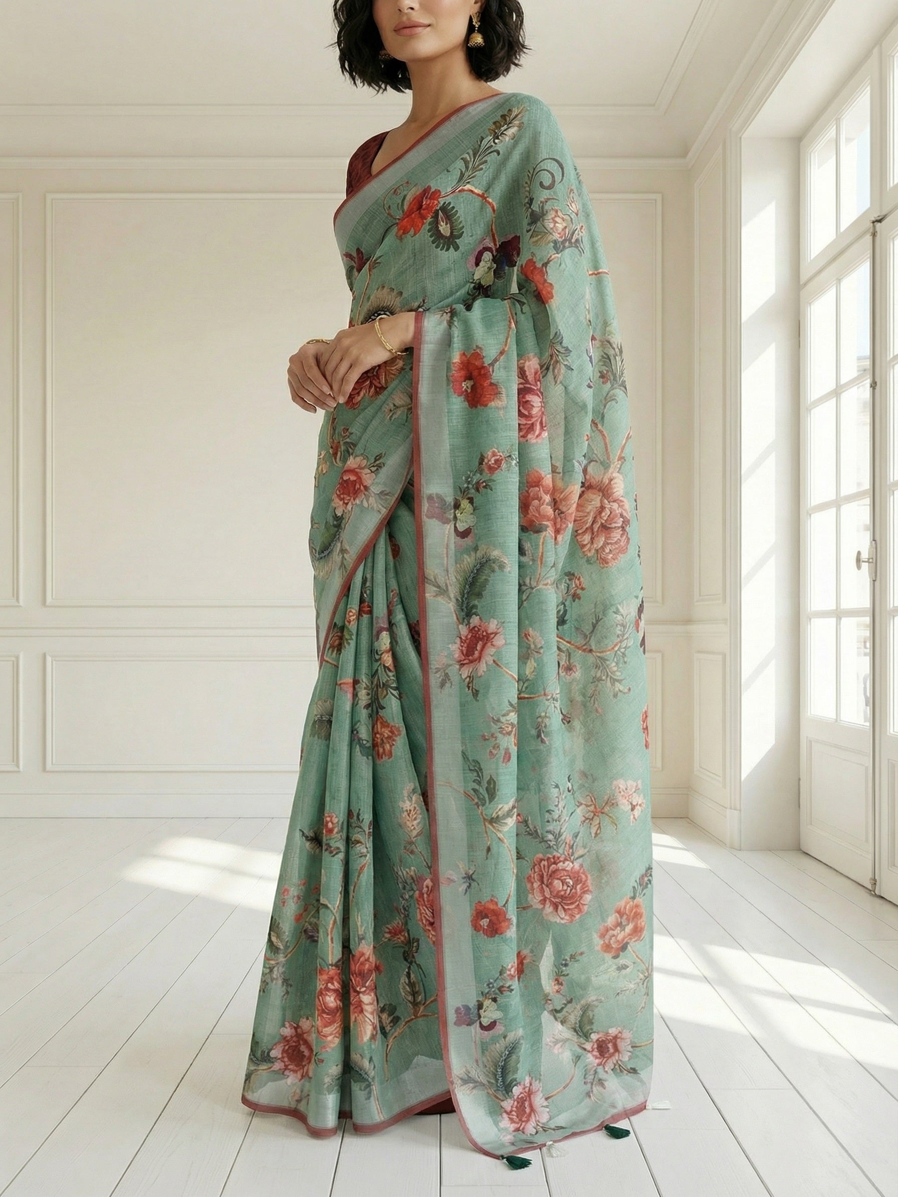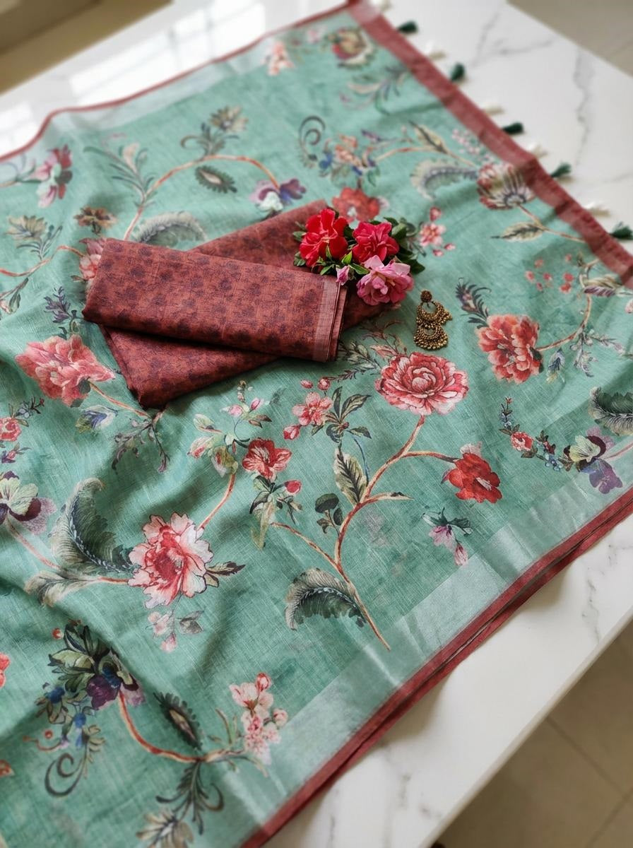 "A graceful linen saree featuring delicate floral prints across a soft sage green base, complemented by a subtle border. Lightweight, breathable, and effortlessly elegant—perfect for office wear, casual outings, and refined everyday ethnic styling.