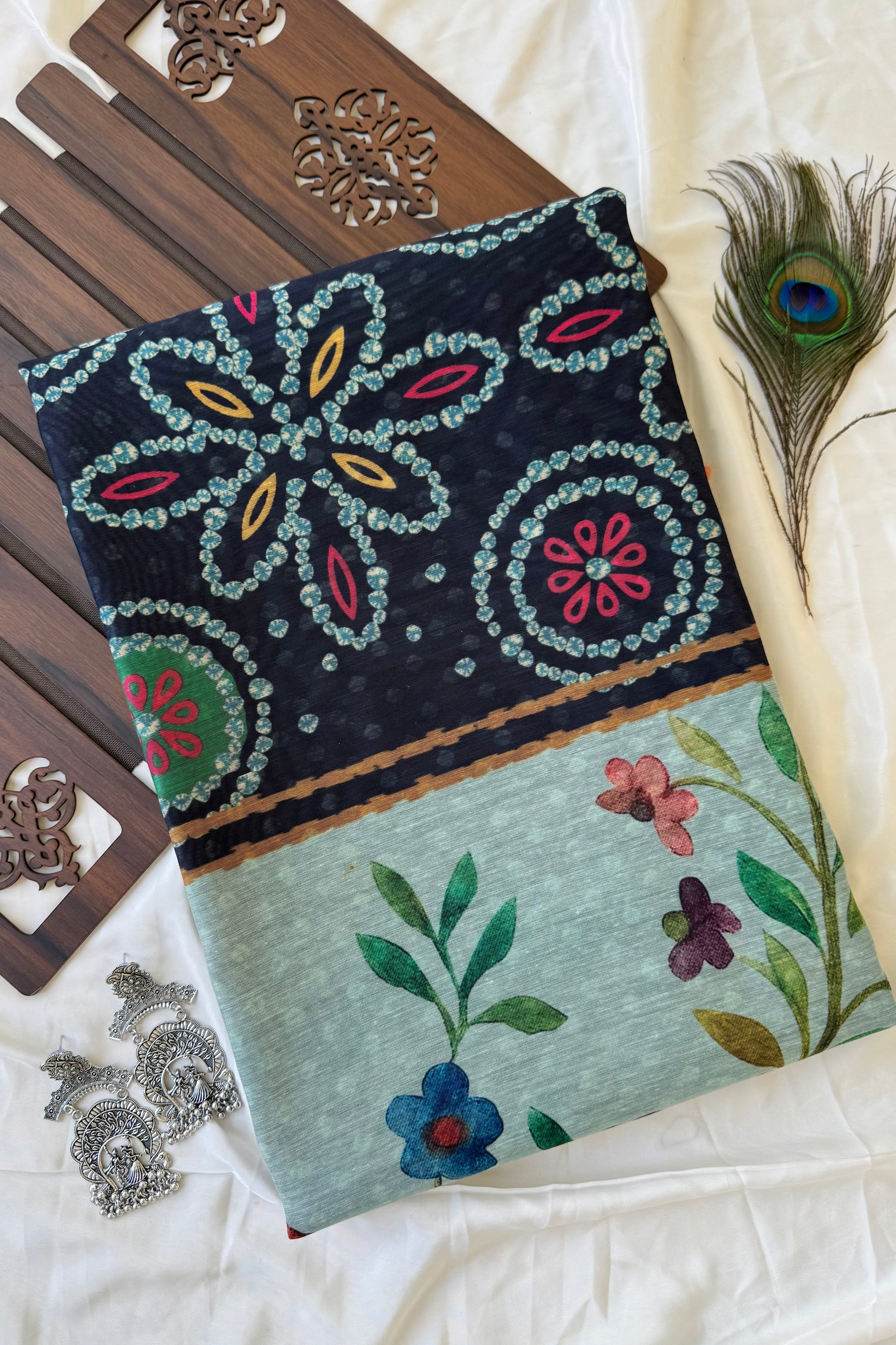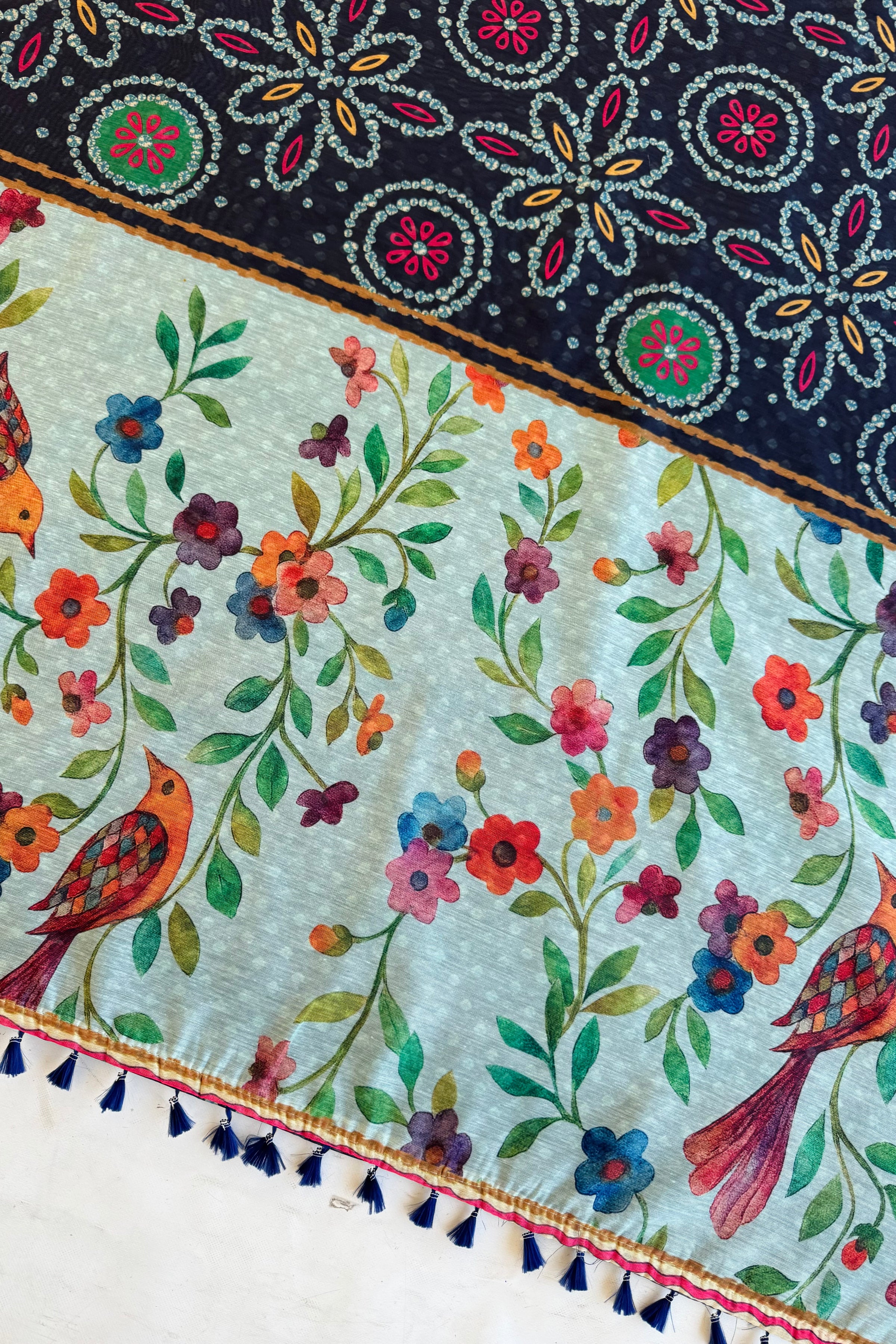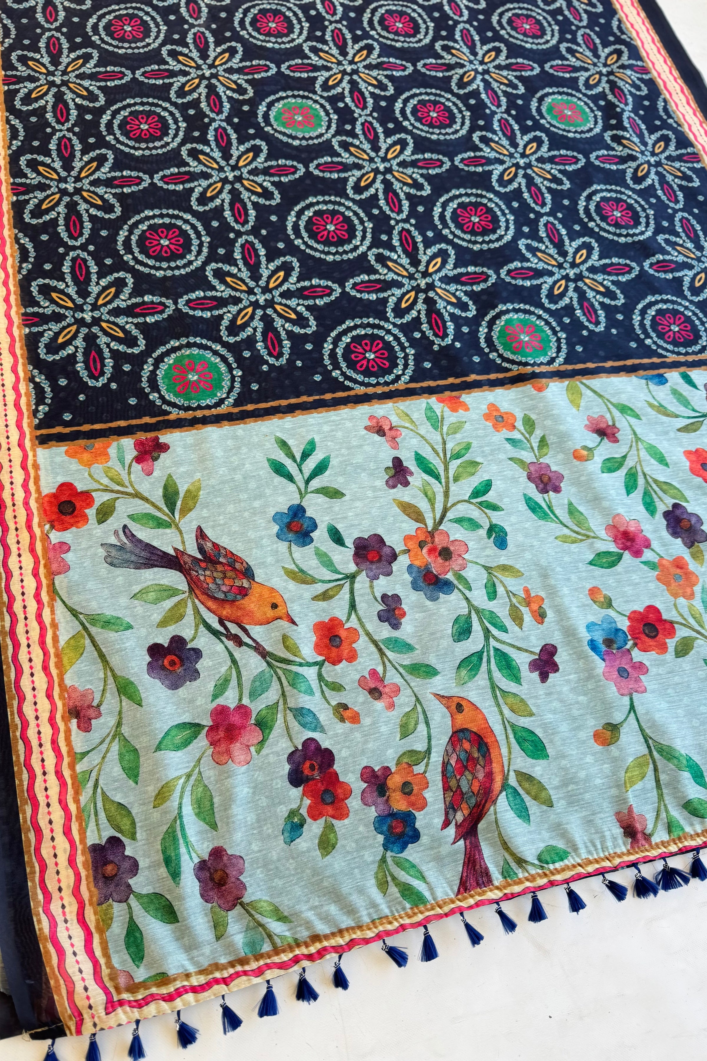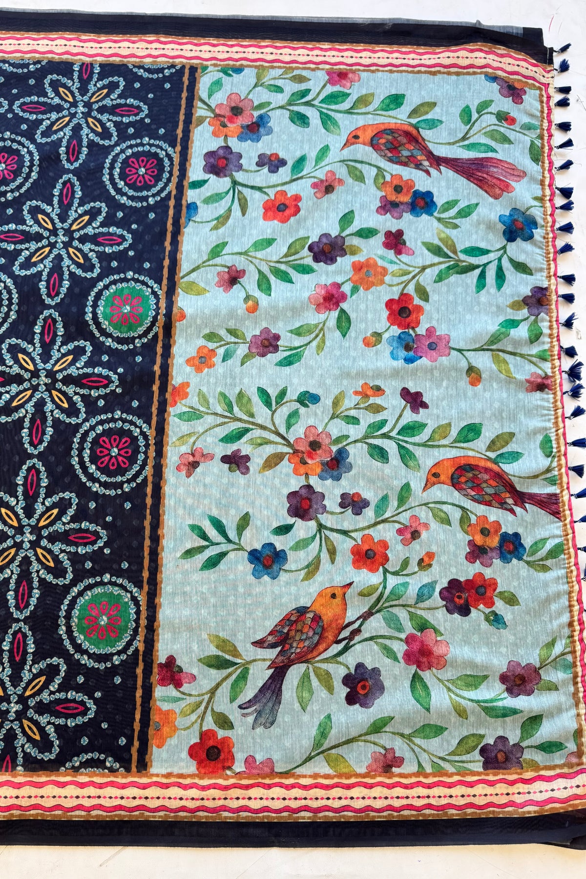 The pallu stands out with colourful floral vines and charming bird prints, adding a lively touch. The contrast between traditional patterns and nature-inspired designs makes it eye-catching. Perfect for those who love detailed prints with a graceful, artistic feel.
