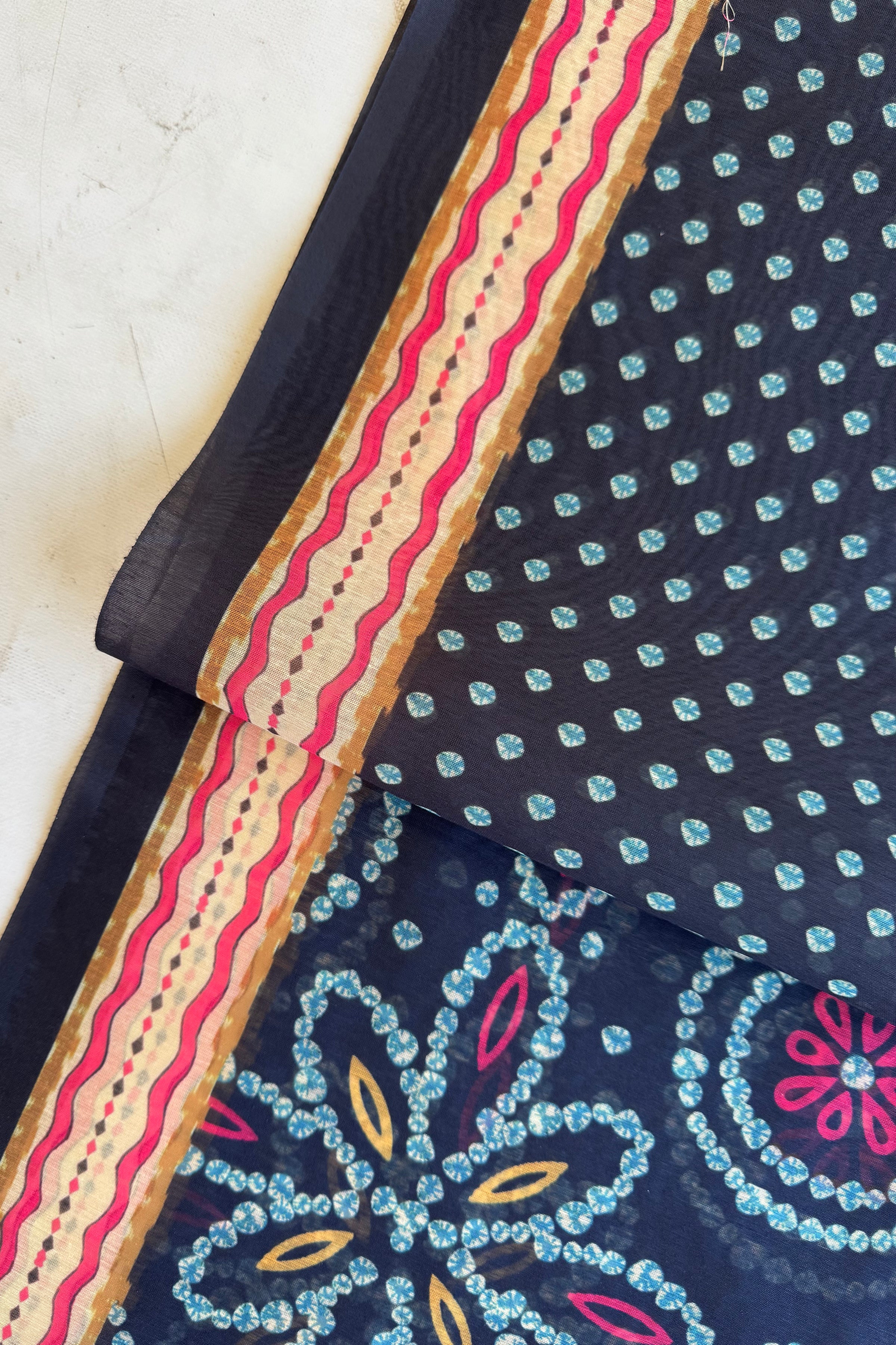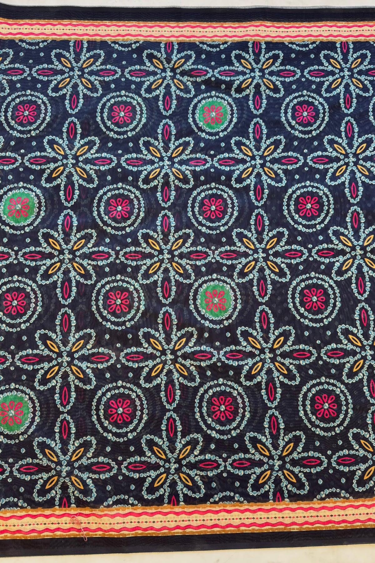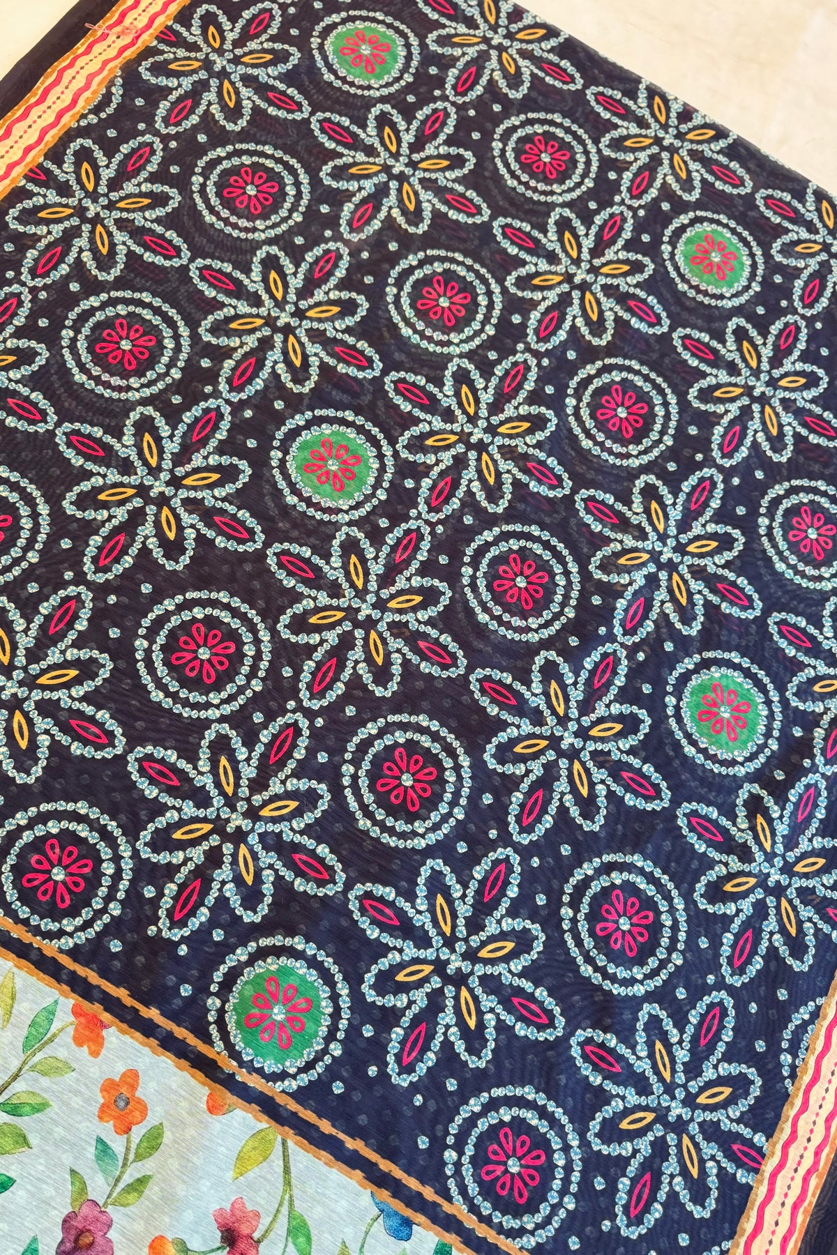 This saree features beautiful all-over geometric dot and floral motifs on a deep, rich base.