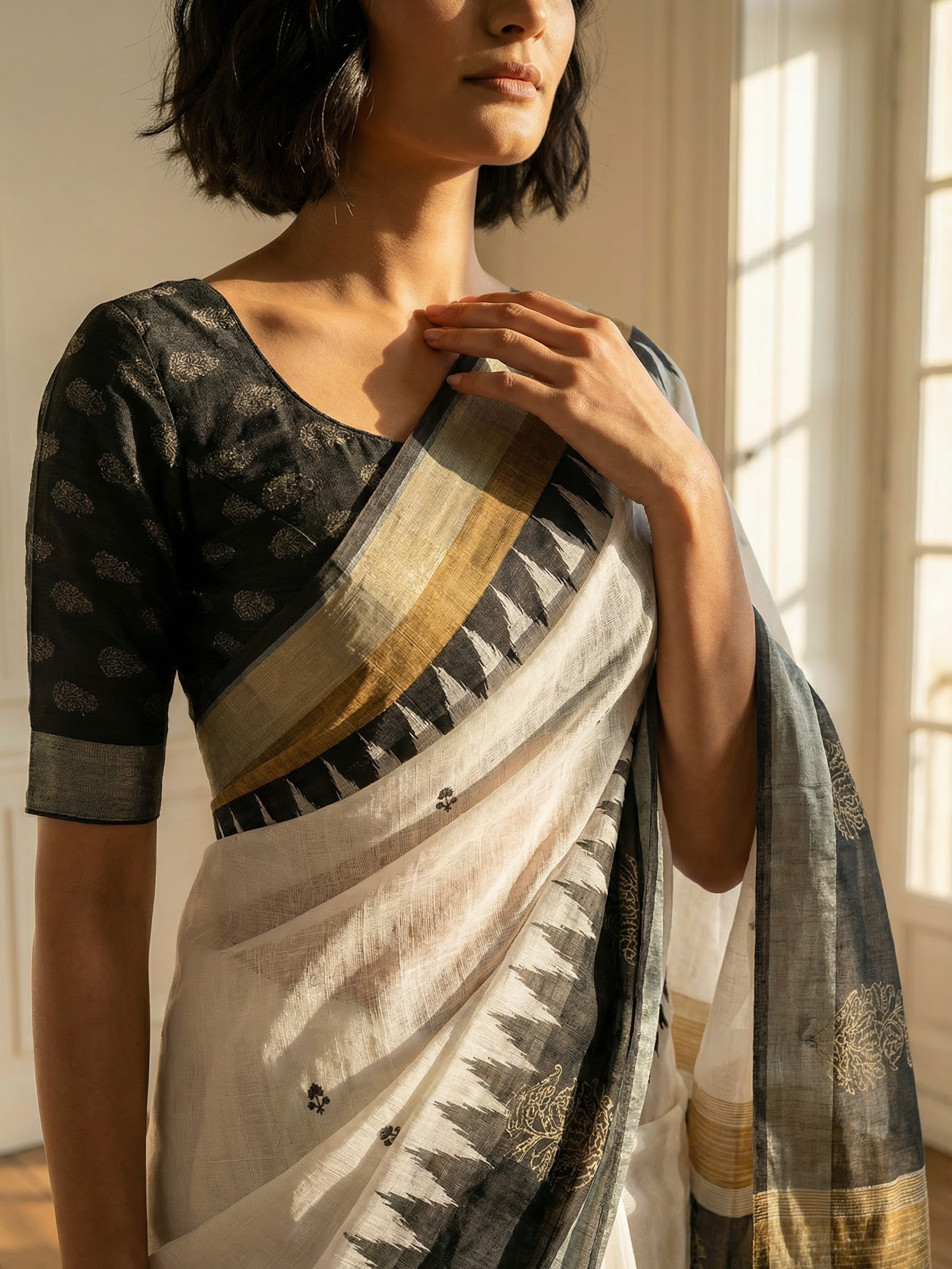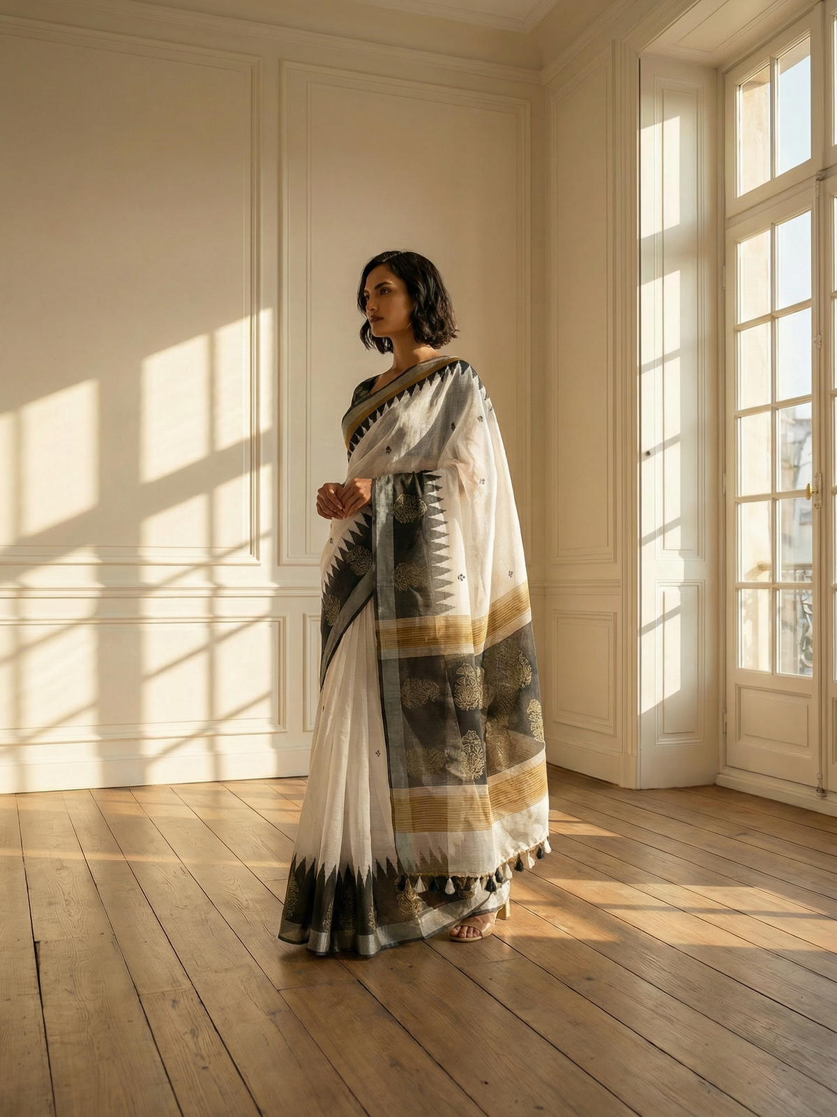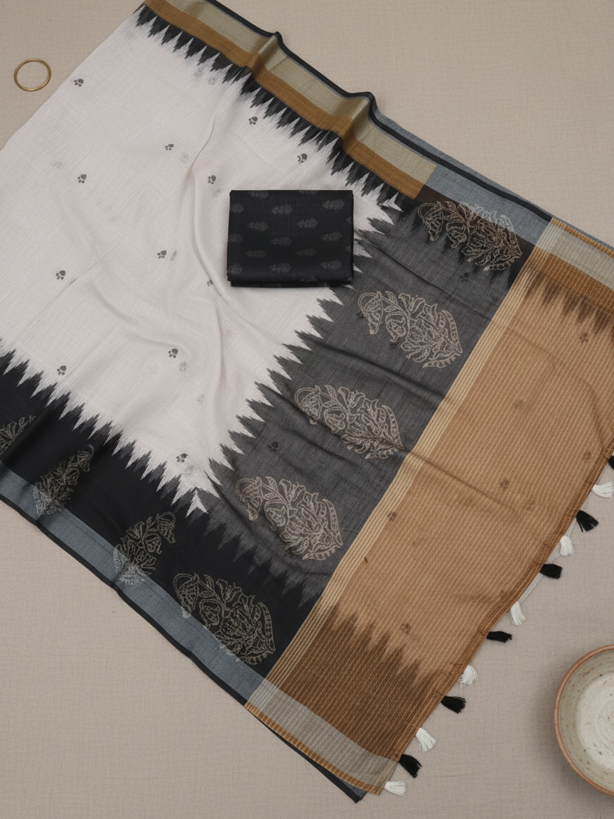 An elegant linen saree featuring subtle traditional motif prints on a soft ivory base, accented with a bold black geometric border and artistic pallu. Lightweight, breathable, and perfect for refined office or festive wear.