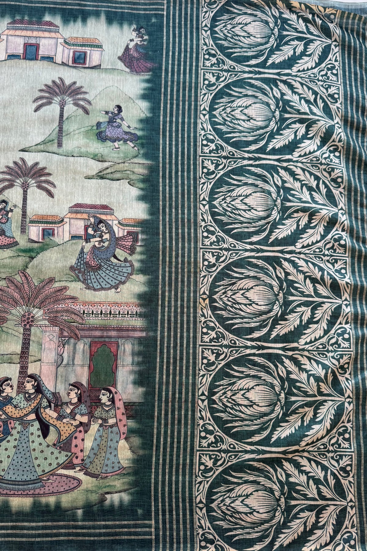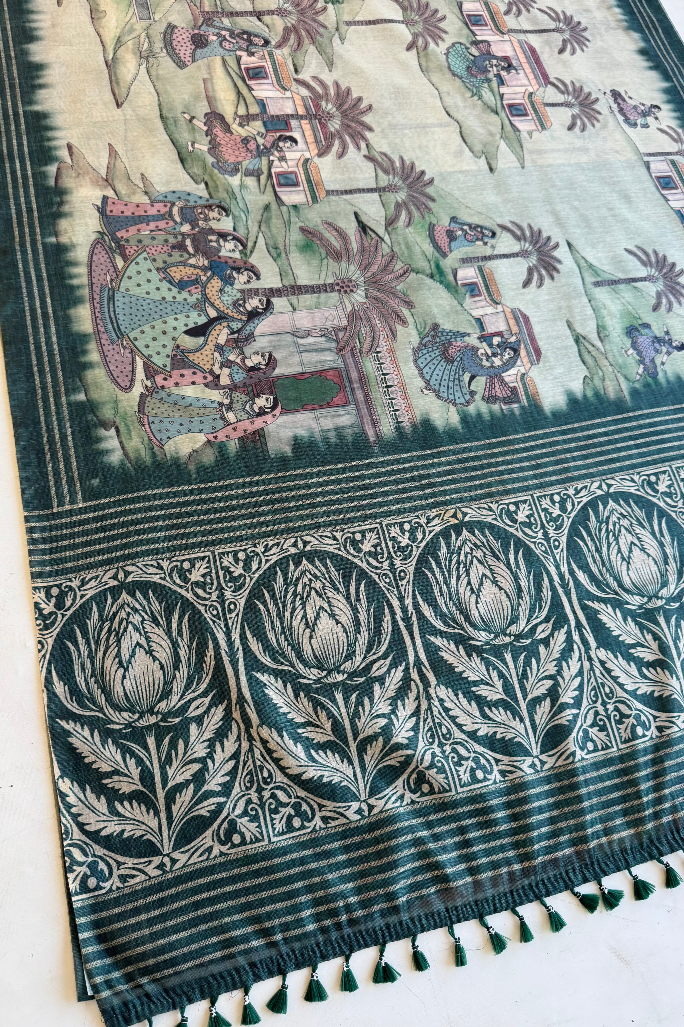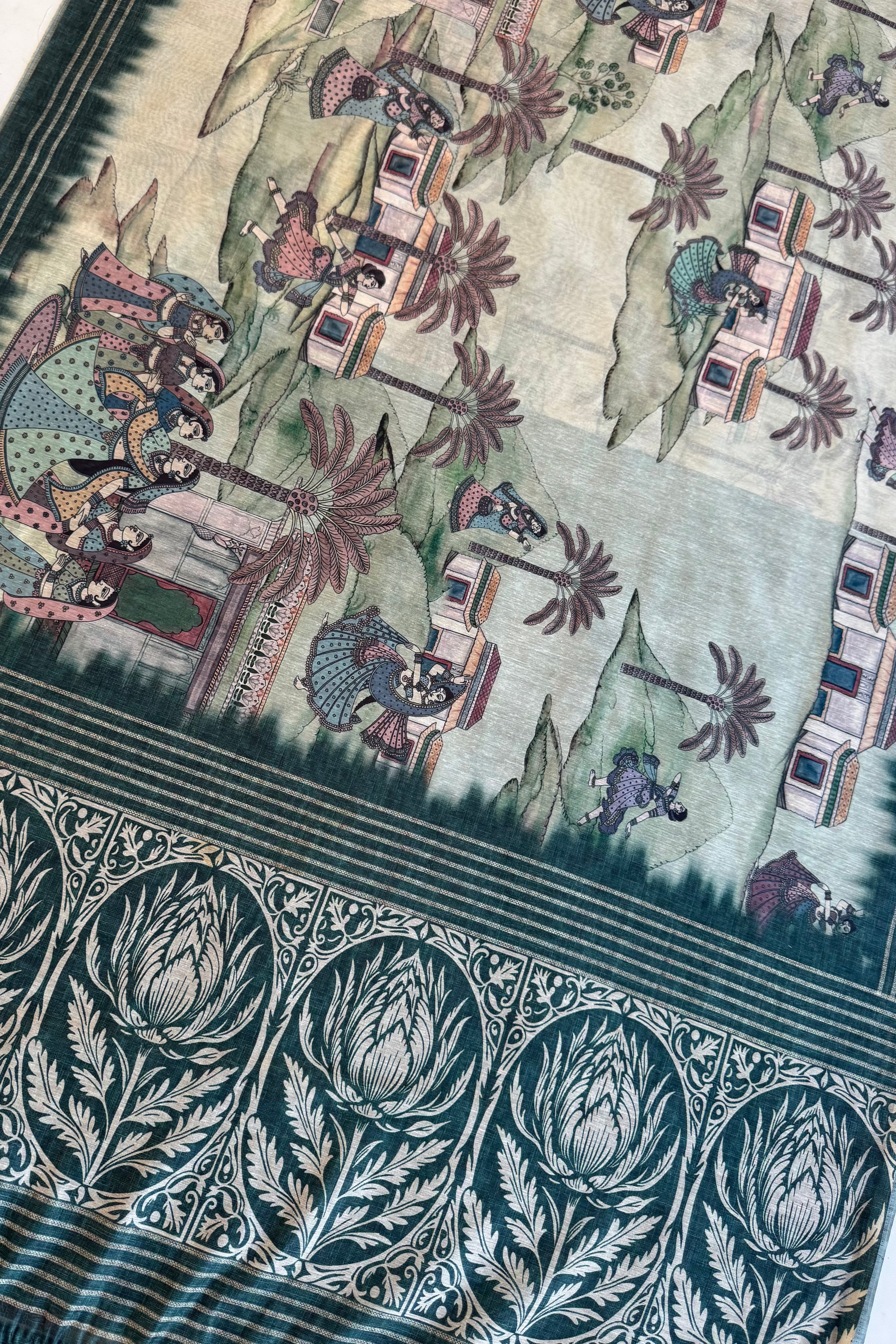 This saree features a calm green base with detailed heritage-style artwork across the body.
