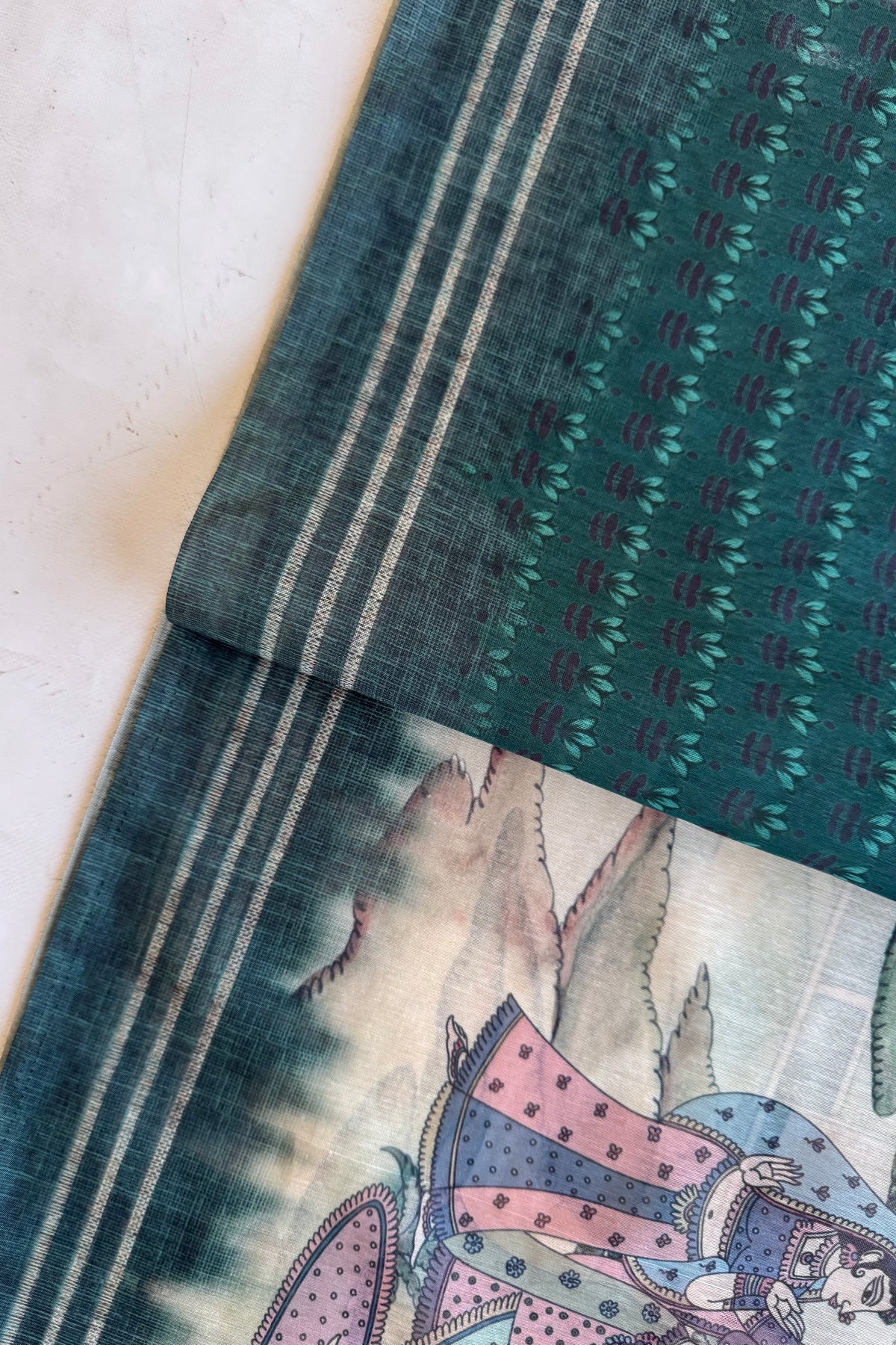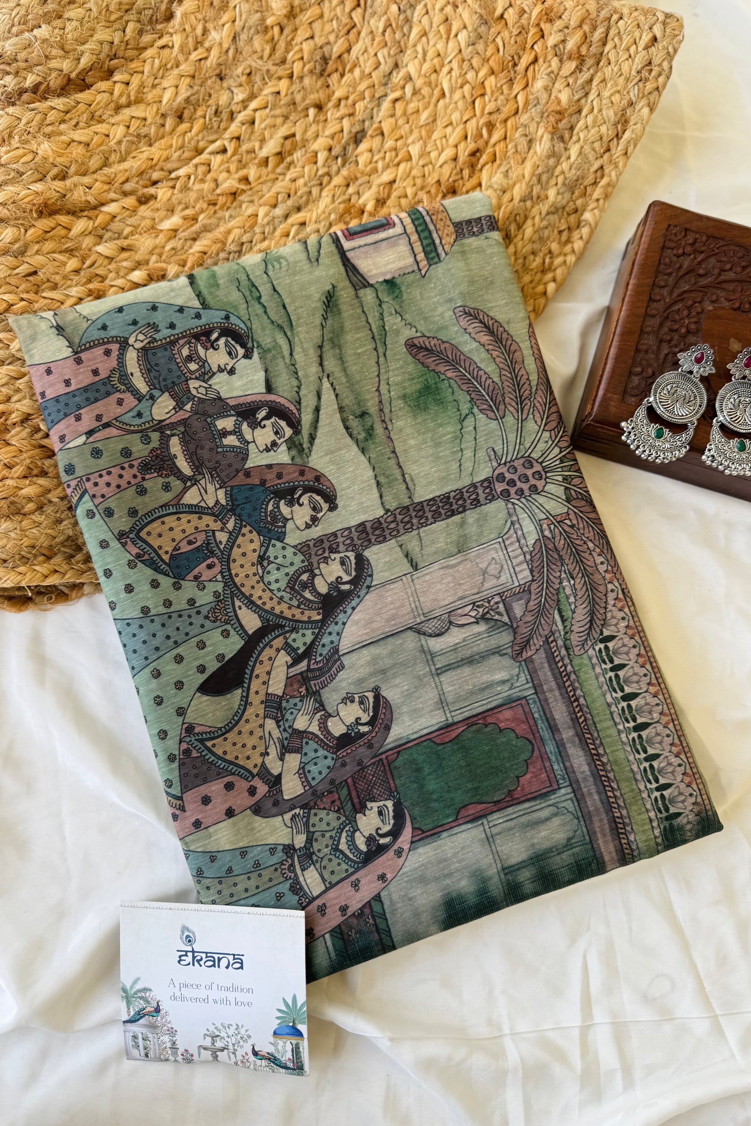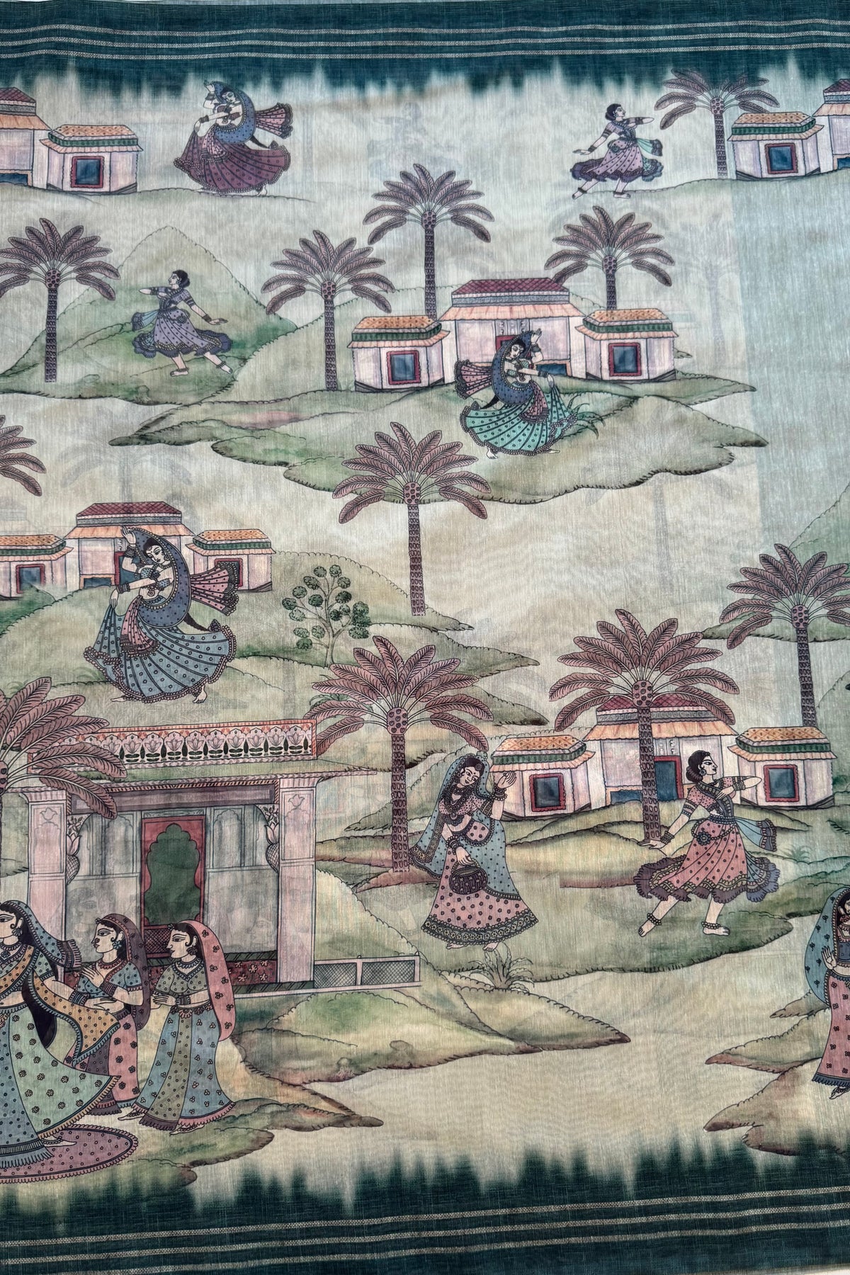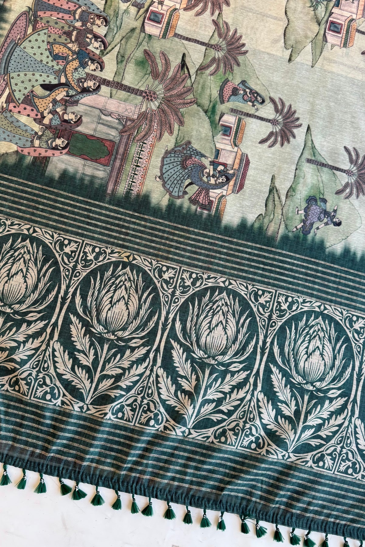 This saree features a calm green base with detailed heritage-style artwork across the body.