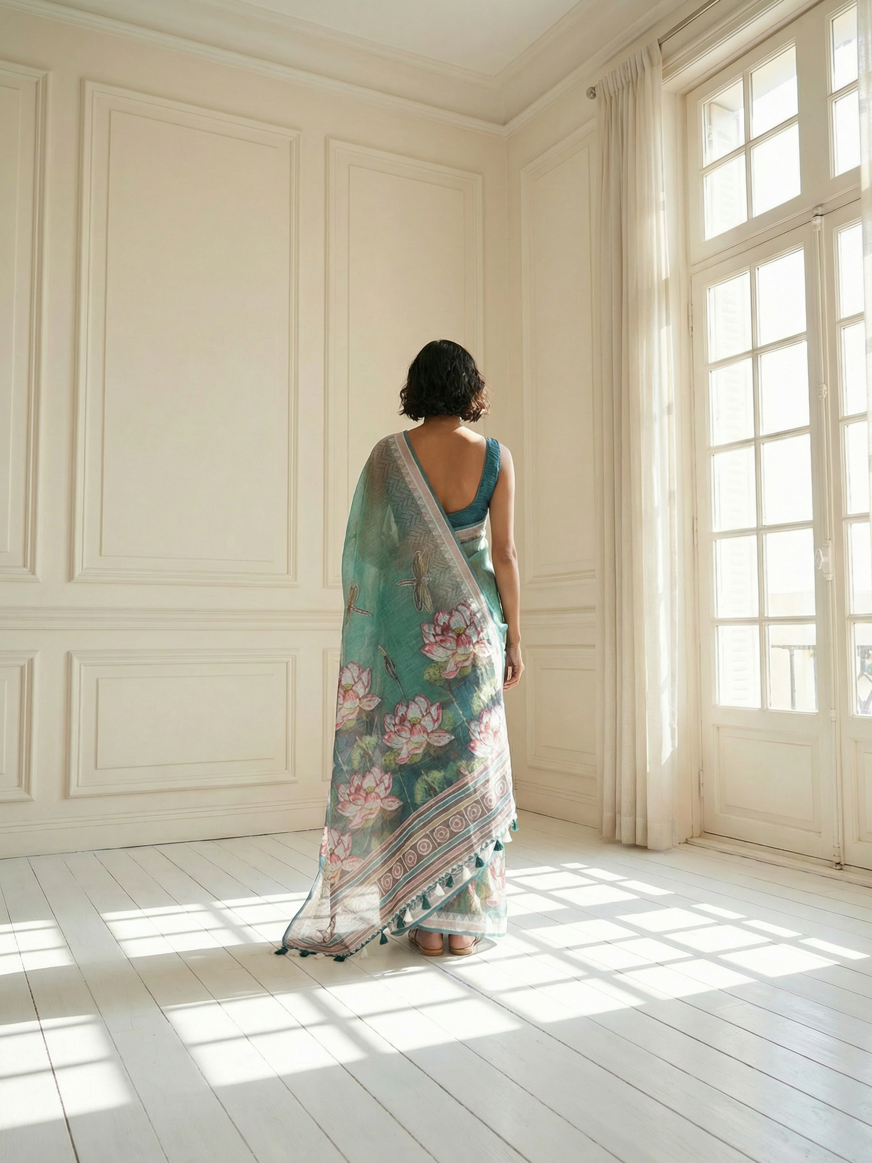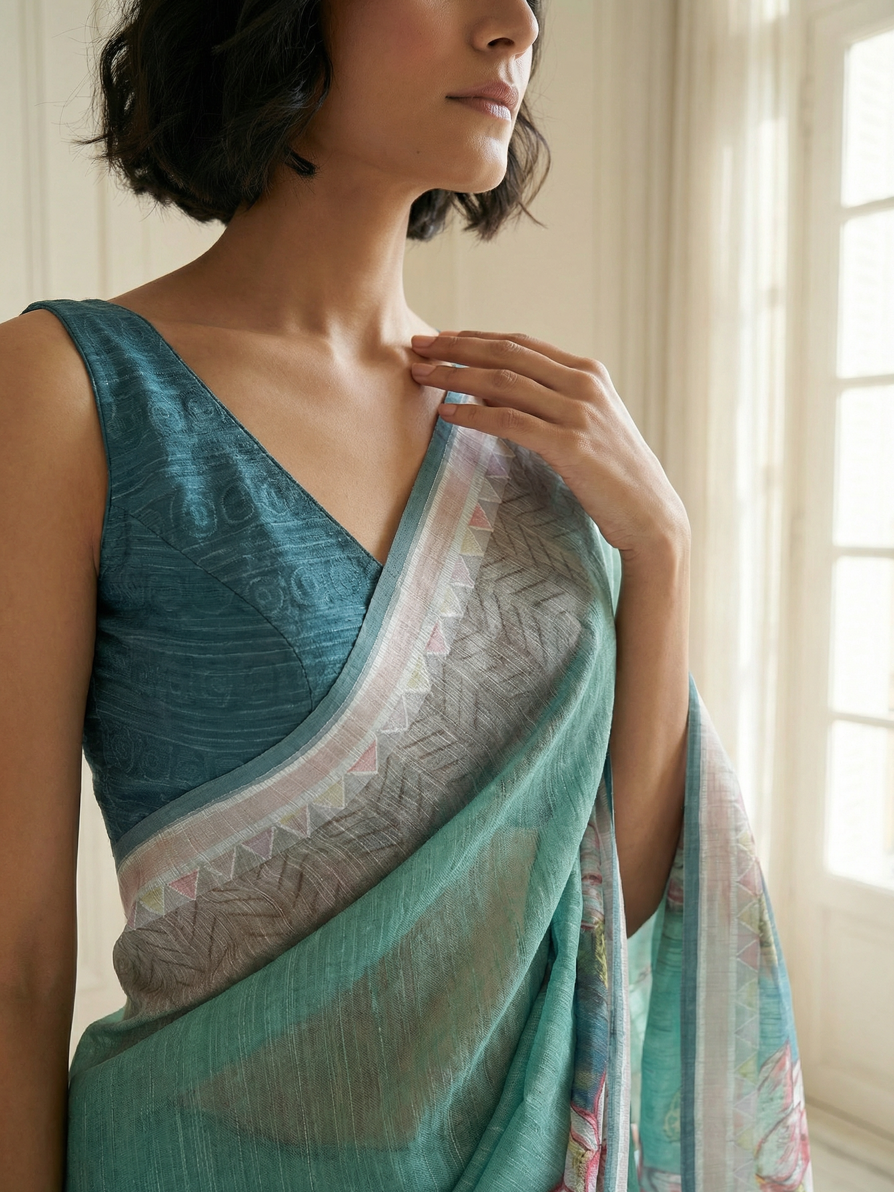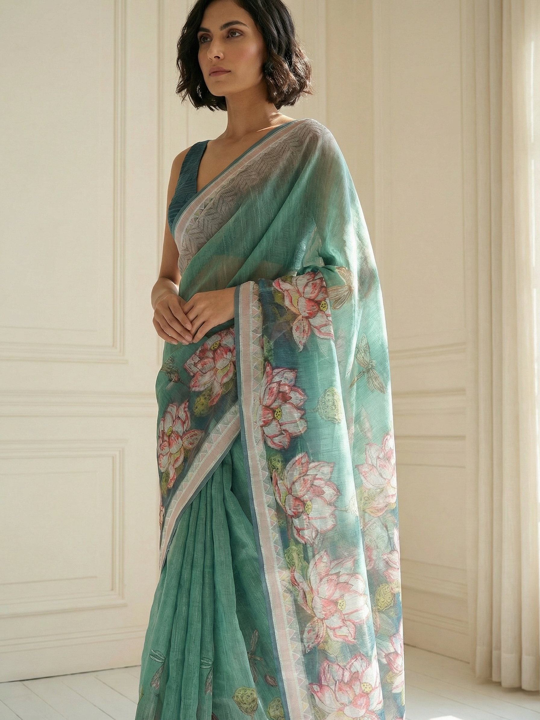 "A graceful teal green linen saree adorned with soft floral prints across the body and pallu, finished with a subtle decorative border. Lightweight, breathable, and perfect for office wear, festive gatherings, and elegant everyday ethnic styling.