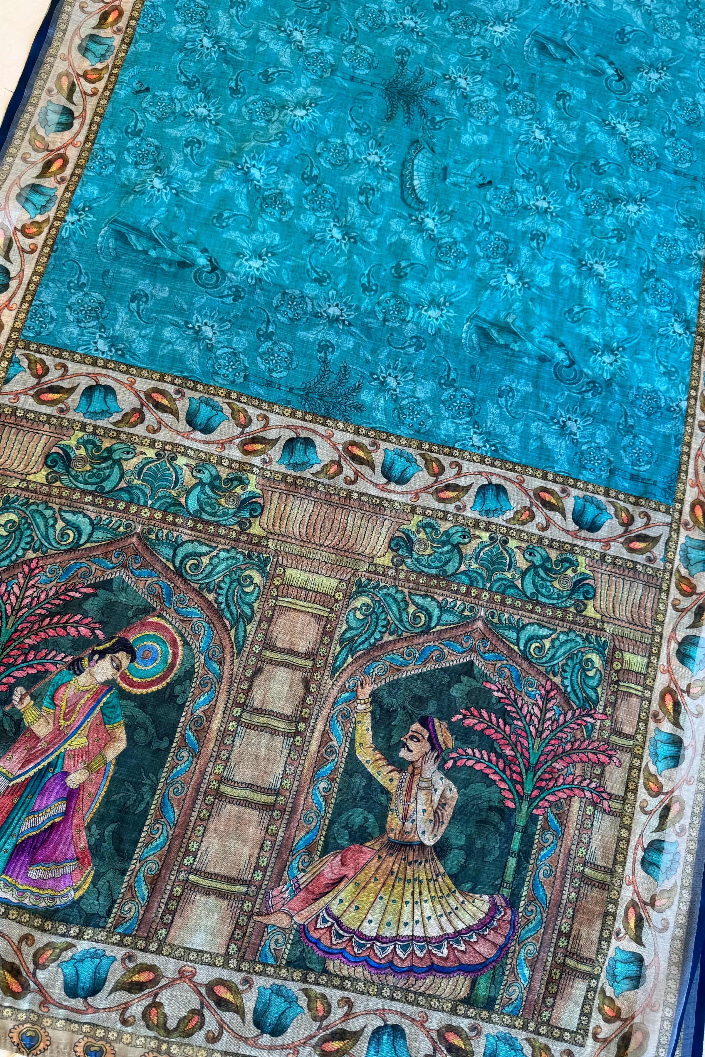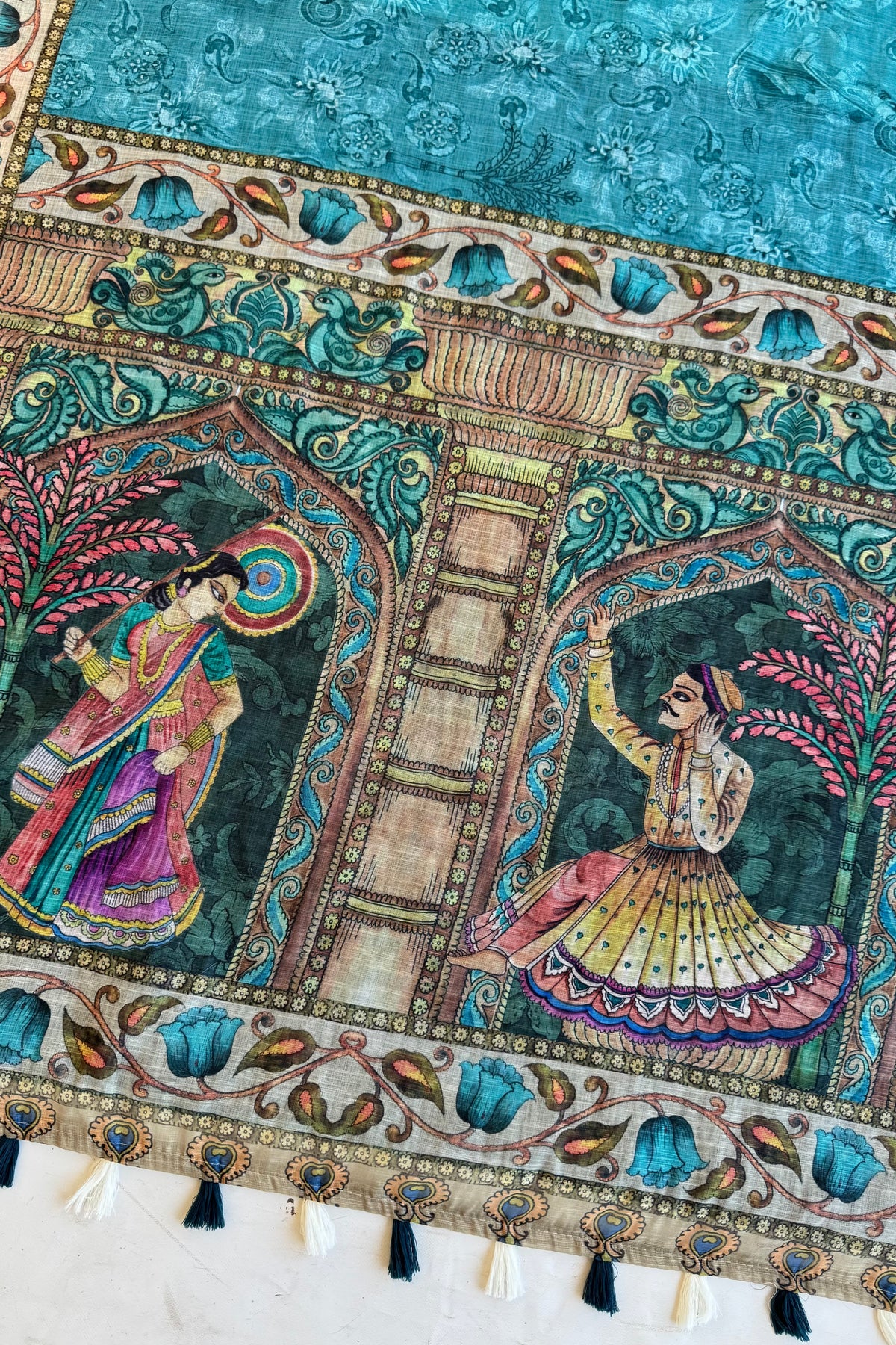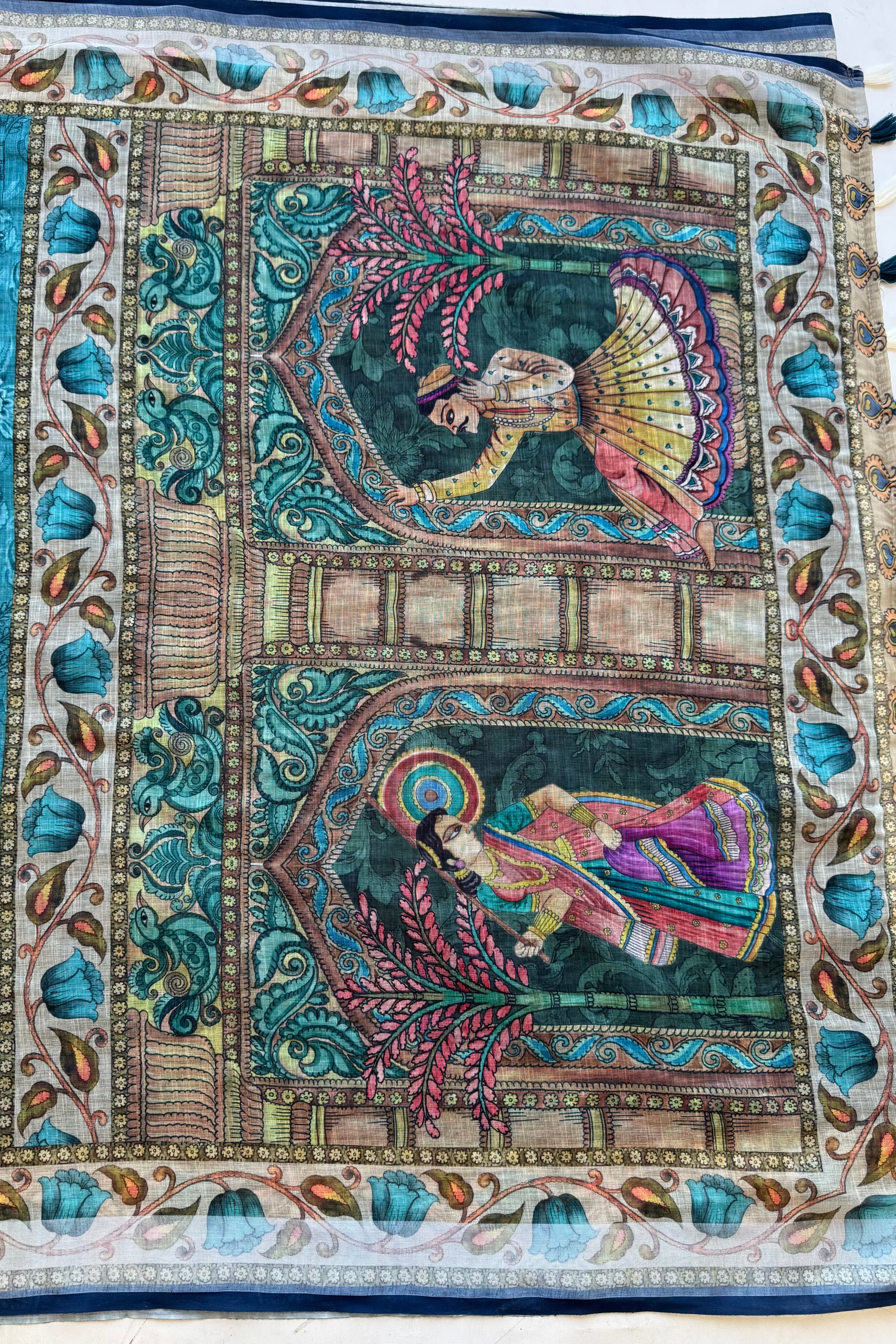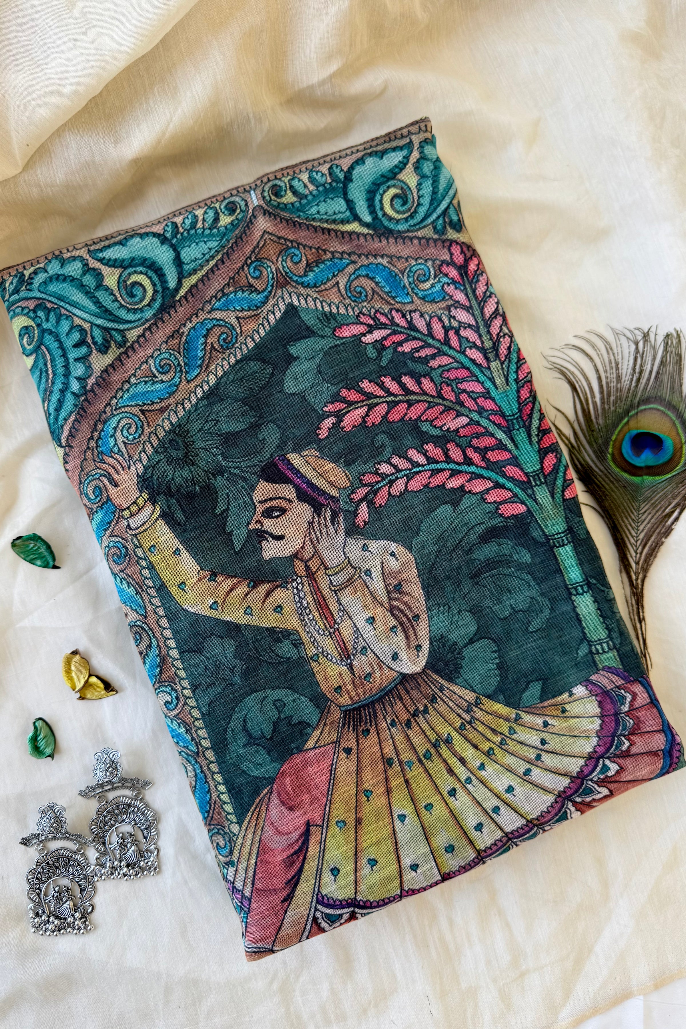 This linen saree features detailed scenic prints inspired by royal courtyards and folk art.