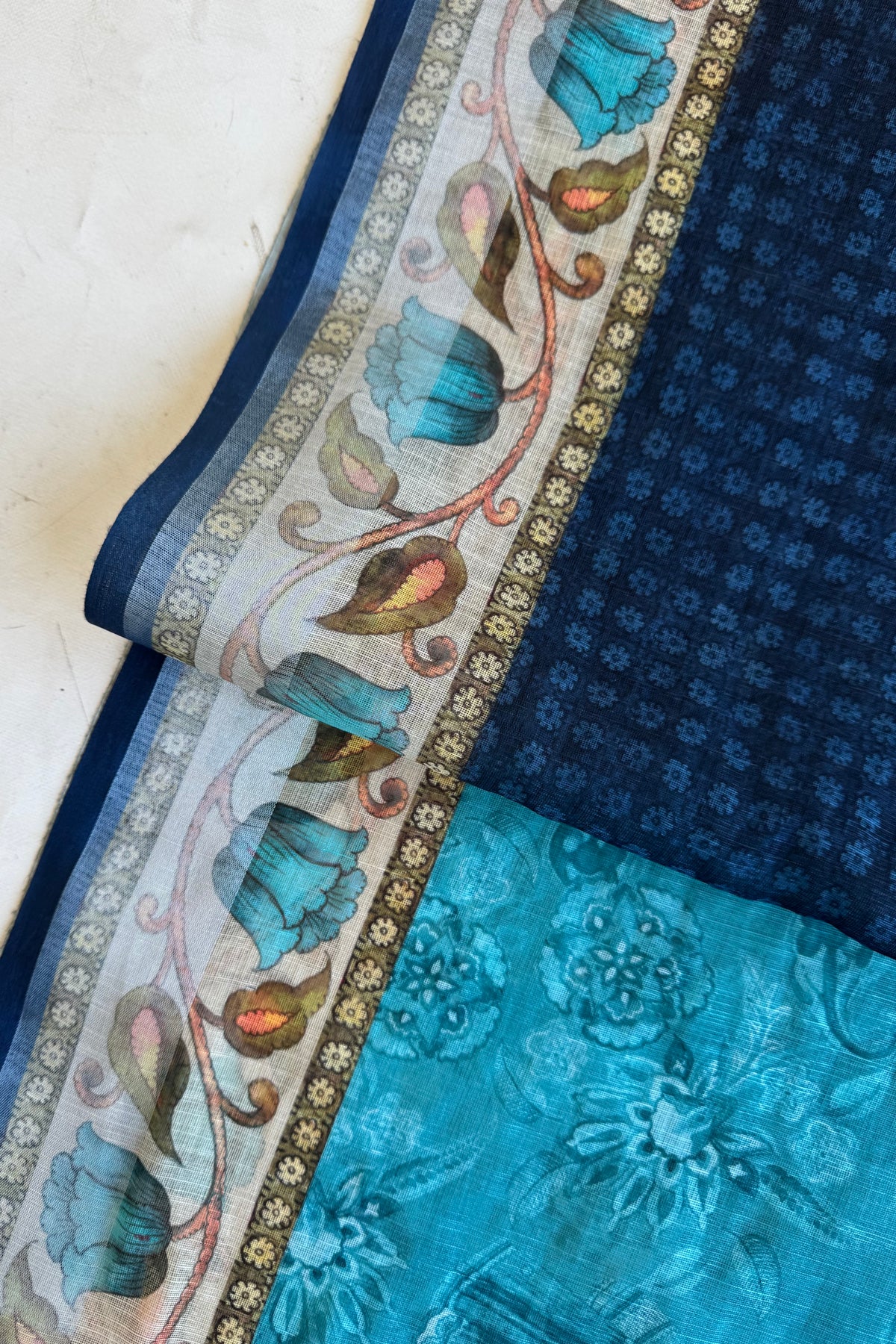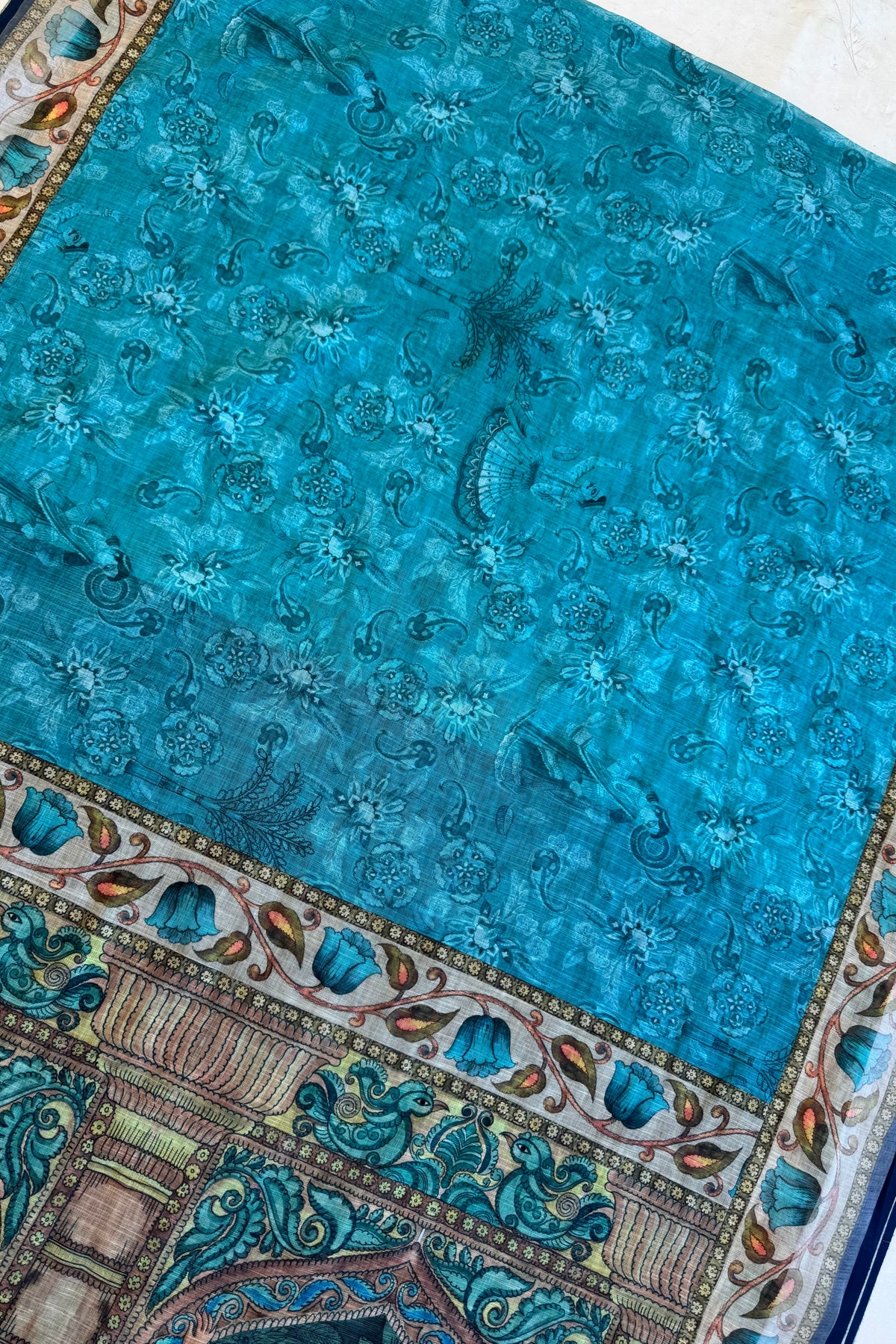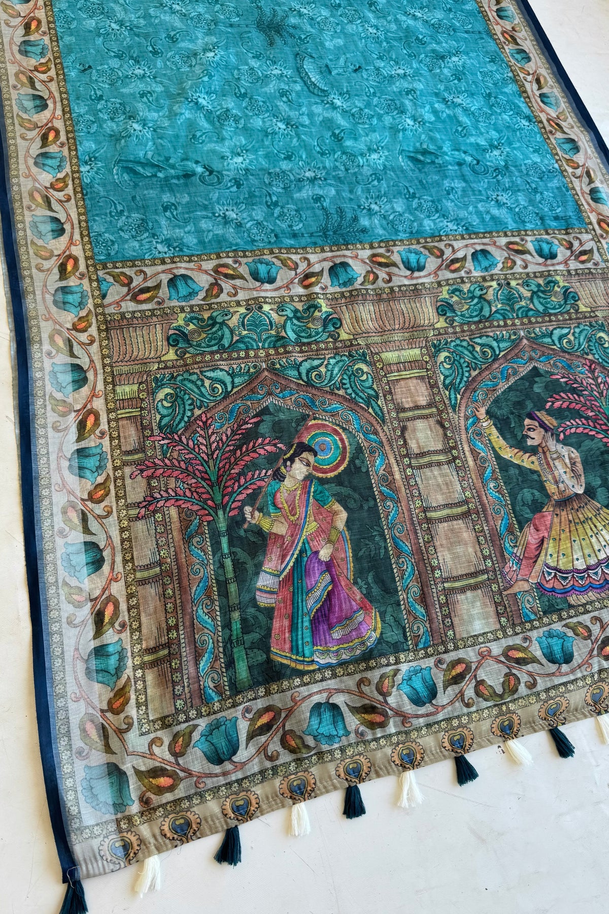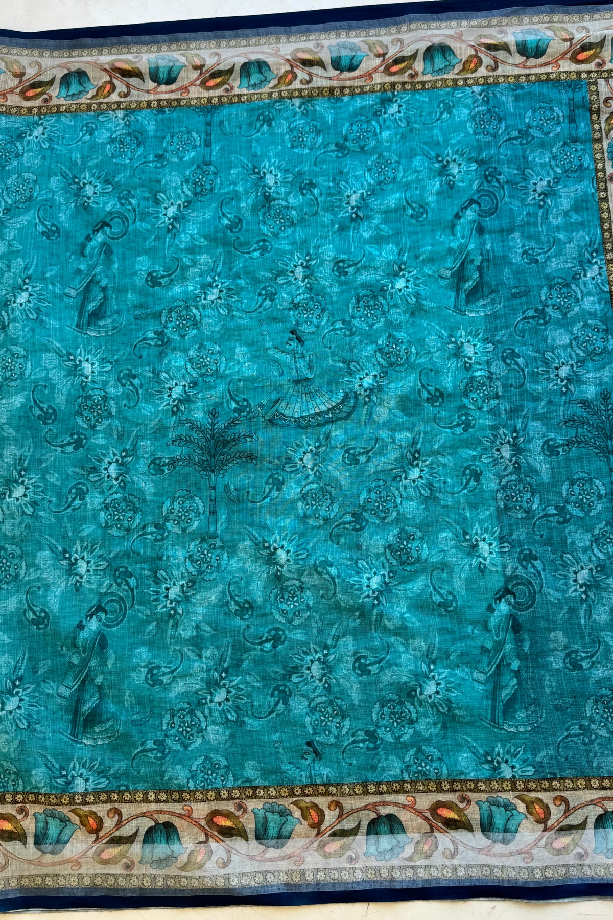 This linen saree features detailed scenic prints inspired by royal courtyards and folk art.