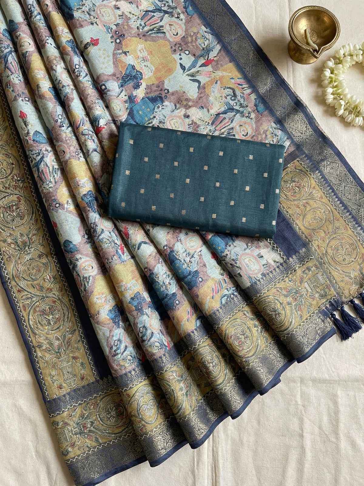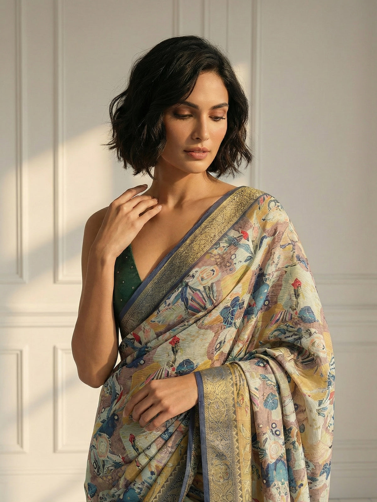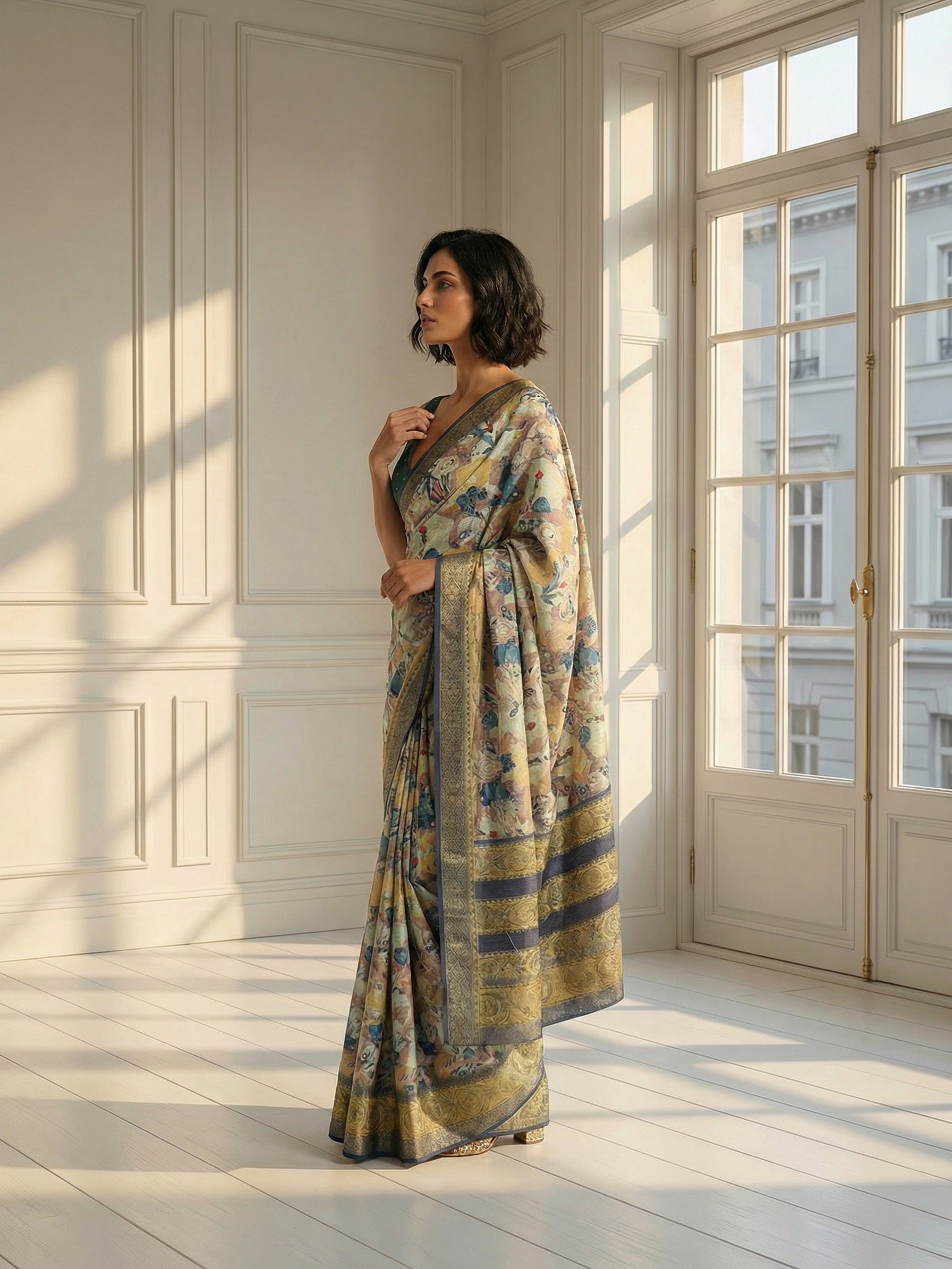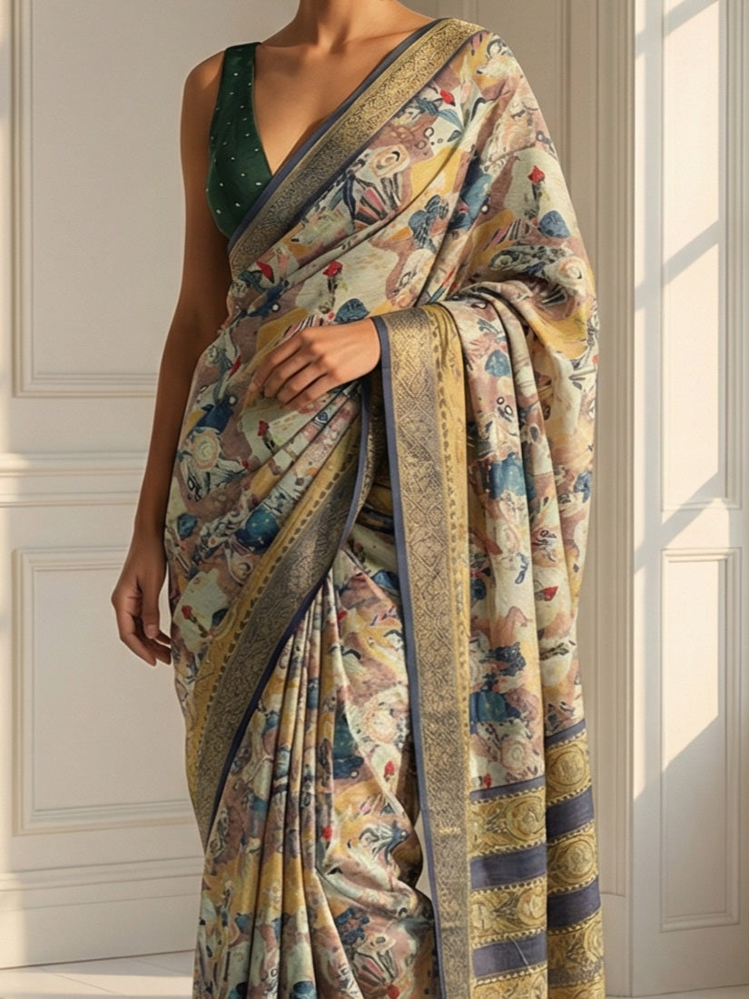 Exquisite and sophisticated, this Dola silk saree features a soft beige base adorned with an artistic abstract print in muted tones, complemented by an elegant traditional border. The lightweight, lustrous fabric drapes gracefully, offering comfort and style. Perfect for festive occasions, formal events, or cultural gatherings, this saree brings a modern twist to classic ethnic elegance.