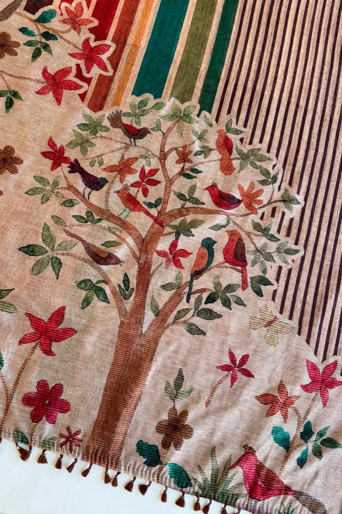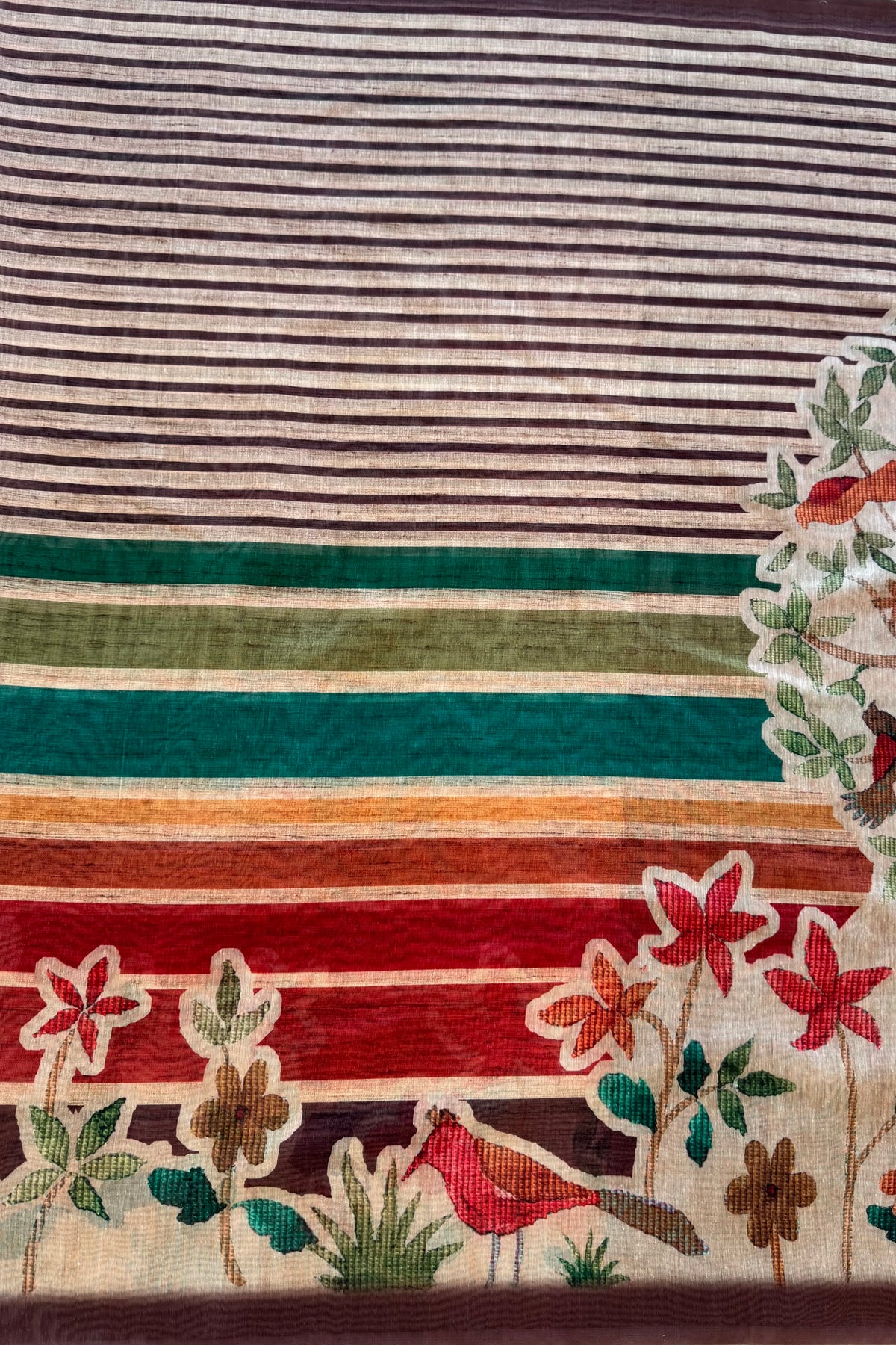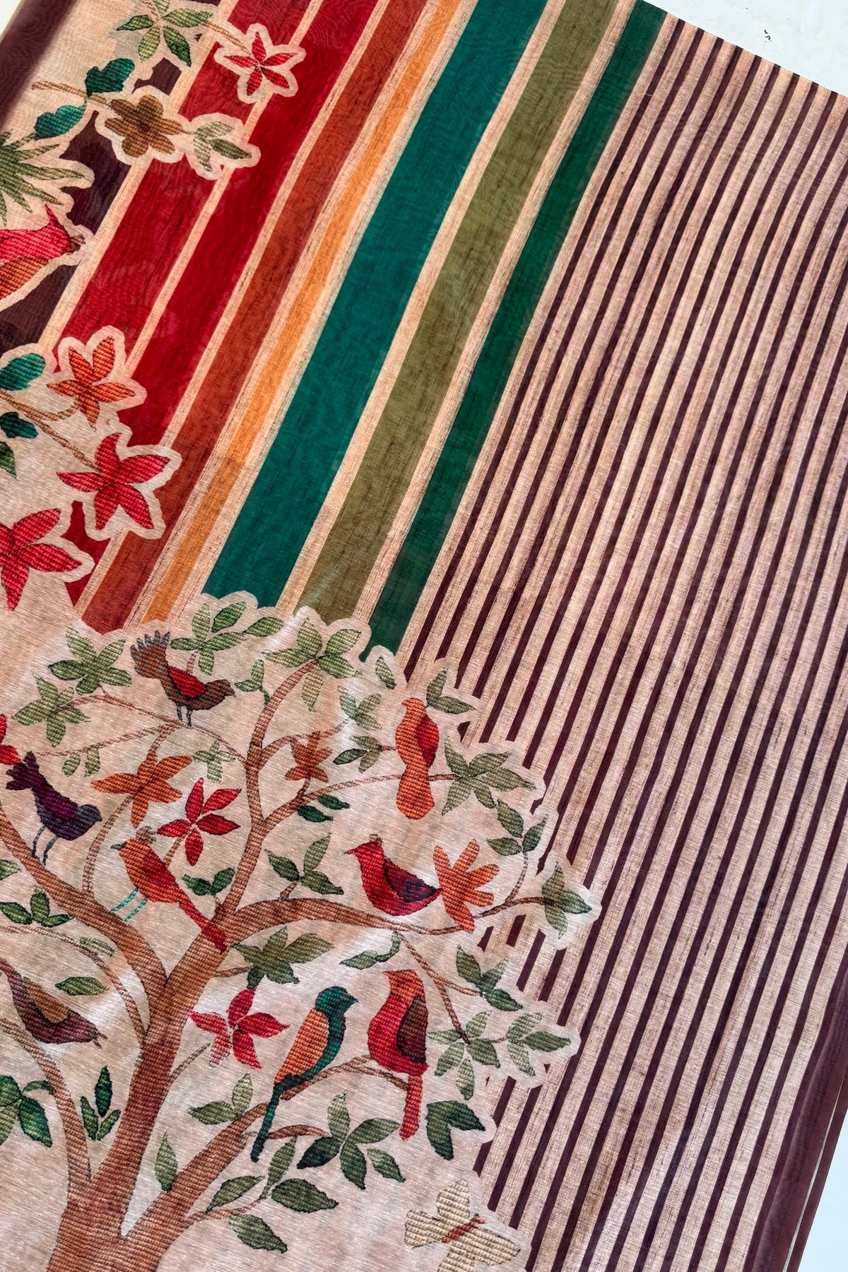 This saree features a lively mix of colourful stripes paired with a charming nature-inspired print. Playful birds sit on tree branches, surrounded by soft florals that add a fresh, artistic feel. The contrast between neat stripes and detailed motifs makes it eye-catching yet balanced. Perfect for those who love prints with a cheerful, story-like vibe.