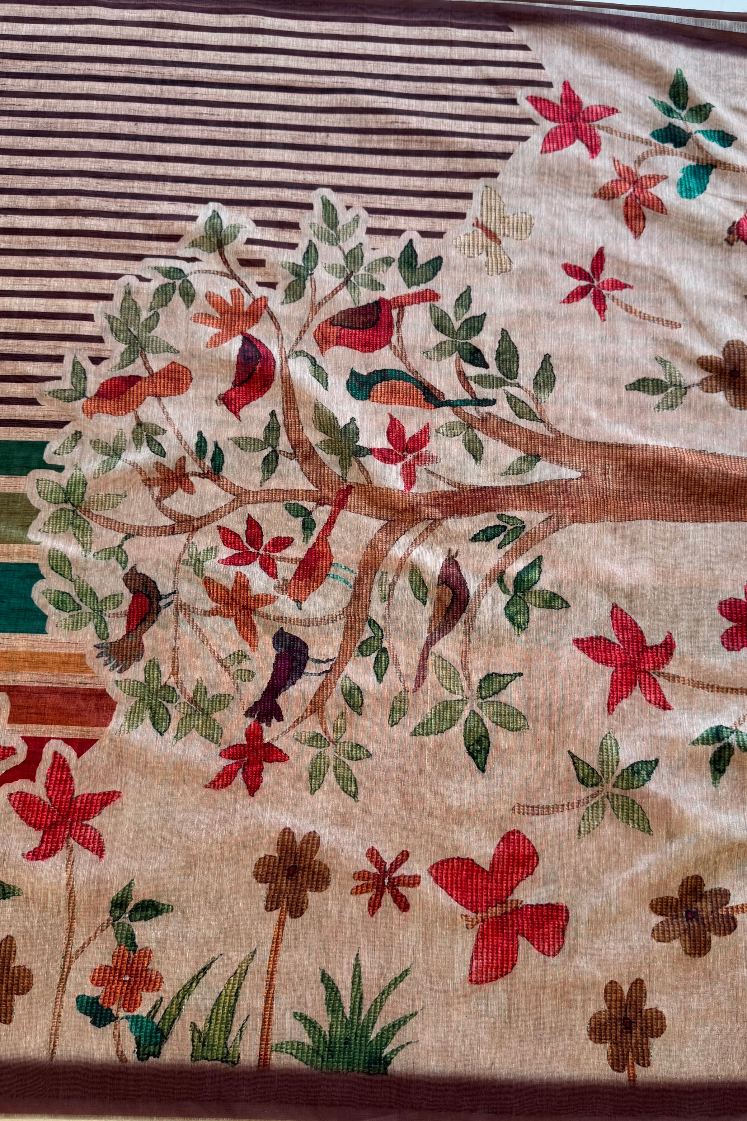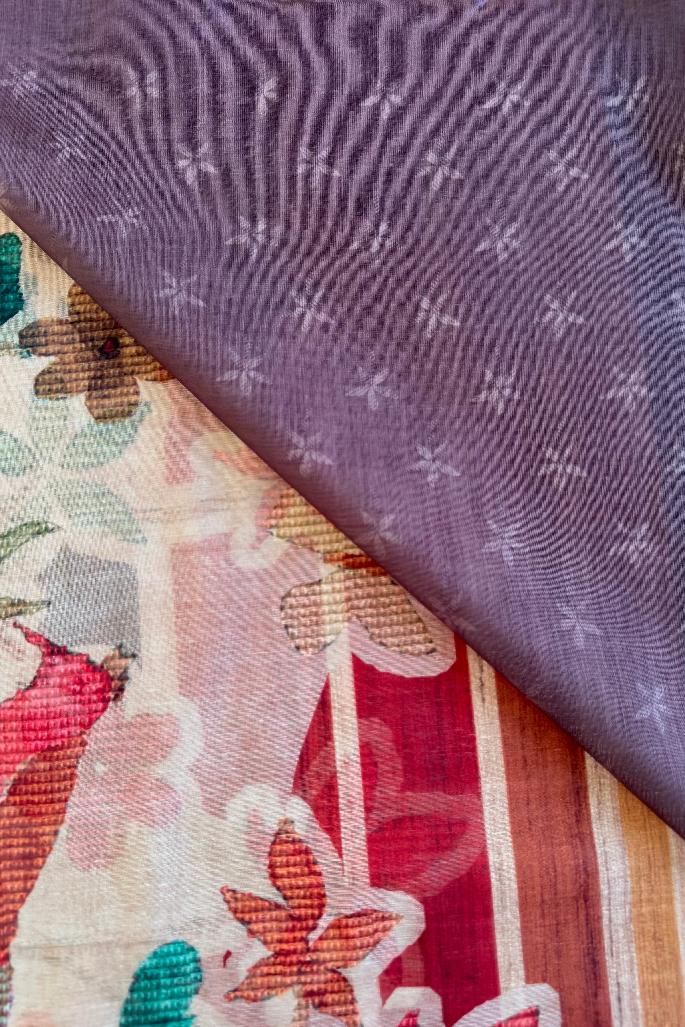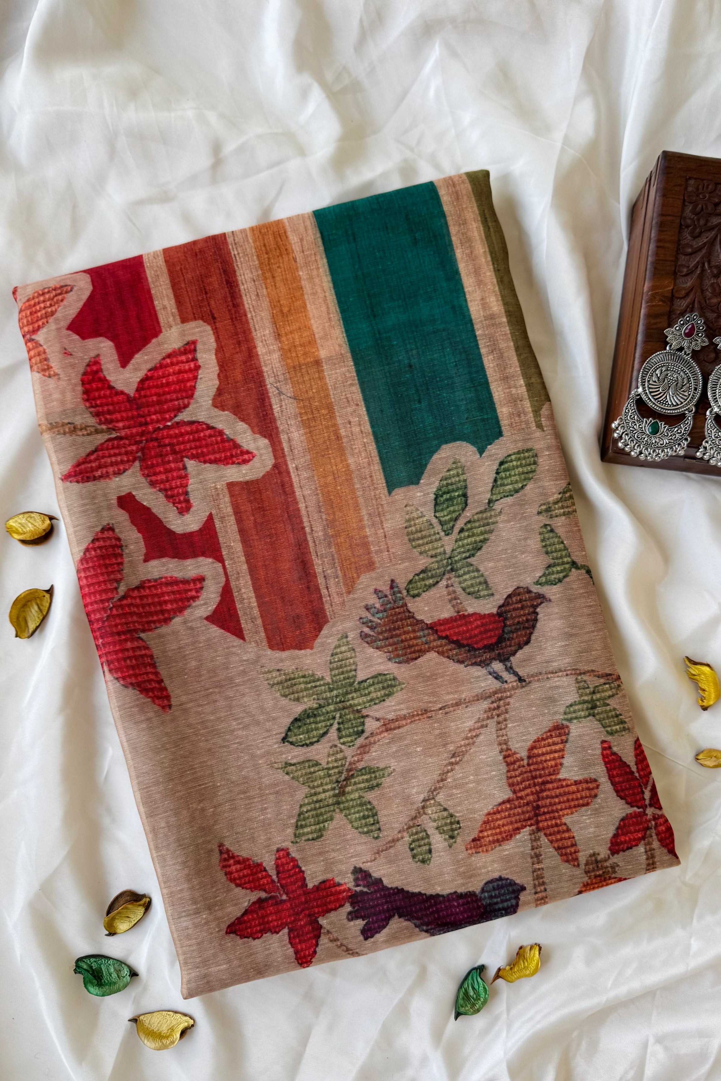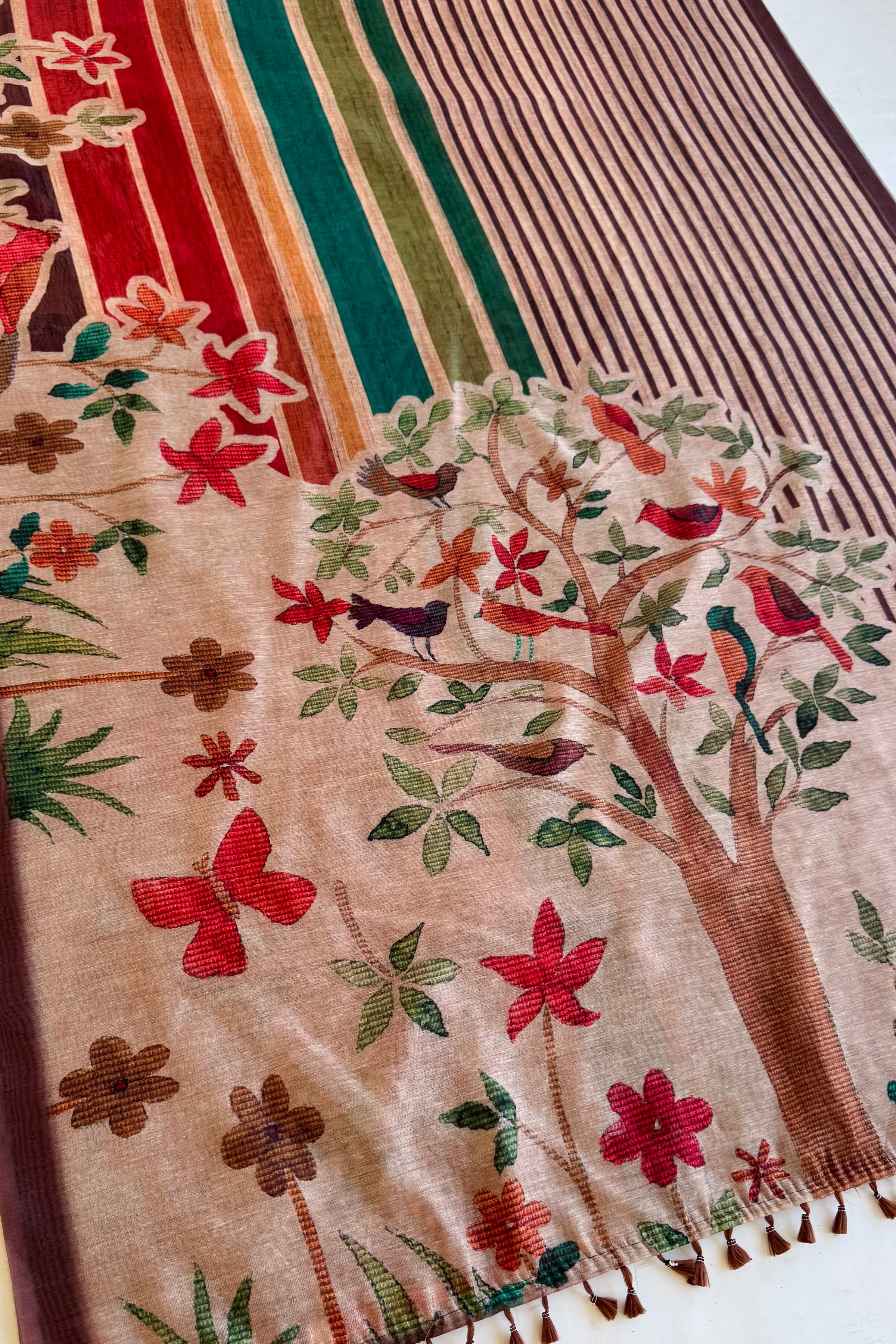 This saree features a lively mix of colourful stripes paired with a charming nature-inspired print. Playful birds sit on tree branches, surrounded by soft florals that add a fresh, artistic feel. The contrast between neat stripes and detailed motifs makes it eye-catching yet balanced. Perfect for those who love prints with a cheerful, story-like vibe.