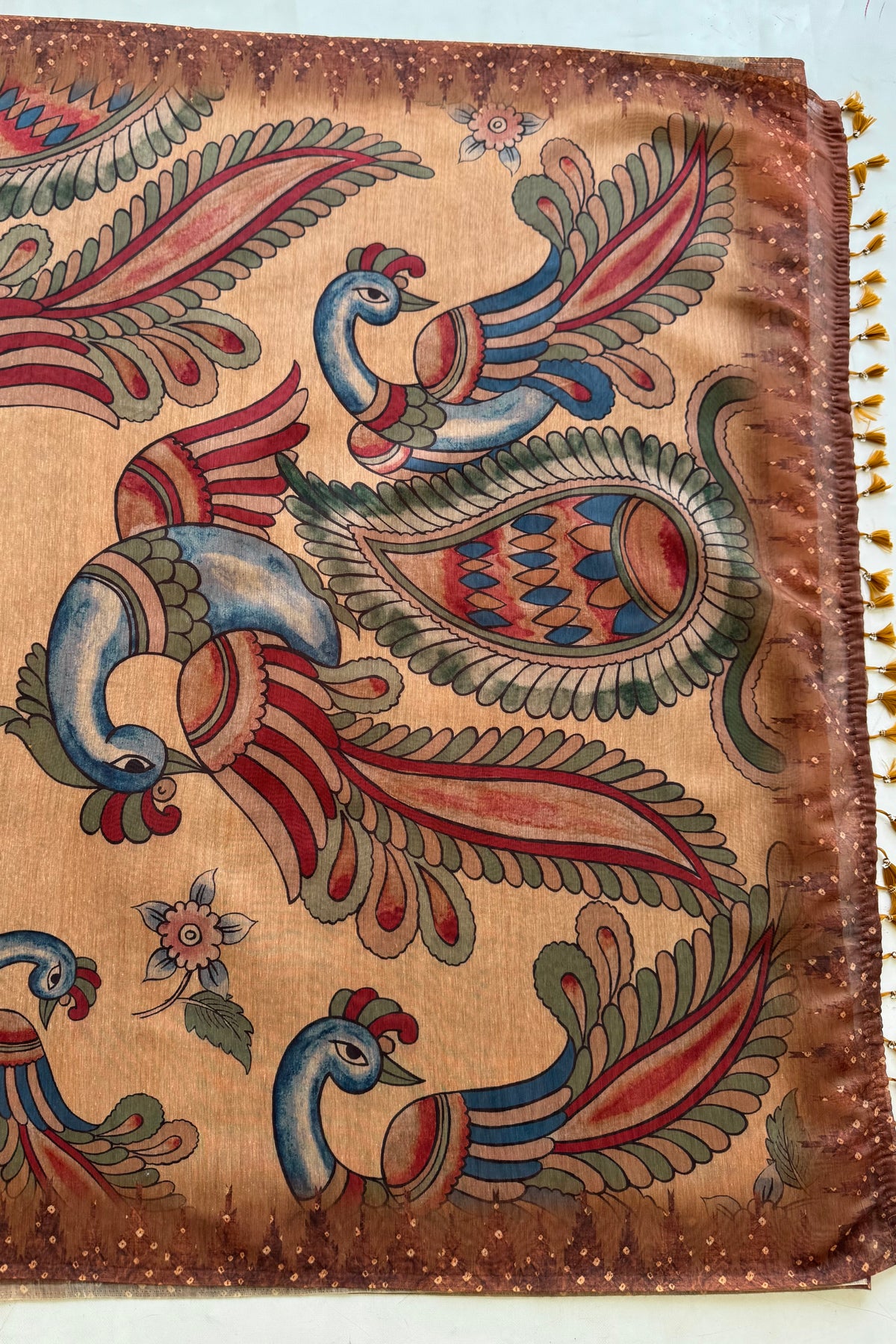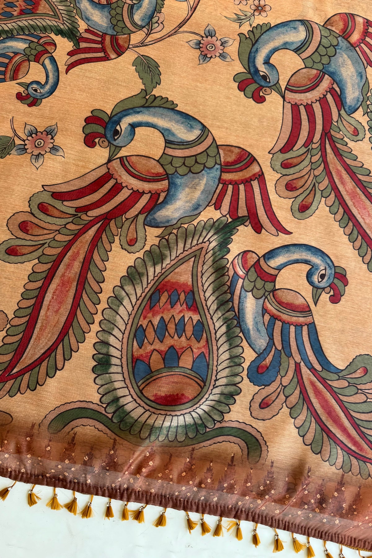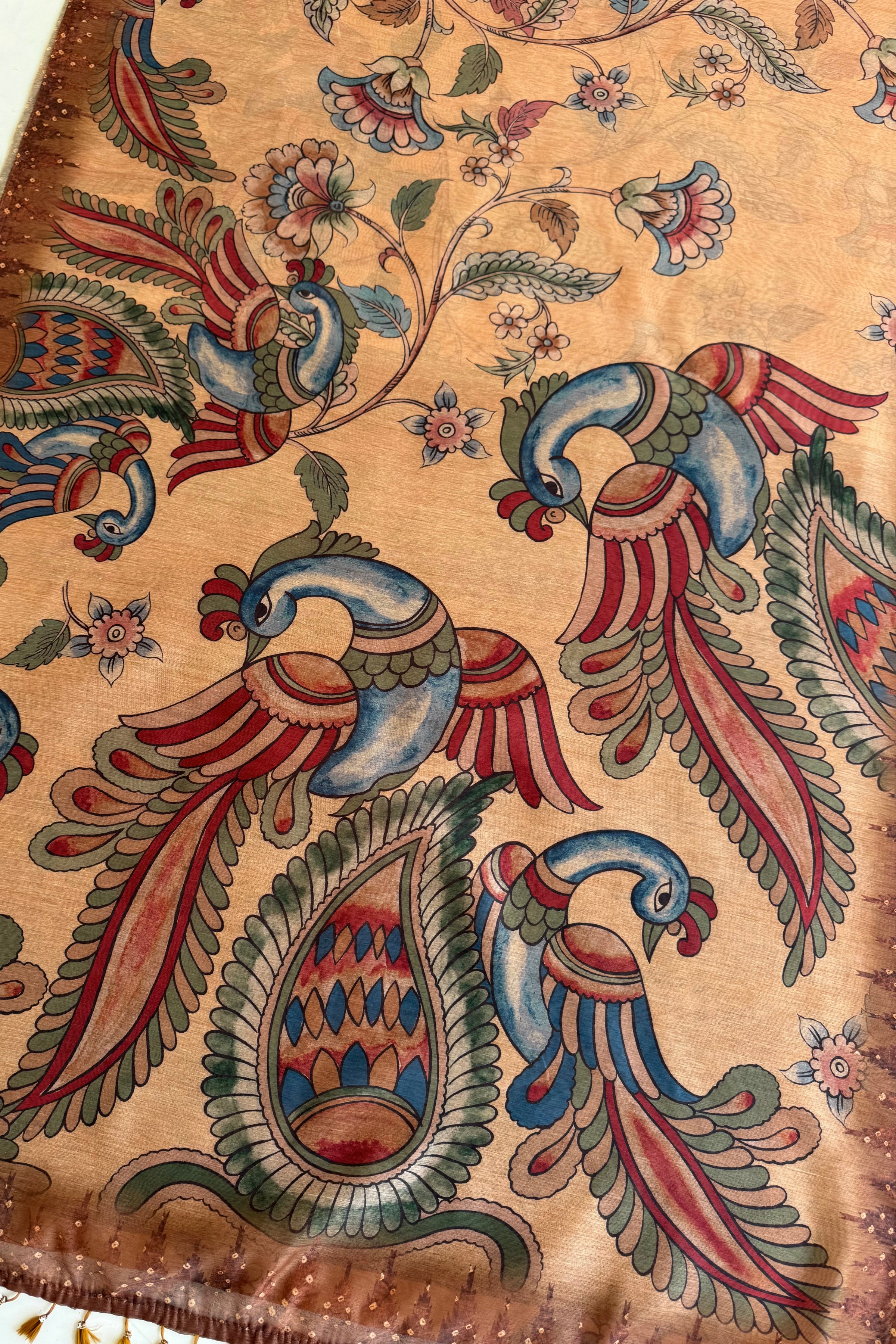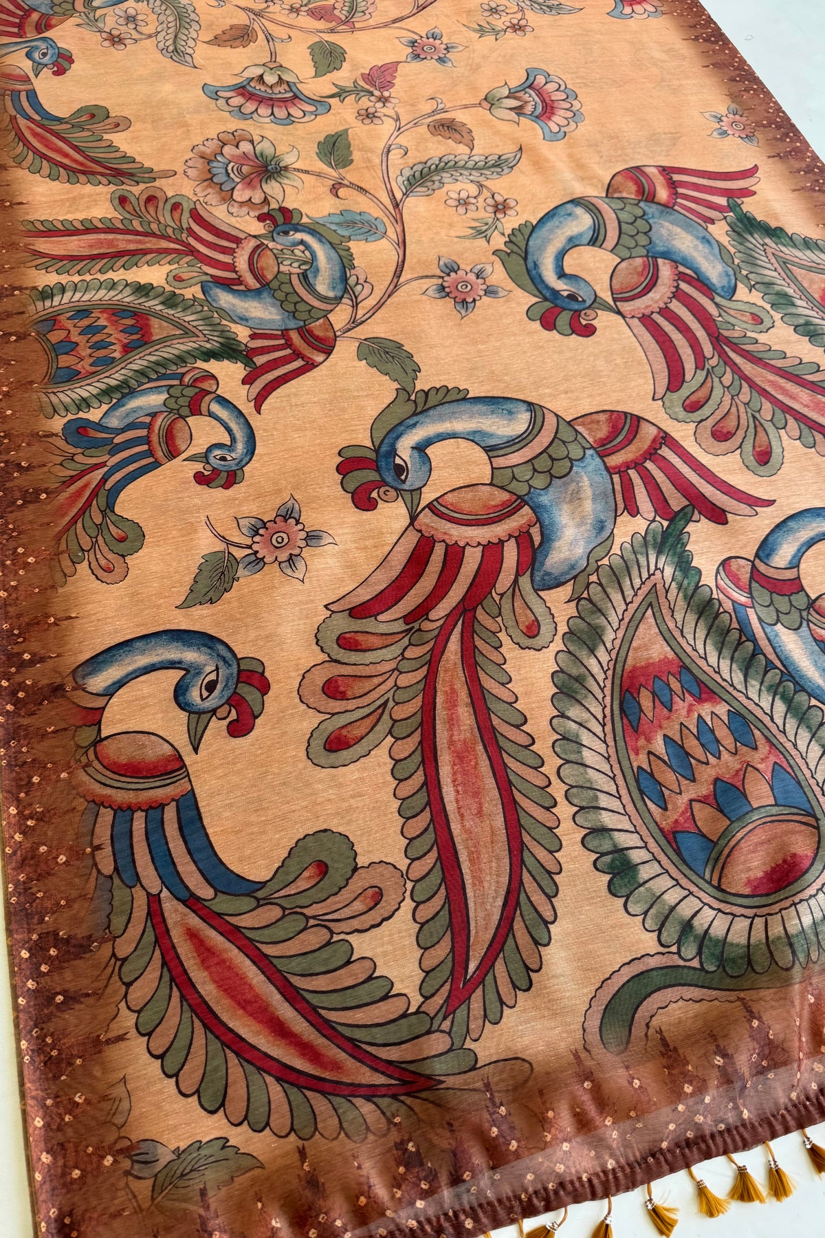 This saree features a warm beige base adorned with graceful peacock motifs in soothing shades of blue, coral, green, and maroon. Delicate floral and leafy patterns flow across the body, adding depth and movement to the design. Finished with a subtle brown border and tassel detailing, it offers a perfect balance of traditional artistry and timeless elegance.