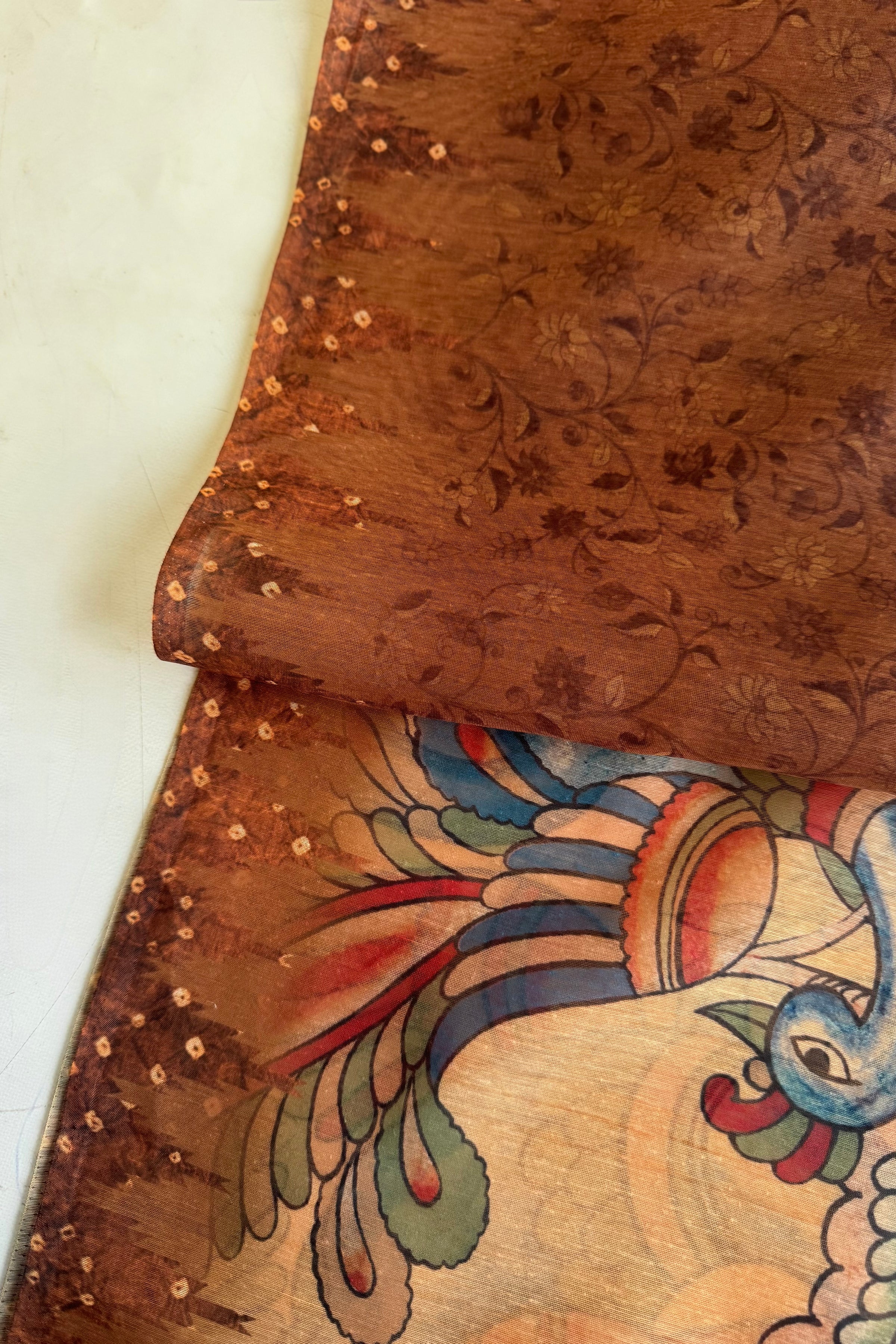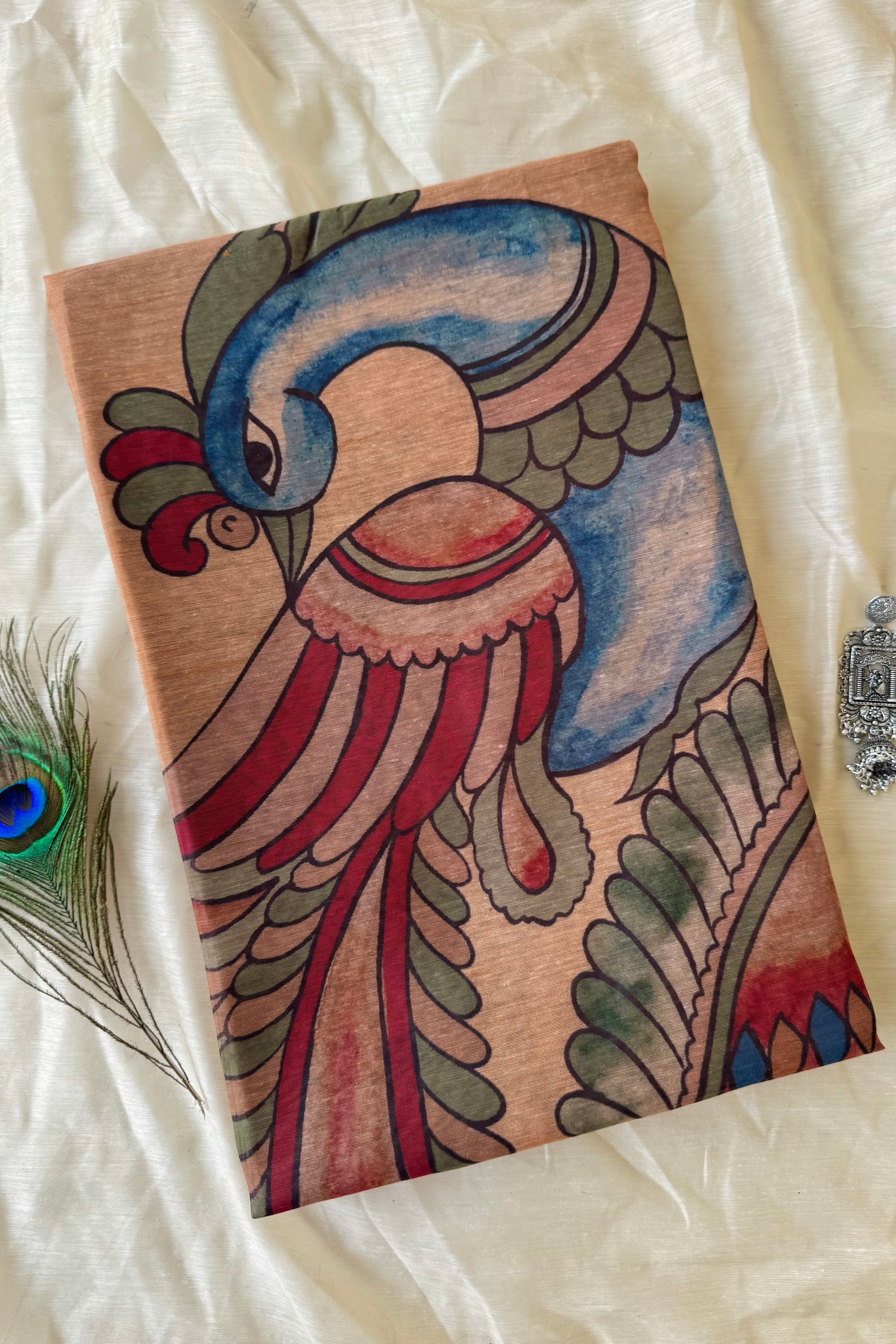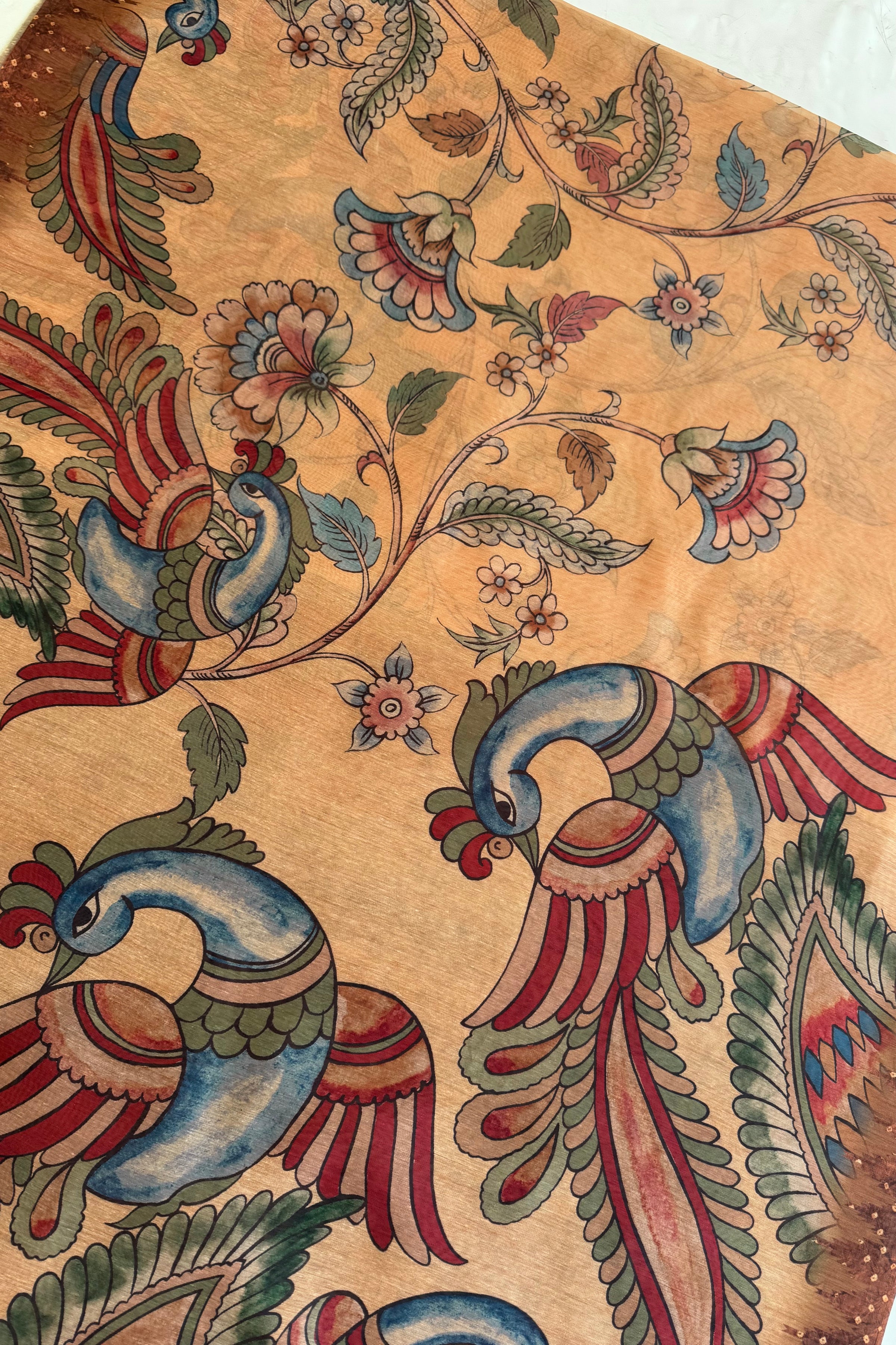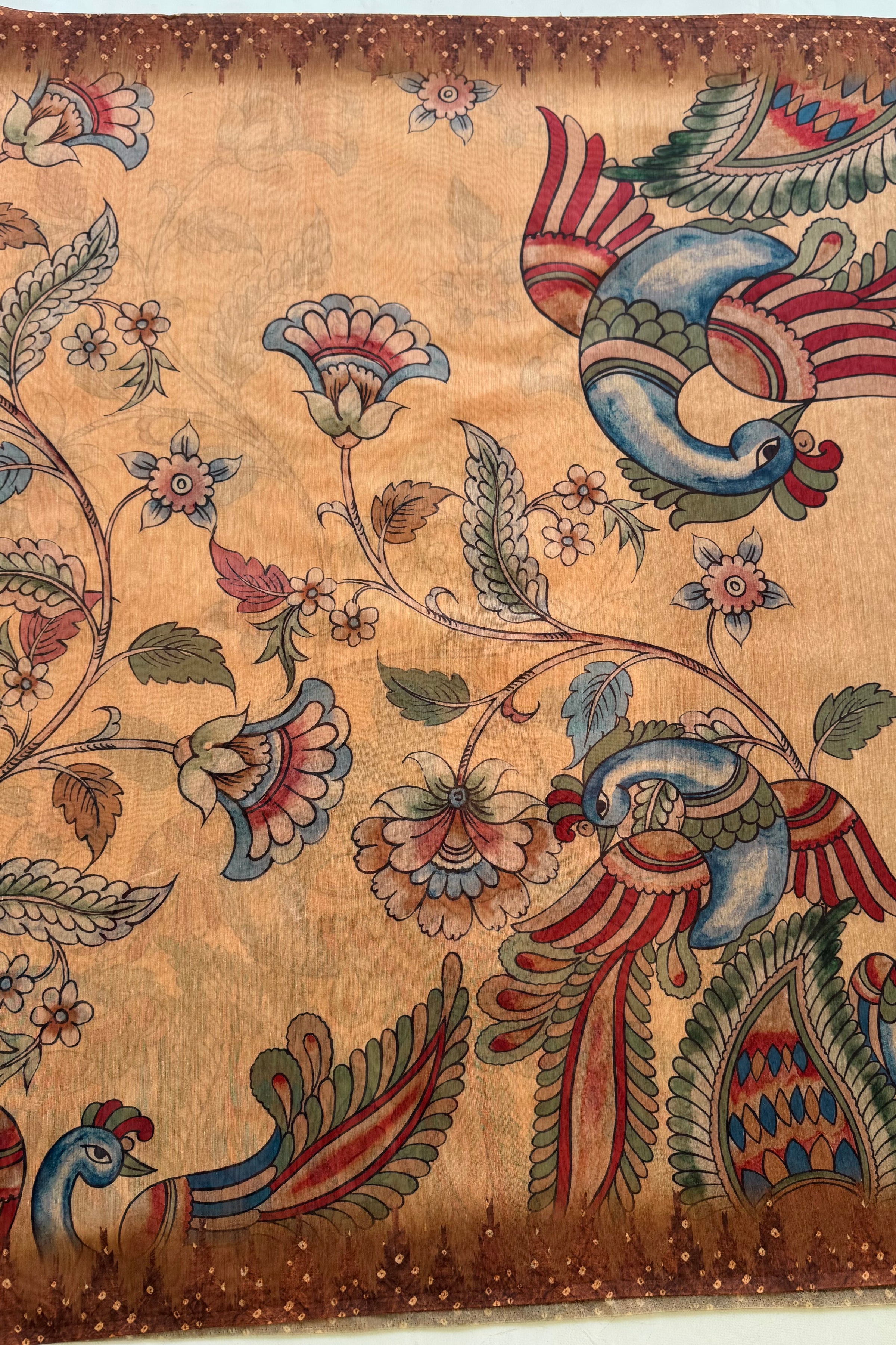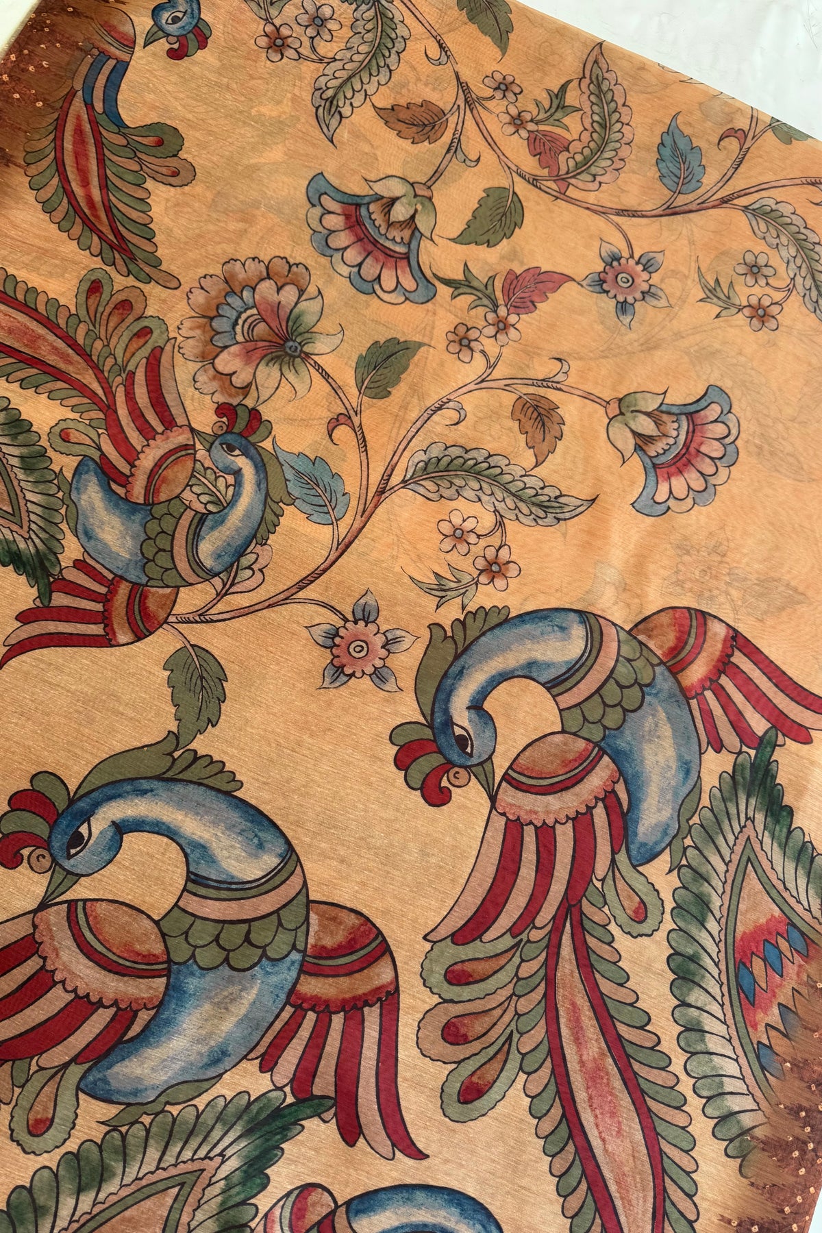 This saree features a warm beige base adorned with graceful peacock motifs in soothing shades of blue, coral, green, and maroon. Delicate floral and leafy patterns flow across the body, adding depth and movement to the design. Finished with a subtle brown border and tassel detailing, it offers a perfect balance of traditional artistry and timeless elegance.