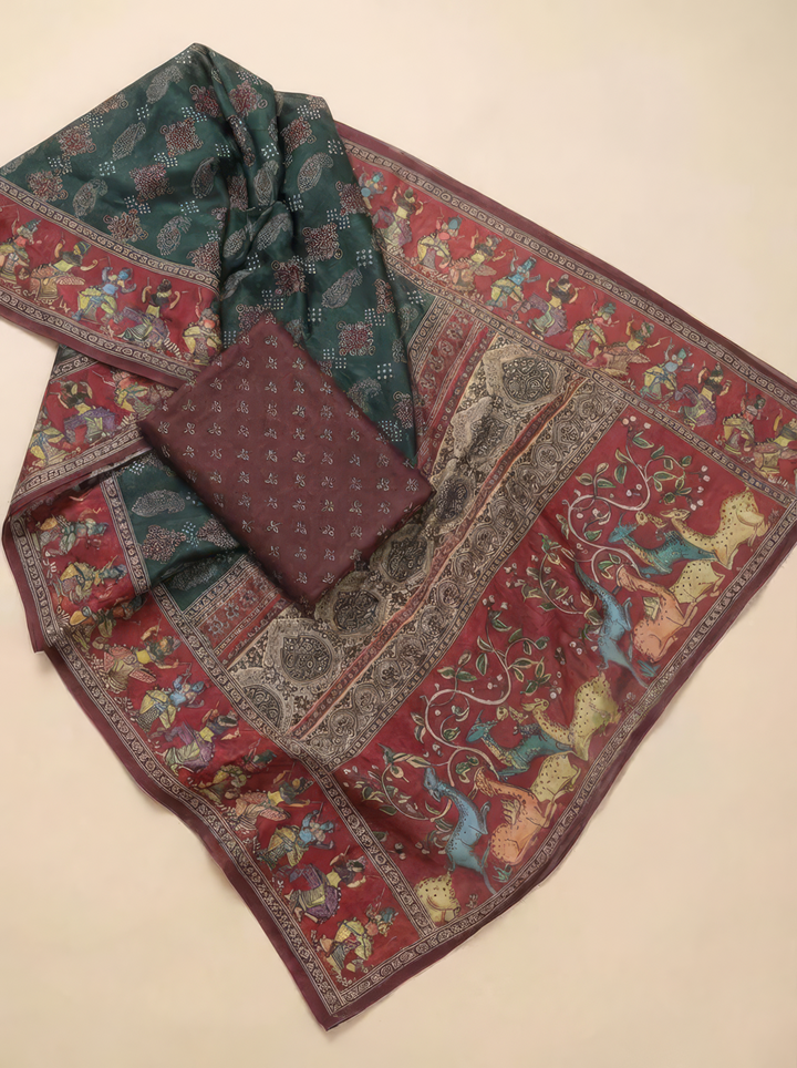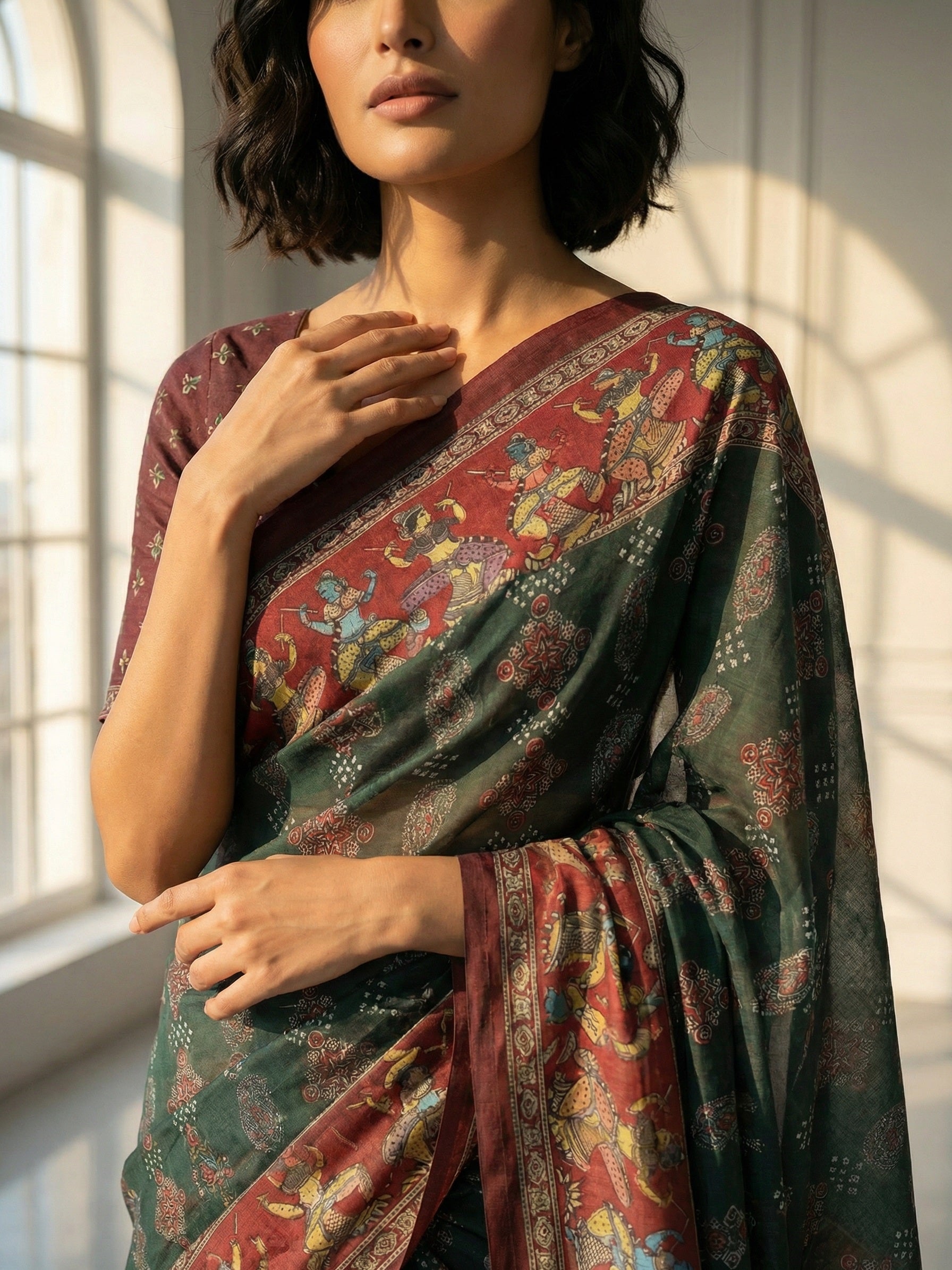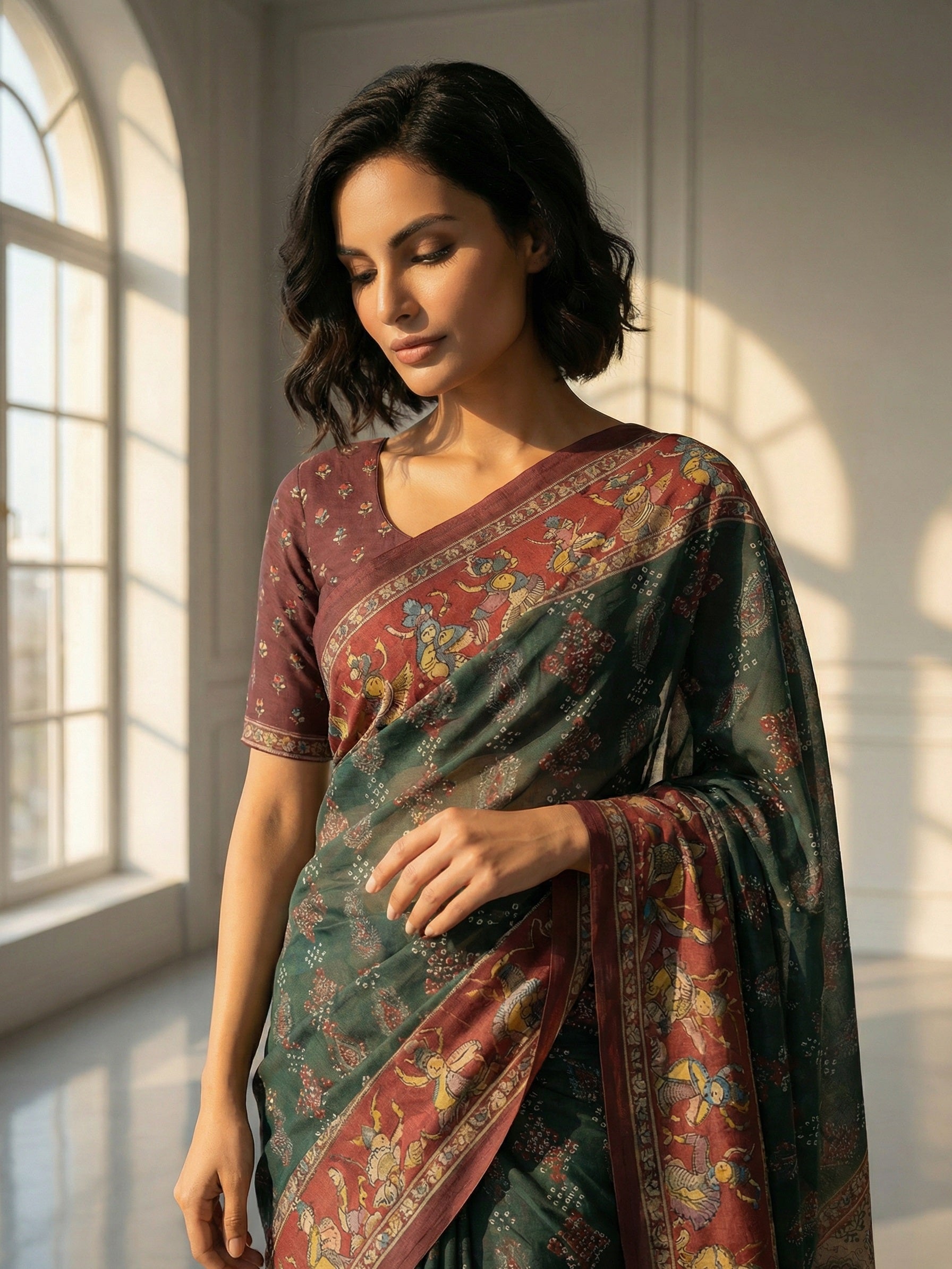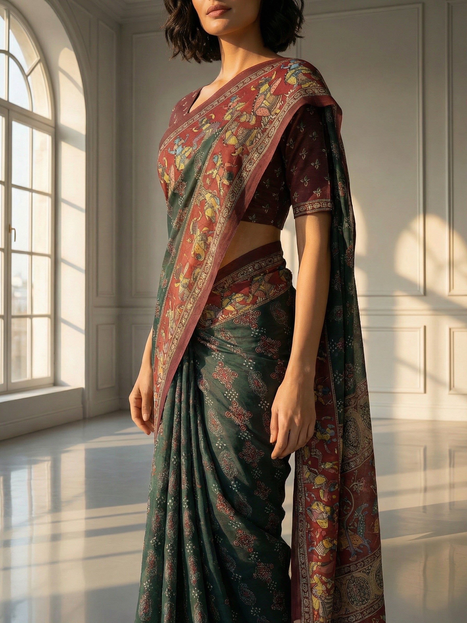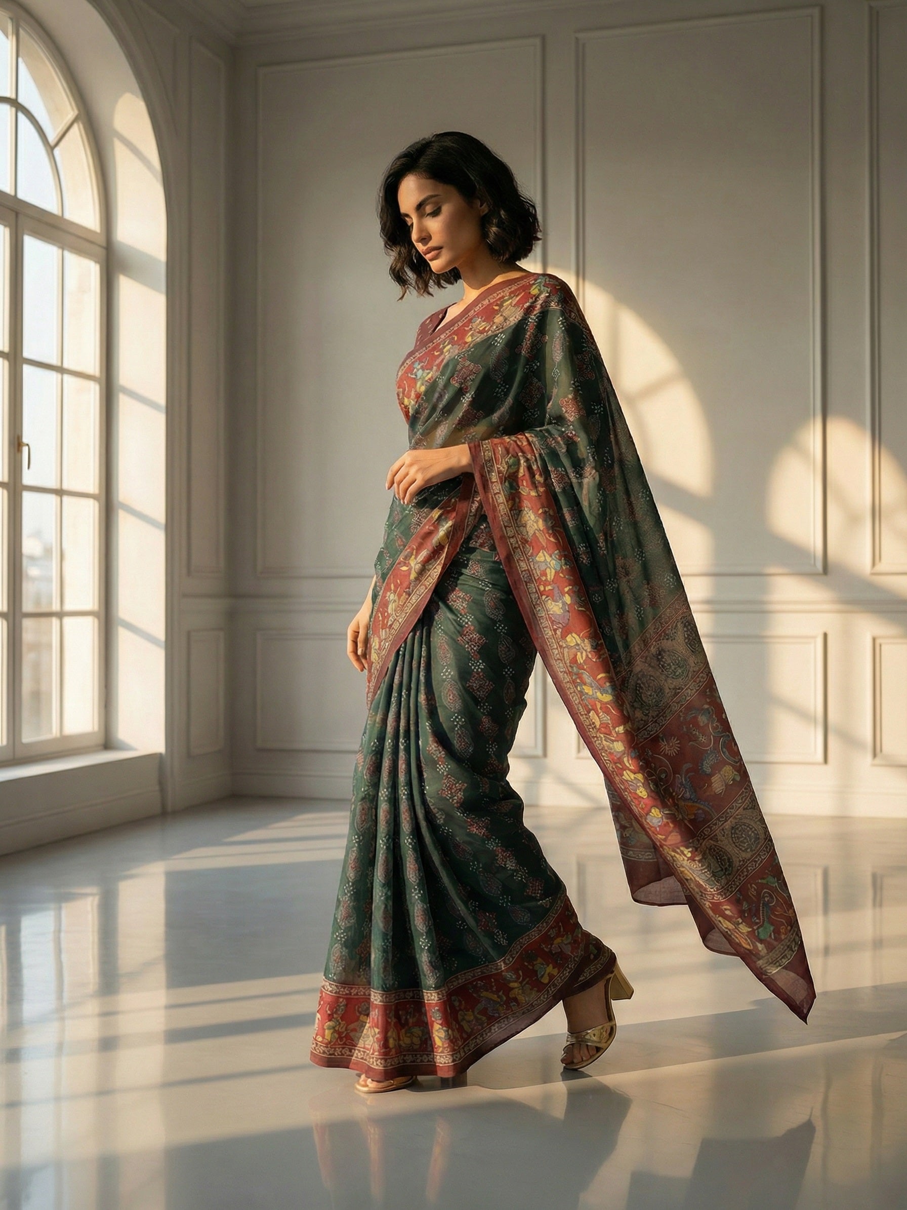 A graceful Chanderi silk saree featuring delicate traditional floral prints across a rich bottle green body, highlighted with an intricately printed border and pallu. Lightweight, elegant, and perfect for office wear, festive occasions, and everyday ethnic style.