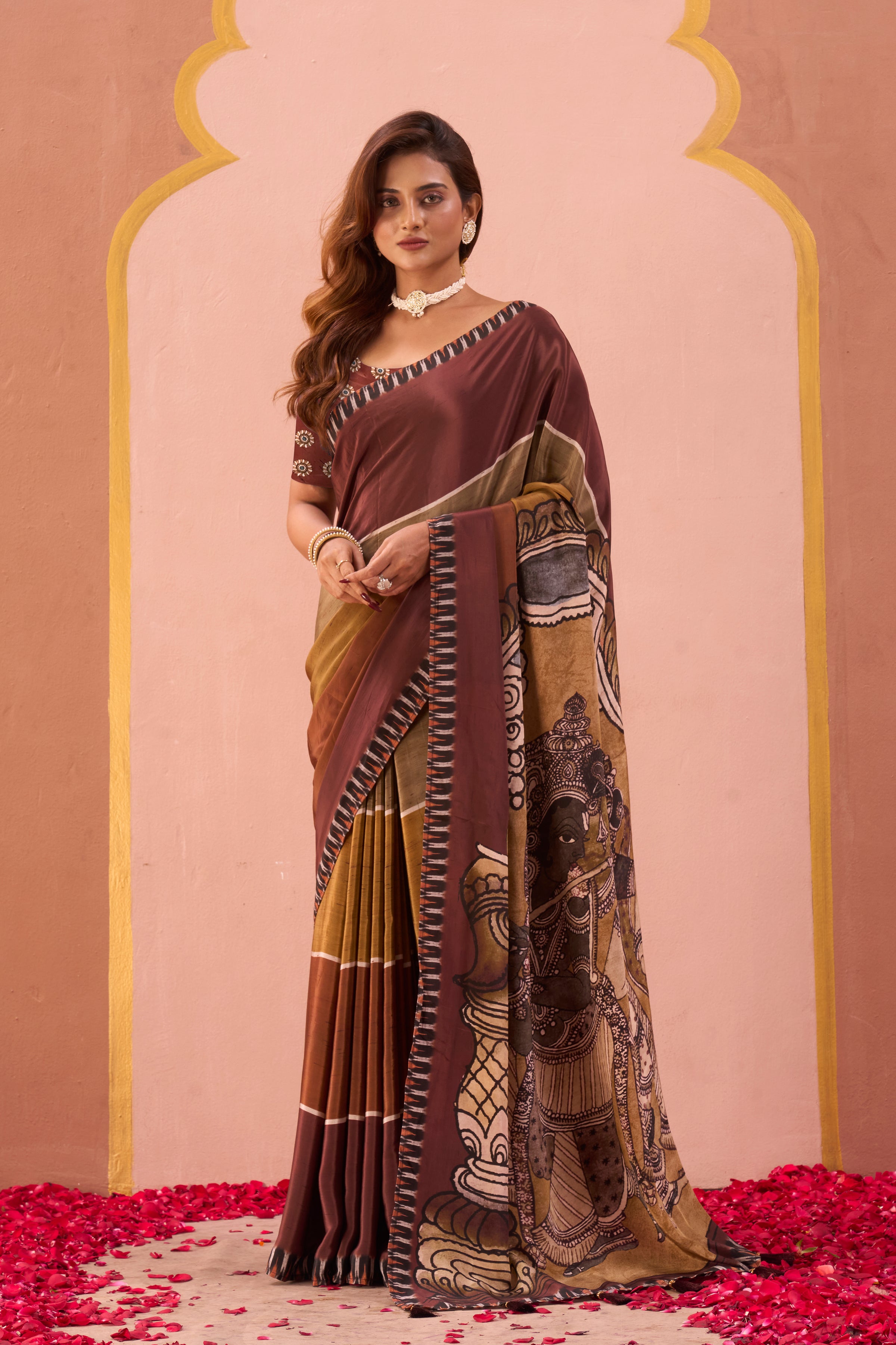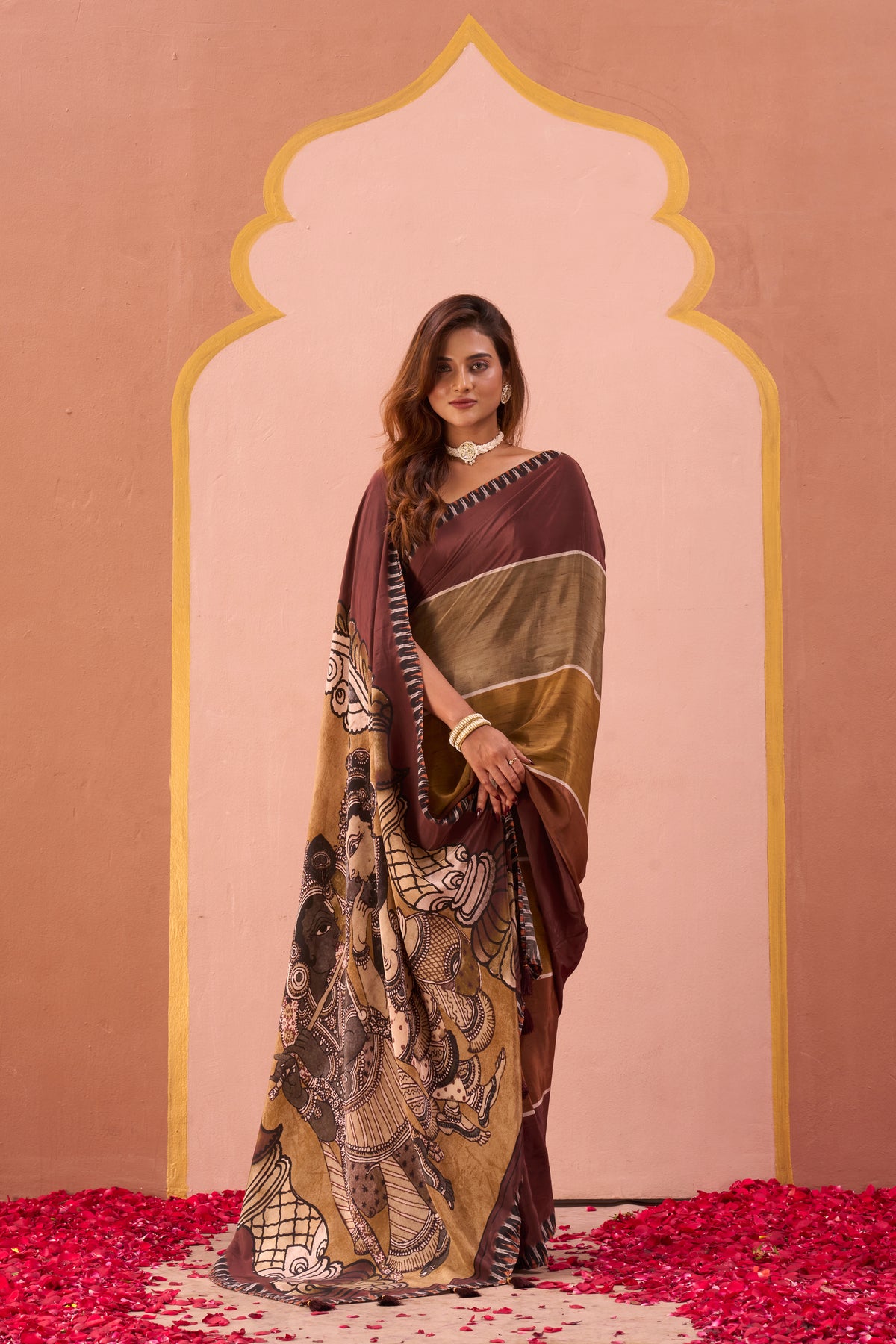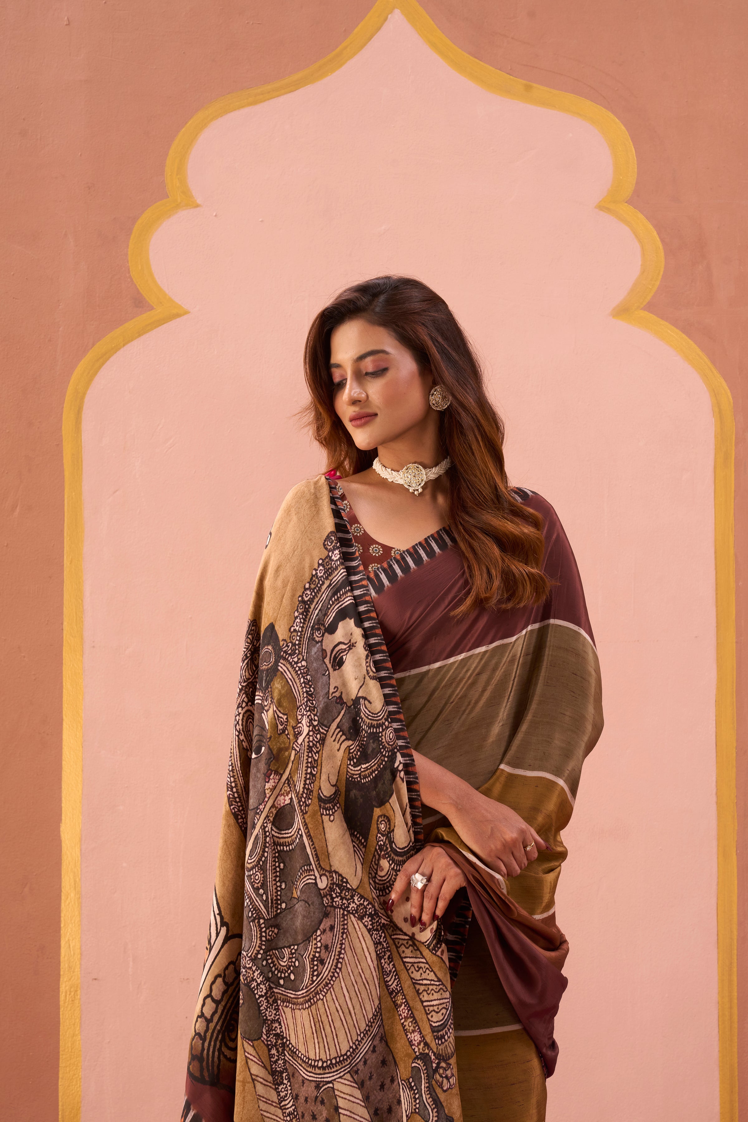 An elegant drape in warm brown and olive tones, this saree is designed with subtle stripes and a bold contrast border. The pallu showcases a striking mural-inspired artwork, adding depth and character to the piece. Perfect for festive occasions or cultural gatherings, this saree celebrates earthy charm with a touch of contemporary elegance.