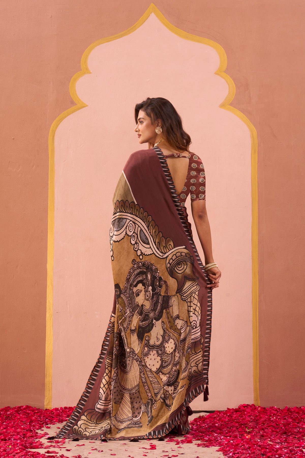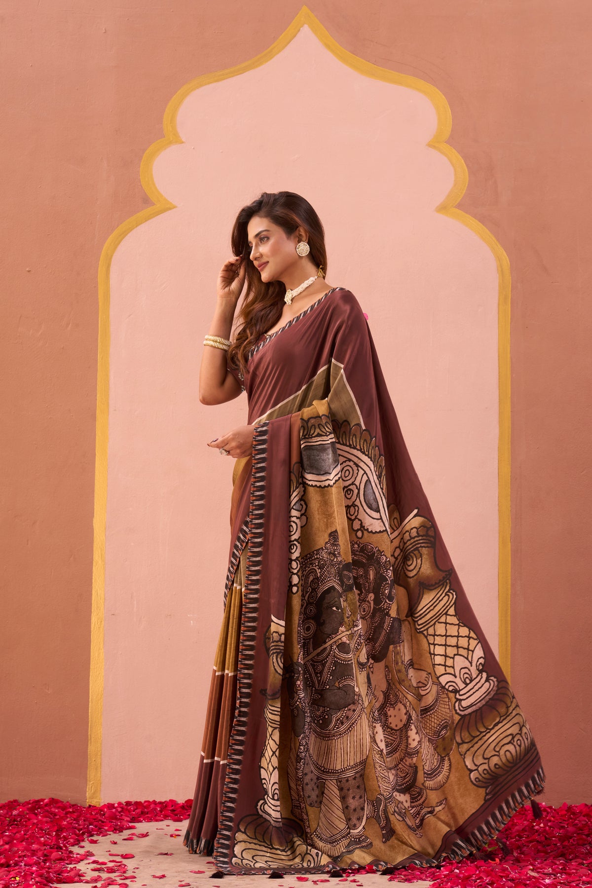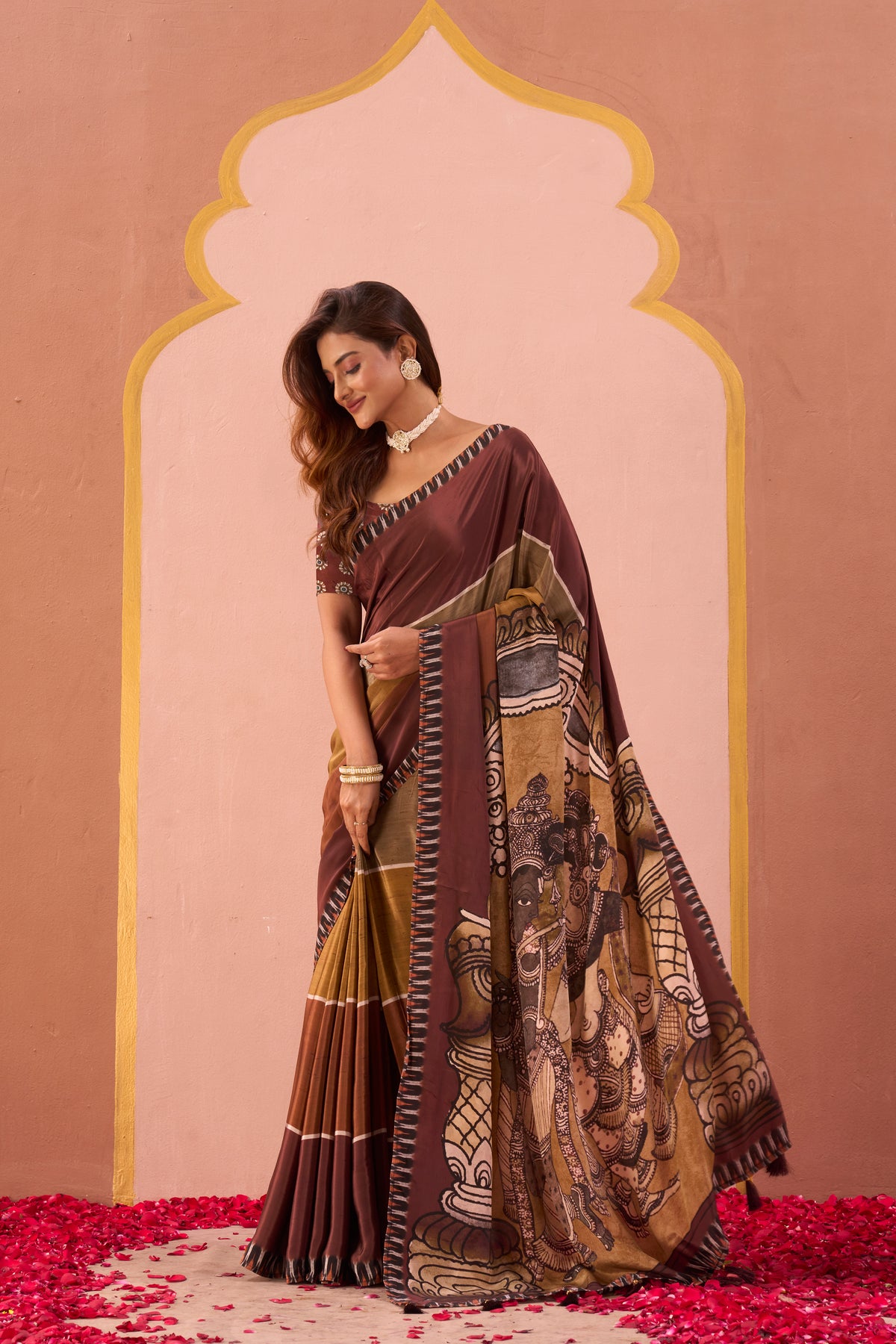 An elegant drape in warm brown and olive tones, this saree is designed with subtle stripes and a bold contrast border. The pallu showcases a striking mural-inspired artwork, adding depth and character to the piece. Perfect for festive occasions or cultural gatherings, this saree celebrates earthy charm with a touch of contemporary elegance.