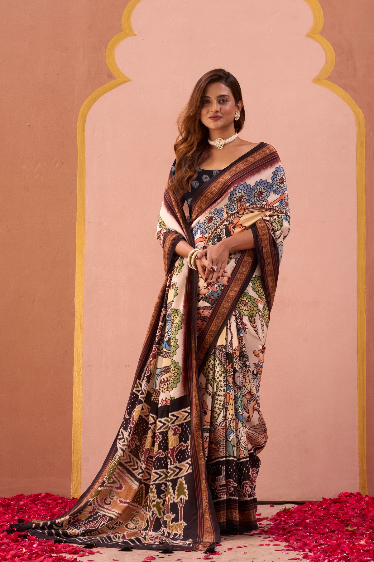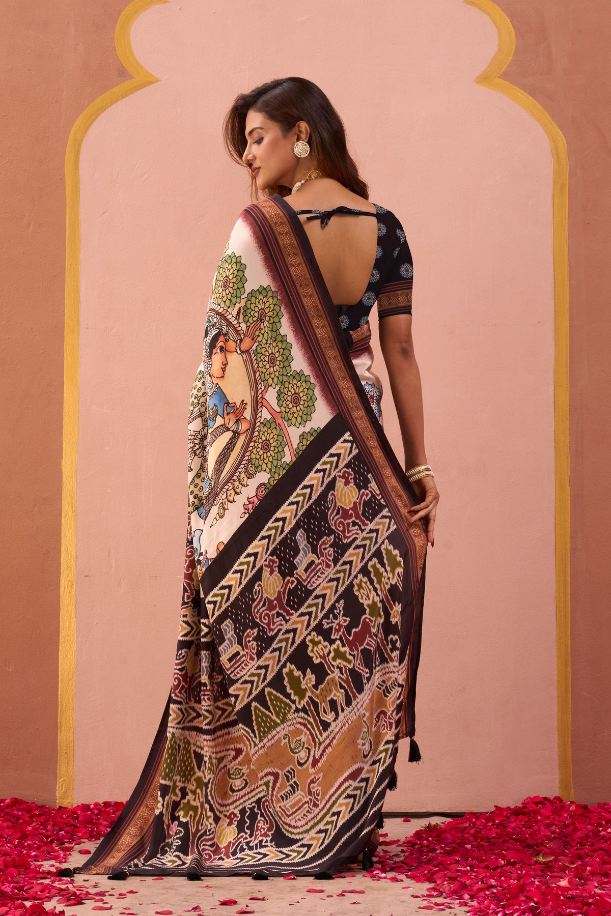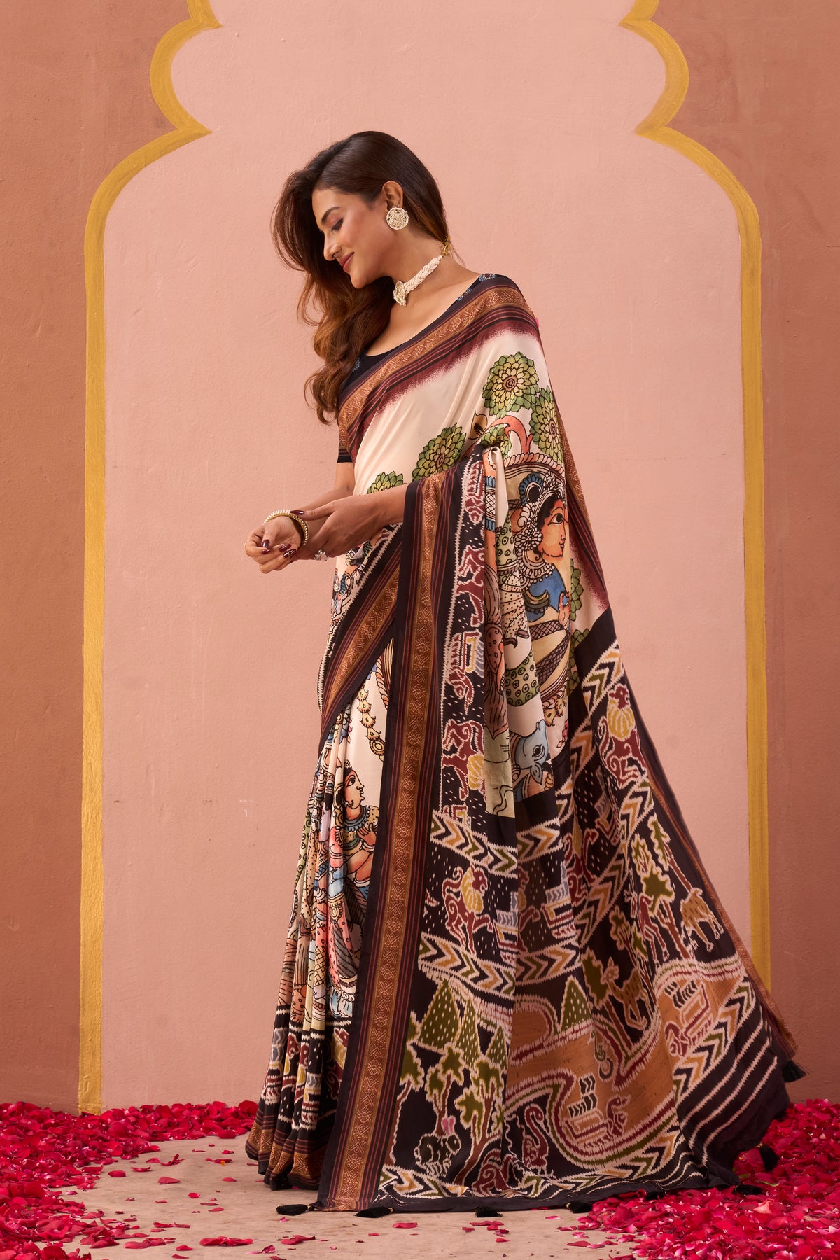 This saree celebrates heritage with folk-art inspired prints reminiscent of Madhubani and Pattachitra traditions. Intricate motifs of nature, figures, and patterns flow seamlessly across the drape, framed with bold borders. A timeless piece, it beautifully weaves together culture, color, and contemporary elegance.