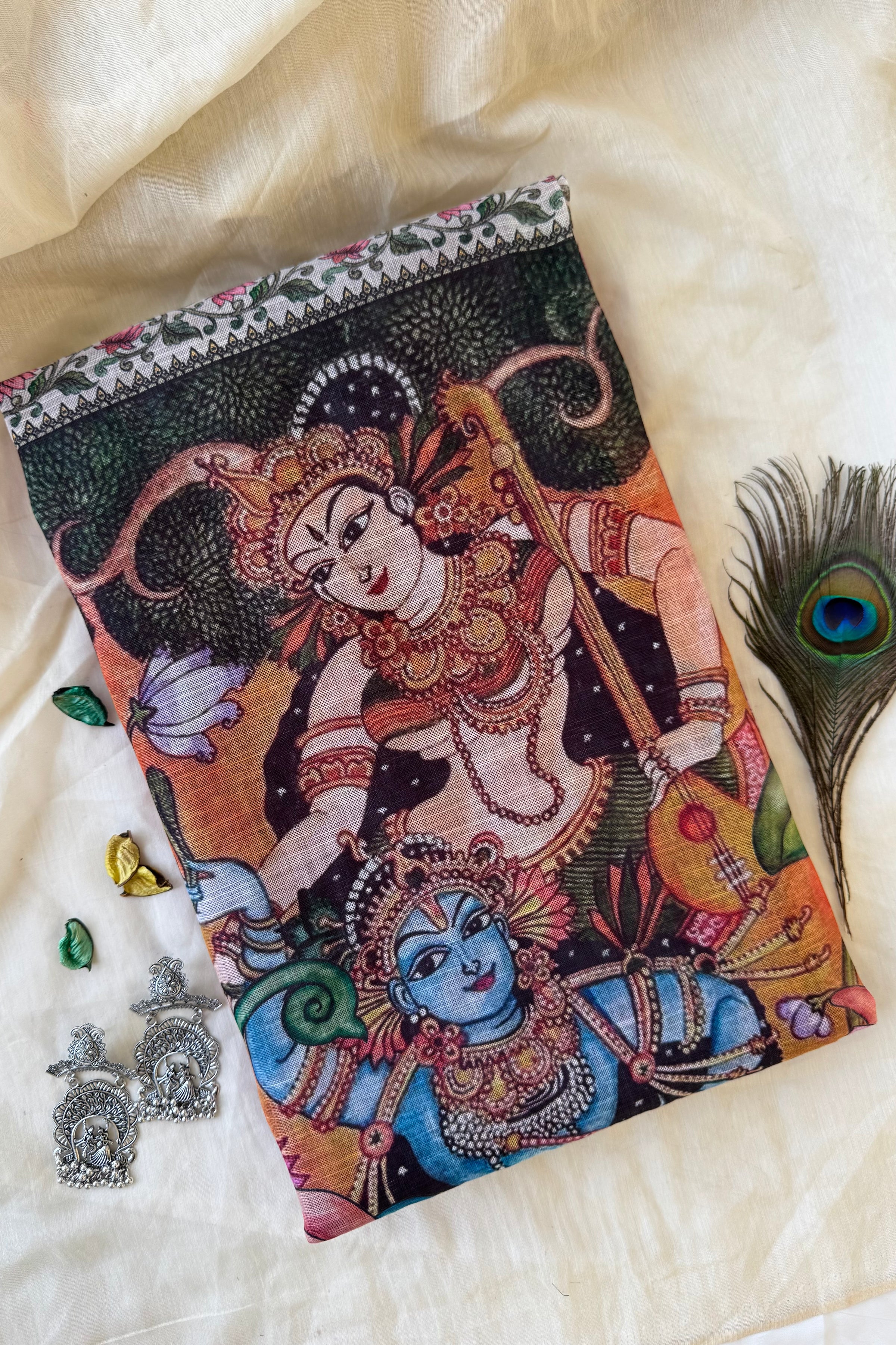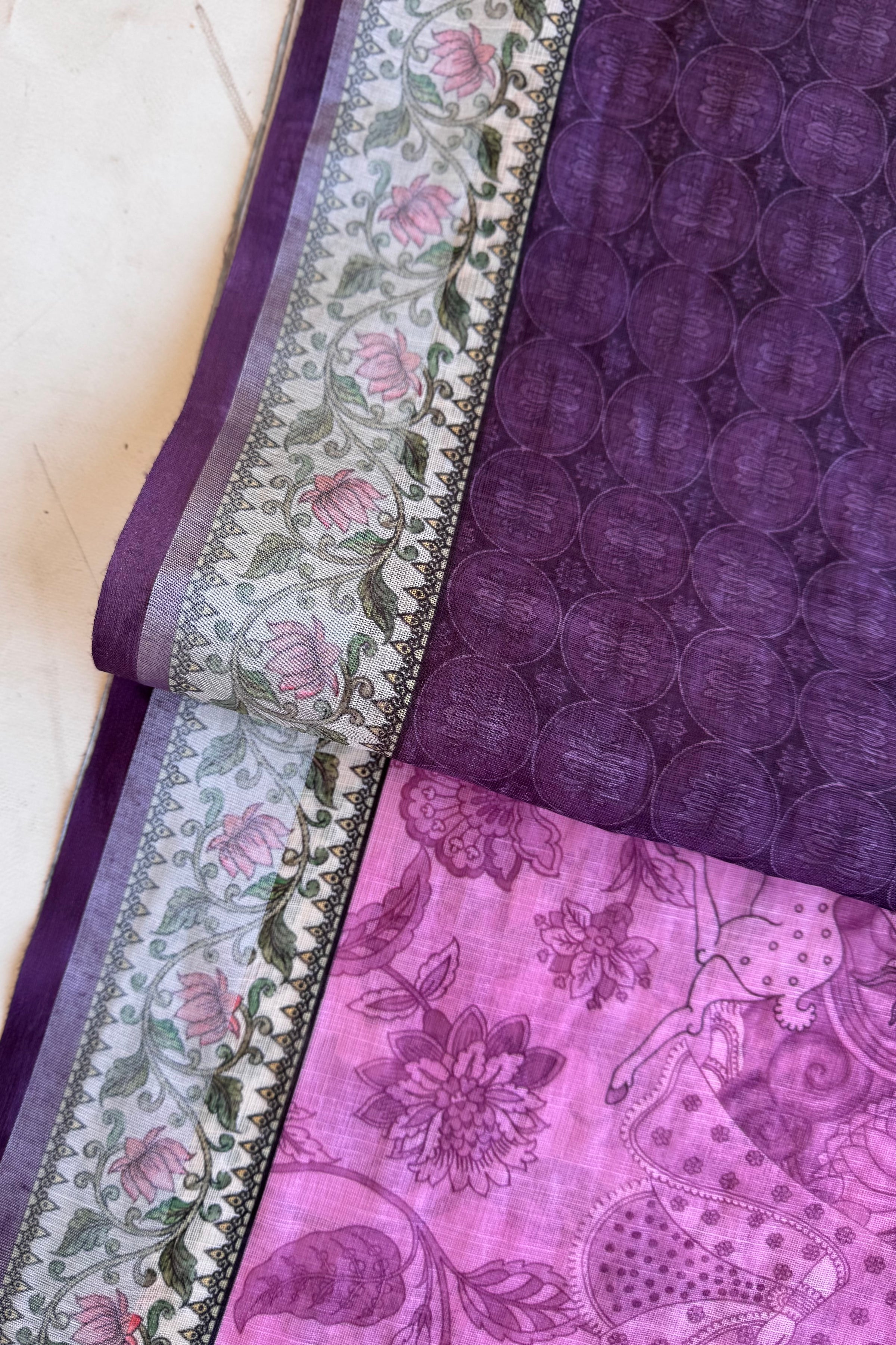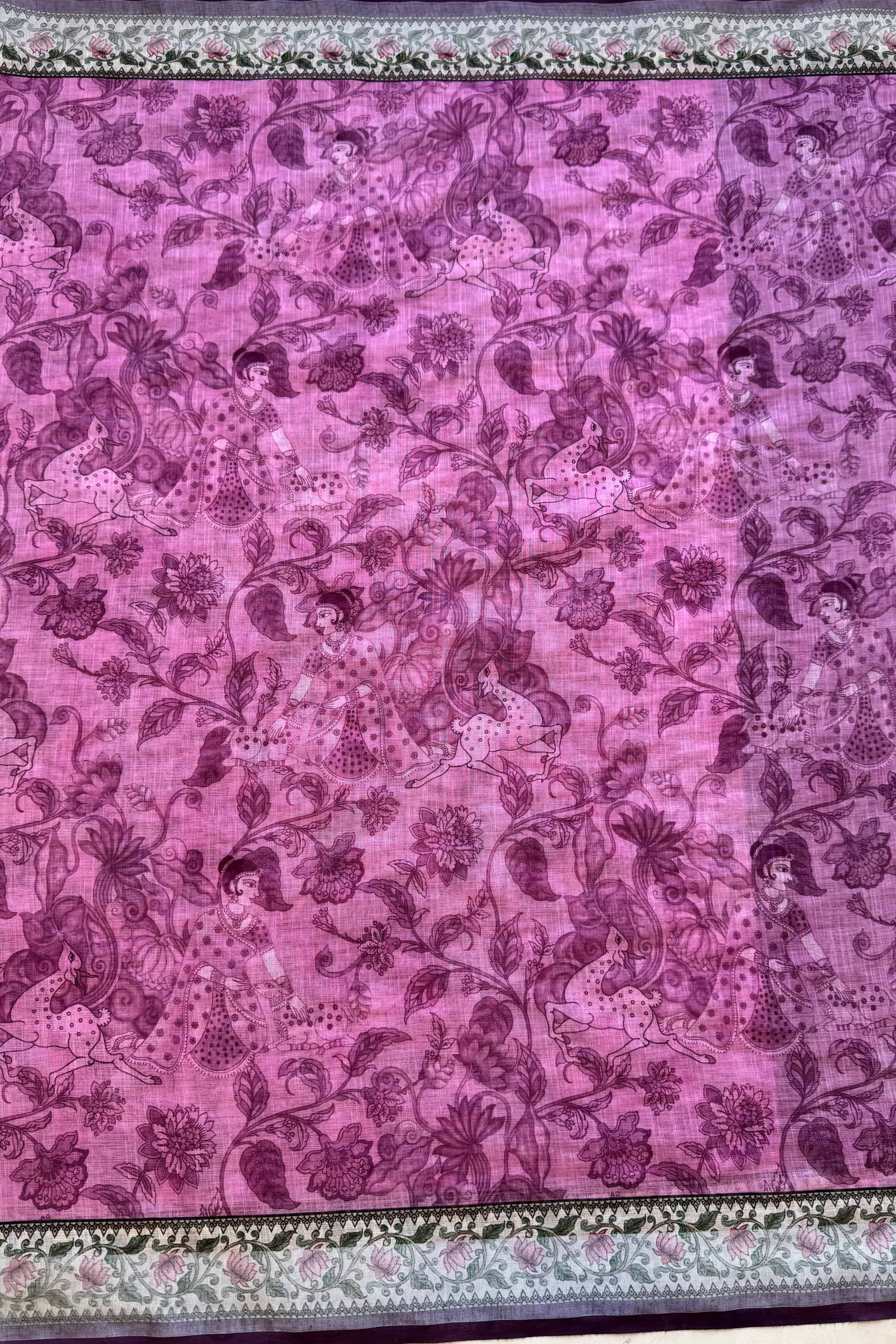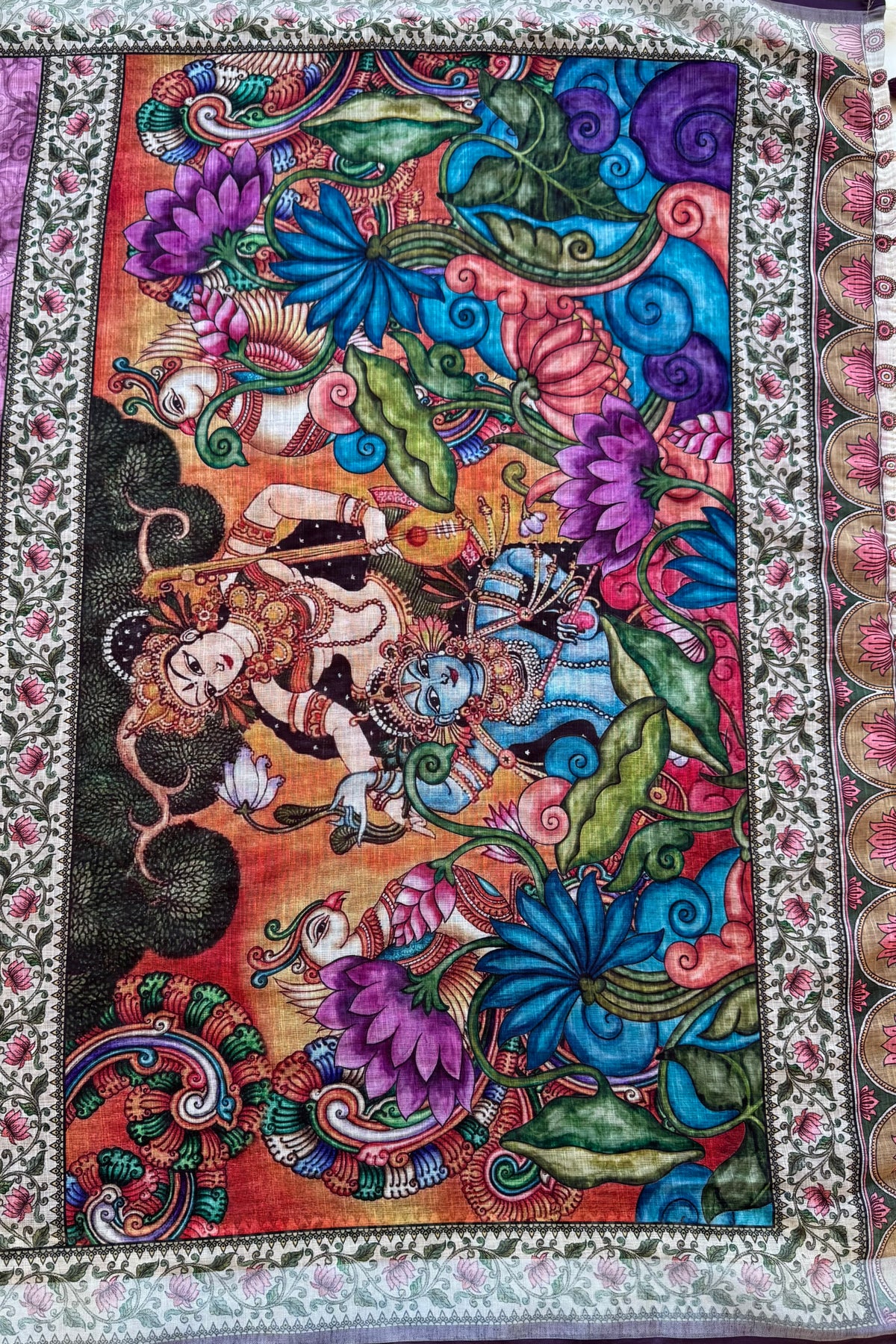 This saree features a rich, story-like print that feels lively and artistic. The body is filled with delicate floral and nature-inspired motifs, creating a soft yet detailed base. The pallu stands out with a vibrant scene of graceful figures, blooming lotuses, birds, and flowing elements that bring movement and depth to the design. Finished with a beautifully detailed border, the overall look feels festive, cultural, and visually striking.
