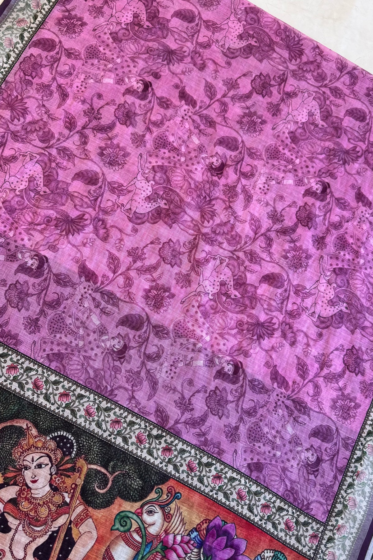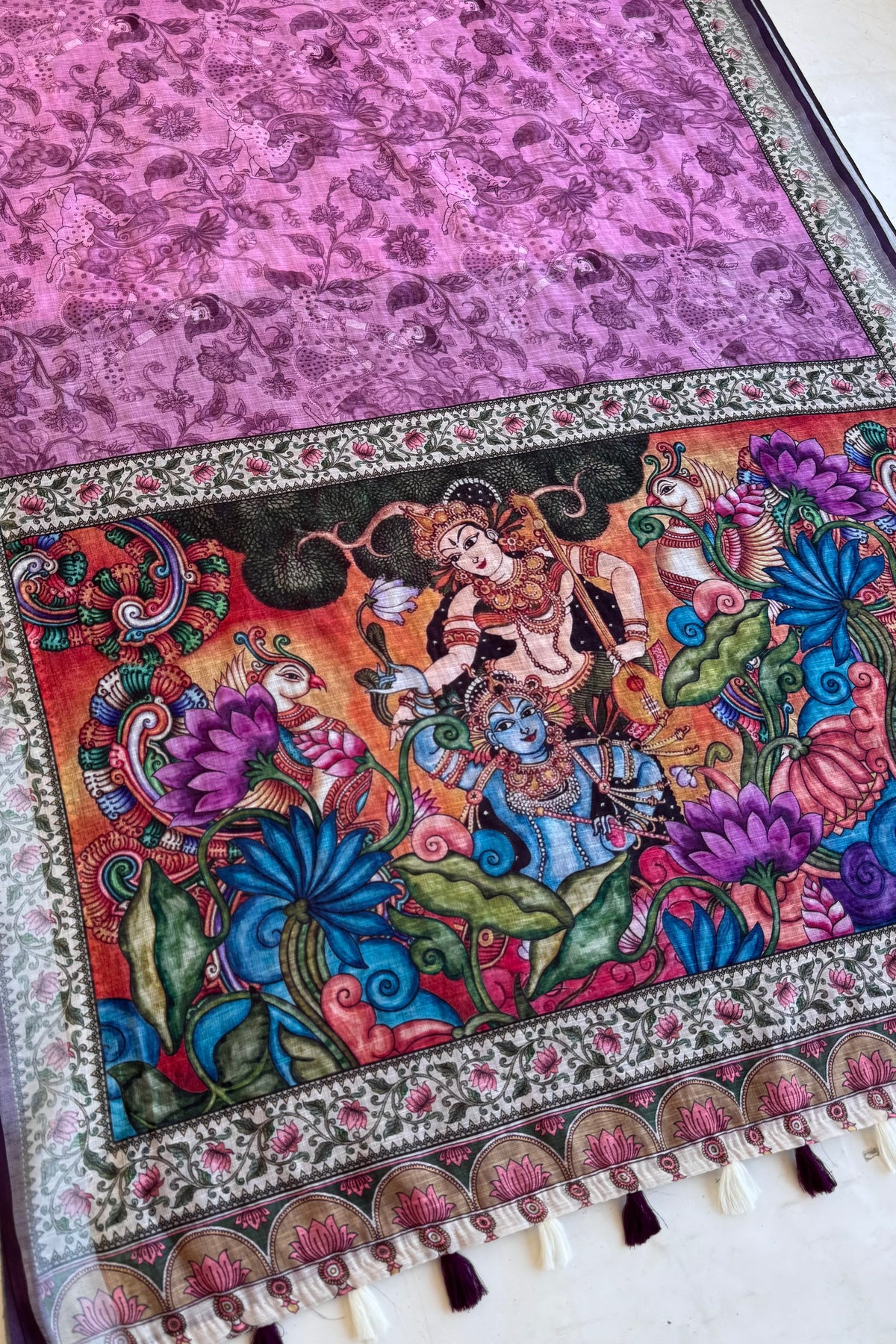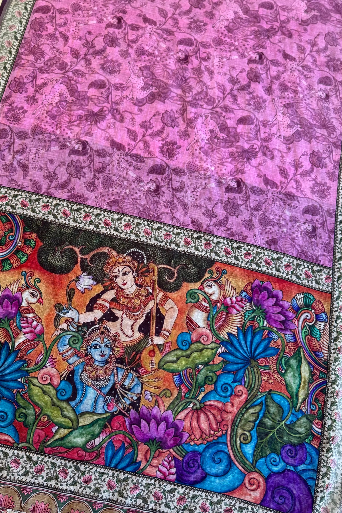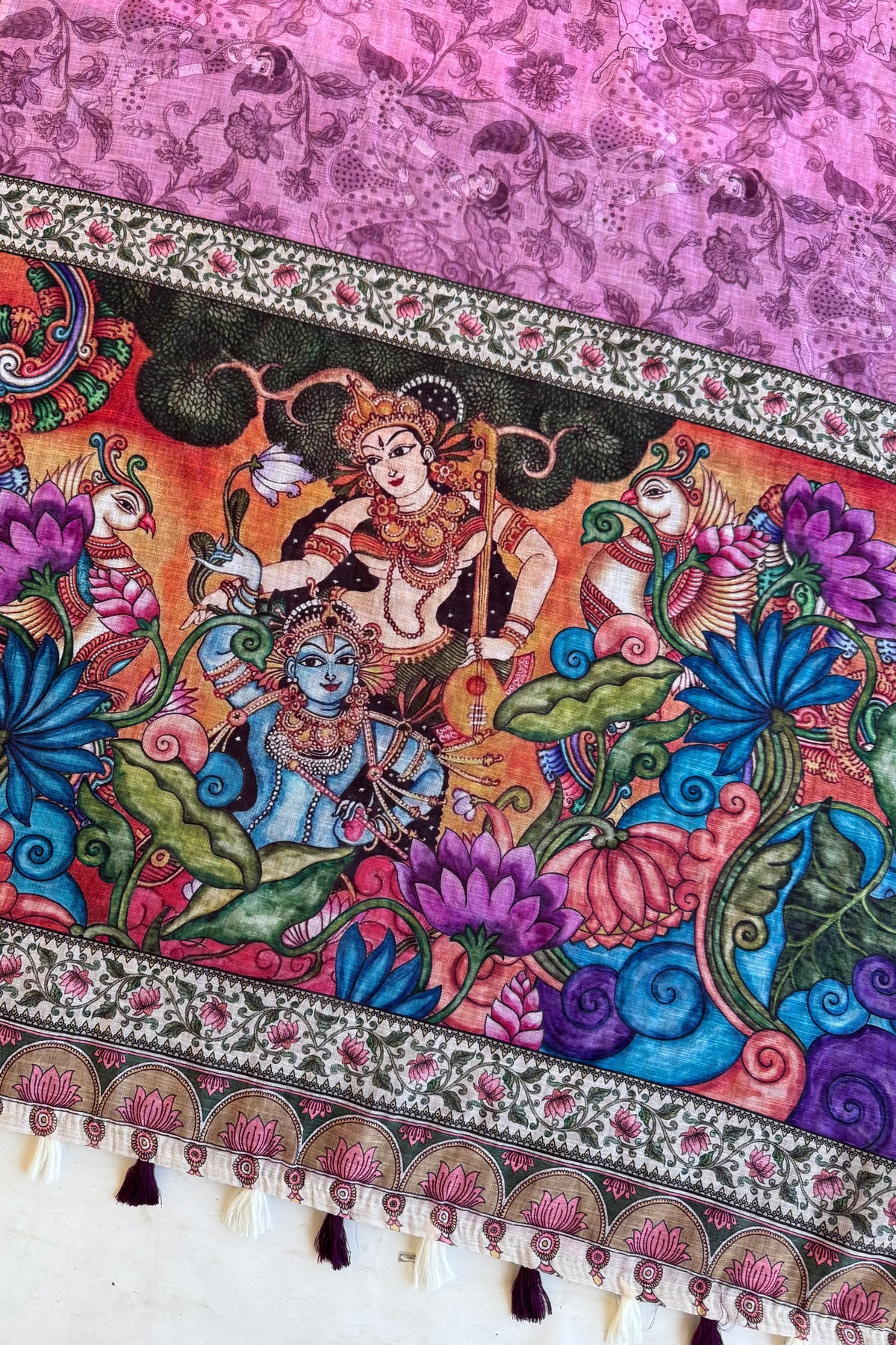 This saree features a rich, story-like print that feels lively and artistic. The body is filled with delicate floral and nature-inspired motifs, creating a soft yet detailed base. The pallu stands out with a vibrant scene of graceful figures, blooming lotuses, birds, and flowing elements that bring movement and depth to the design. Finished with a beautifully detailed border, the overall look feels festive, cultural, and visually striking.