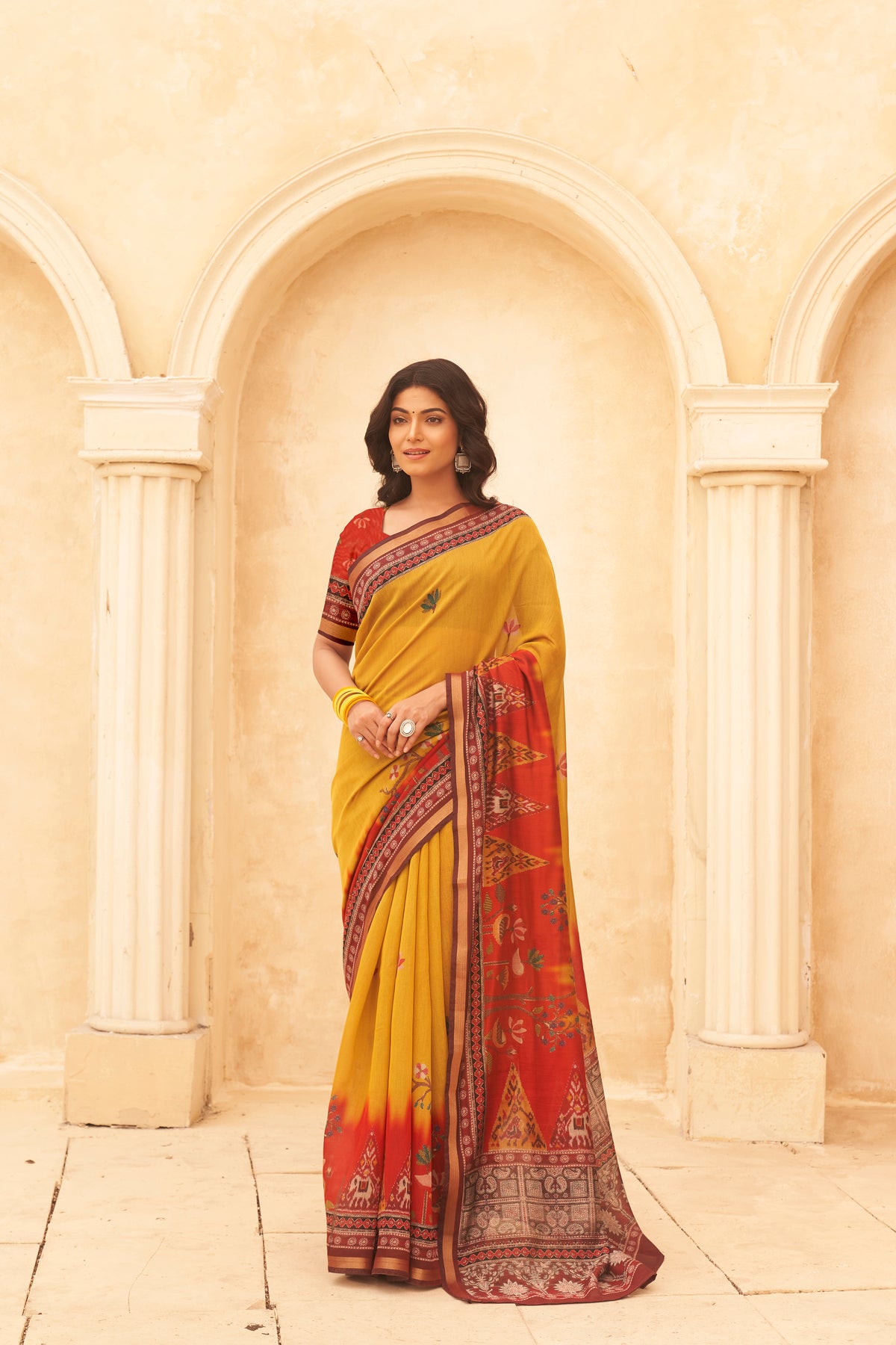 This saree comes with a vibrant mustard yellow base highlighted by detailed multicoloured prints. Crafted from soft viscose fabric, it offers a graceful fall and a comfortable feel throughout the day. The digitally printed pallu and border add a traditional charm, making it suitable for festive occasions and ethnic wear.