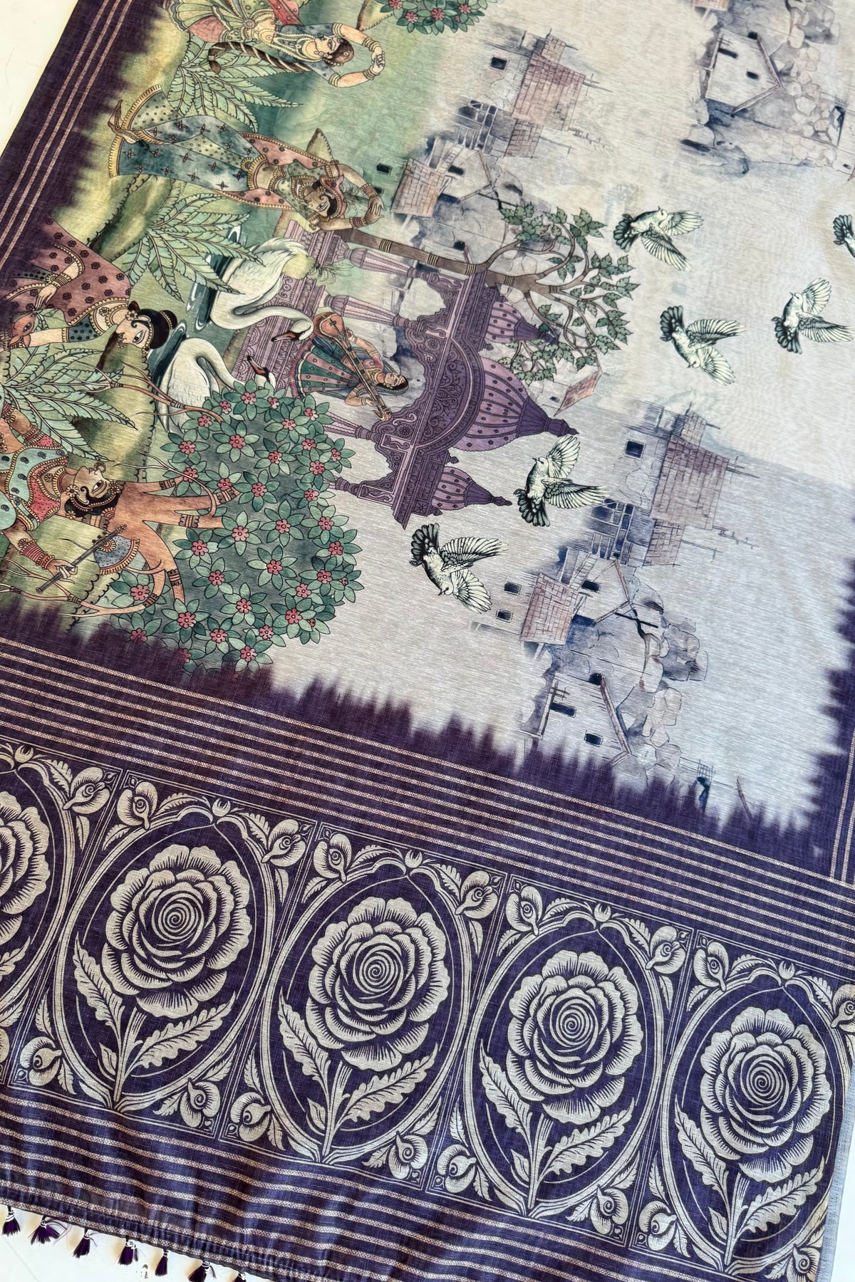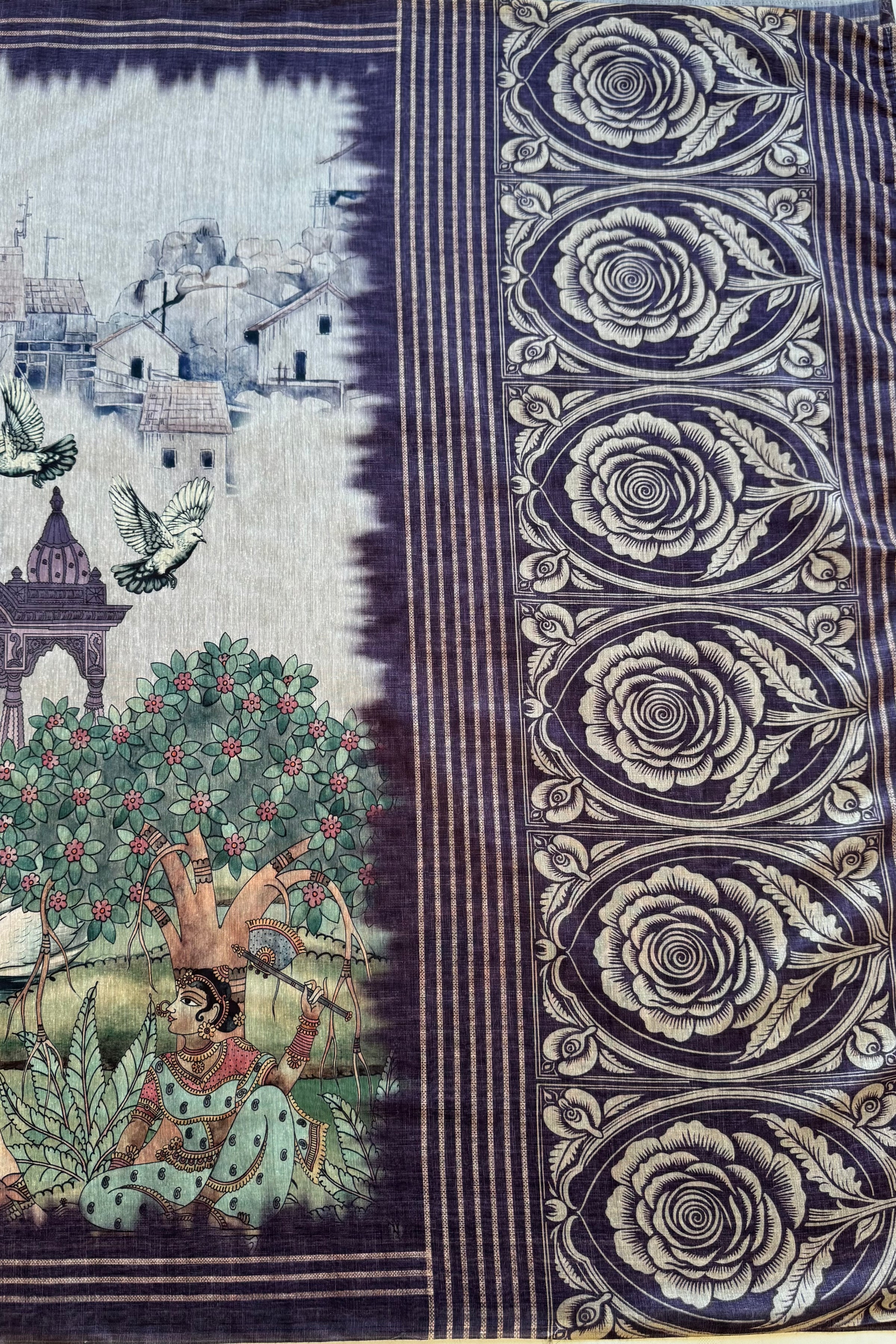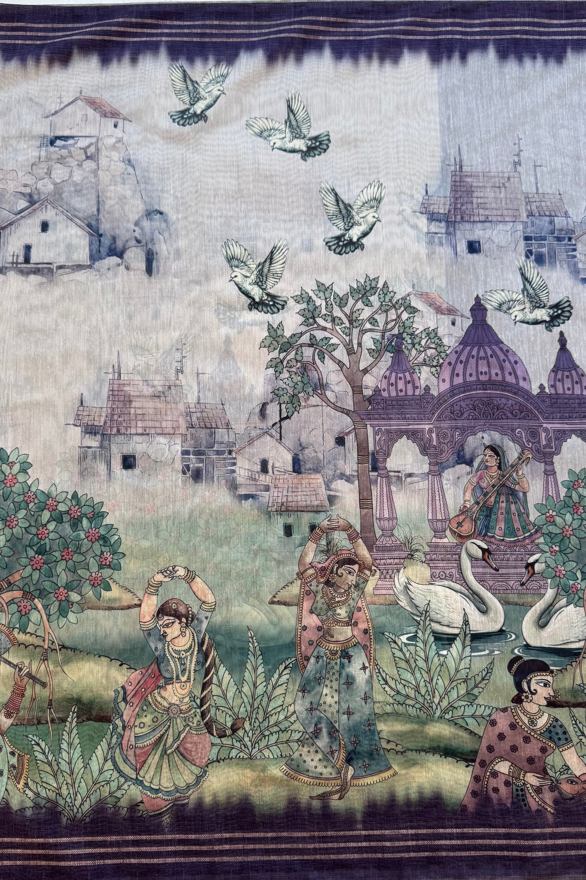 This saree features a detailed scenic print with people, trees, birds, and palace-style elements, creating a beautiful storytelling look. The border stands out with bold floral motifs and fine stripes, adding a rich frame to the design. Overall, it has a calm, artistic feel that looks graceful and eye-catching.