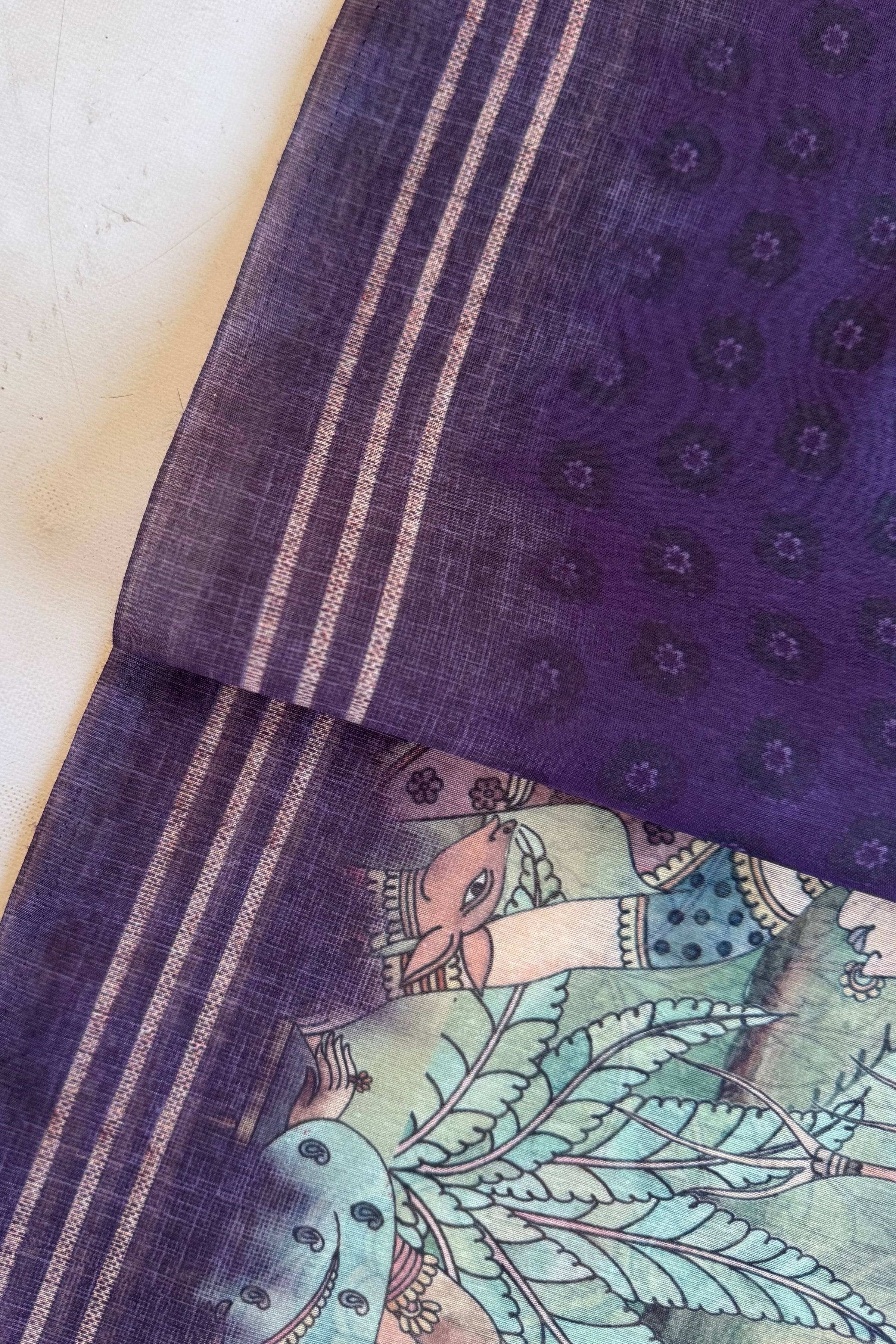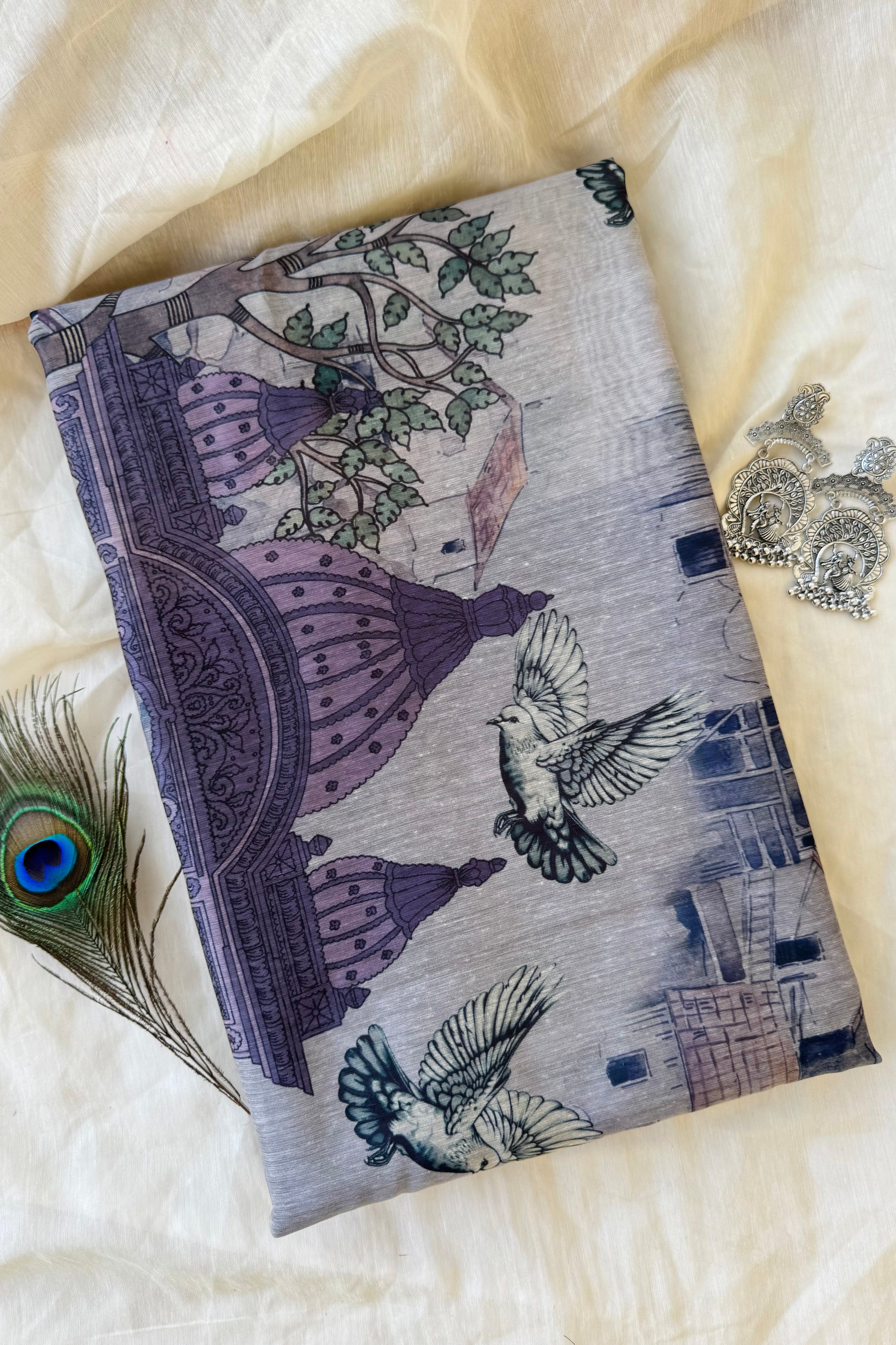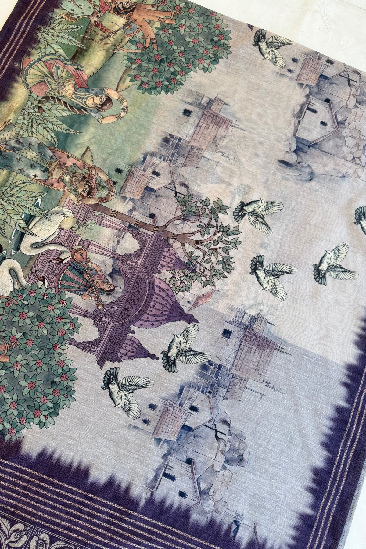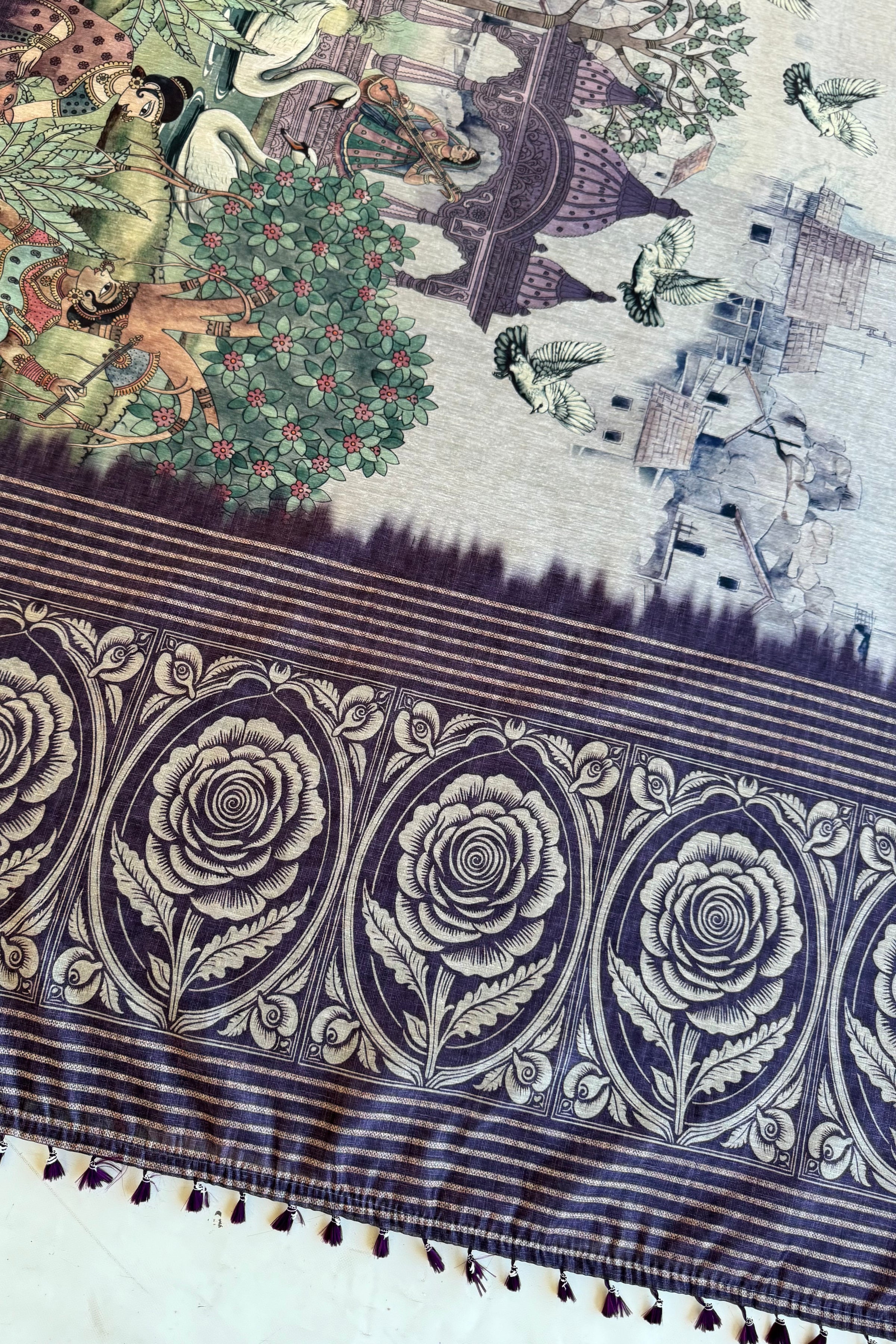 This saree features a detailed scenic print with people, trees, birds, and palace-style elements, creating a beautiful storytelling look. The border stands out with bold floral motifs and fine stripes, adding a rich frame to the design. Overall, it has a calm, artistic feel that looks graceful and eye-catching.