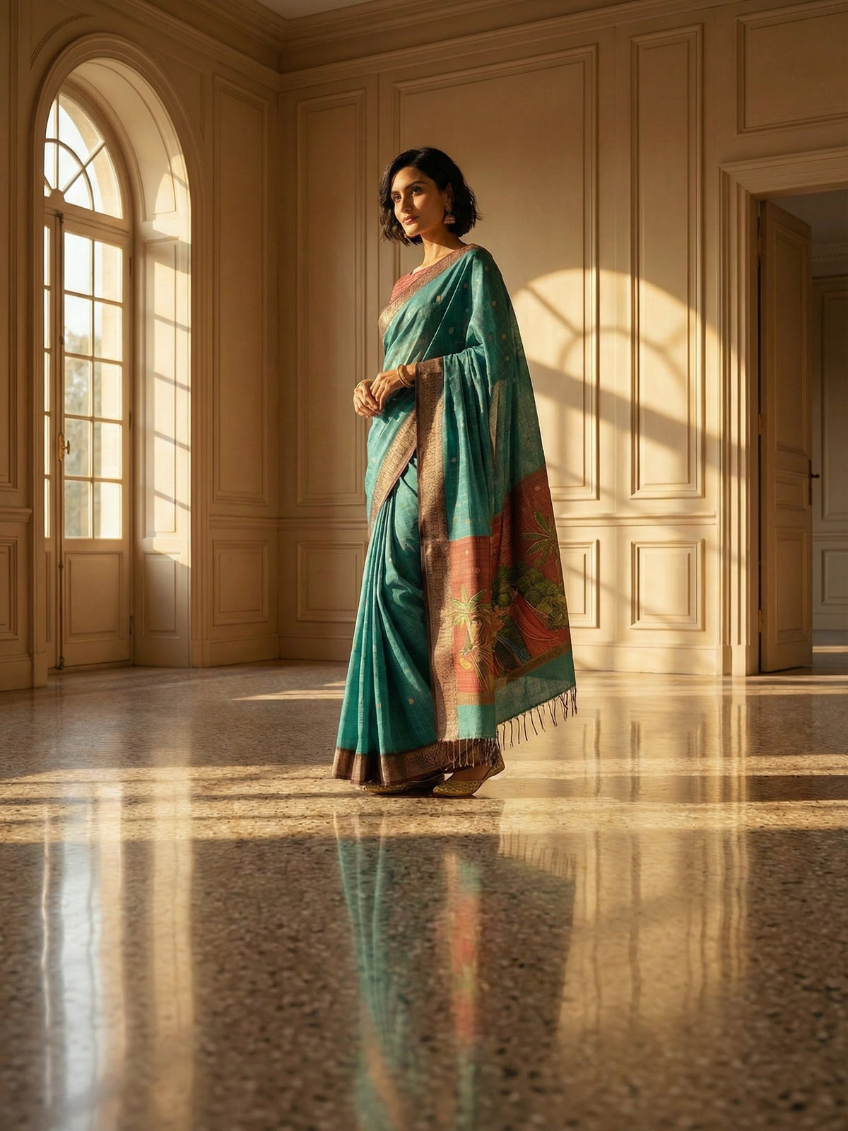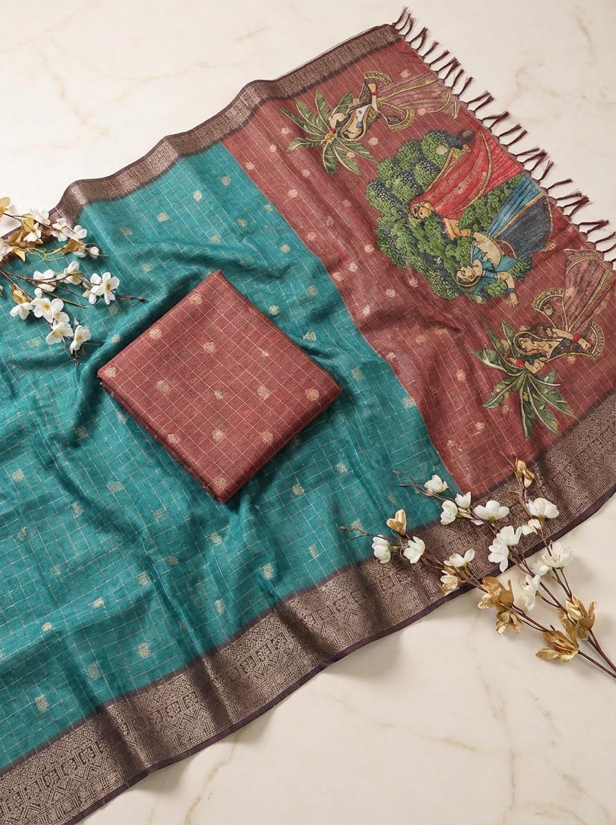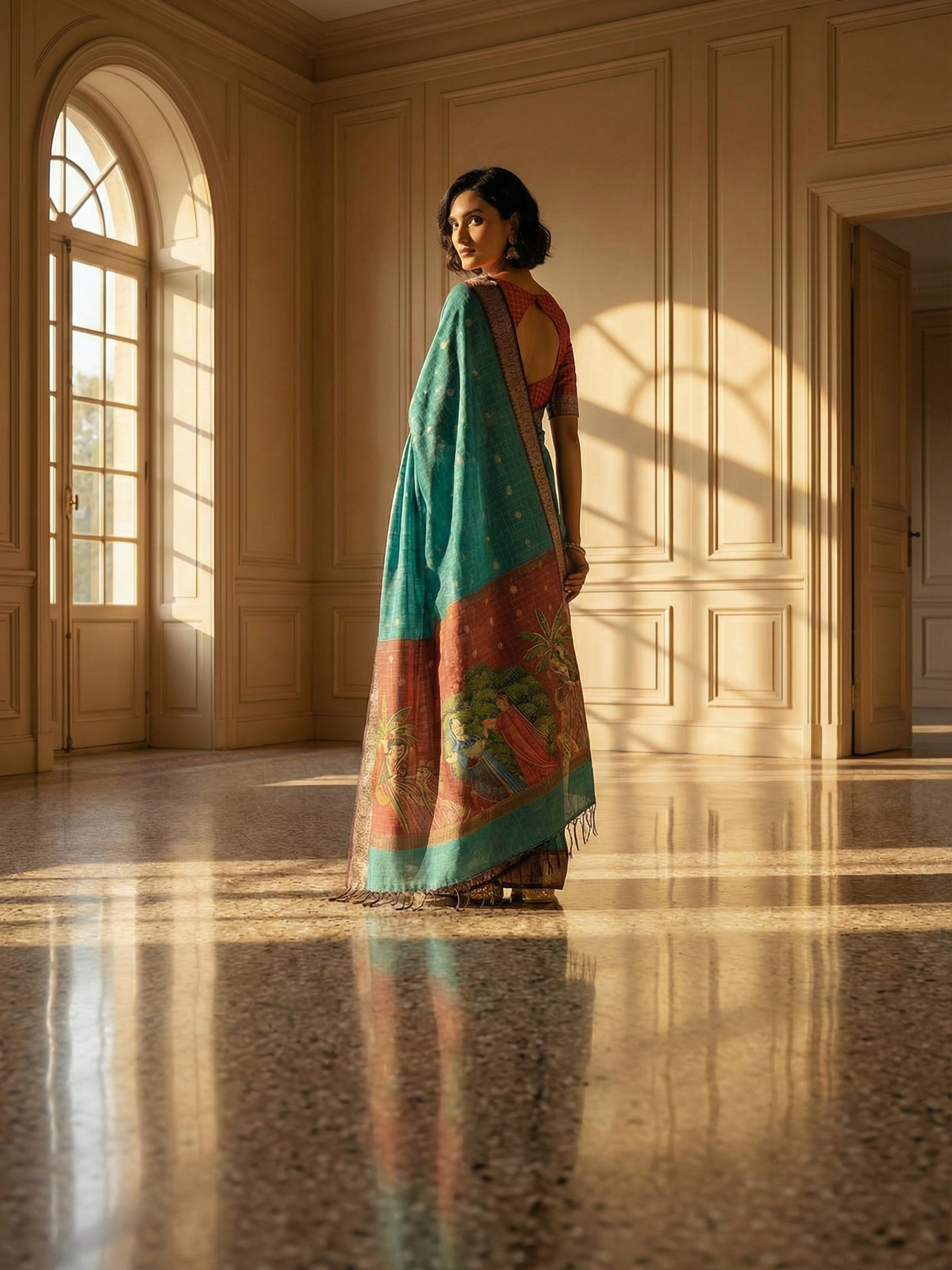 Elegant Dola silk saree featuring refined traditional digital prints with scenic cultural motifs on the pallu, complemented by a rich woven border. Smooth, lightweight drape makes it perfect for festive gatherings and graceful ethnic wear.