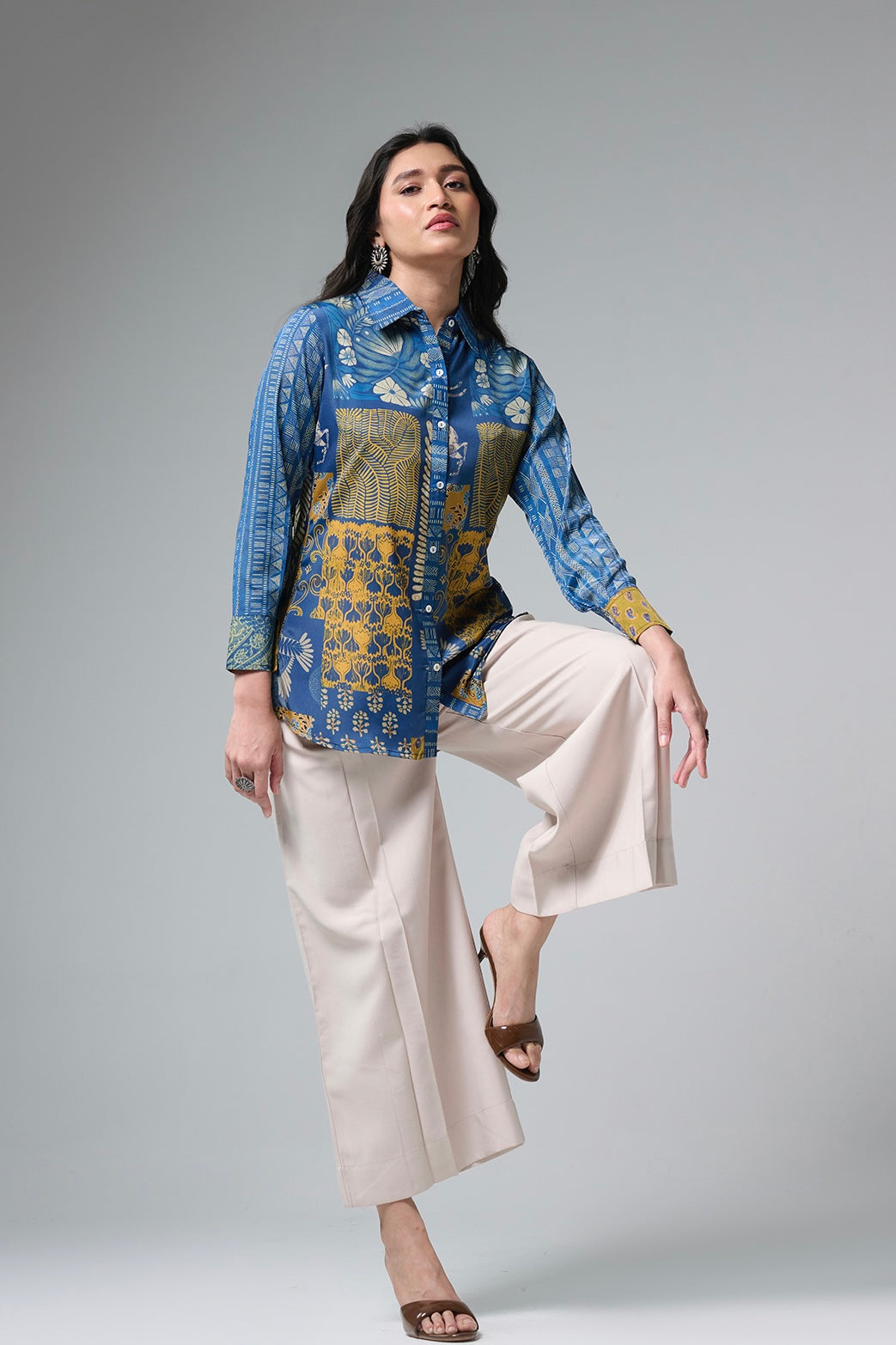 This blue shirt features a beautiful mix of floral and geometric prints.