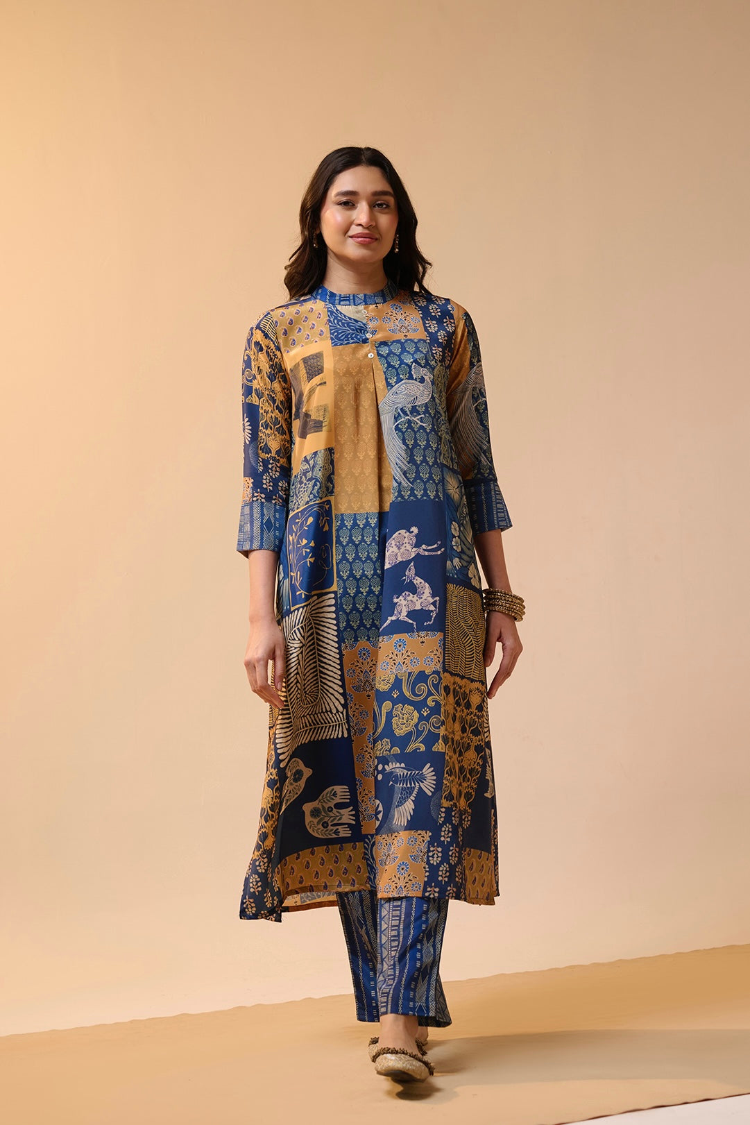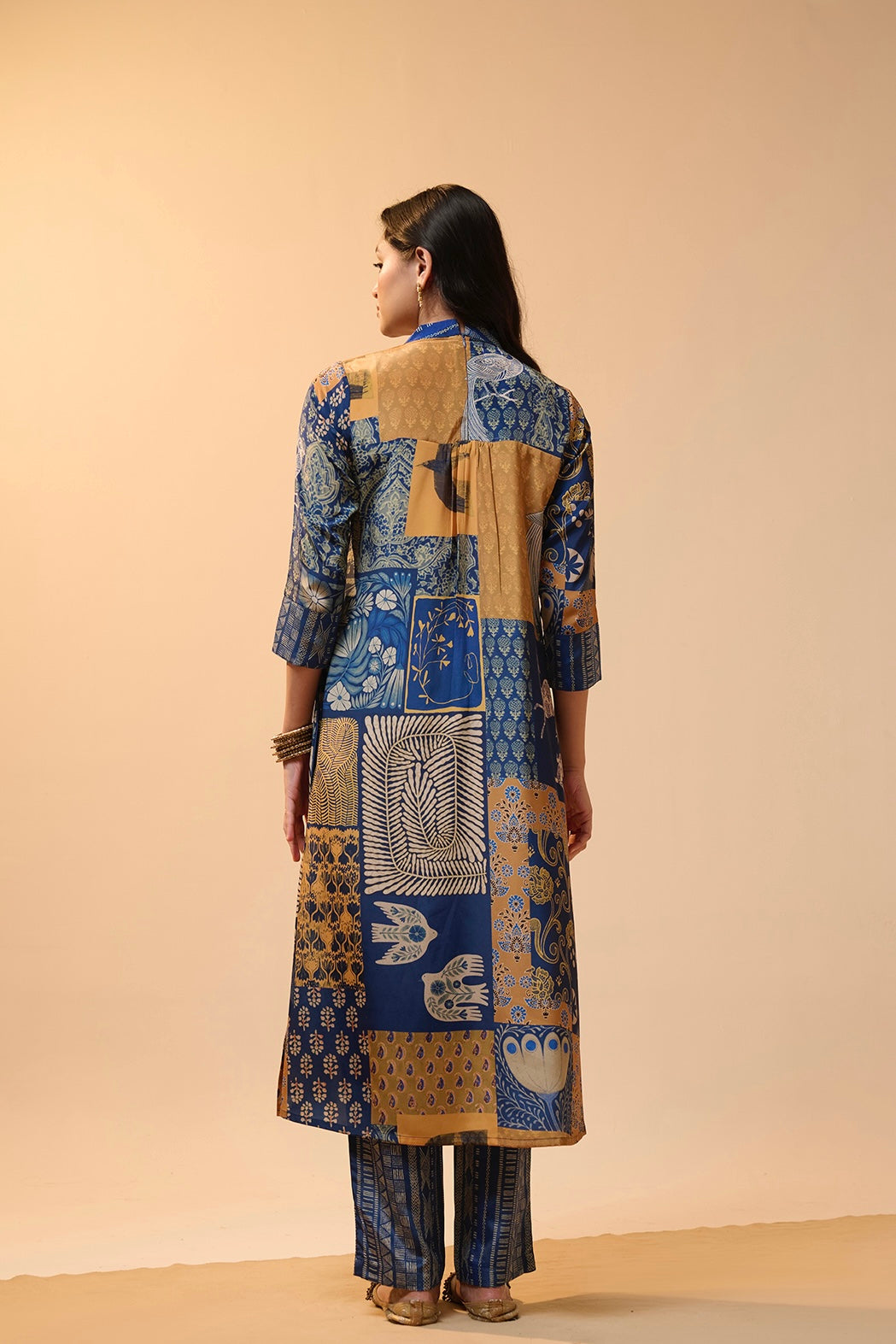 This kurta set features beautiful patch-style prints with birds, florals, and traditional motifs.