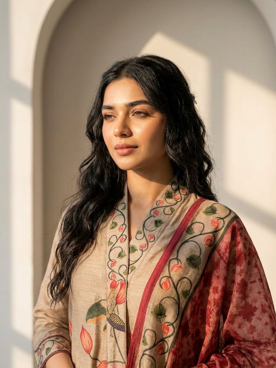 Beautiful set featuring elegant nature-inspired prints for a graceful look. The top is decorated with large floral and peacock motifs that add a rich artistic feel. The dupatta comes with a soft tie-dye style pattern and a leafy vine border. The overall design creates a charming blend of floral beauty and traditional prints.