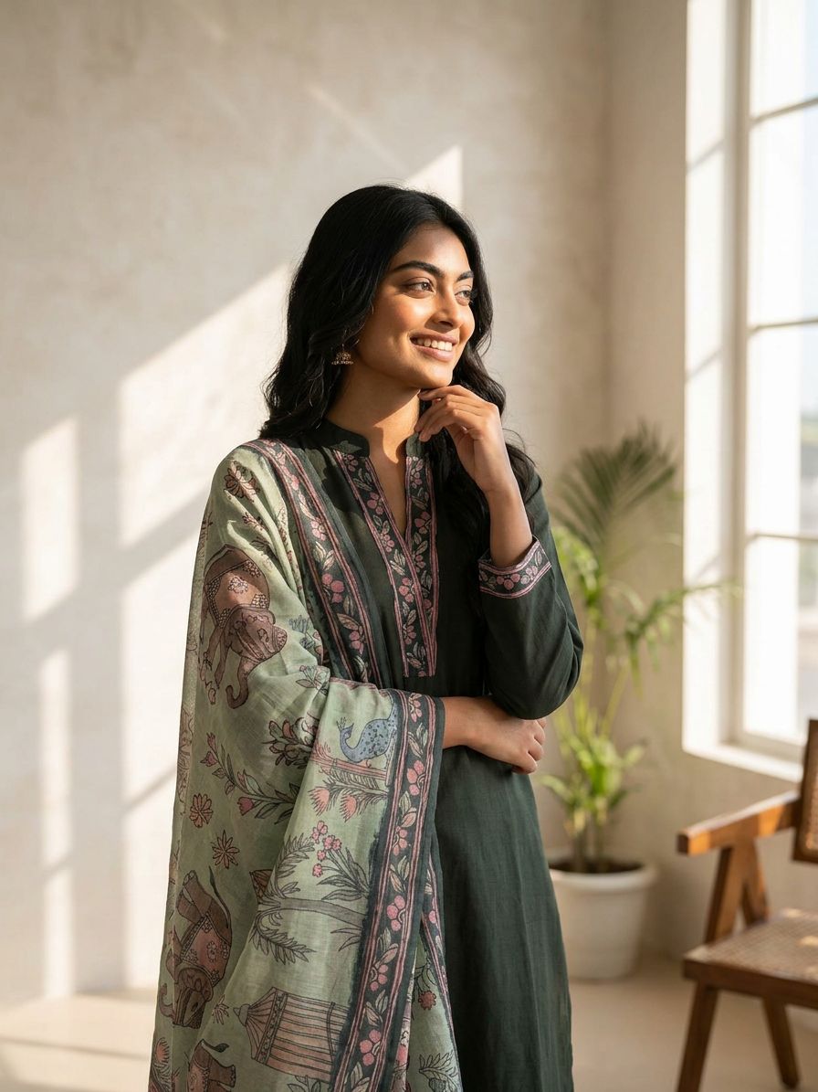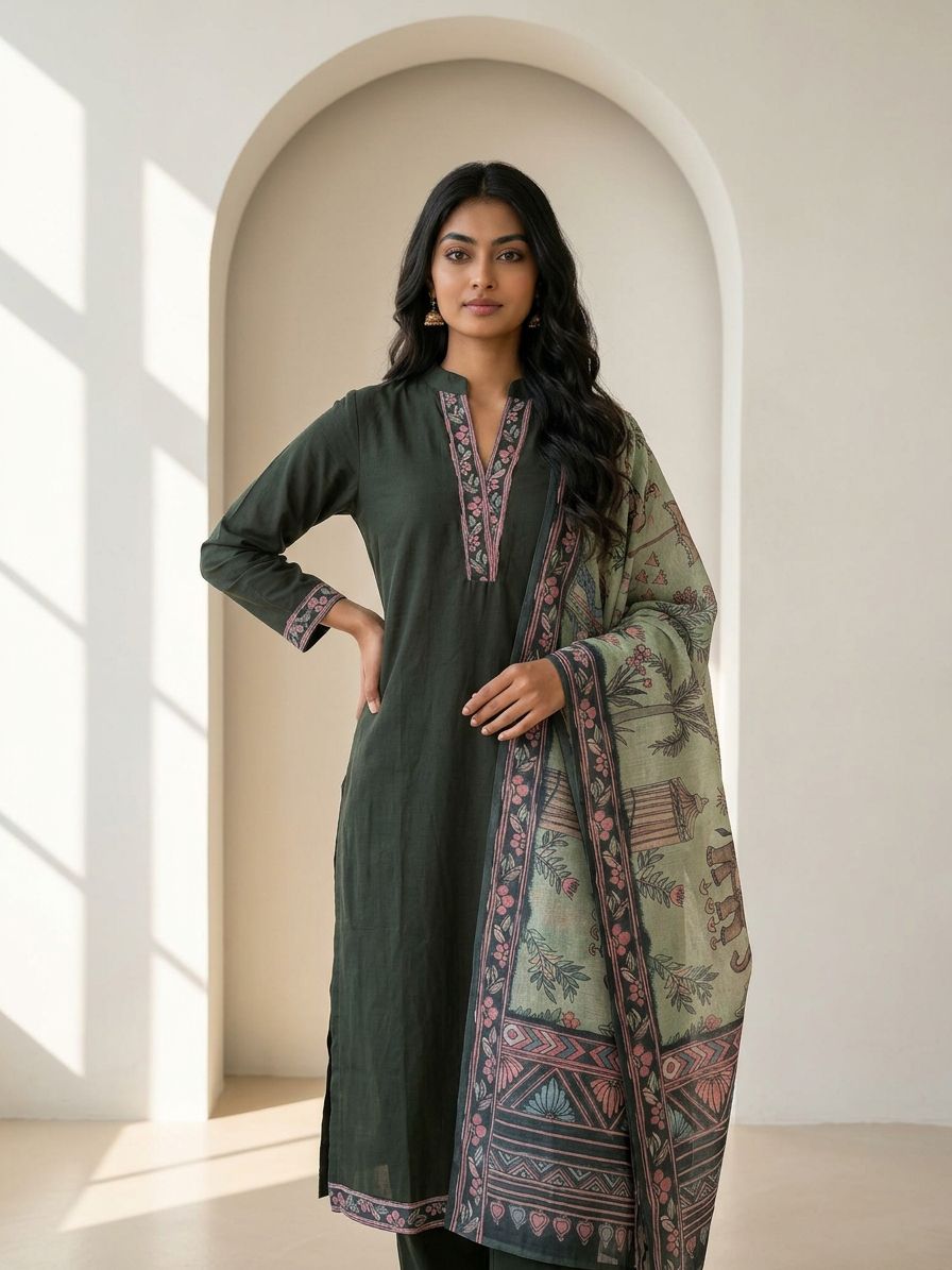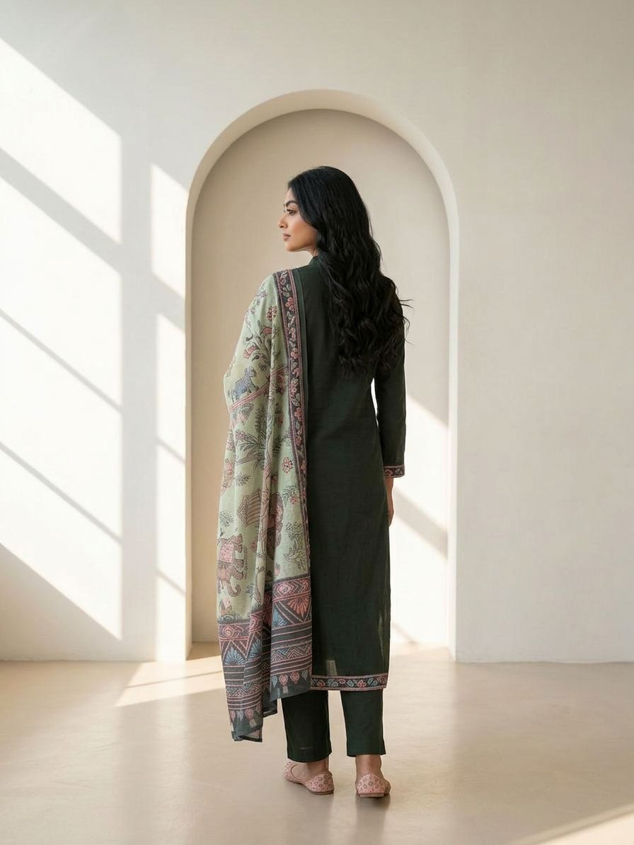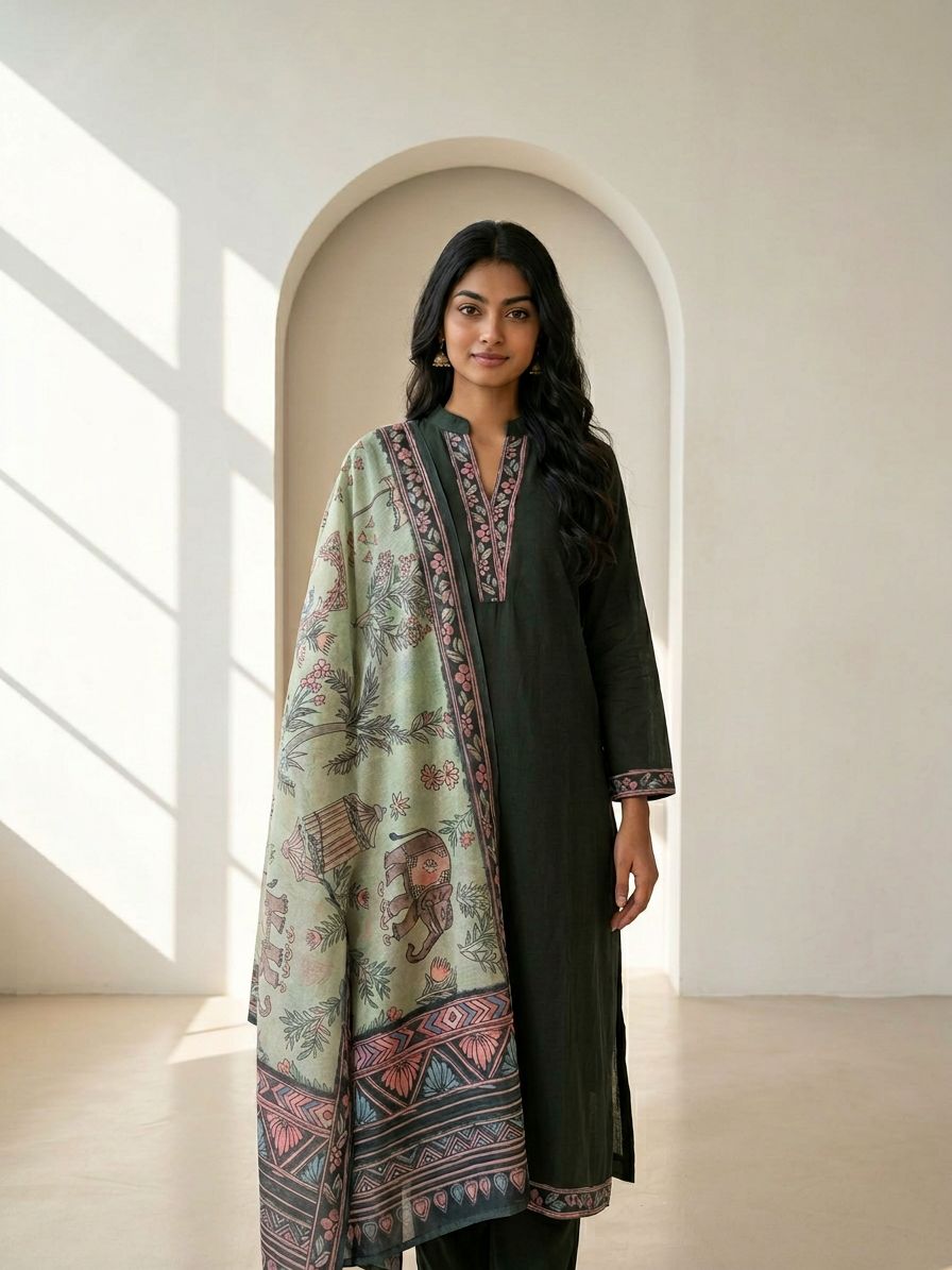 This suit set beautifully highlights elegant and artistic prints. The dupatta features detailed motifs with nature and heritage-inspired elements. The kurta is enhanced with subtle printed borders that add a graceful touch. A perfect blend of classic design and timeless style.