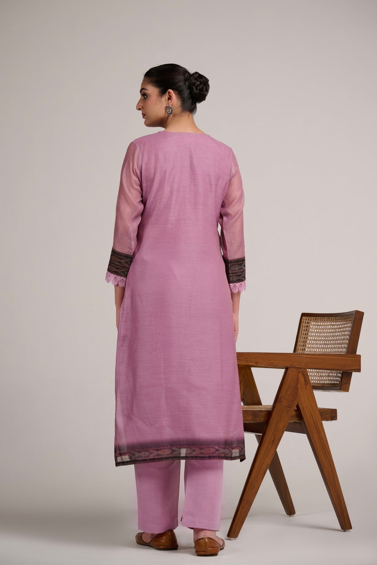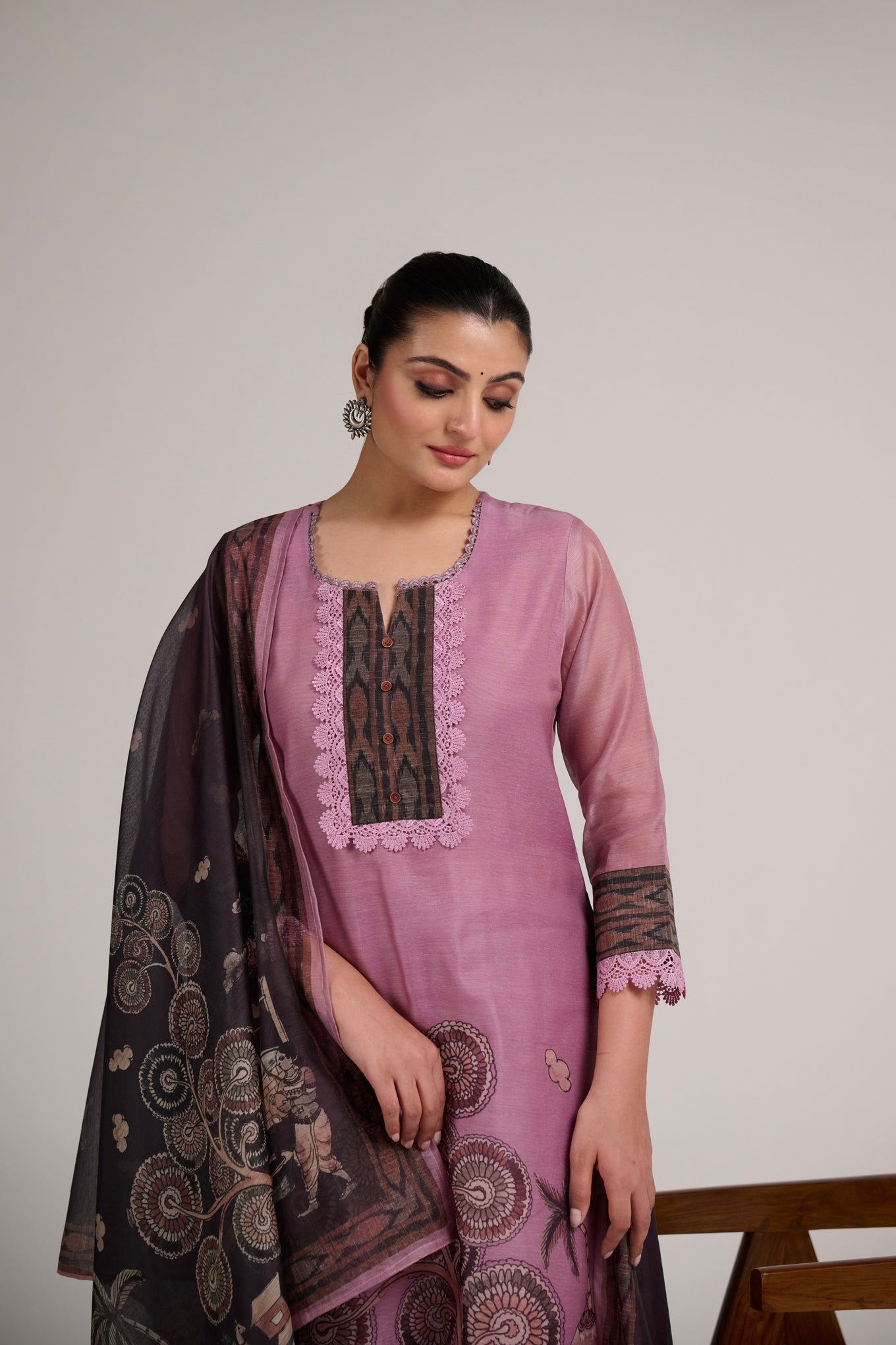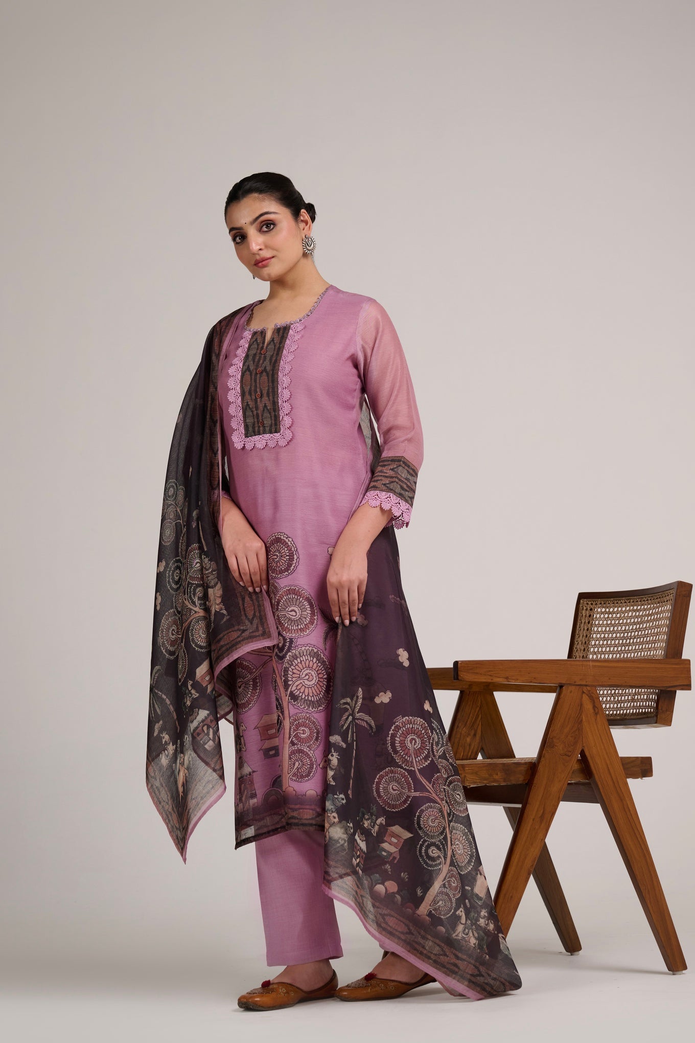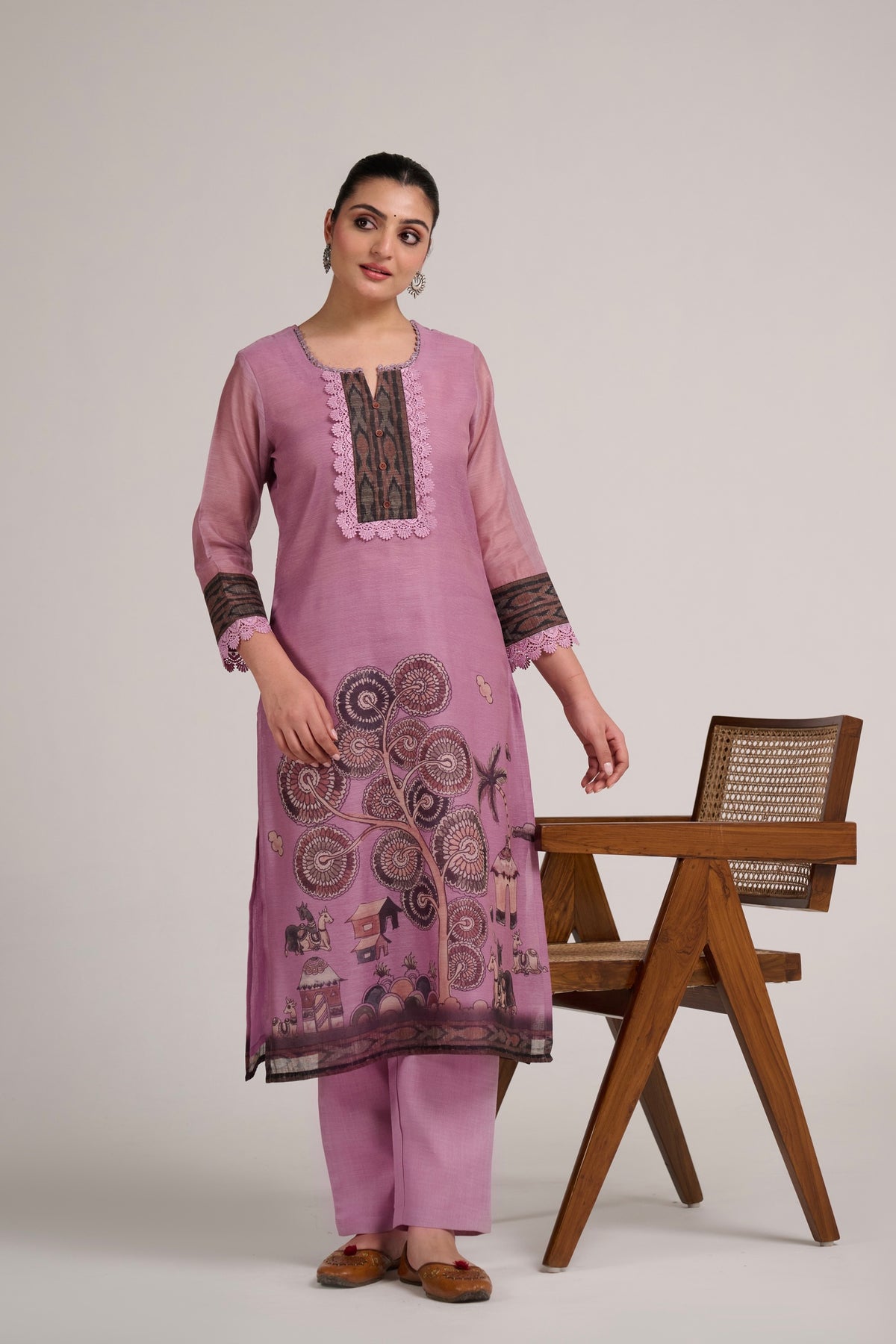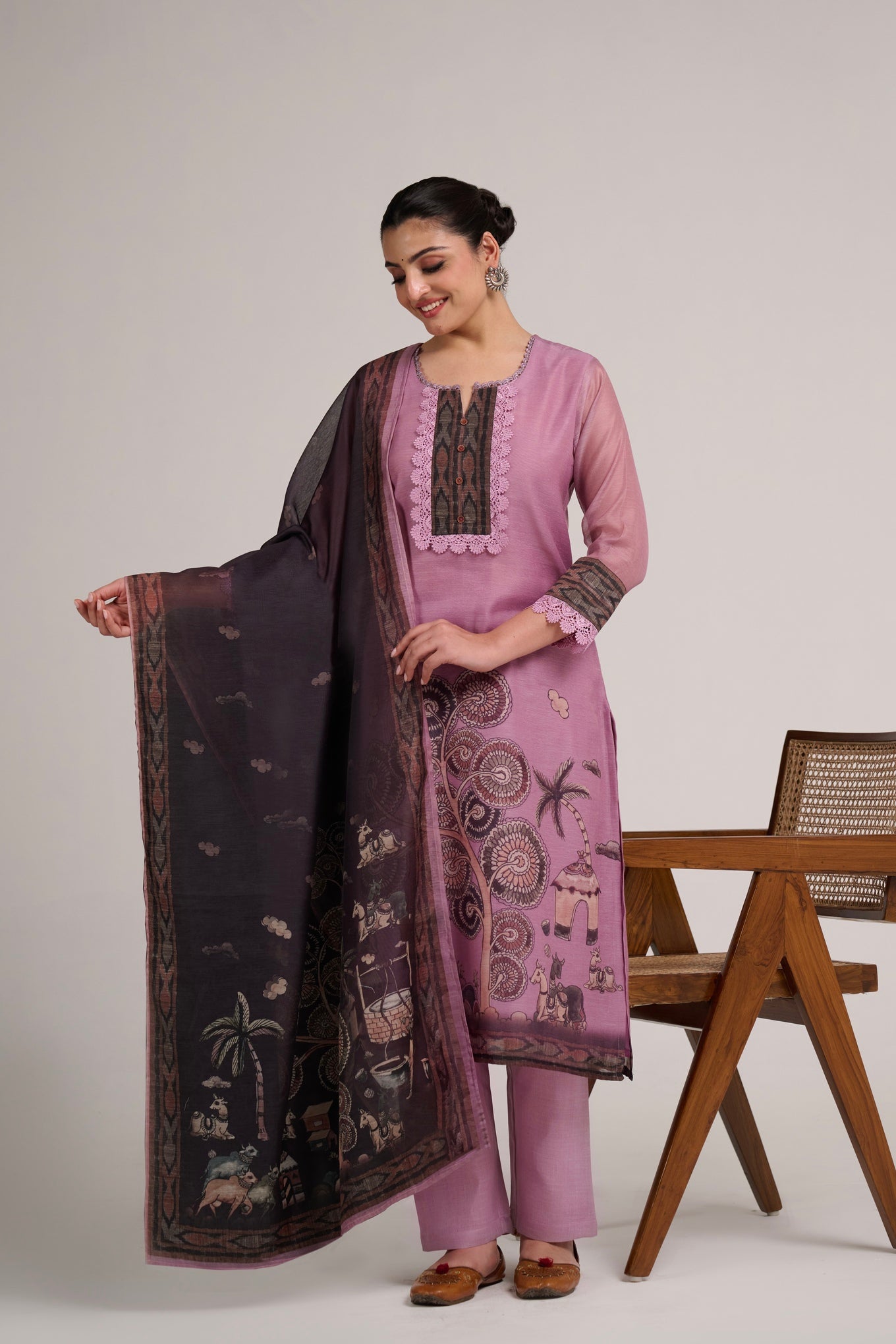 This beautiful mauve suit set is highlighted with detailed village inspired prints that tell a story in every design. The kurta features intricate motifs with fine borders and delicate lace detailing on the neckline and sleeves. The dupatta stands out with scenic prints of palm trees, huts, animals, and traditional elements in deep contrasting shades. The overall look feels graceful, artistic, and perfect for a classy ethnic style.