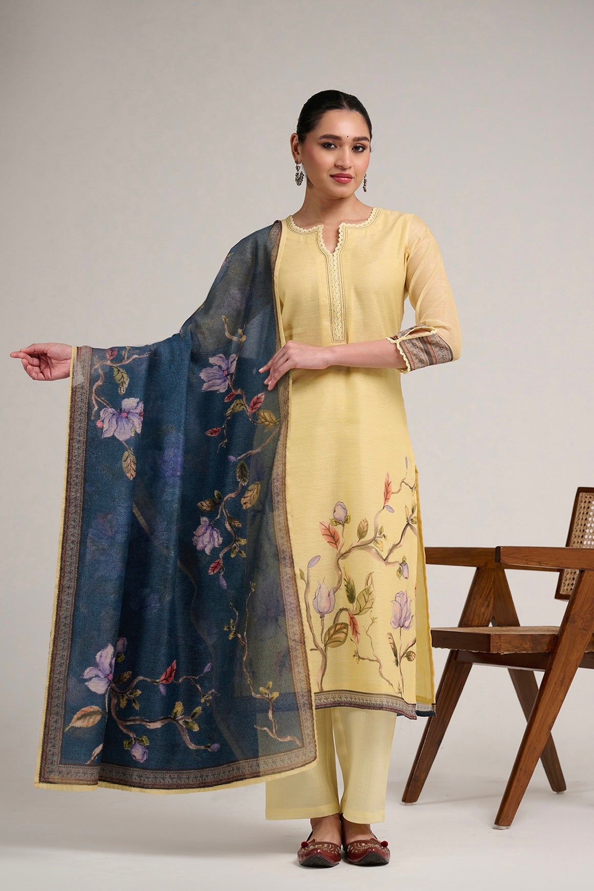 This fresh lemon yellow suit set features soft floral prints climbing along the kurta in pastel shades of lilac, peach, and green, paired beautifully with a deep teal blue dupatta adorned with elegant blooming floral vines and subtle borders, creating a graceful contrast of light and rich tones that feels calm, refined, and effortlessly stylish.