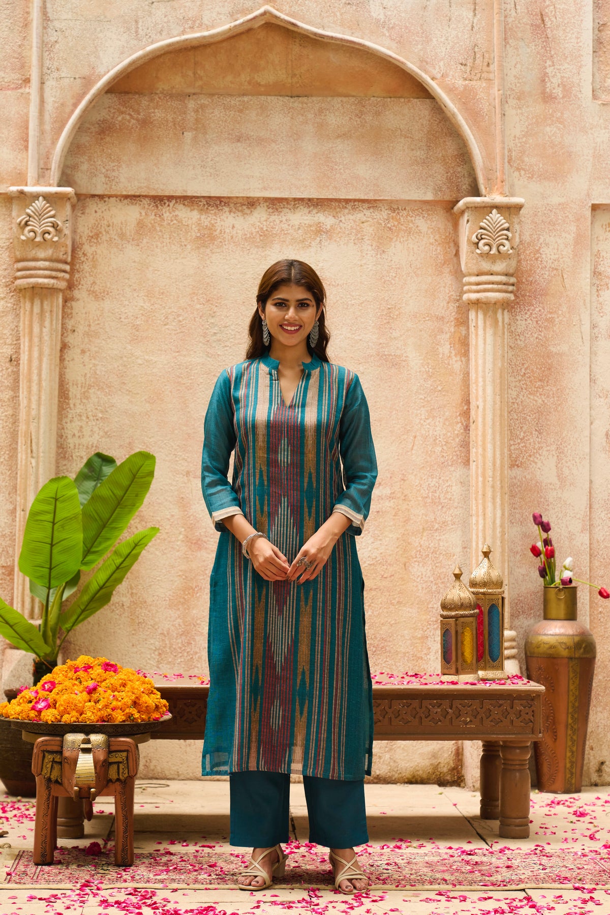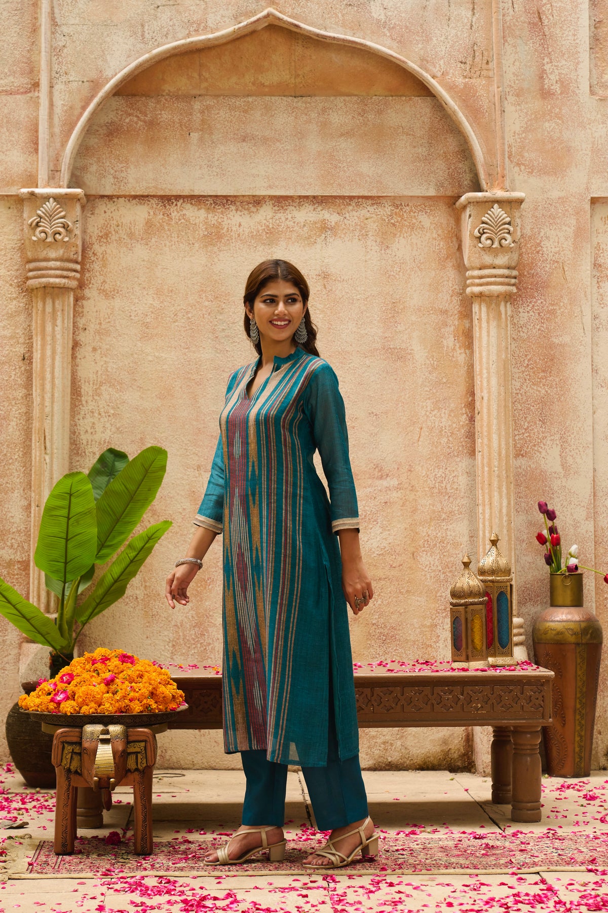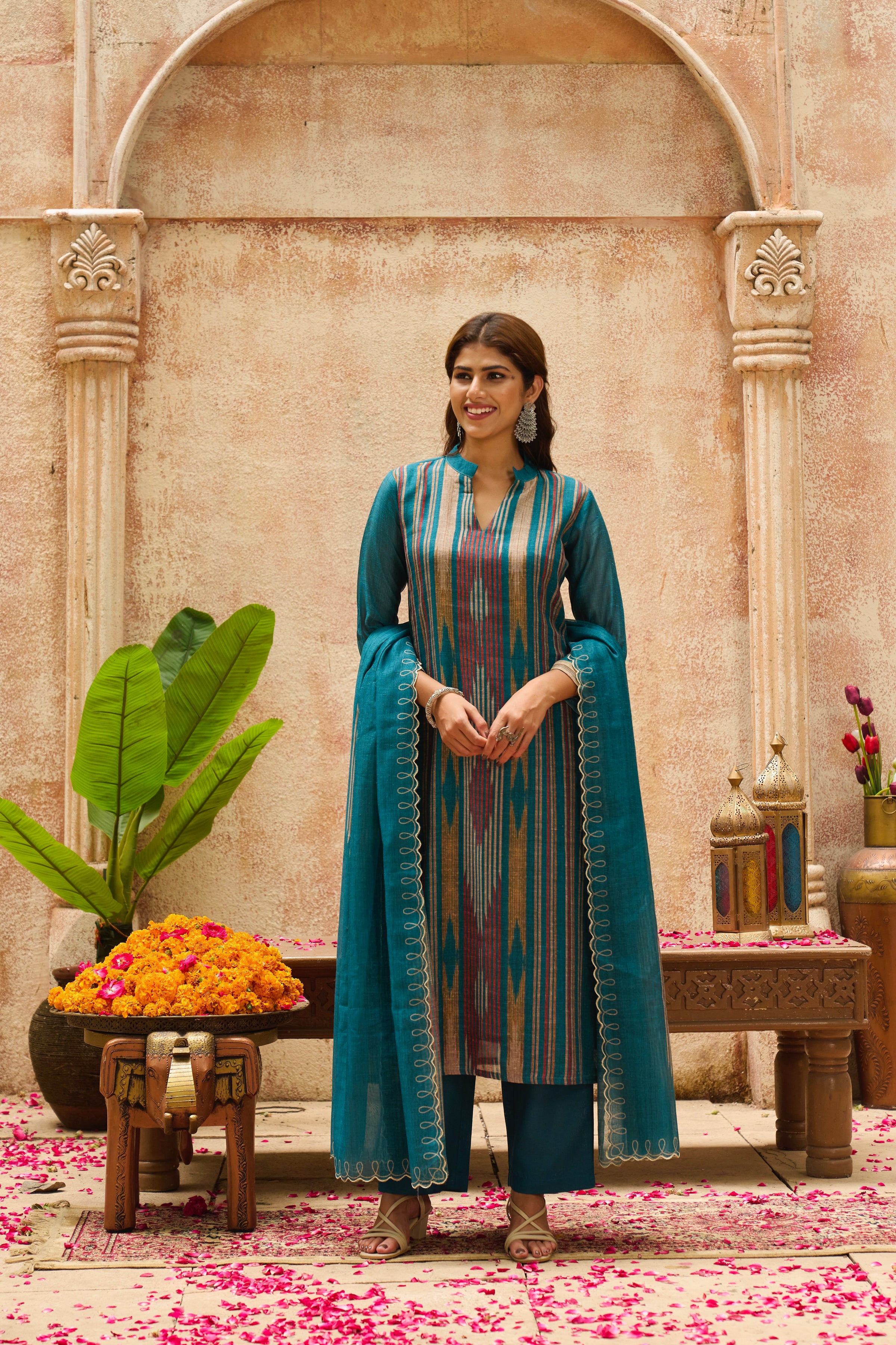 Elegant and effortlessly timeless, this Chanderi weave suit set features vertical woven patterns in rich teal and earthy hues. The kurta’s intricate weave is beautifully complemented by a scalloped dupatta, adding a touch of finesse to the ensemble. Paired with cotton slub pants, this set is perfect for festive occasions or intimate gatherings, offering a harmonious blend of tradition and sophistication.