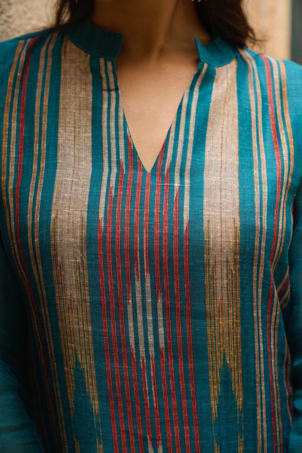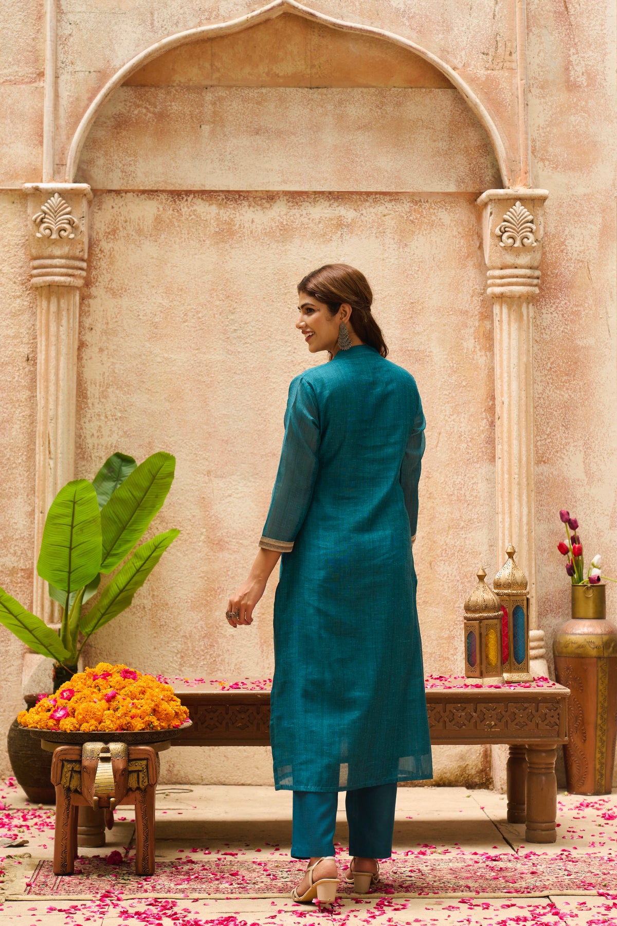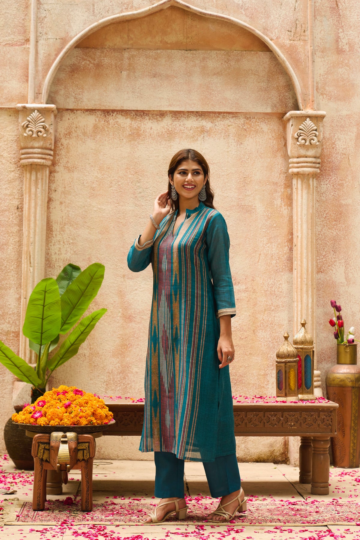 Elegant and effortlessly timeless, this Chanderi weave suit set features vertical woven patterns in rich teal and earthy hues. The kurta’s intricate weave is beautifully complemented by a scalloped dupatta, adding a touch of finesse to the ensemble. Paired with cotton slub pants, this set is perfect for festive occasions or intimate gatherings, offering a harmonious blend of tradition and sophistication.