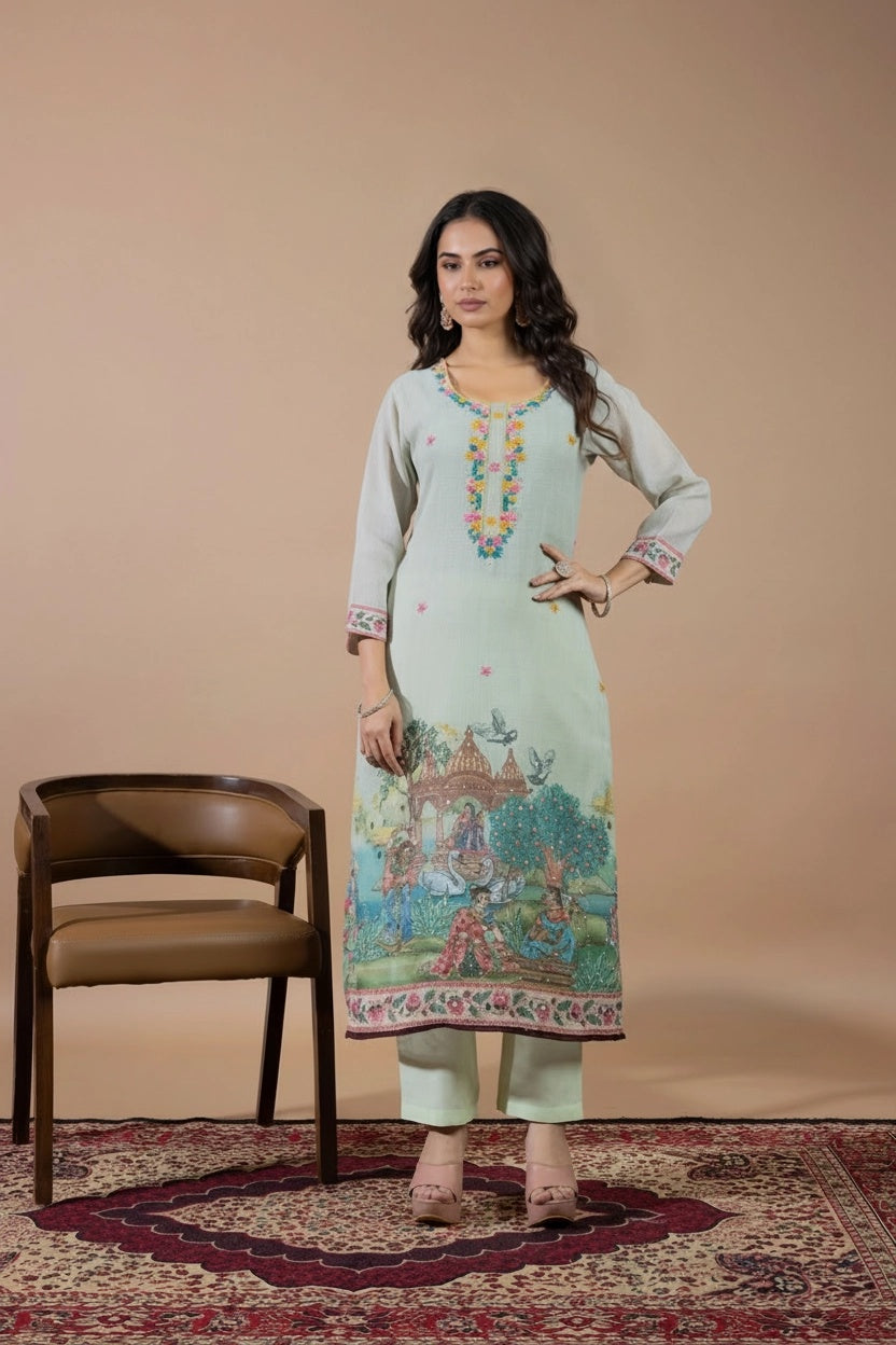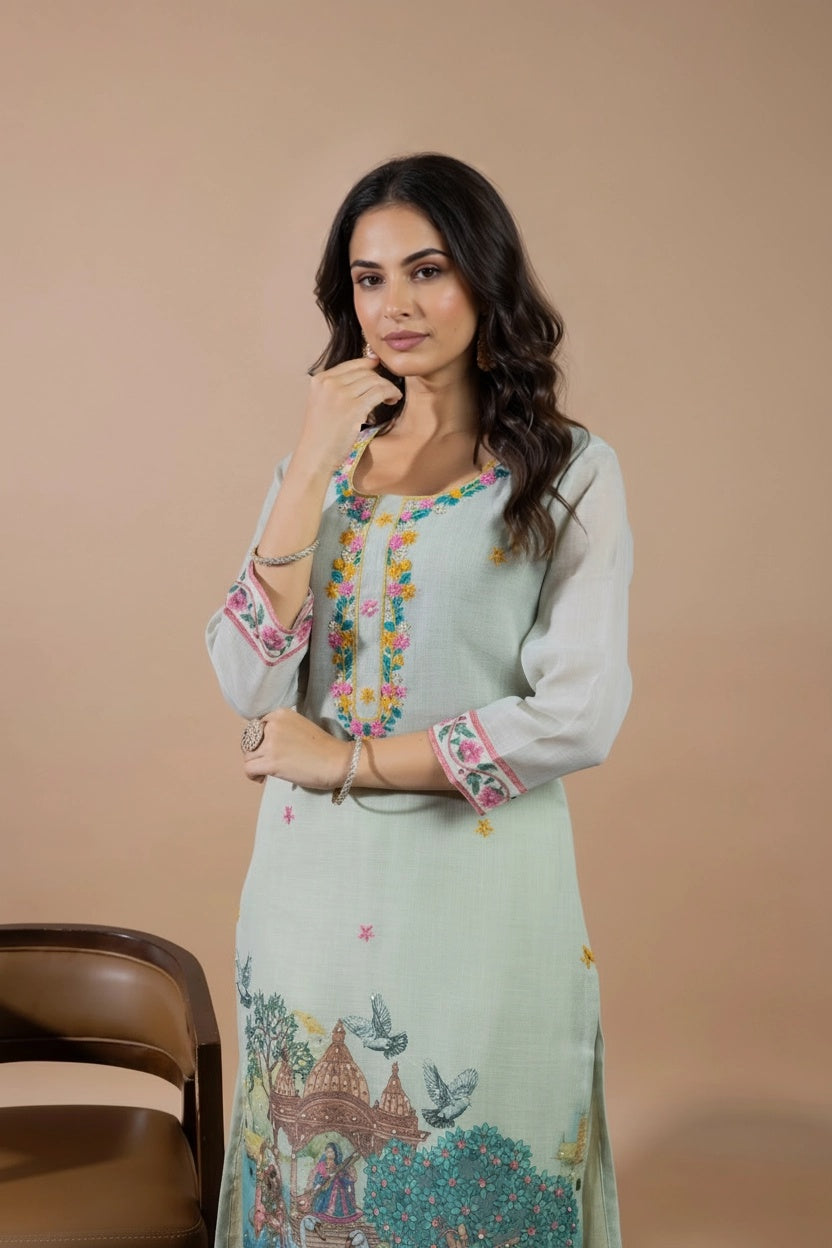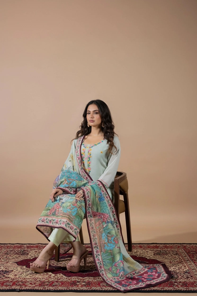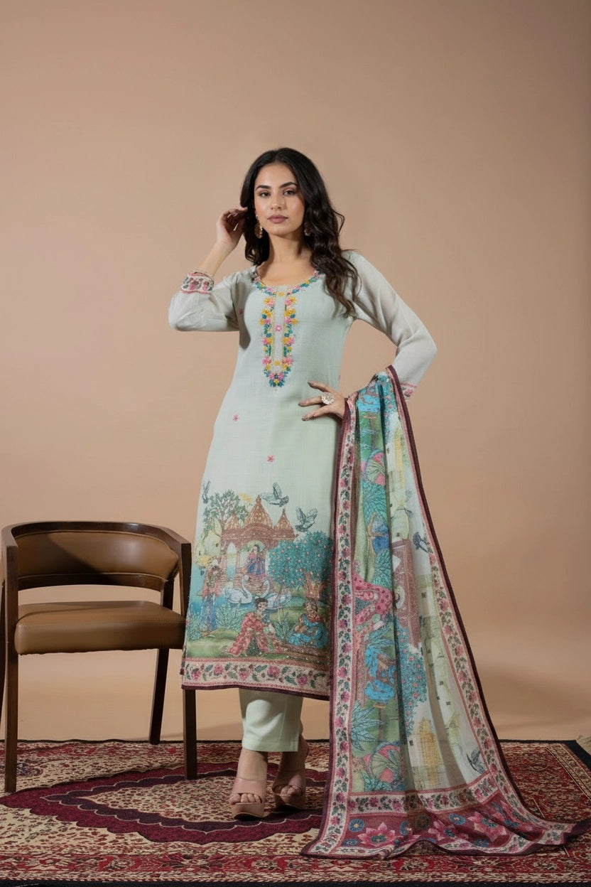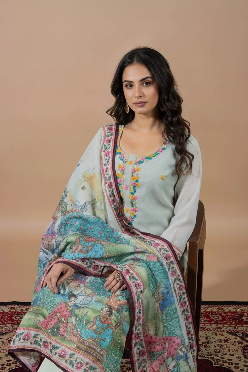 This elegant suit set features delicate hand embroidery on the kurta, adding a subtle and graceful charm. The dupatta is beautifully detailed with scenic traditional prints, showcasing artistic figures, nature elements, and intricate borders. Designed for both style and comfort, the kurta also includes a one-sided pocket. Perfect for festive days or special outings, it blends timeless tradition with effortless elegance.
