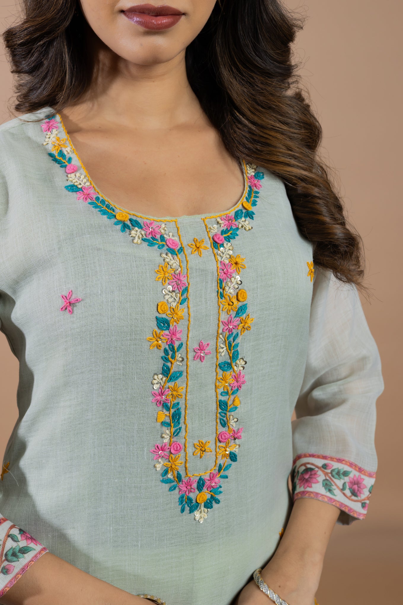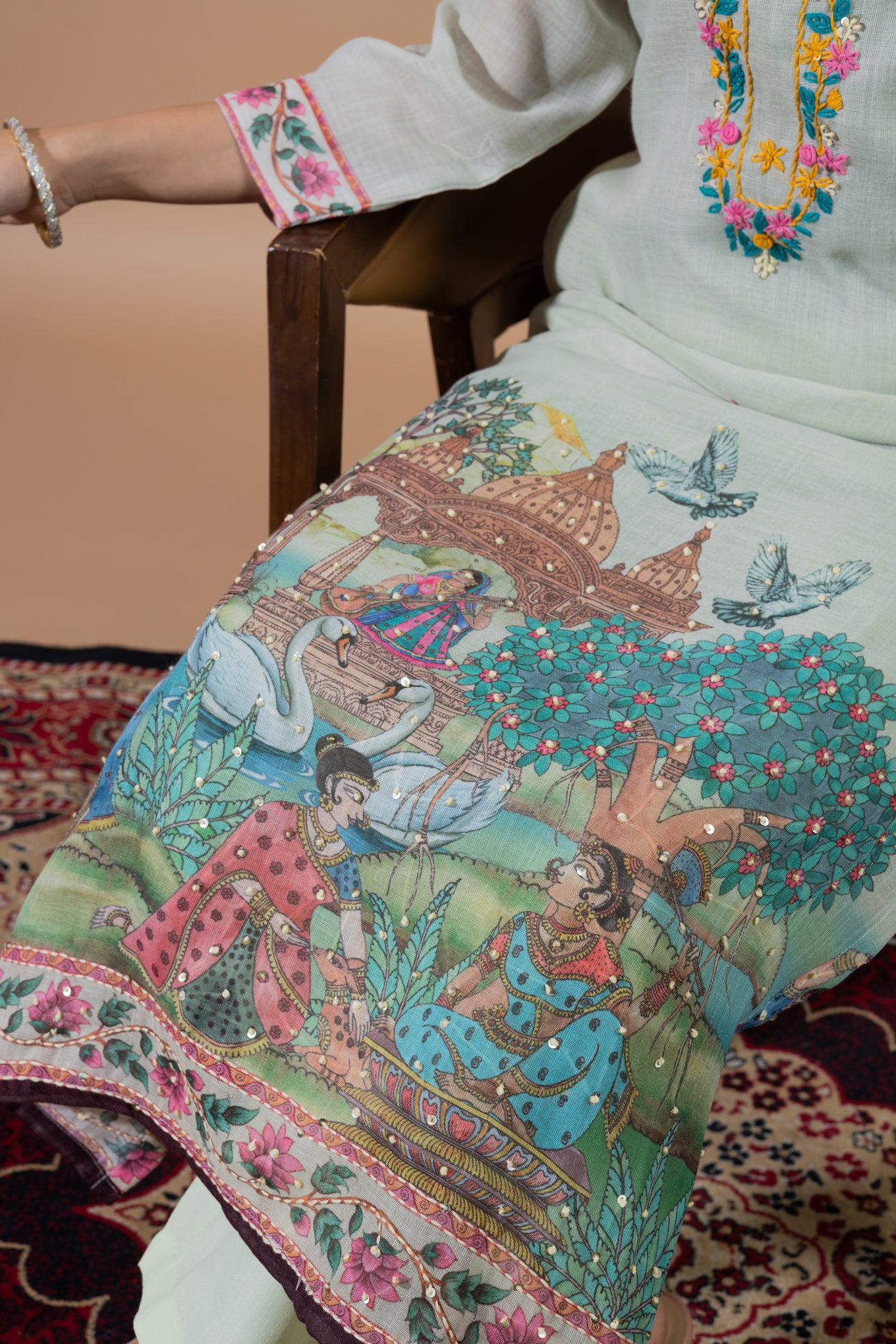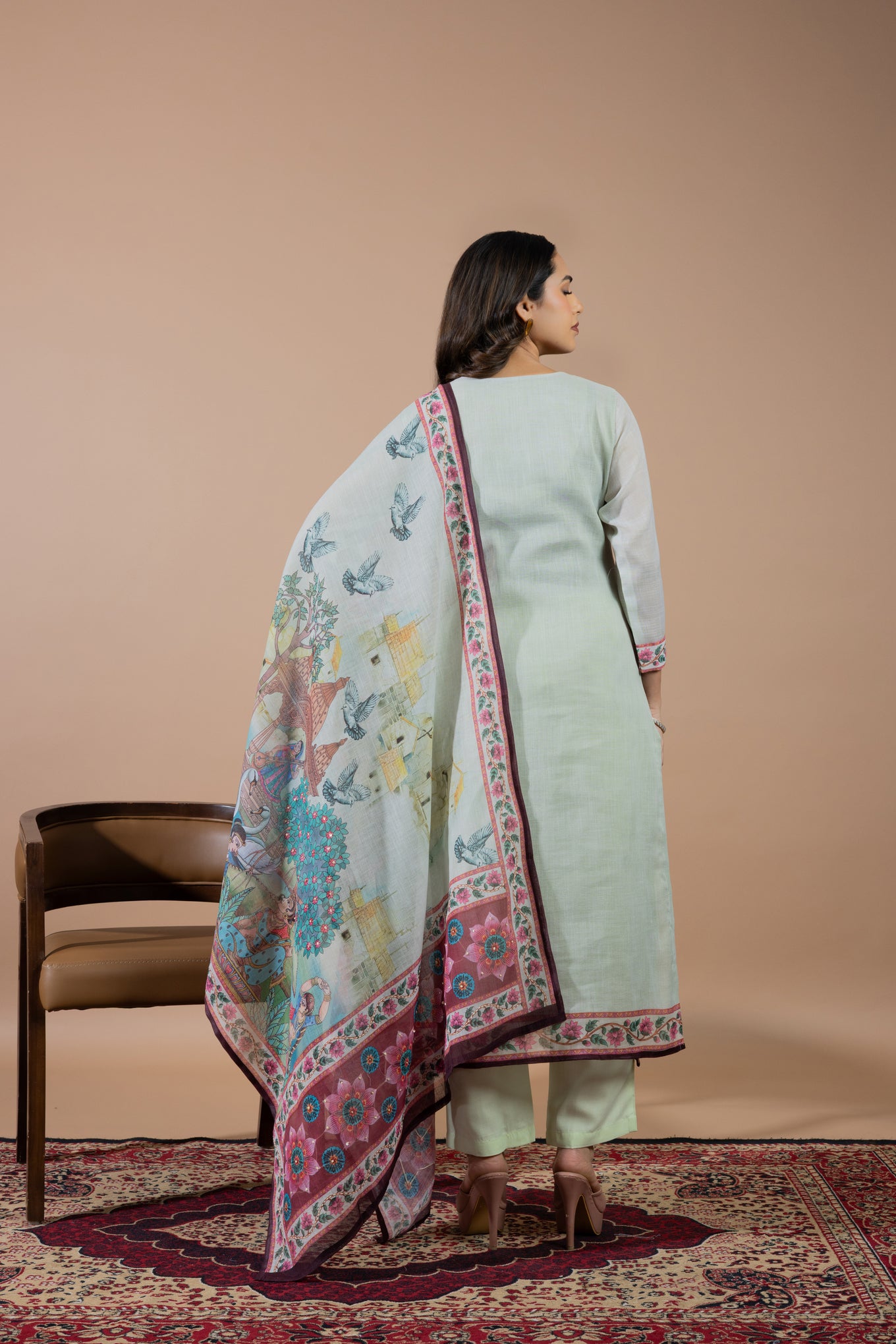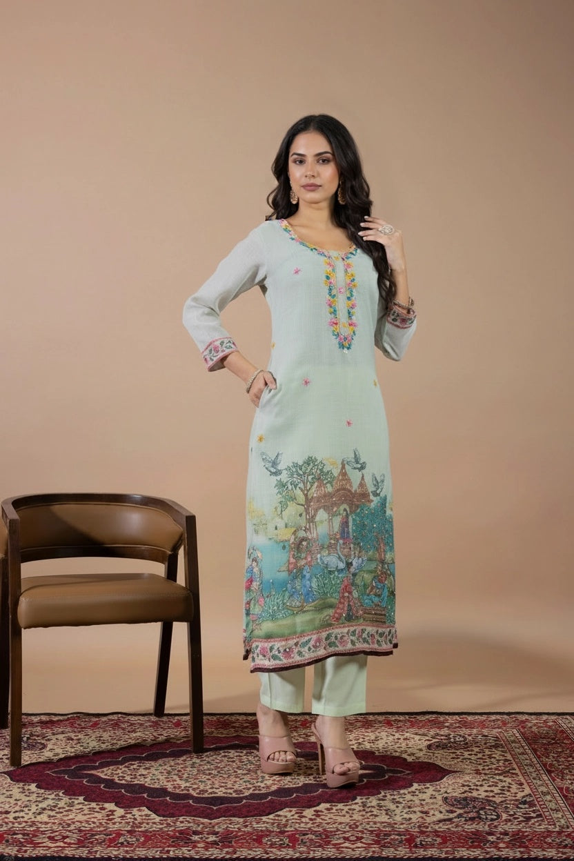 This elegant suit set features delicate hand embroidery on the kurta, adding a subtle and graceful charm. The dupatta is beautifully detailed with scenic traditional prints, showcasing artistic figures, nature elements, and intricate borders. Designed for both style and comfort, the kurta also includes a one-sided pocket. Perfect for festive days or special outings, it blends timeless tradition with effortless elegance.