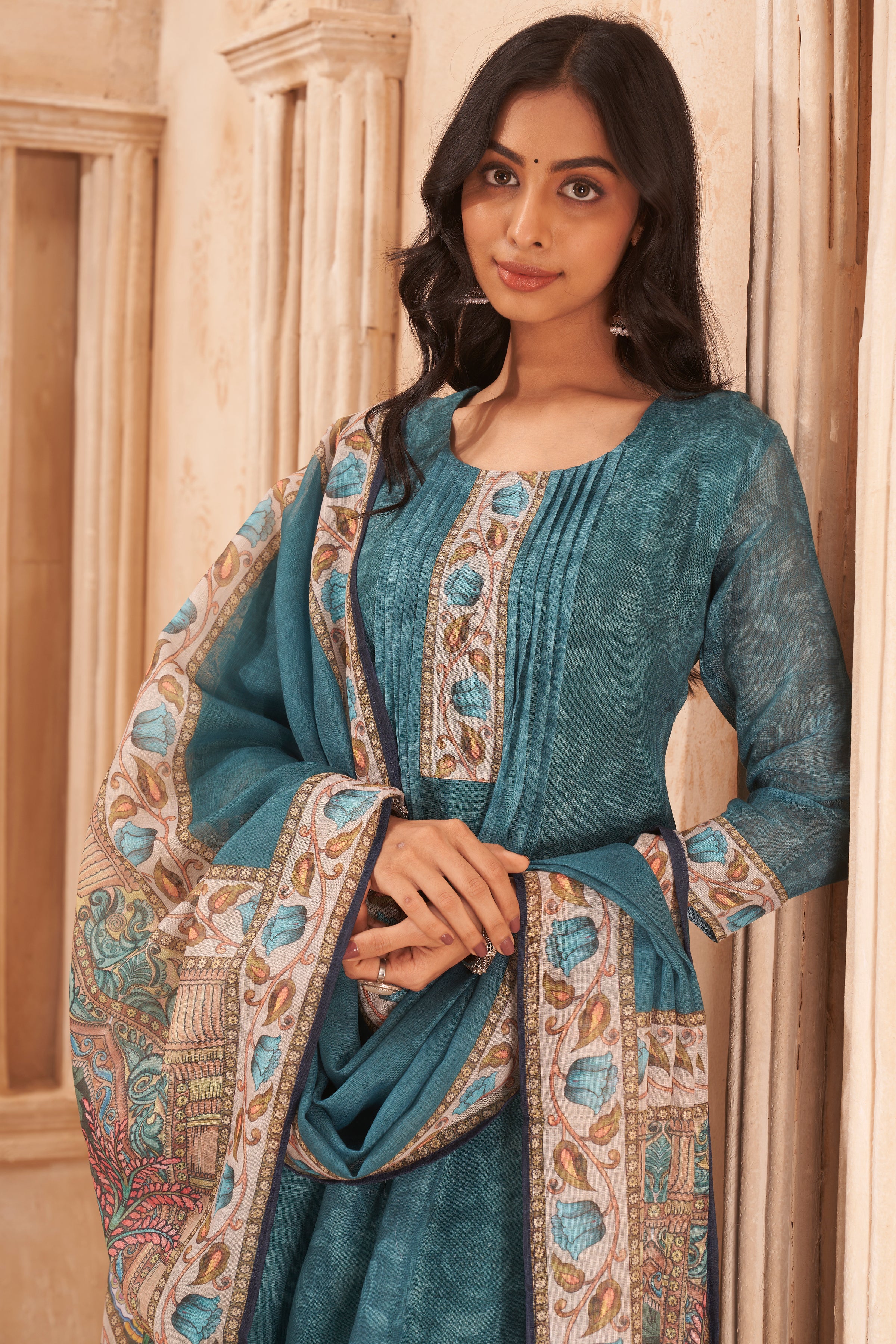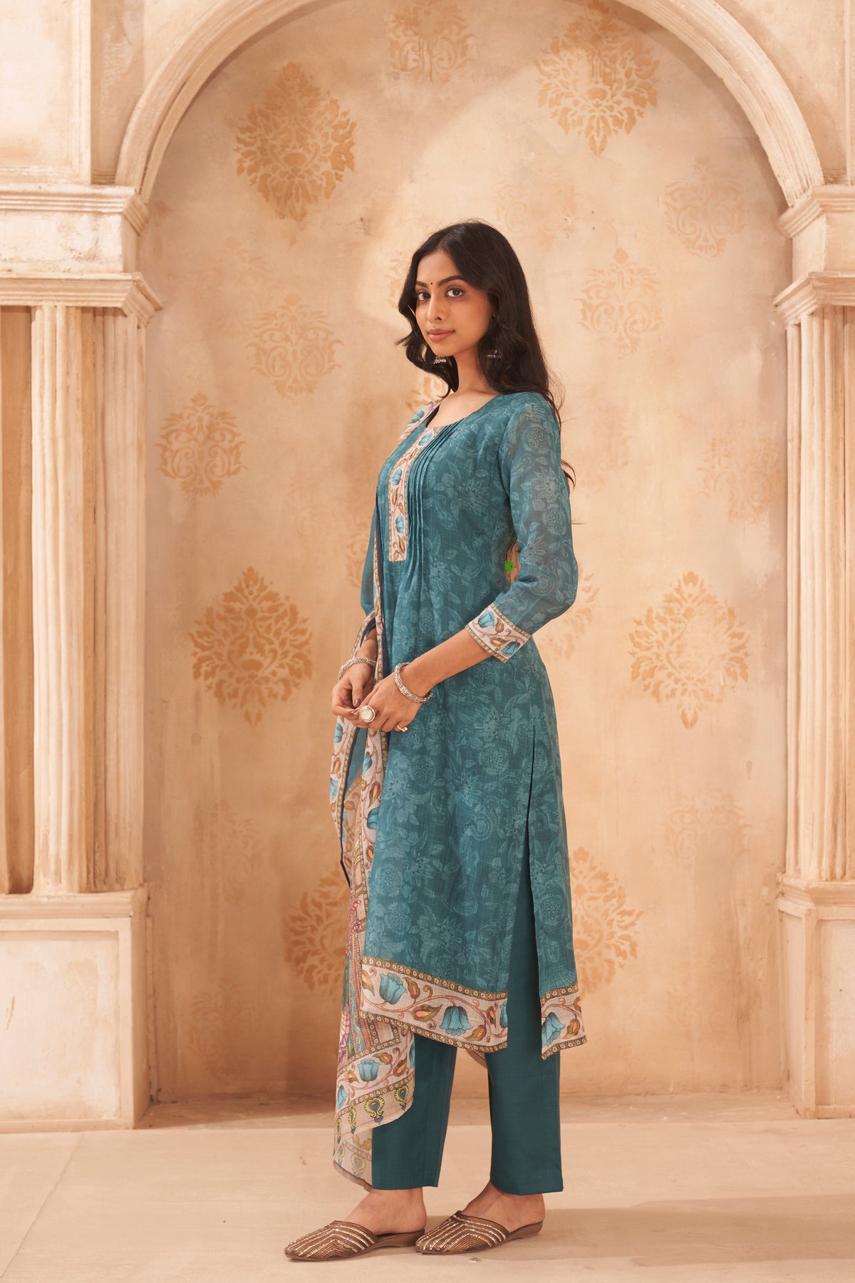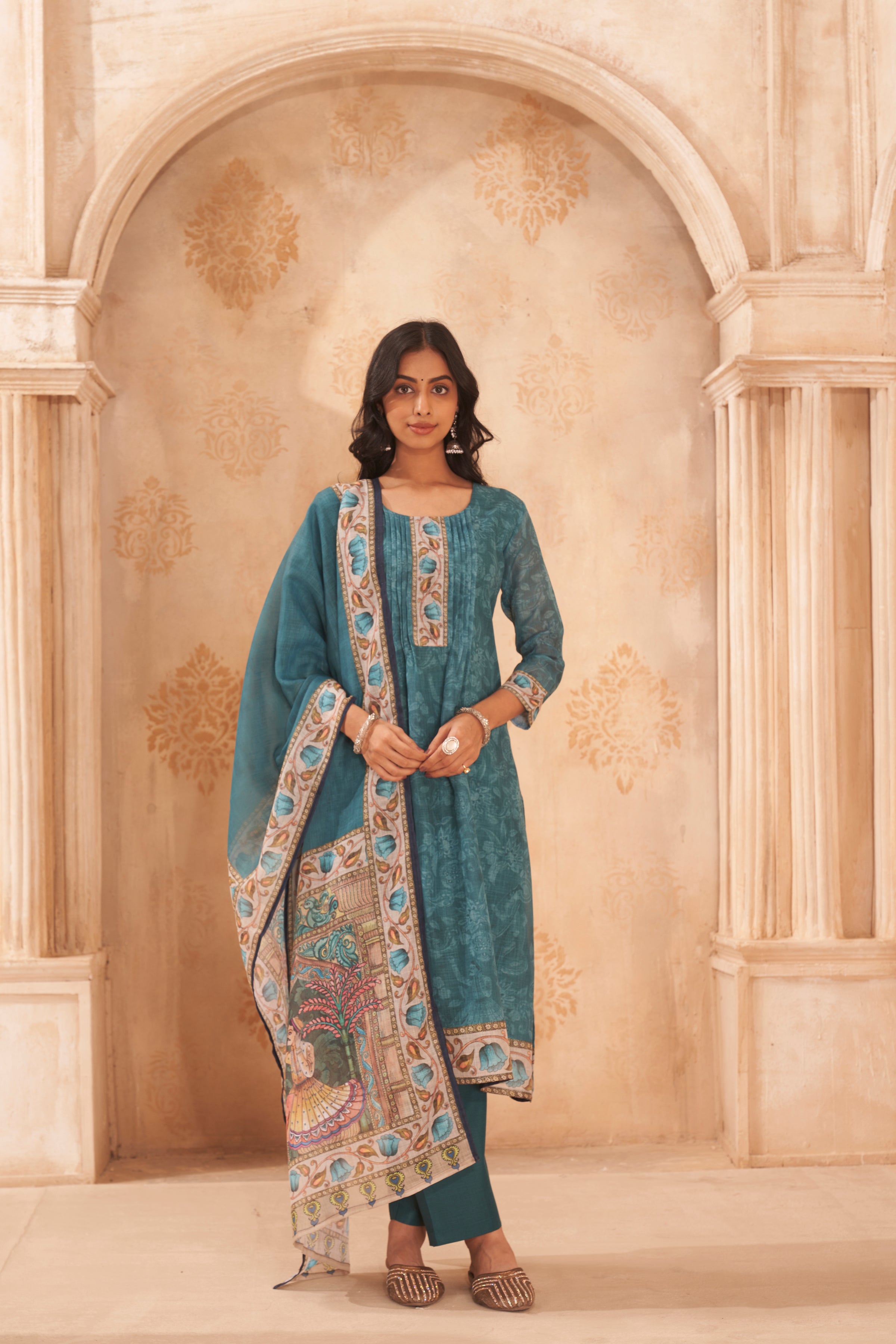 This suit set features detailed scenic prints inspired by classic artwork and storytelling scenes. Delicate floral borders frame the design, adding richness and visual depth. The prints flow beautifully, creating a calm yet expressive look. Every detail feels thoughtful, making the overall style elegant and timeless.